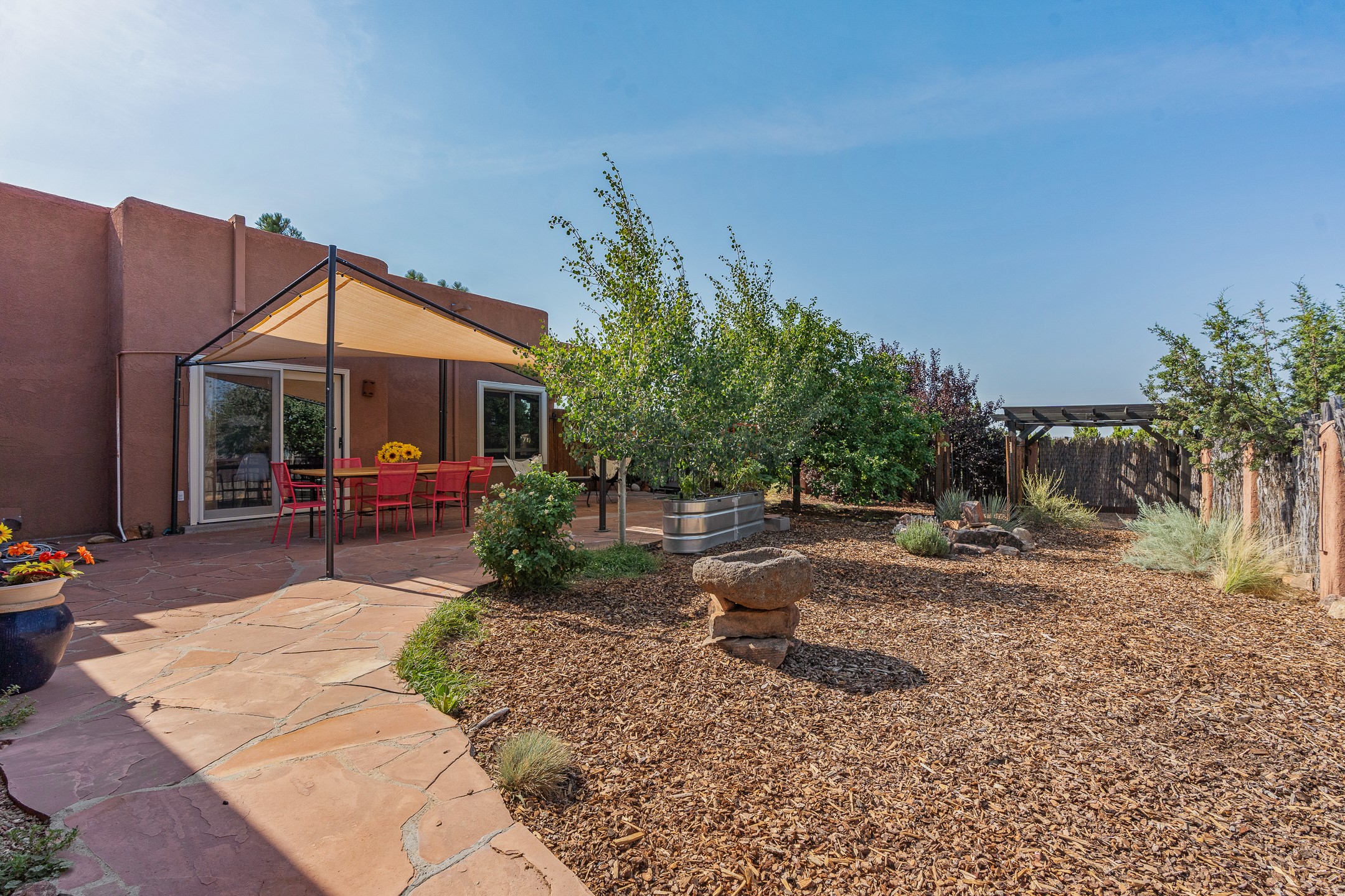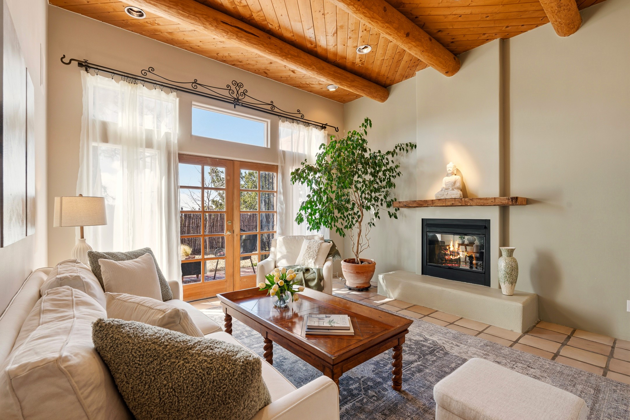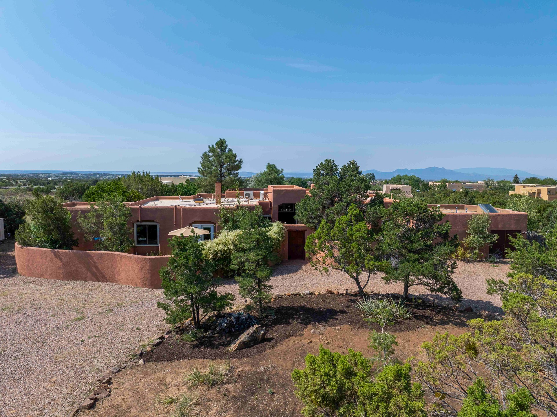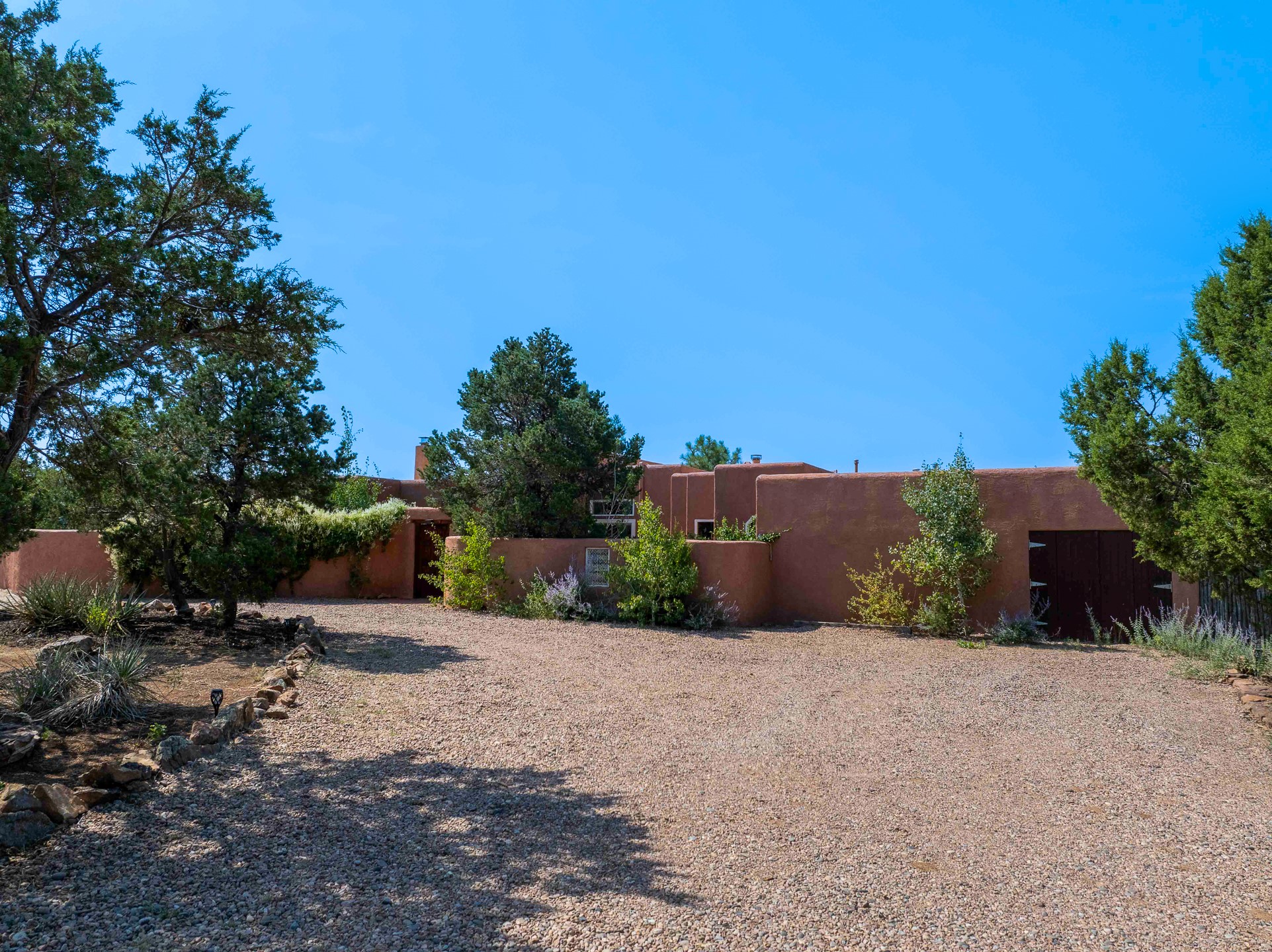 Sited on 5 acres in Dos Griegos and just 20 minutes from the Santa Fe Plaza, this inviting property offers a main house, an attached casita and a 250 sq. ft. attached storage room. A thoughtful nod to sustainable living is reflected in the two-year-old solar array with a rare Pearl Certification and a transferable warranty.Upon entering the home, the formal living room welcomes you with soaring ceilings, vigas, and abundant natural light. A double-sided wood-burning fireplace connects this elegant space to the kitchen's secondary living area, creating warmth and continuity between the rooms. French doors in the living room open to the landscaped backyard, inviting indoor-outdoor living.The kitchen, living, and dining areas form the heart of the home with direct access to a flowing koi pond, where the gentle sound of falling water creates a peaceful year-round setting.Tucked quietly off the kitchen through the laundry room, an additional suite offers a private retreat with its own living room, bedroom, and bath--ideal as an additional primary suite, guest quarters, or studio.In the main home's bedroom wing, the spacious primary suite enjoys abundant southern light and features a colorful bath with soaking tub and walk-in shower. A walk-in closet connects to a dedicated office, creating a flexible work or creative space. The guest bedroom includes a wood-burning kiva fireplace and ensuite bath.The backyard features an organic garden, tranquil koi pond, and southwest-facing patio ideal for outdoor dining. No HOA dues. Served by natural gas and Eldorado community water. A versatile property offering space for generational living or gathering with family and friends.