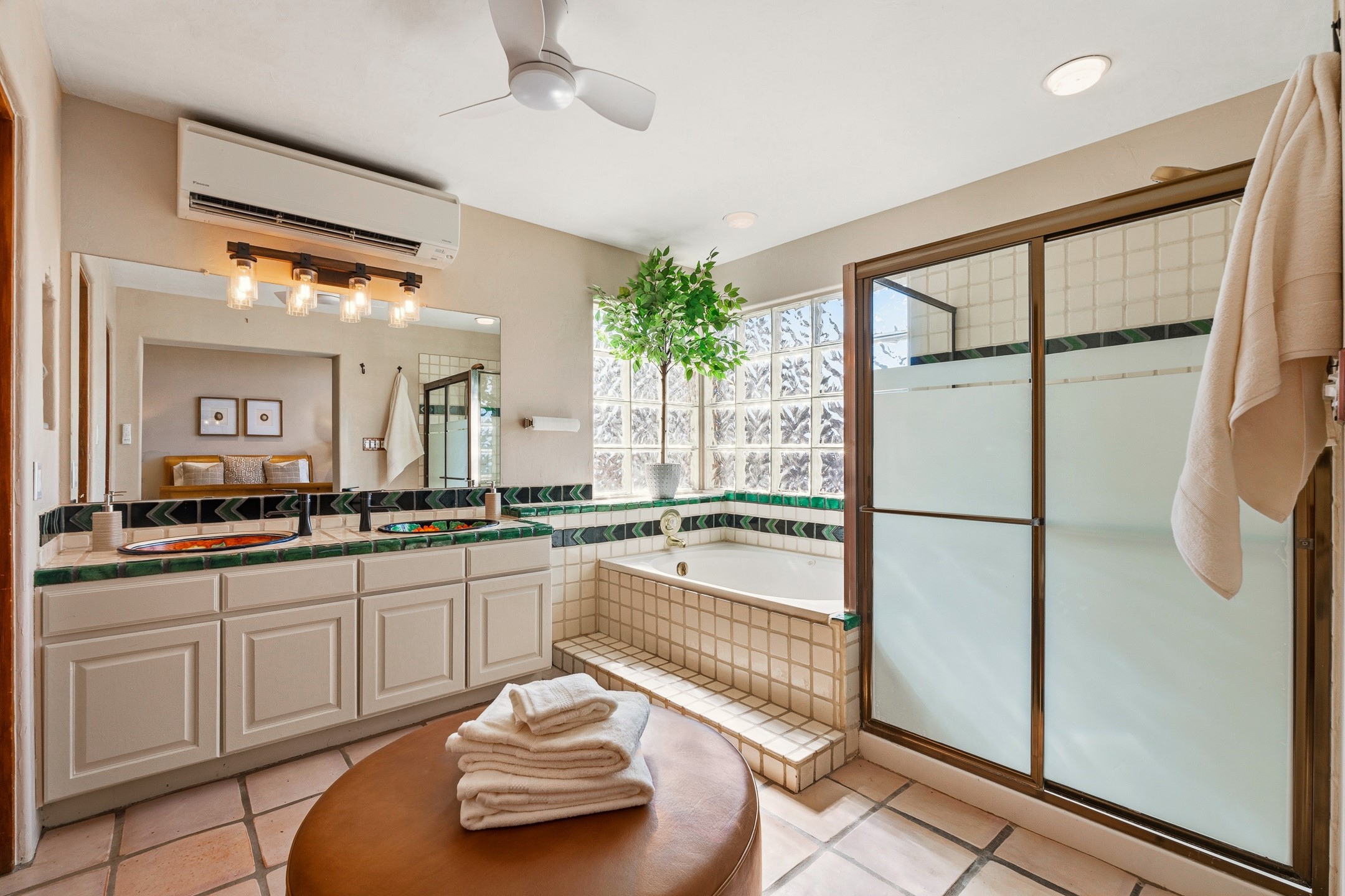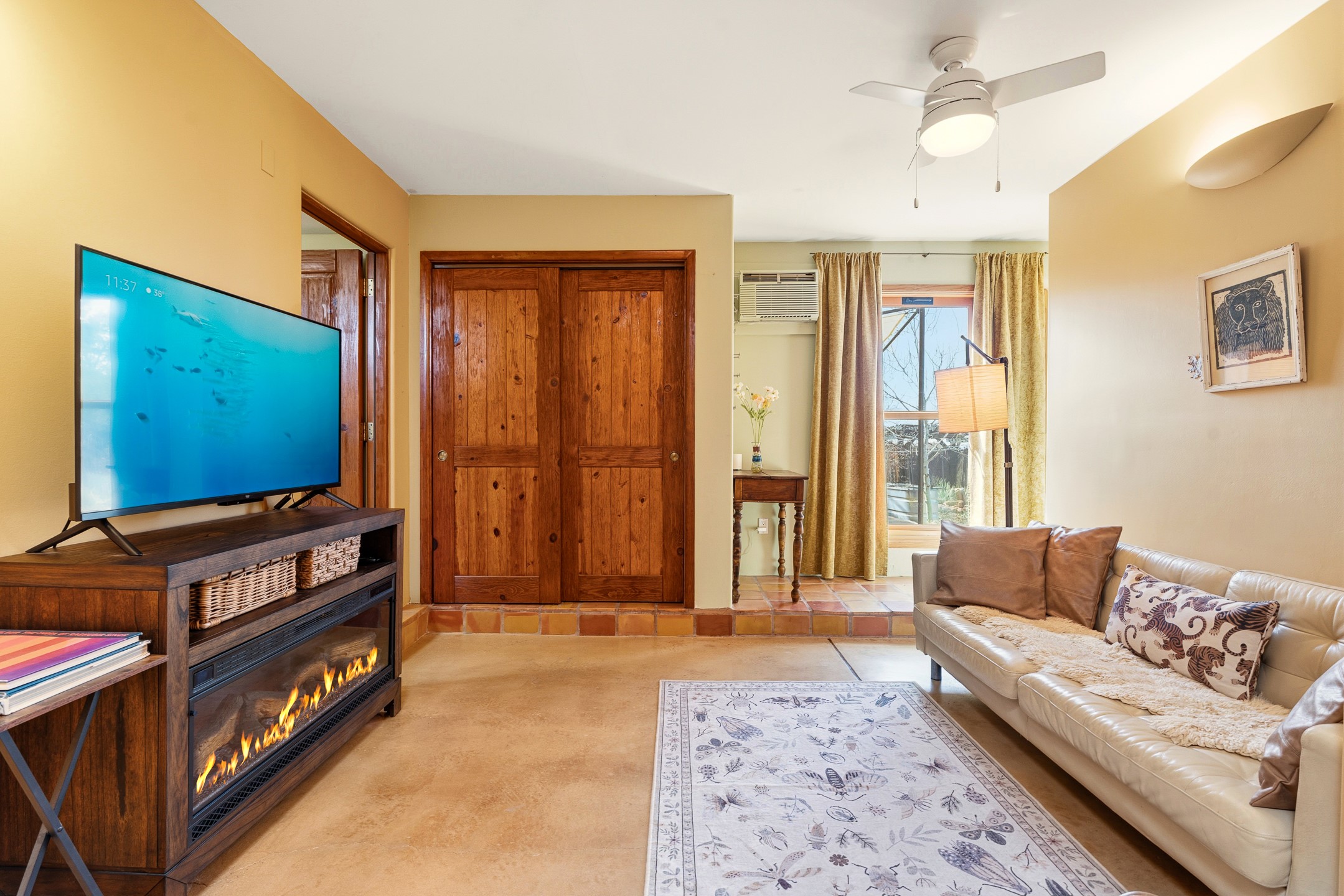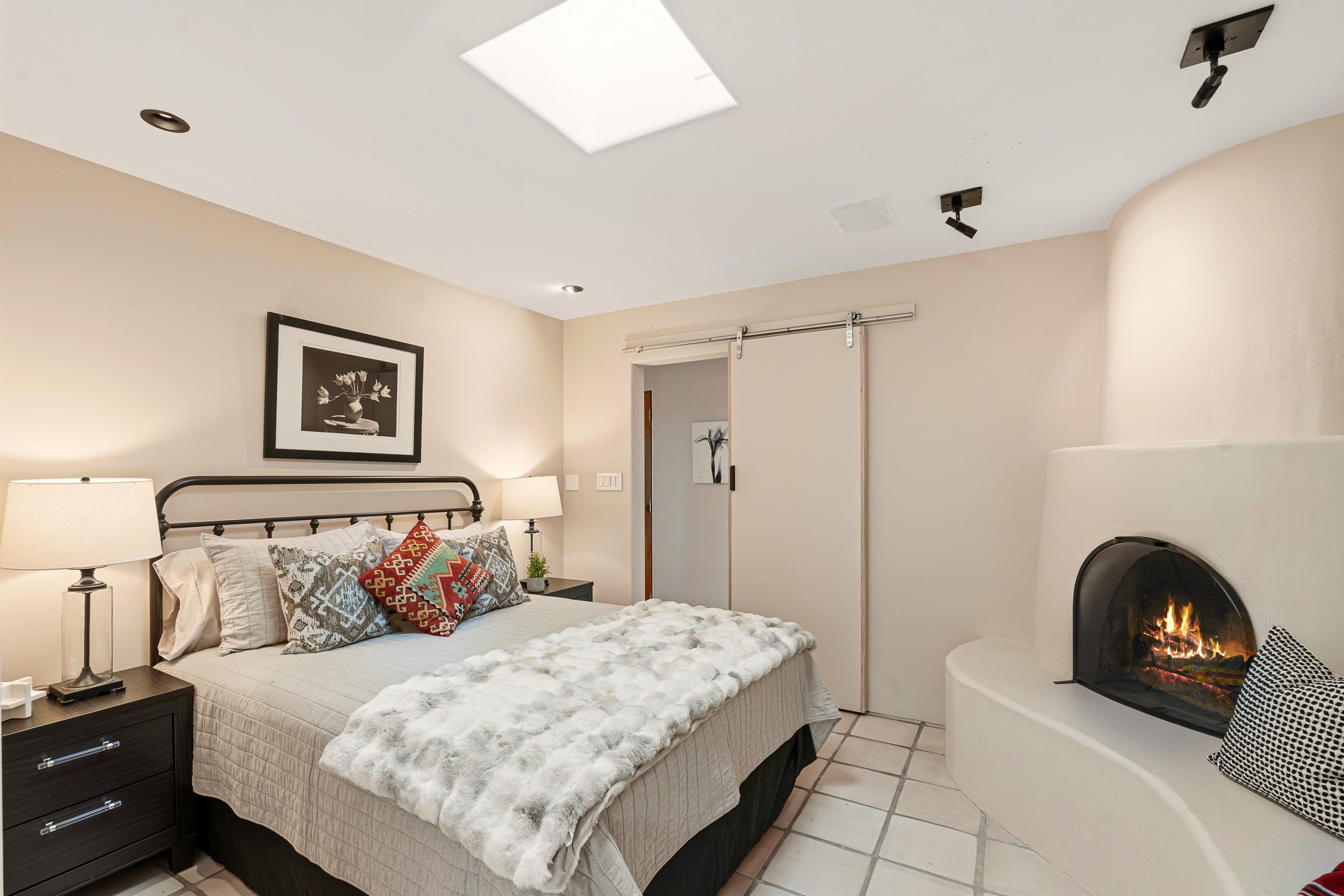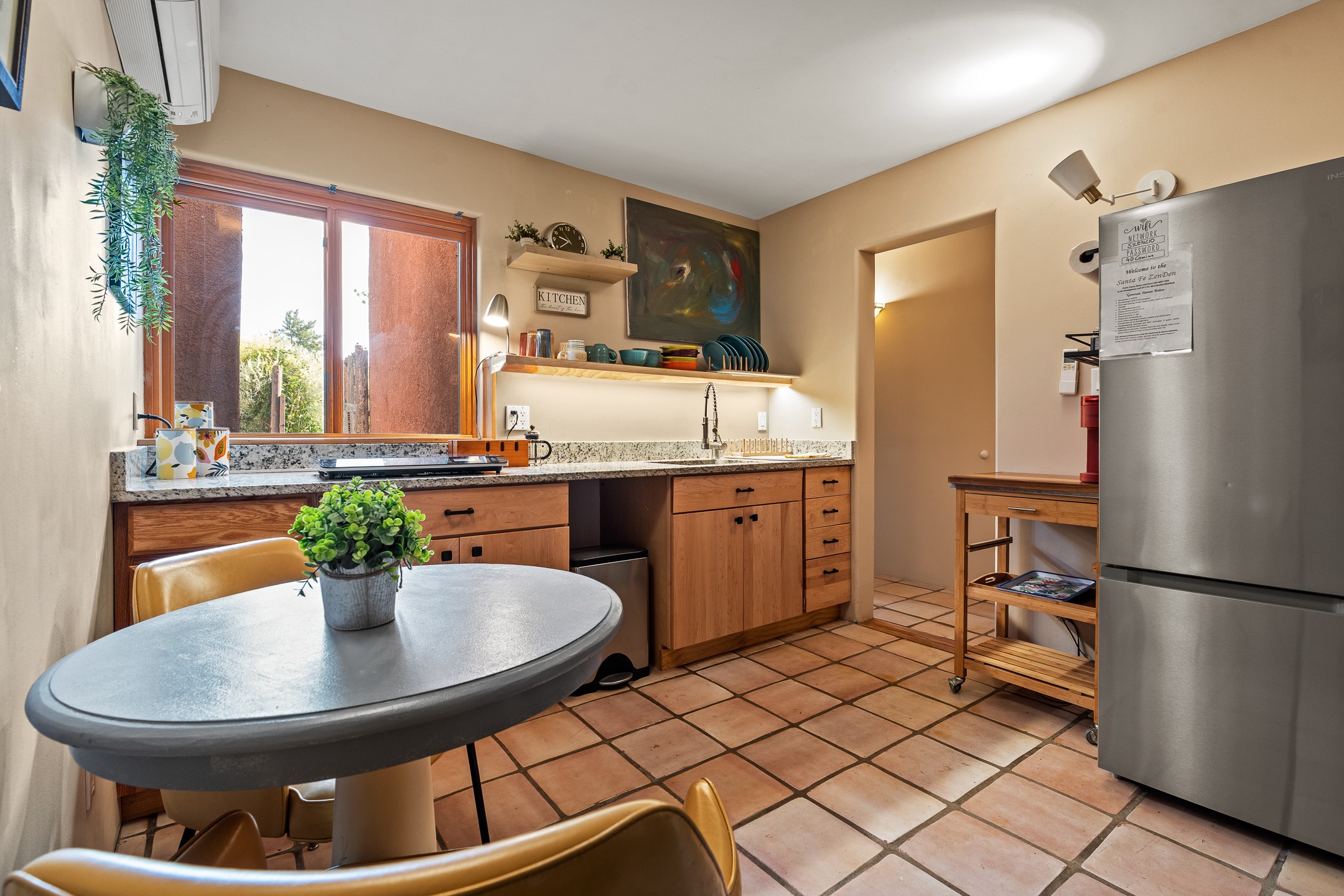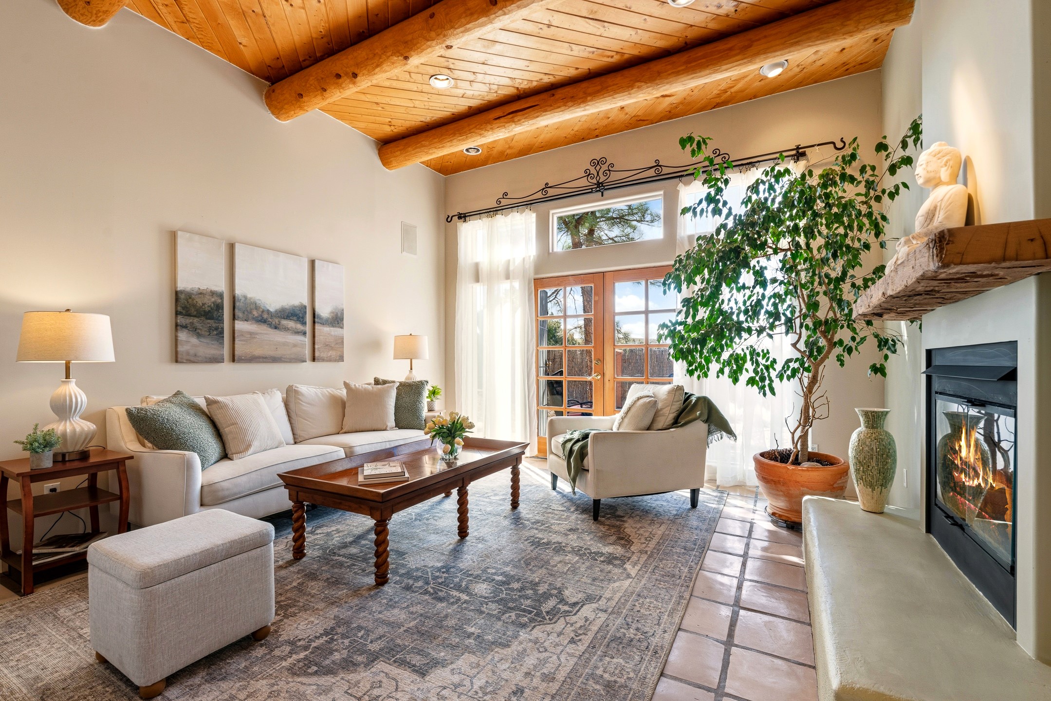 Sited on 5 acres in Dos Griegos and just 20 minutes from the Santa Fe Plaza, this inviting property offers a main house, an attached casita and a 250 sq. ft. attached storage room. A thoughtful nod to sustainable living is reflected in the two-year-old solar array with a rare Pearl Certification and a transferable warranty.Upon entering the home, the formal living room welcomes you with soaring ceilings, vigas, and abundant natural light. A double-sided wood-burning fireplace connects this elegant space to the kitchen's secondary living area, creating warmth and continuity between the rooms. French doors in the living room open to the landscaped backyard, inviting indoor-outdoor living.The kitchen, living, and dining areas form the heart of the home with direct access to a flowing koi pond, where the gentle sound of falling water creates a peaceful year-round setting.Tucked quietly off the kitchen through the laundry room, an additional suite offers a private retreat with its own living room, bedroom, and bath--ideal as an additional primary suite, guest quarters, or studio.In the main home's bedroom wing, the spacious primary suite enjoys abundant southern light and features a colorful bath with soaking tub and walk-in shower. A walk-in closet connects to a dedicated office, creating a flexible work or creative space. The guest bedroom includes a wood-burning kiva fireplace and ensuite bath.The backyard features an organic garden, tranquil koi pond, and southwest-facing patio ideal for outdoor dining. No HOA dues. Served by natural gas and Eldorado community water. A versatile property offering space for generational living or gathering with family and friends.