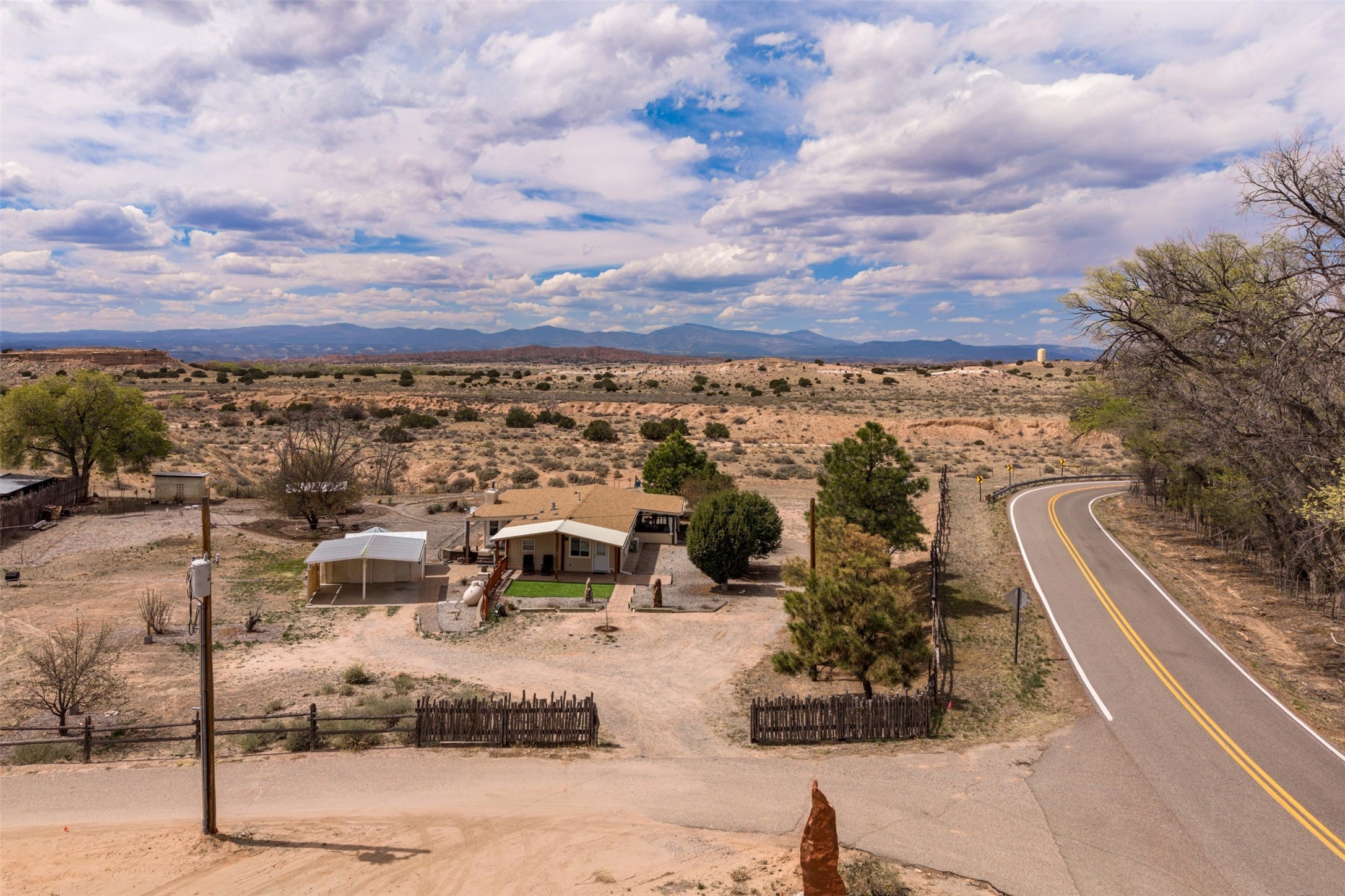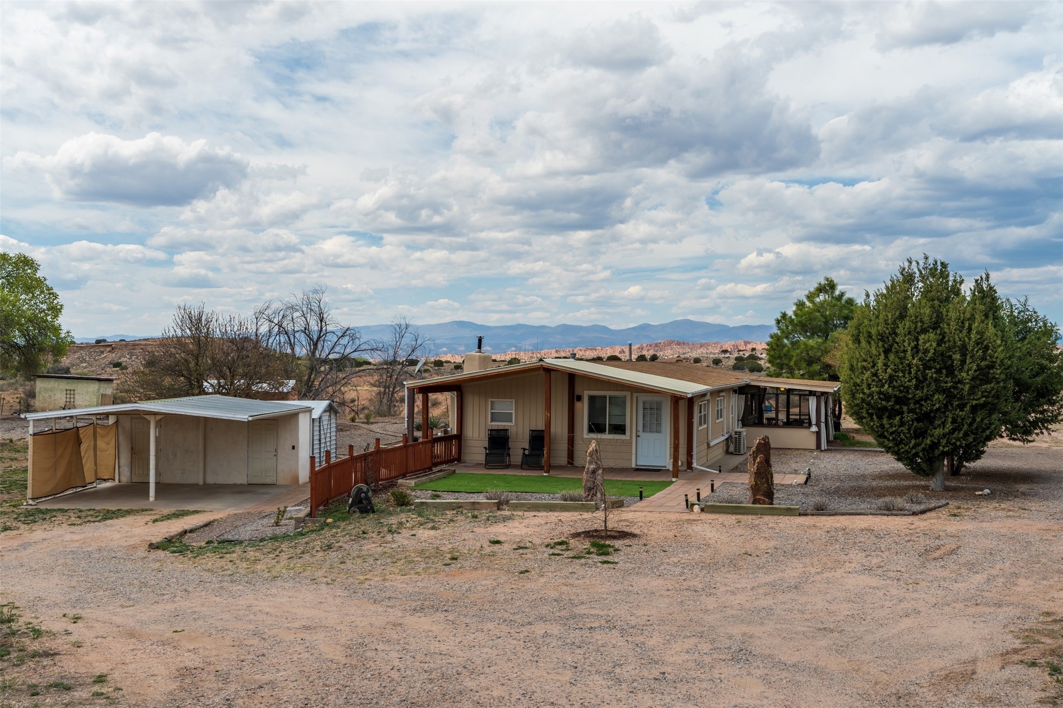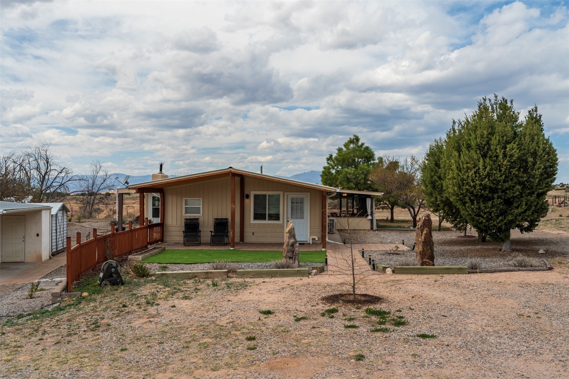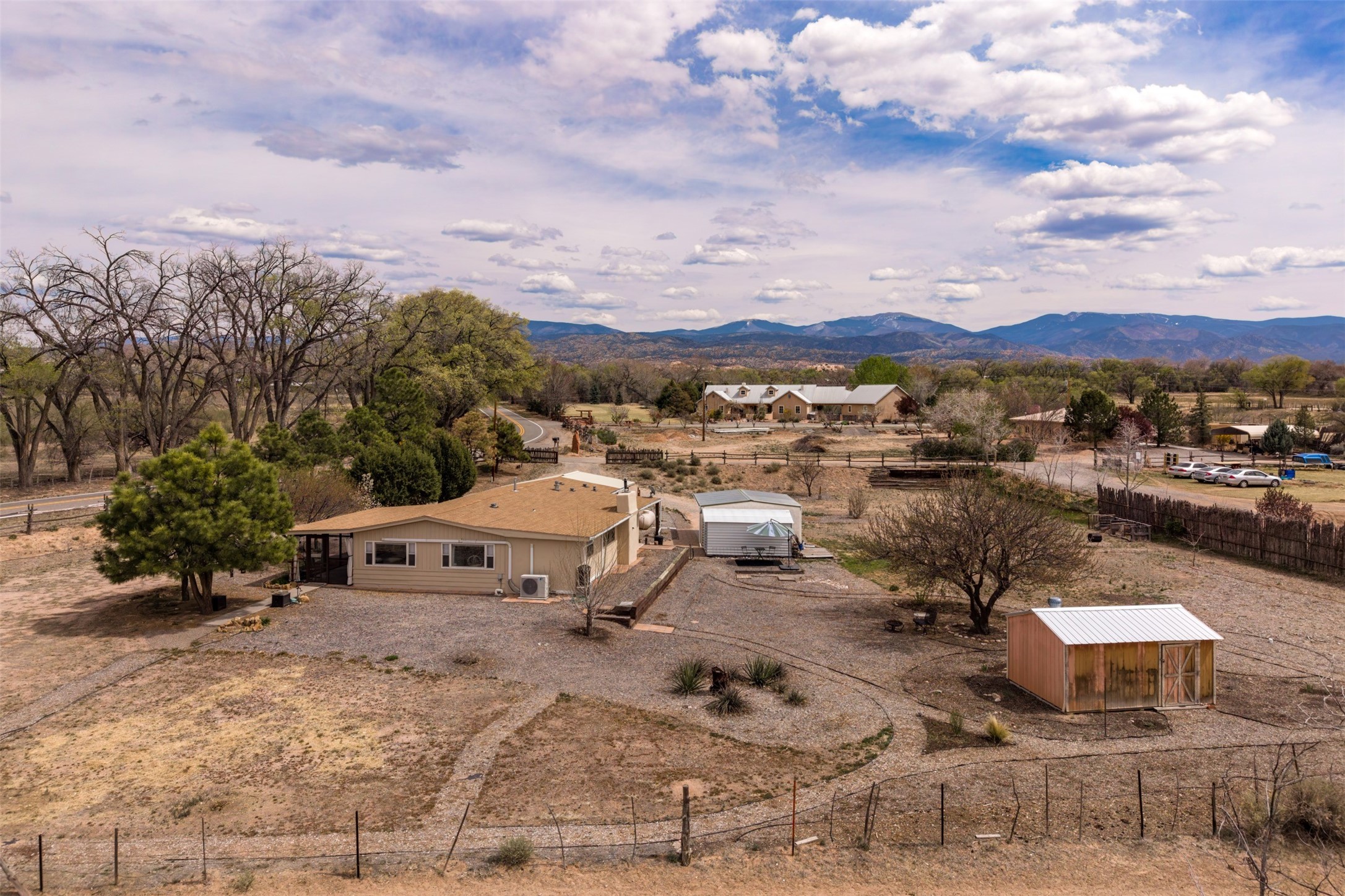 Set on 1+ acres in Namb, 1 Calle Andreita opens to a wide horizon--Pueblo lands stretching out to the West, the Jemez Mountains rising in the distance, and the Sangre de Cristo Mountains to the East, catching the evening light as the sun sets. It's a tranquil setting that feels quiet and grounded, with a daily rhythm shaped by sky, high desert vistas, and the occasional visit from horses at the fence line, drawn in by water, snacks, or human companionship.The property is configured as a duplex, totaling approximately 1,750 square feet, offering flexibility for a range of uses. The main residence, approximately 960sq/ft, includes three bedrooms and two bathrooms. A fully screened, private portal faces north--an easy place to settle in with a book, share a meal, or take in the surrounding landscape while protected from the heat of the afternoon sun. The attached guest house, approximately 790sq/ft, provides two additional bedrooms and a full bathroom, with its own portal oriented toward the Sangre de Cristos, with morning light and open views.Both living spaces have been updated with refreshed kitchens and bathrooms, and each includes its own washer and dryer. The land itself offers room to expand into outdoor living--gardens, gathering spaces, or simply open ground to enjoy as-is. A quiet corner of the property, bordering Pojoaque Pueblo land with outstanding views, is the perfect spot for a morning coffee, an evening cocktail, or a blissful meditation. Mature trees, including apple, apricot, and peach, add texture and seasonal color, while surface irrigation rights and a private well support long-term stewardship of the land.Additional improvements include three storage sheds and a double carport with extra storage. Despite the quiet, unhurried rhythm of life in Namb, the location remains practical--roughly 25 minutes to the Santa Fe Plaza and under 30 minutes to Los Alamos and the National Laboratory.