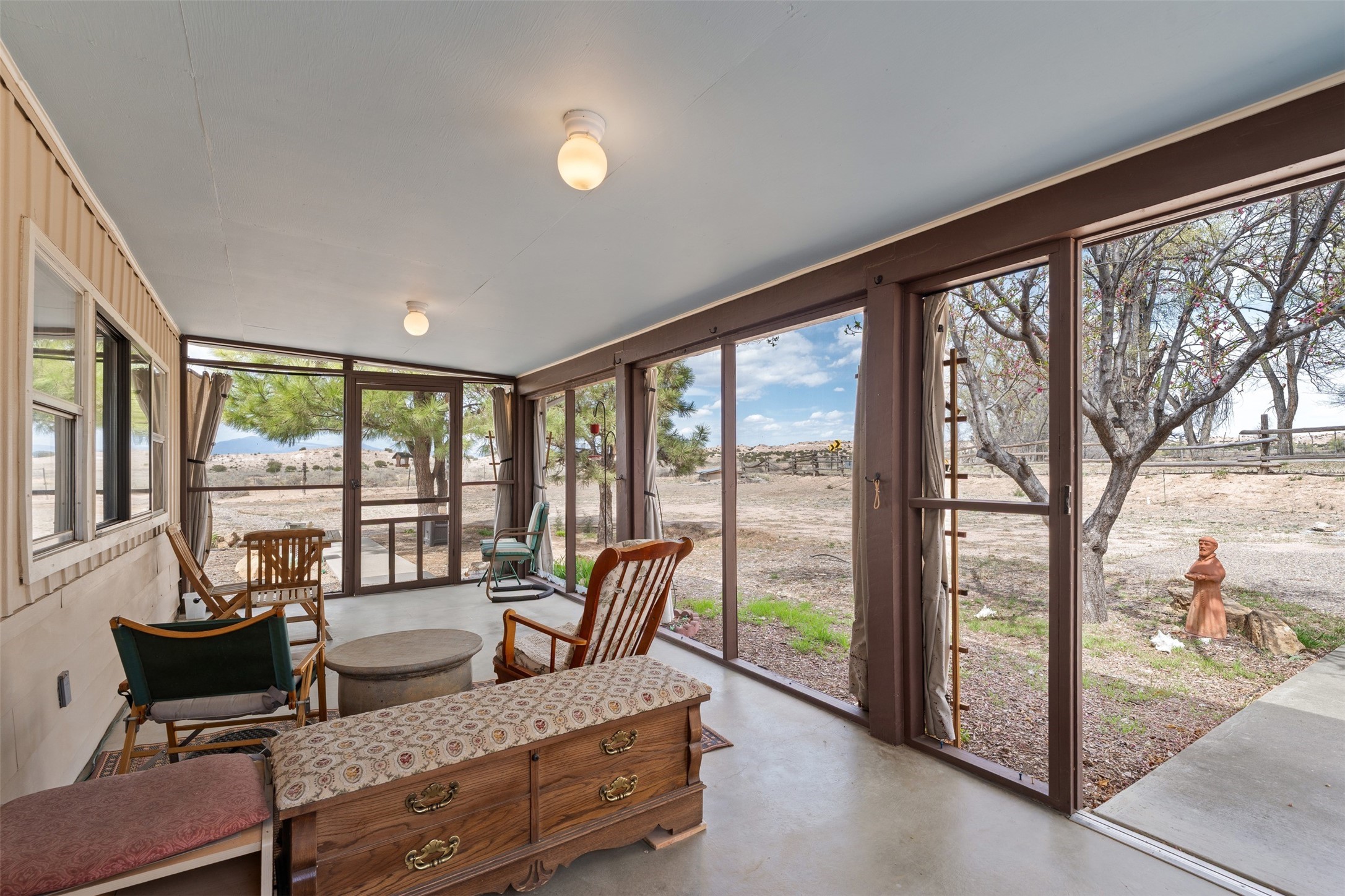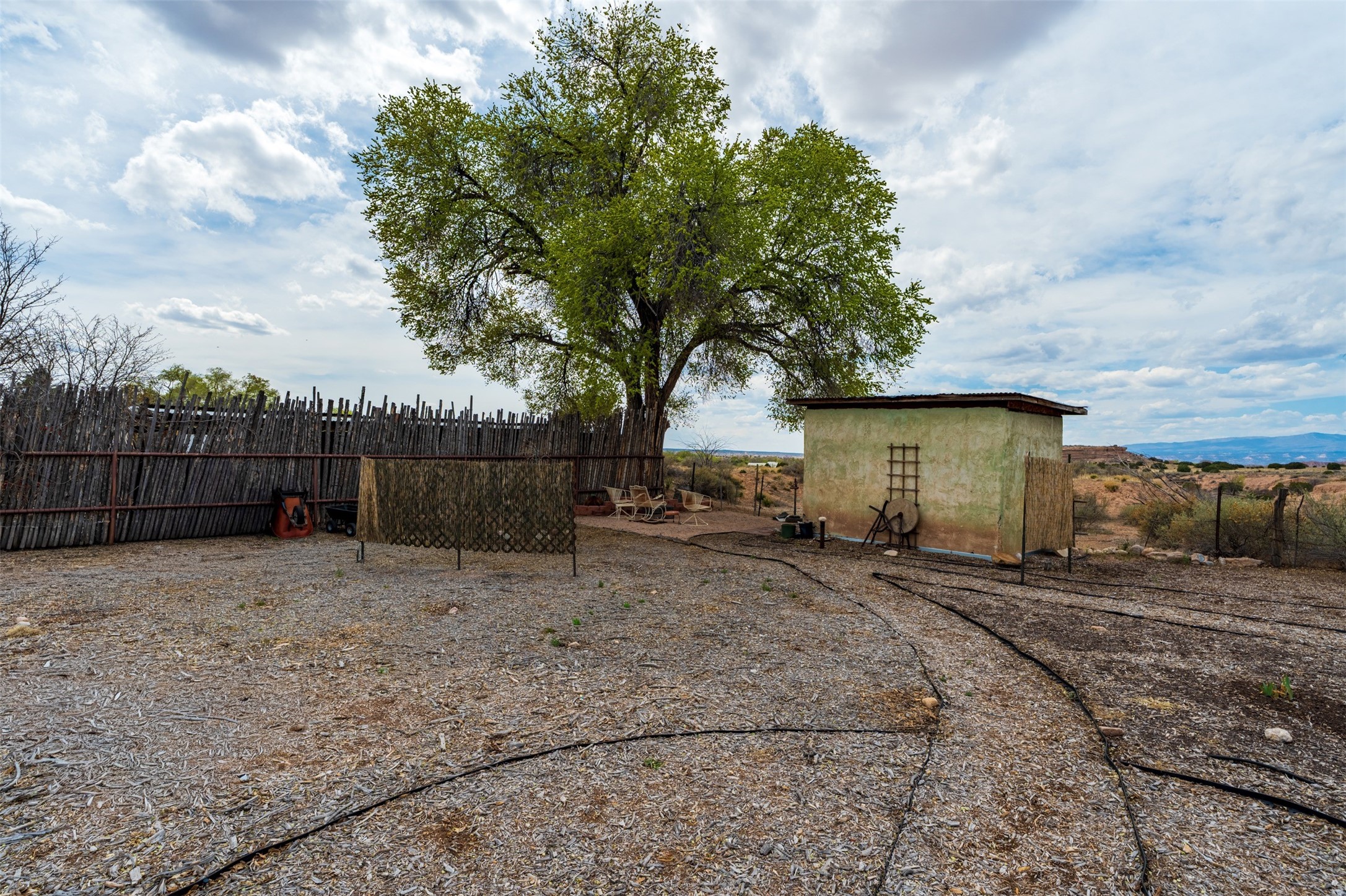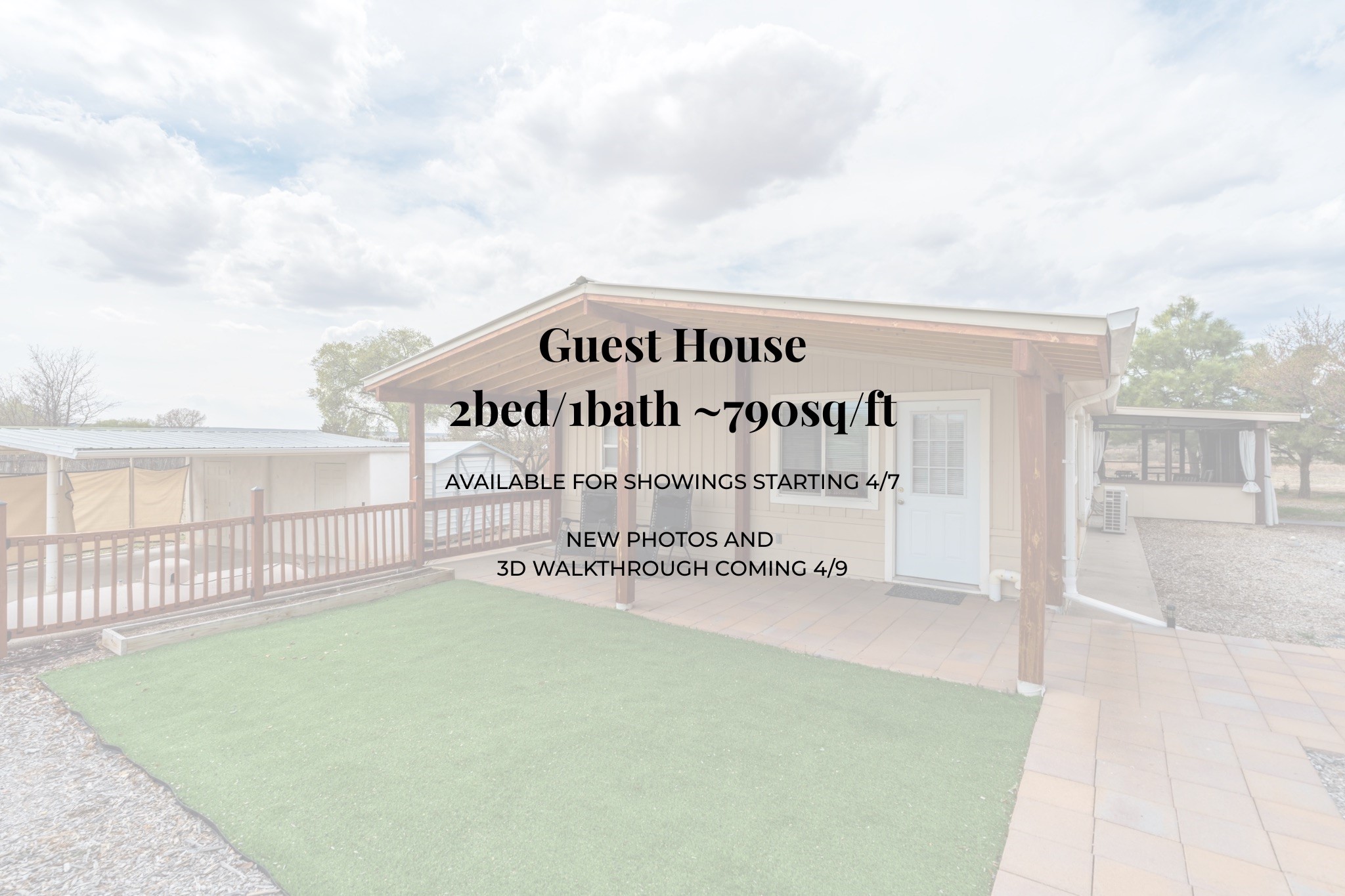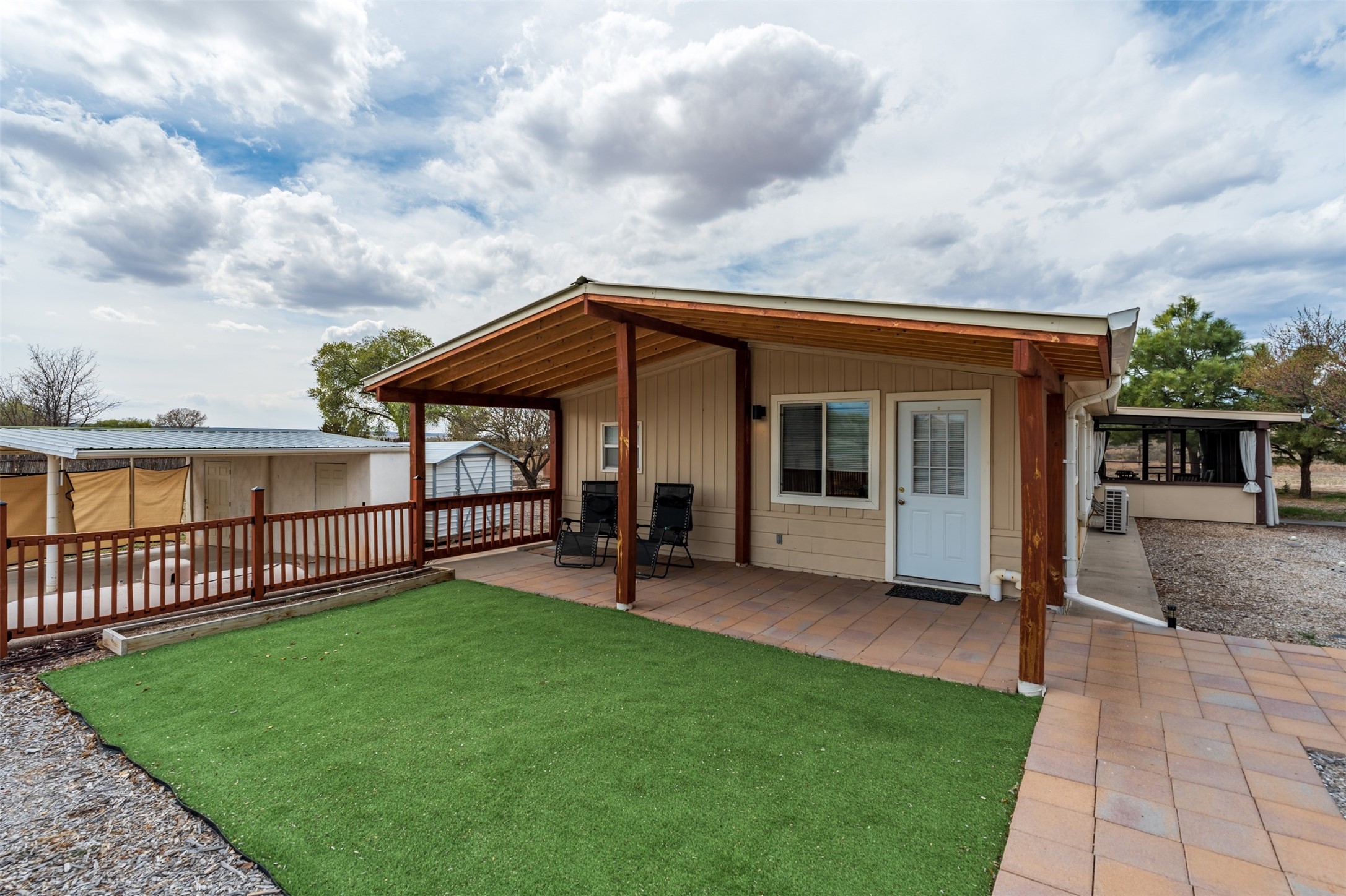 Set on 1+ acres in Namb, 1 Calle Andreita opens to a wide horizon--Pueblo lands stretching out to the West, the Jemez Mountains rising in the distance, and the Sangre de Cristo Mountains to the East, catching the evening light as the sun sets. It's a tranquil setting that feels quiet and grounded, with a daily rhythm shaped by sky, high desert vistas, and the occasional visit from horses at the fence line, drawn in by water, snacks, or human companionship.The property is configured as a duplex, totaling approximately 1,750 square feet, offering flexibility for a range of uses. The main residence, approximately 960sq/ft, includes three bedrooms and two bathrooms. A fully screened, private portal faces north--an easy place to settle in with a book, share a meal, or take in the surrounding landscape while protected from the heat of the afternoon sun. The attached guest house, approximately 790sq/ft, provides two additional bedrooms and a full bathroom, with its own portal oriented toward the Sangre de Cristos, with morning light and open views.Both living spaces have been updated with refreshed kitchens and bathrooms, and each includes its own washer and dryer. The land itself offers room to expand into outdoor living--gardens, gathering spaces, or simply open ground to enjoy as-is. A quiet corner of the property, bordering Pojoaque Pueblo land with outstanding views, is the perfect spot for a morning coffee, an evening cocktail, or a blissful meditation. Mature trees, including apple, apricot, and peach, add texture and seasonal color, while surface irrigation rights and a private well support long-term stewardship of the land.Additional improvements include three storage sheds and a double carport with extra storage. Despite the quiet, unhurried rhythm of life in Namb, the location remains practical--roughly 25 minutes to the Santa Fe Plaza and under 30 minutes to Los Alamos and the National Laboratory.