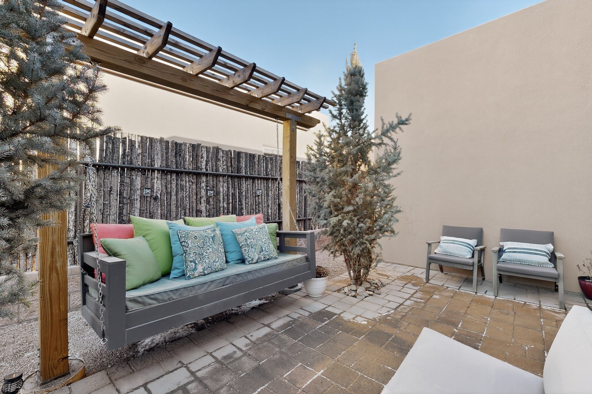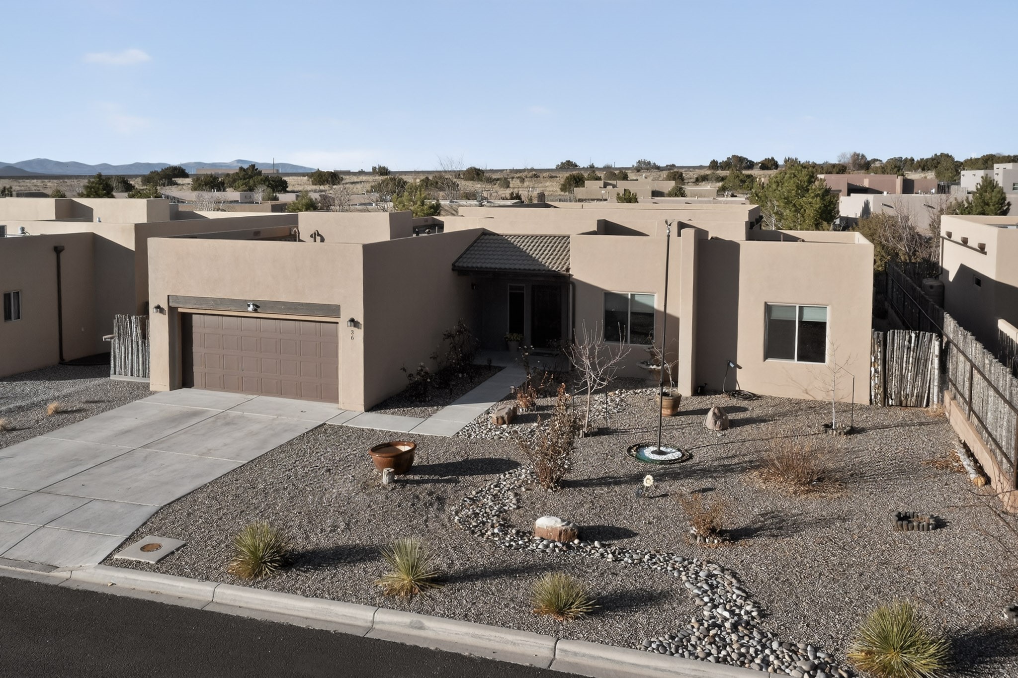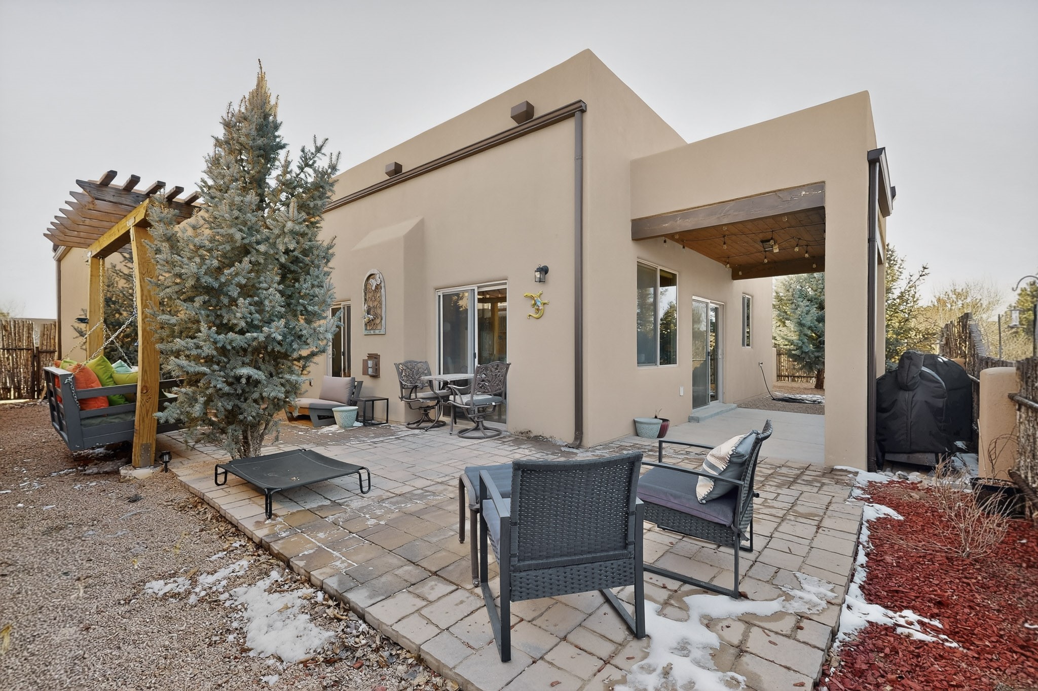 Welcome to this enchanting home in La Pradera. Built in 2018 it is designed for modern living. The open concept layout is enhanced by high ceilings, creating an airy and inviting atmosphere. The chefs kitchen features granite countertops and a walk-in pantry that is perfect for culinary enthusiasts. The primary suite is thoughtfully separated from the other bedrooms, allowing for privacy and comfort. Additional features include a tankless water heater, soaking tub, separate shower and spacious walk-in closet. Enjoy the serene outdoor living space which includes a private sanctuary with a swinging daybed, ideal for relaxation. With easy commuting to Los Alamos or Albuquerque and nearby walking trails and open space, this home is a perfect blend of convenience and tranquility.