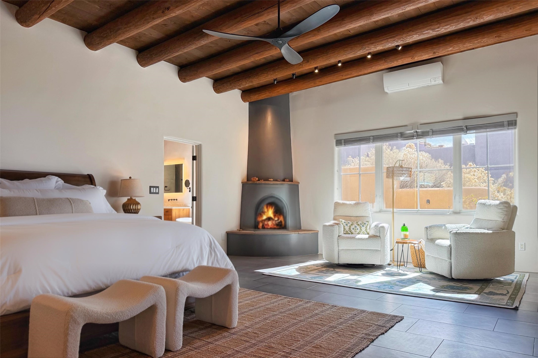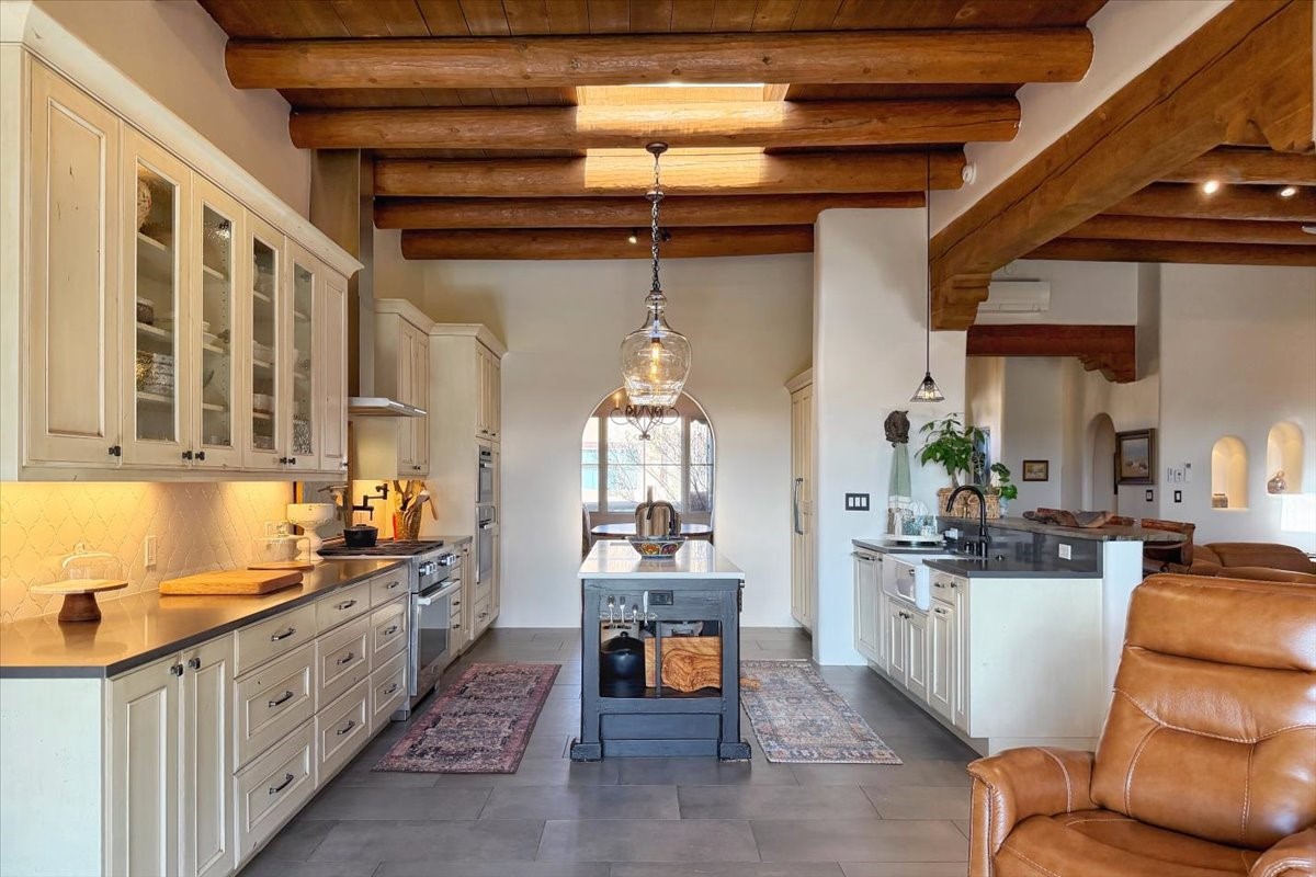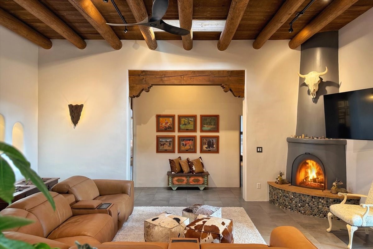 Set within the serene landscape of Aldea de Santa Fe, 46 E. Via Plaza Nueva embodies the essence of refined Pueblo-style architecture and elevated high-desert living. Encompassing approximately 3,947 square feet--with nearly all living spaces thoughtfully arranged on a single level--this residence offers both architectural presence and effortless livability just minutes from the historic Santa Fe Plaza.Wrought-iron gates open to a wraparound garden and sculpted courtyard. Beyond the custom front door, a welcoming foyer reveals expansive open-concept living and entertaining spaces defined by soaring ceilings, softly burnished plaster walls, hand-hewn vigas, and artisan tilework. The living room centers on a classic kiva fireplace, flowing seamlessly to the dining area and chef's kitchen--each space oriented toward sweeping Sangre de Cristo Mountain views and a generous covered portal with built-in grilling for effortless indoor-outdoor gatherings.The private bedroom wing includes three spacious suites on the main level, each with its own bath and tranquil separation from the public rooms. The primary suite is a true retreat, offering a sitting area, direct terrace access, and mountain vistas. Its spa-inspired bath features a sculptural soaking tub, expansive walk-in shower, and substantial dressing closet.Supporting spaces on the main level include a well-appointed laundry/utility room, oversized two-car garage, and a substantial dedicated workshop--ideal for studio, hobby, or storage needs. A single lower-level flex room--suited for guest quarters, media room, or office--opens to a sheltered terrace, providing privacy and versatility.Outdoors, layered portals, patios, and garden rooms capture Aldea's celebrated connection to sky and landscape--perfect for sunrise coffee, sunset dining, or quiet contemplation beneath Santa Fe's luminous light. The fully fenced and gated grounds enhance both privacy and ease of living.Aldea is cherished for its peaceful ambiance, architectural integrity, and exceptional amenities, including approximately 205 acres of preserved open space, tennis courts, walking trails, and neighborhood parks. With immediate access to NM-599, DeVargas Center, downtown galleries, and the Plaza are all within a convenient 15-minute drive.