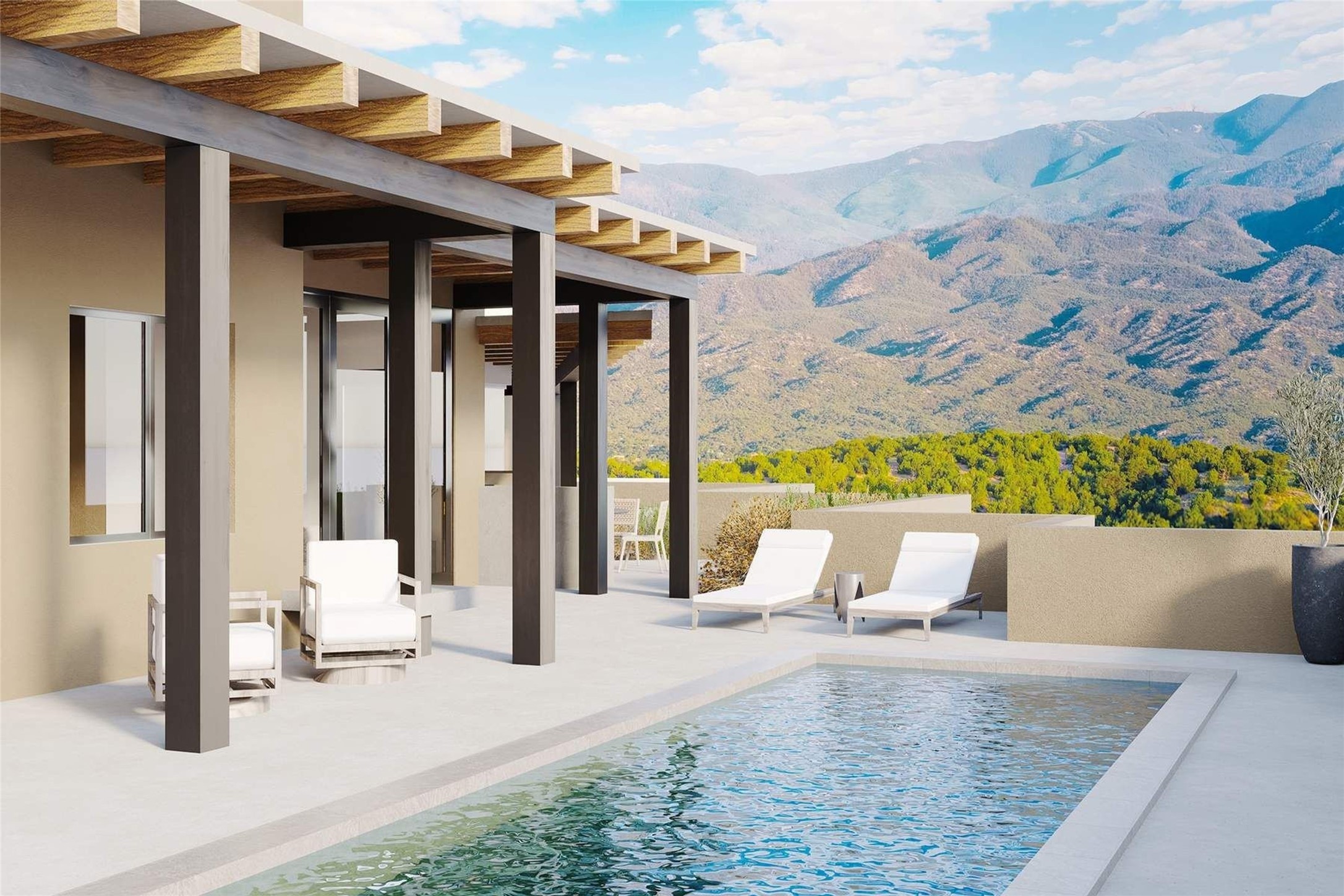 Experience the Ultimate Santa Fe lifestyle. Ready to build, with permit in hand, this To-Be-Built custom masterpiece by the award-winning Acacia Builders, excites with front row stunning views of the Sangre De Cristo Mountain. Located within the famed community of Monte Sereno, minutes to the Santa Fe Plaza and the world-renown Santa Fe Opera, this Monte Sereno home is one of the most captivating future residences in all of Santa Fe. Designed by renowned Santa Fe architect, Rad Acton, this stunning one-level home on a one-acre lot, offers an exquisite and rare four-bedroom floor plan tailored for indoor and outdoor living. The thoughtful design seamlessly flows and opens to over 1300 square feet of covered portals with a grilling station and an OPTIONAL pool, for both relaxation and the ultimate outdoor living experience. The walls of glass allow for the daily viewing of seasonal colors of the Aspen trees on the mountainside, the legendary sunsets and moonrises or step outside for stargazing under the dark skies of New Mexico. The smart design features a grand entertaining space with open dining and kitchen, a three-car garage, an office, four spacious bedroom suites and a second living room in the guest wing. The heart of the home is a gourmet kitchen with a corner window that Wows with a view! The chef in the household will be proud to host with a Wolf/Sub-Zero appliance package, a large island and full butler's pantry. The private primary retreat delights with expansive mountain views, a modern gas fireplace with concrete surround seating, and a sun-filled spa bathroom with a spacious walk-in closet. Additional exceptional features of this transitional style home with Santa Fe touches, include wood flooring, creamy plaster walls, wood beamed ceilings and multiple cozy fireplaces. With a building permit in place, the new owner can start construction quickly and save valuable time to focus on the fun of choosing colors & finishes on their dream home. All renderings are shown with furniture, art, lighting and rugs that can be purchased or modified for your lifestyle with the interior design team at Reverie3D who can offer a turn key move-in ready experience. The pool is not included in the listing price, though possible as an additional upgrade.
