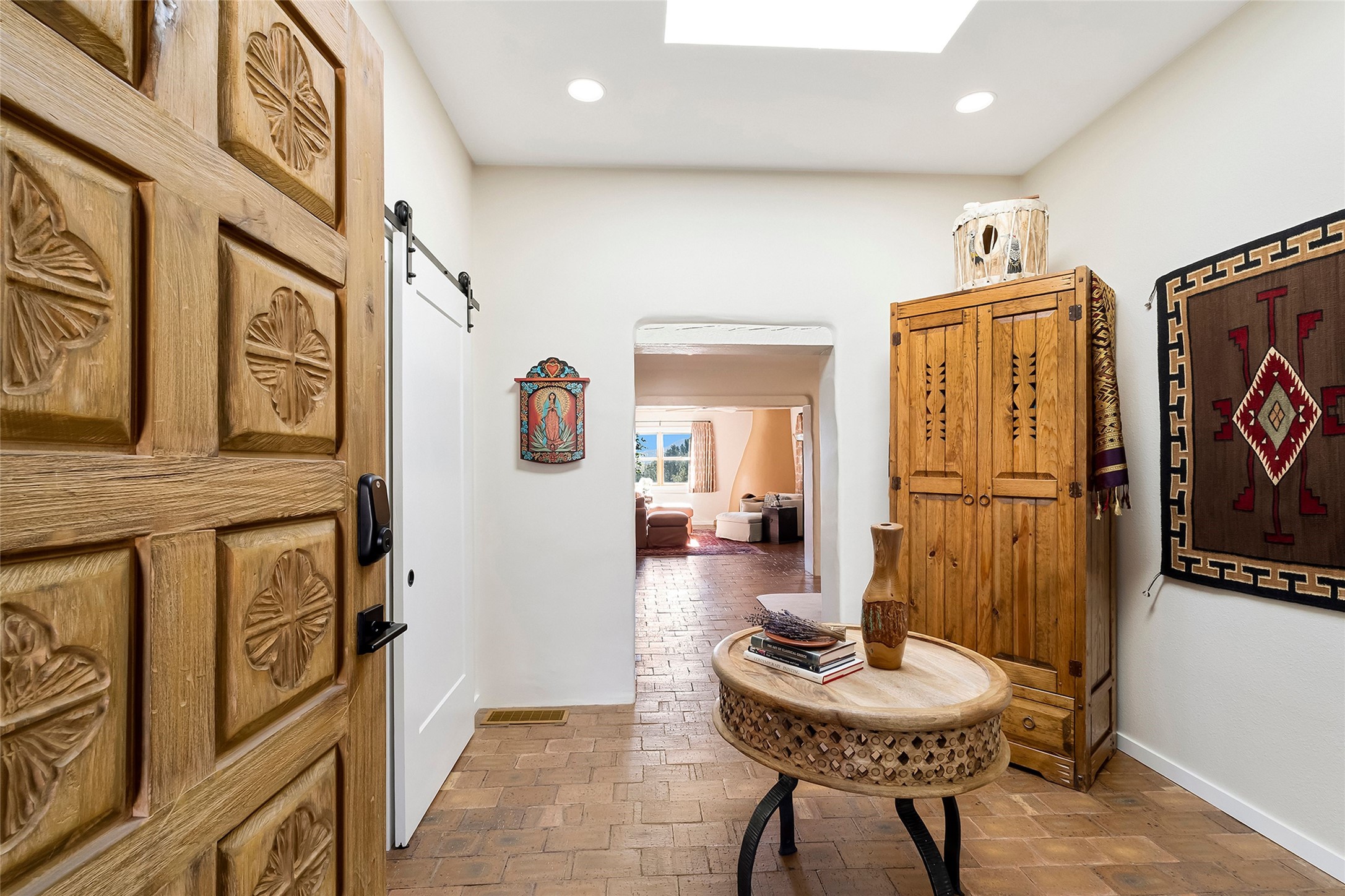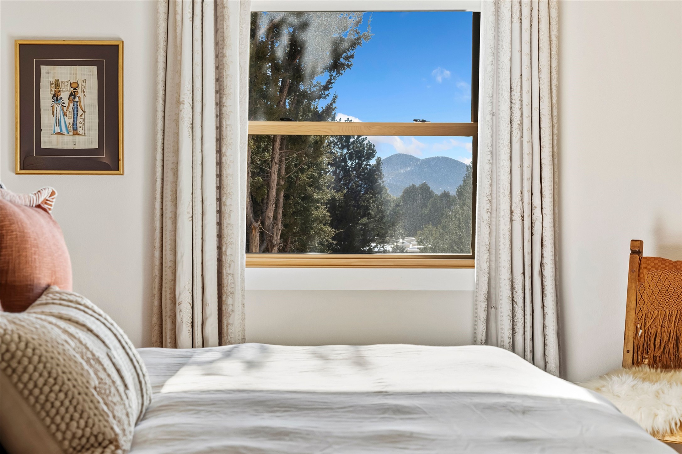 Perched at the top of the hill, this exceptionally renovated single-level end-unit condominium offers privacy and breathtaking Sangre de Cristo Mountain views. This three-bedroom, two-bath residence on the desirable north side provides convenient access to downtown Santa Fe (approximately one mile away), nearby arroyo trails, the Ski Basin, mountain recreation, and Los Alamos. Thoughtfully and extensively updated inside and out by the current owner with over $350,000 in upgrades since 2022 which includes stucco, HVAC, bathrooms, kitchen and much more. This home blends classic Santa Fe charm with modern comfort with a locally sourced custom carved wood front door, wood beamed ceilings, a corner Kiva fireplace and brick floors. A proper foyer welcomes you inside, and the well-designed floor plan offers comfortable flow, excellent bedroom separation and generous use of skylights that fill the home with natural light. The spacious primary suite features greenbelt and mountain top views, a large walk-in closet, LVP flooring, a renovated bathroom with dual sinks and a soaking tub/shower combo.The renovated kitchen showcases updated cabinetry, quartz countertops, Bosch stainless steel induction cooktop/oven, upgraded lighting, laundry room and direct access to the one car garage. The rear portal opens to a peaceful greenbelt creating a tranquil setting for relaxing while enjoying sunset, mountain and city views. This condo offers a rare combination of location, privacy, views, and quality updates.