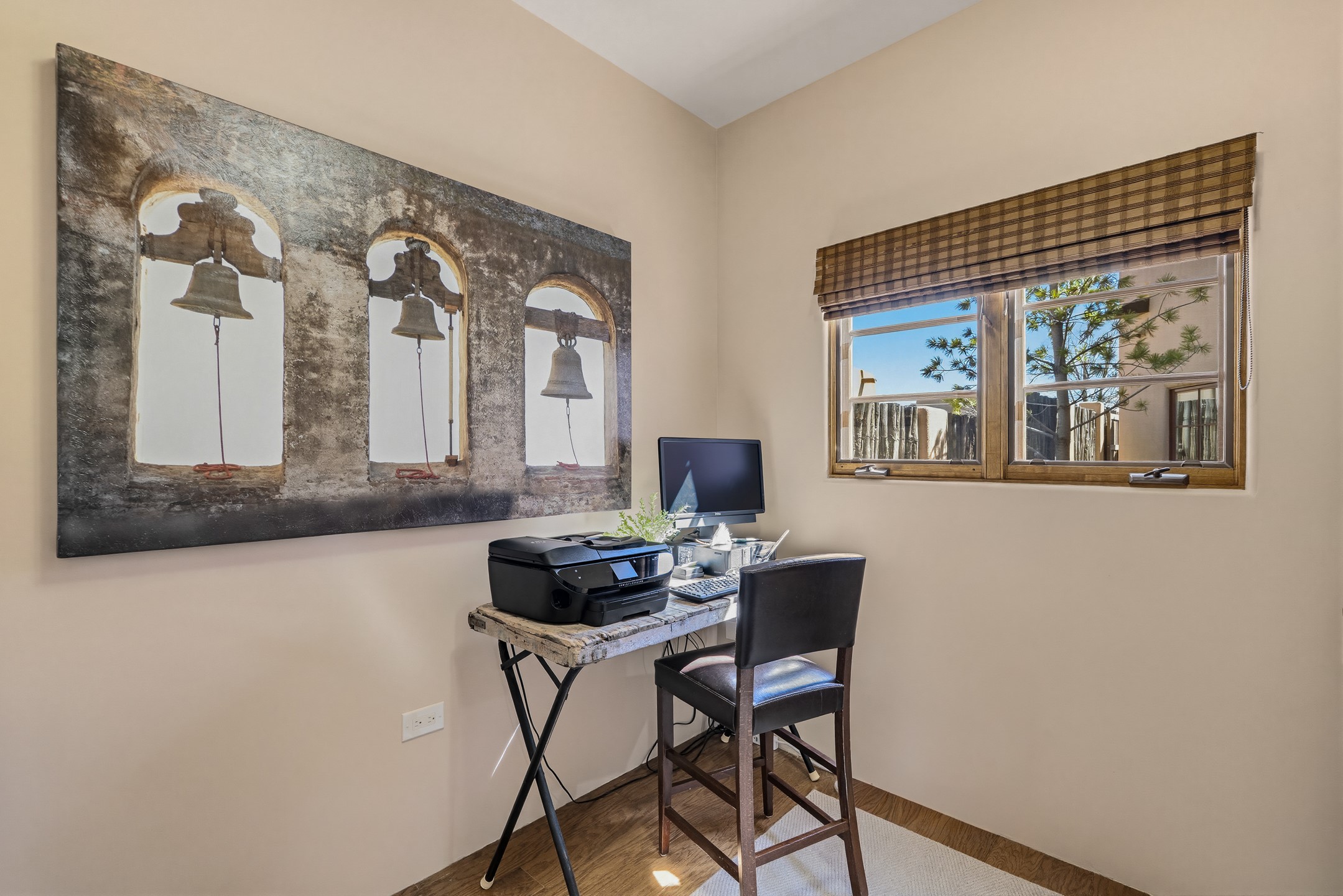 Experience refined Santa Fe living in this beautifully updated 3-bedroom, 2.5-bath Pueblo-style home in Aldea de Santa Fe. Perfectly positioned to capture sweeping views of the Jemez, Sangre de Cristo, and Sandia Mountains, this home offers a warm and sophisticated atmosphere with classic viga ceilings, lovely earth-colored plastered walls, and view-filled windows throughout. The welcoming living room is anchored by a corner kiva fireplace, creating an inviting space to relax and entertain.The reimagined and fully remodeled kitchen features new cabinetry, countertops, appliances, tile, and fixtures, blending style and functionality. It opens to a cozy library/media room with built-in bookcases and an entertainment center--an ideal space for gathering or quiet evenings at home.The entire second floor is dedicated to the spacious primary suite, complete with a spa-like bathroom featuring a soaking tub, walk-in shower, and French doors that open to a private balcony with breathtaking mountain views.Recent upgrades throughout the home enhance both beauty and comfort, including refreshed interior doors finished with a modern stain, updated lighting, and thoughtful aesthetic improvements. Outdoor living spaces are equally inviting, featuring a remodeled patio and refreshed landscaping with a flagstone patio and raised flower beds, perfect for enjoying Santa Fe's spectacular sunsets and outdoor lifestyle. The front portal features an outdoor kiva fireplace for cozy evenings.Additional features include radiant floor heating, mini-split AC for year-round comfort, a new 2024 GacoFlex silicone membrane roof, freshly painted elastomeric stucco exterior, and a spacious two-car attached garage with ample storage.Located in the desirable Aldea community, residents enjoy walking trails, parks, tennis, pickleball and basketball courts, and abundant open space in this peaceful, nature-filled setting just minutes from downtown Santa Fe.