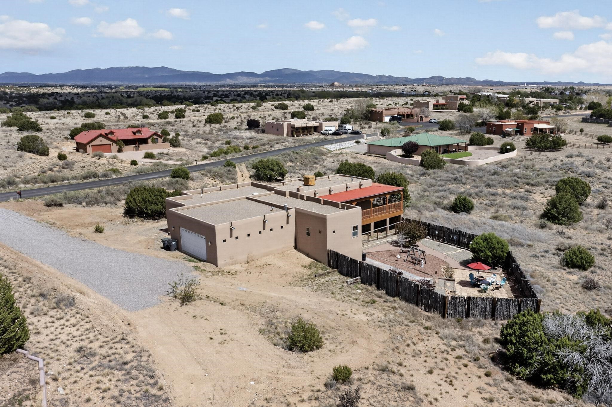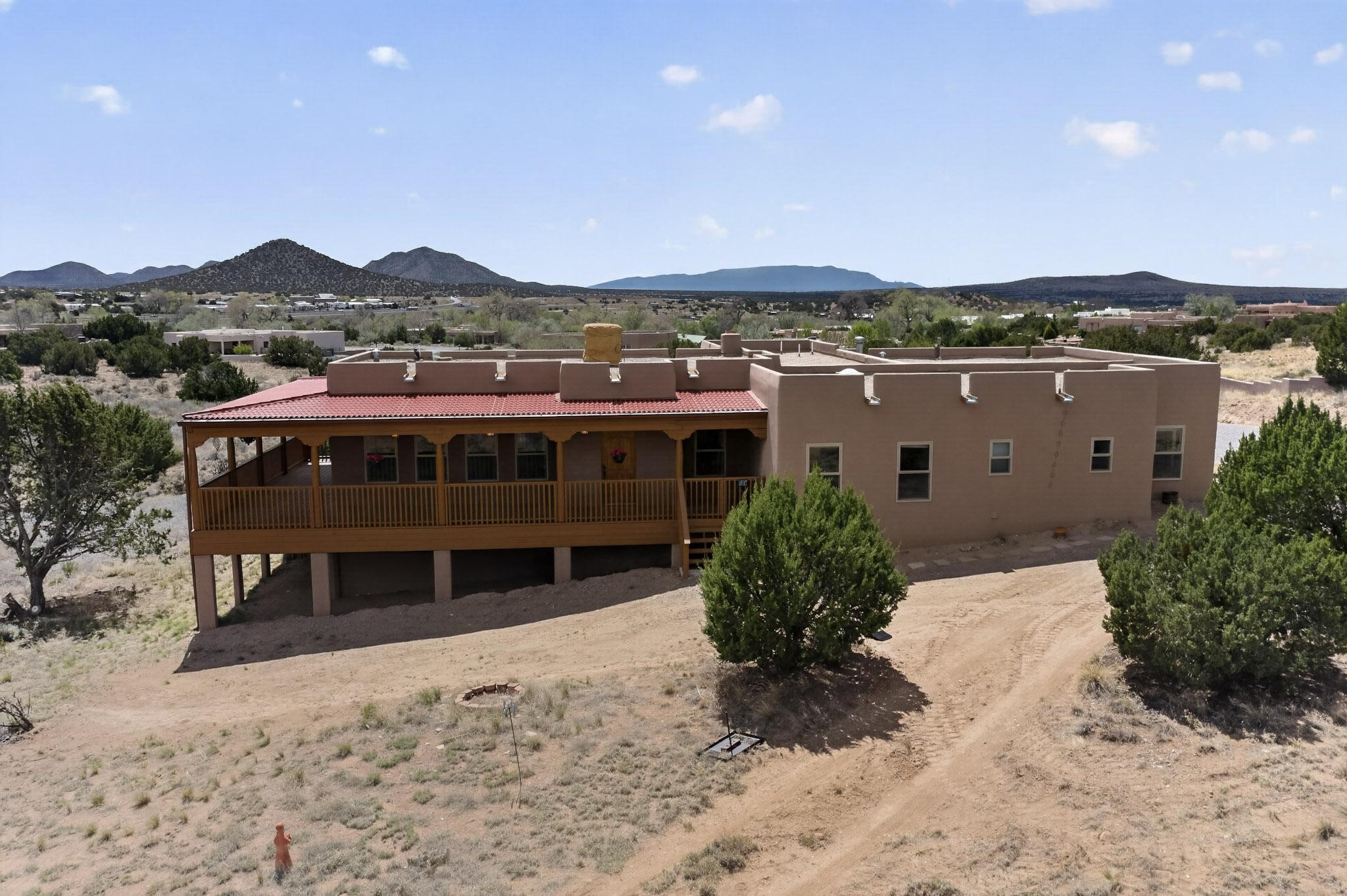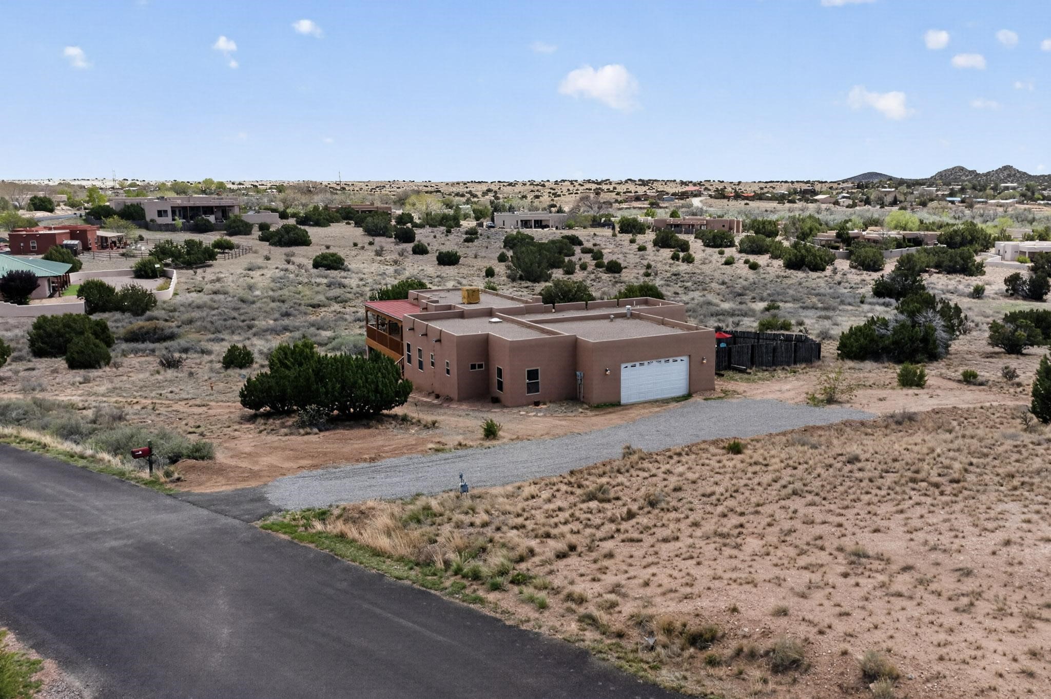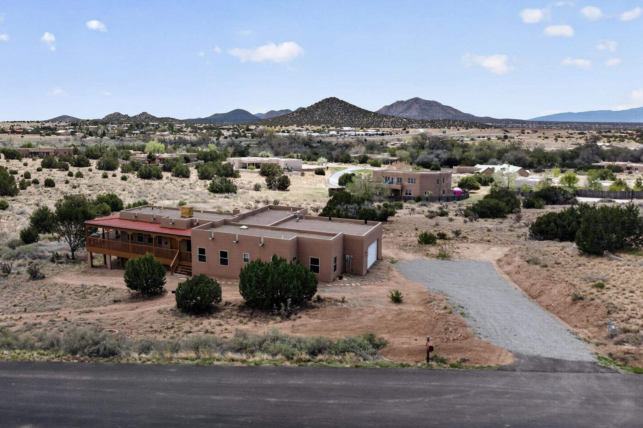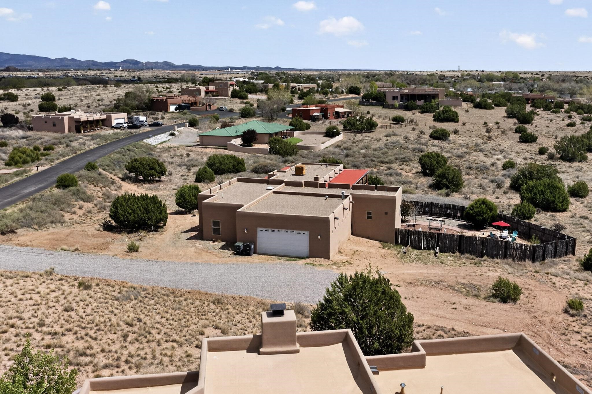 Nestled within the highly sought after gated community of Las Lagunitas with spacious lot sizes, this exceptional three bedroom two bath custom home on 1.36 acres embodies the perfect blend of refined Santa Fe comfort and elegance. Thoughtfully designed with a oversized two car garage and open concept layout, the spacious kitchen flows seamlessly into the dining and living room area and is ideal for both entertaining and everyday comfort. This single level residence features three oversized bedrooms and two bathrooms the Primary bedroom has a large jetted tub large walk in closet and a snail shower served up with instant hot water. This home features a stunning wraparound porch that captures the most picturesque elevated clear scenic views from all sides, both sunrise and sunset views are spectacular. Inside you will find a refined diamond plaster finish throughout the entire home, a water softener and large tile flooring that creates a clean and sophisticated look. The inviting living room features a charming kiva fireplace, tall ceilings and vigas that add warmth and authentic Santa Fe character to the space and has been well kept and loved by one family since being built! A large well maintained back yard with a beautifully built coyote fence made for privacy and ready for your entertainment. This home features a large crawlspace under the home that can be used for storage. Enjoy beautifully maintained common areas and landscaped grounds of Las Lagunitas, perfect for peaceful tranquil walks with your dog alongside serene ponds where fishing is also allowed offering a true connection to nature. Easy access to I-25