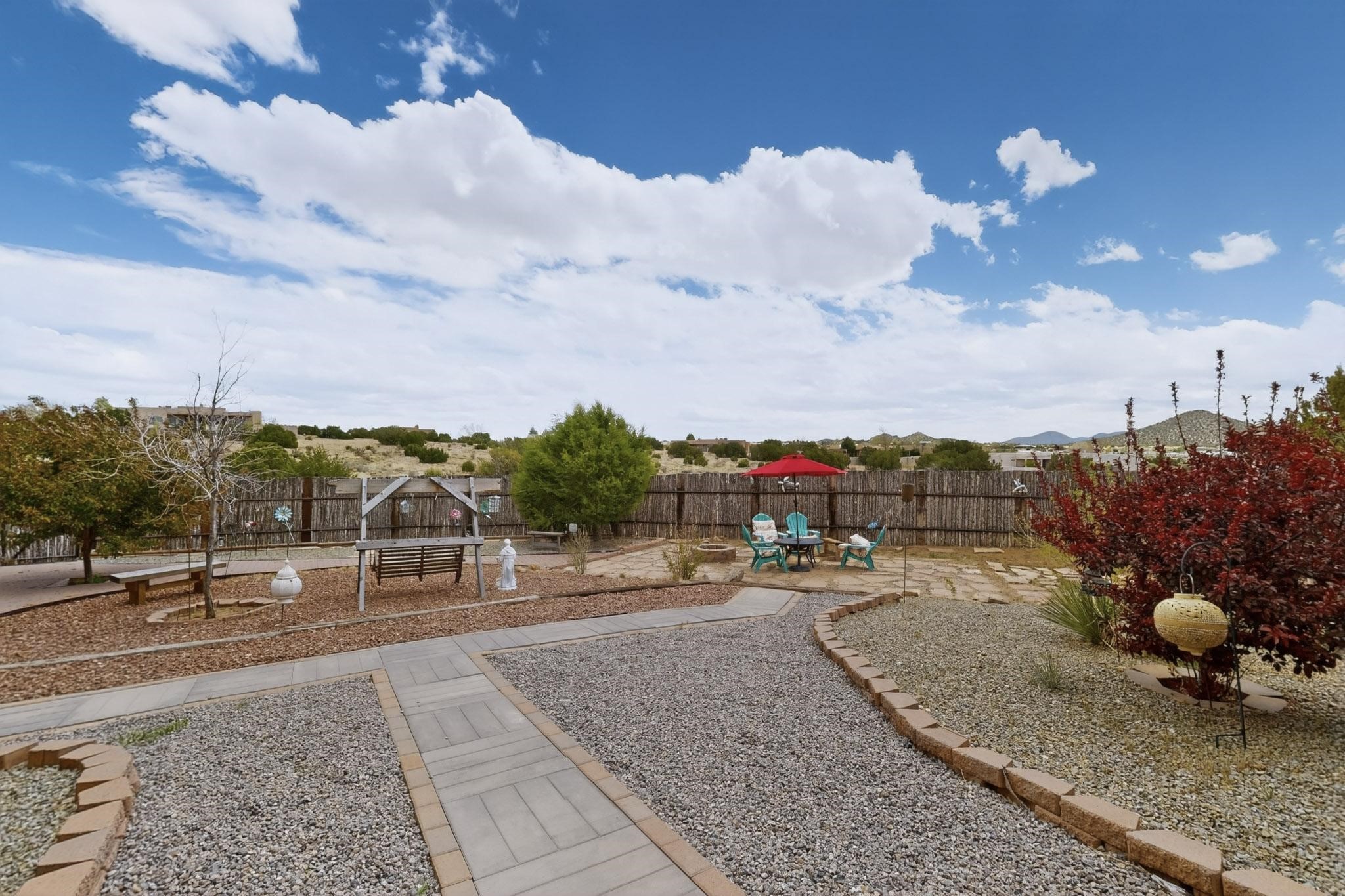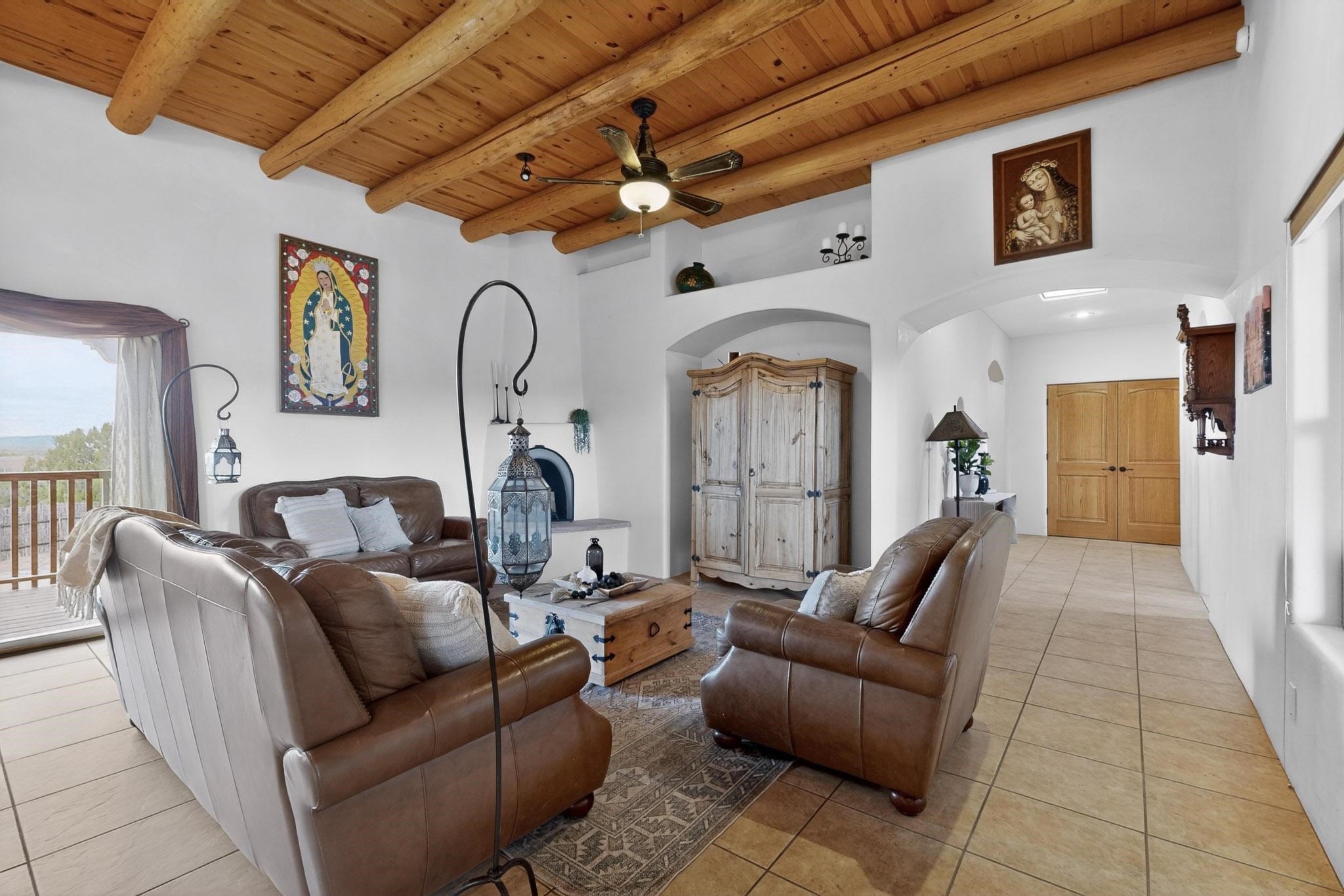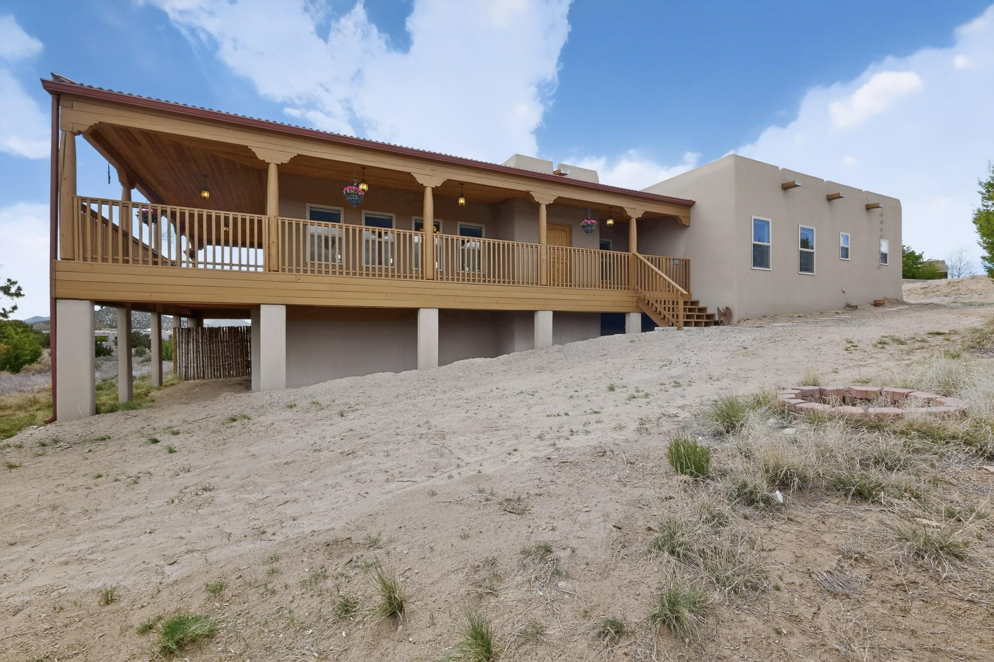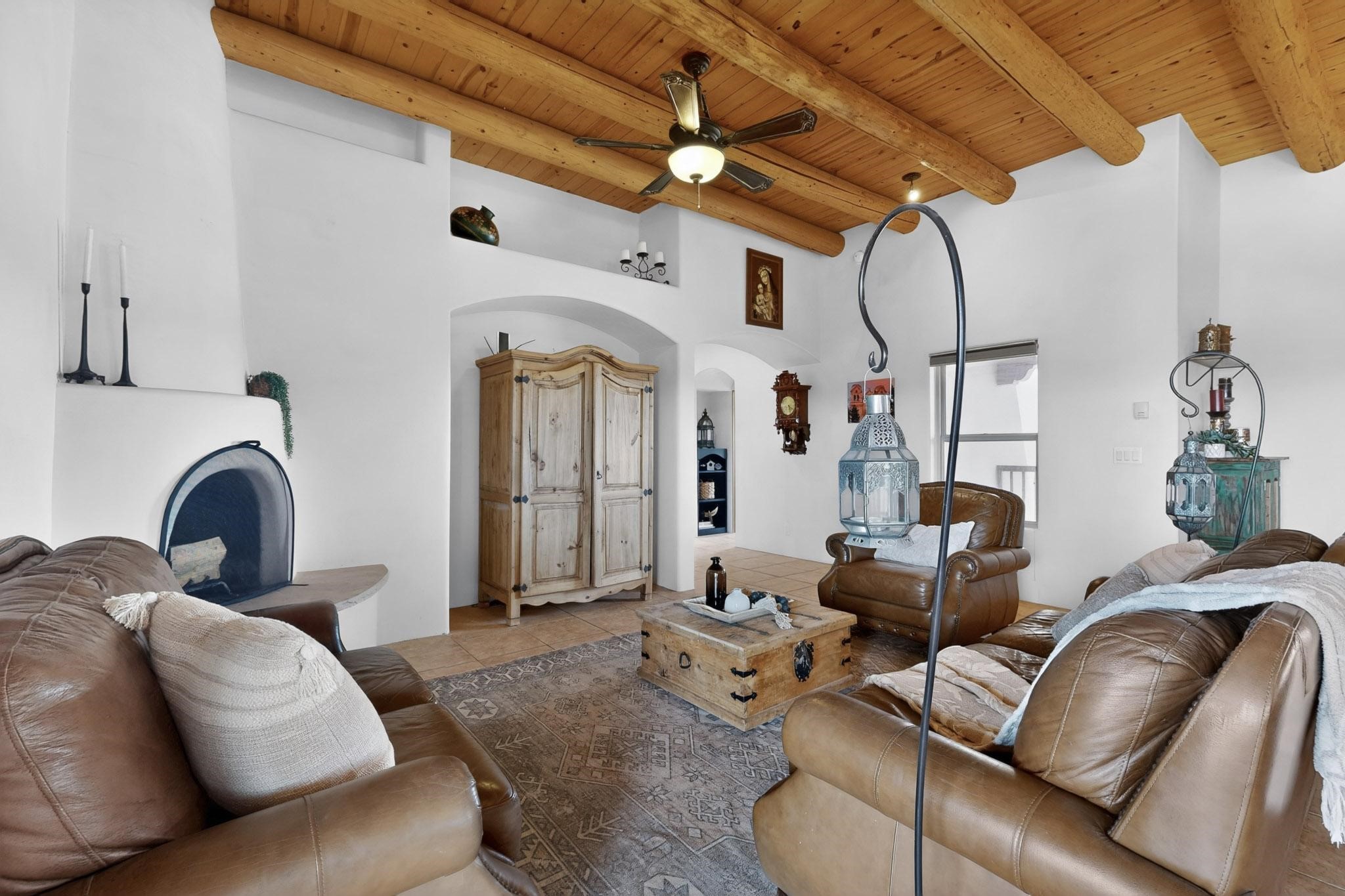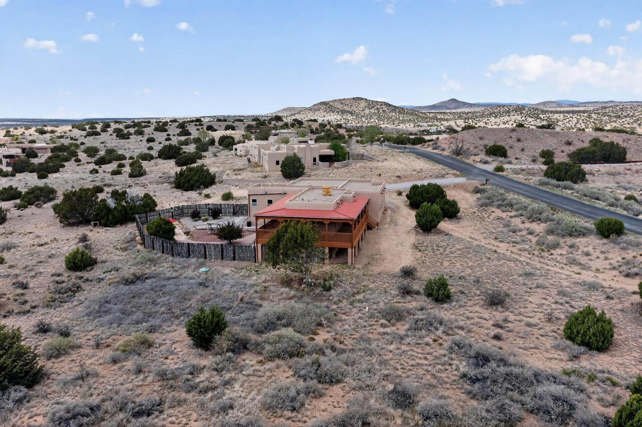 Nestled within the highly sought after gated community of Las Lagunitas with spacious lot sizes, this exceptional three bedroom two bath custom home on 1.36 acres embodies the perfect blend of refined Santa Fe comfort and elegance. Thoughtfully designed with a oversized two car garage and open concept layout, the spacious kitchen flows seamlessly into the dining and living room area and is ideal for both entertaining and everyday comfort. This single level residence features three oversized bedrooms and two bathrooms the Primary bedroom has a large jetted tub large walk in closet and a snail shower served up with instant hot water. This home features a stunning wraparound porch that captures the most picturesque elevated clear scenic views from all sides, both sunrise and sunset views are spectacular. Inside you will find a refined diamond plaster finish throughout the entire home, a water softener and large tile flooring that creates a clean and sophisticated look. The inviting living room features a charming kiva fireplace, tall ceilings and vigas that add warmth and authentic Santa Fe character to the space and has been well kept and loved by one family since being built! A large well maintained back yard with a beautifully built coyote fence made for privacy and ready for your entertainment. This home features a large crawlspace under the home that can be used for storage. Enjoy beautifully maintained common areas and landscaped grounds of Las Lagunitas, perfect for peaceful tranquil walks with your dog alongside serene ponds where fishing is also allowed offering a true connection to nature. Easy access to I-25