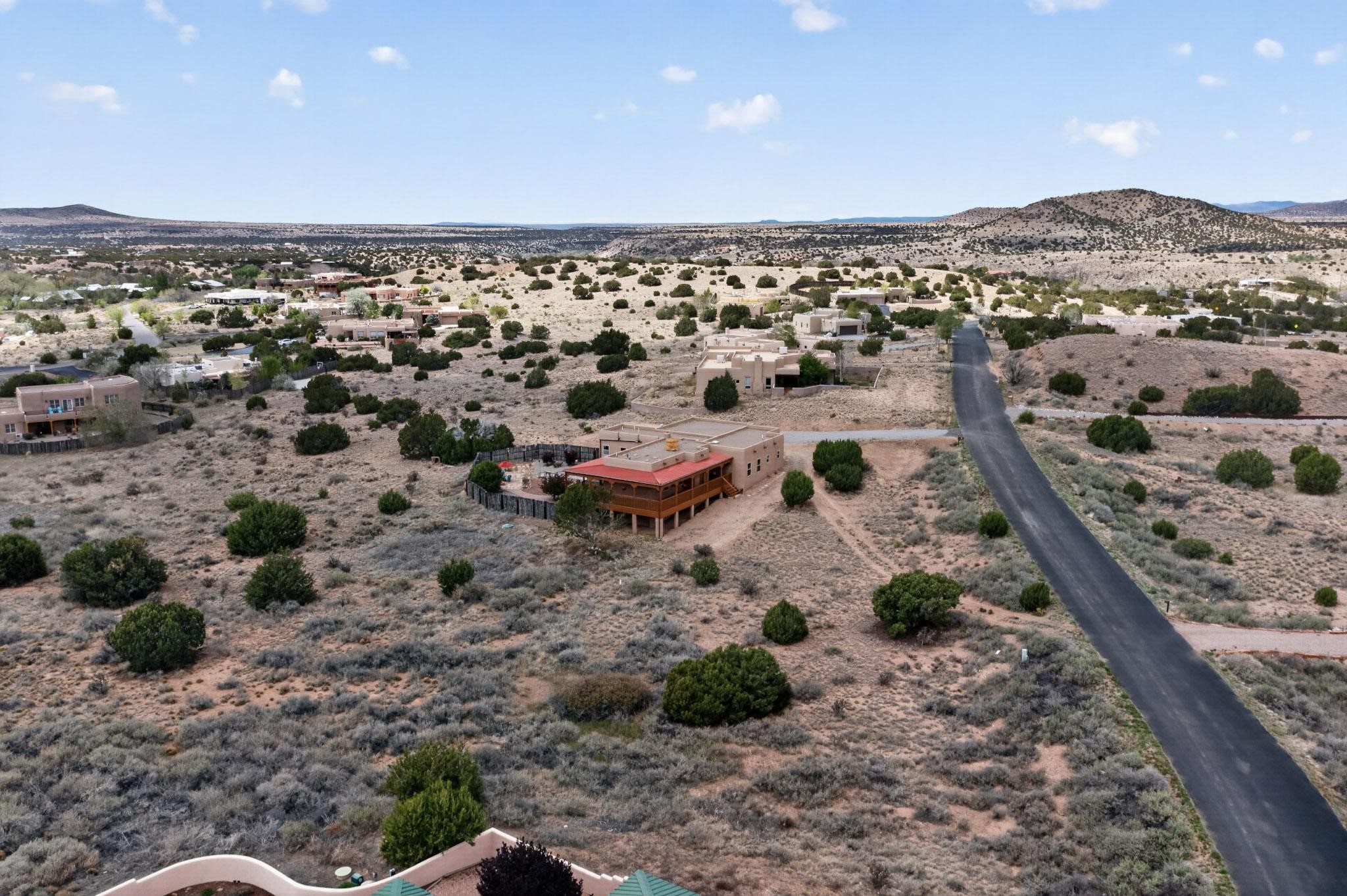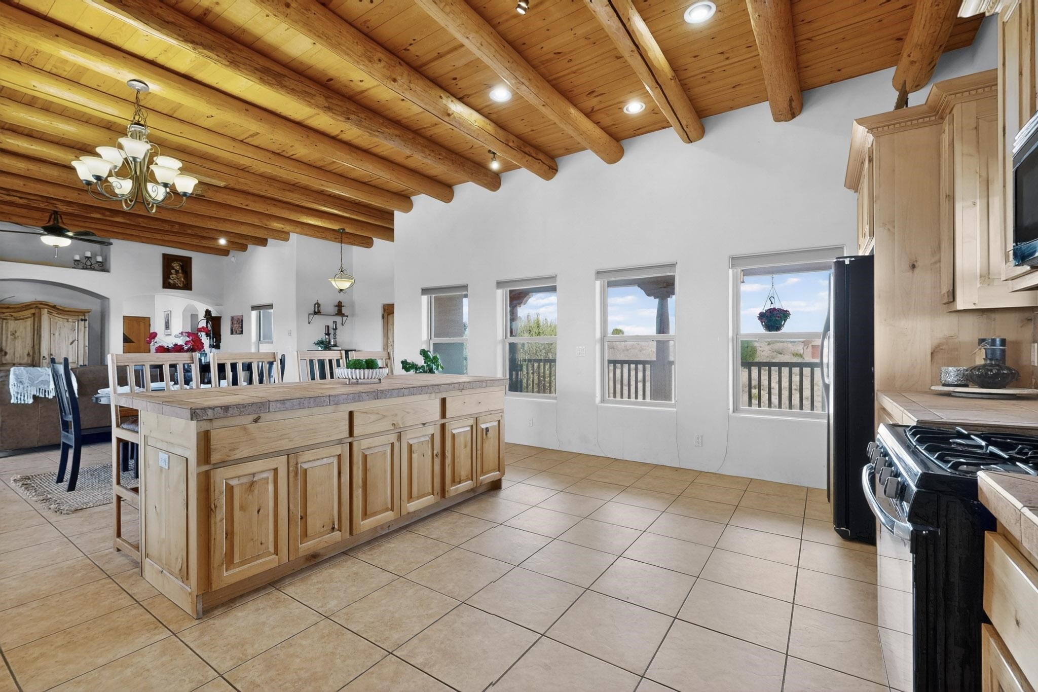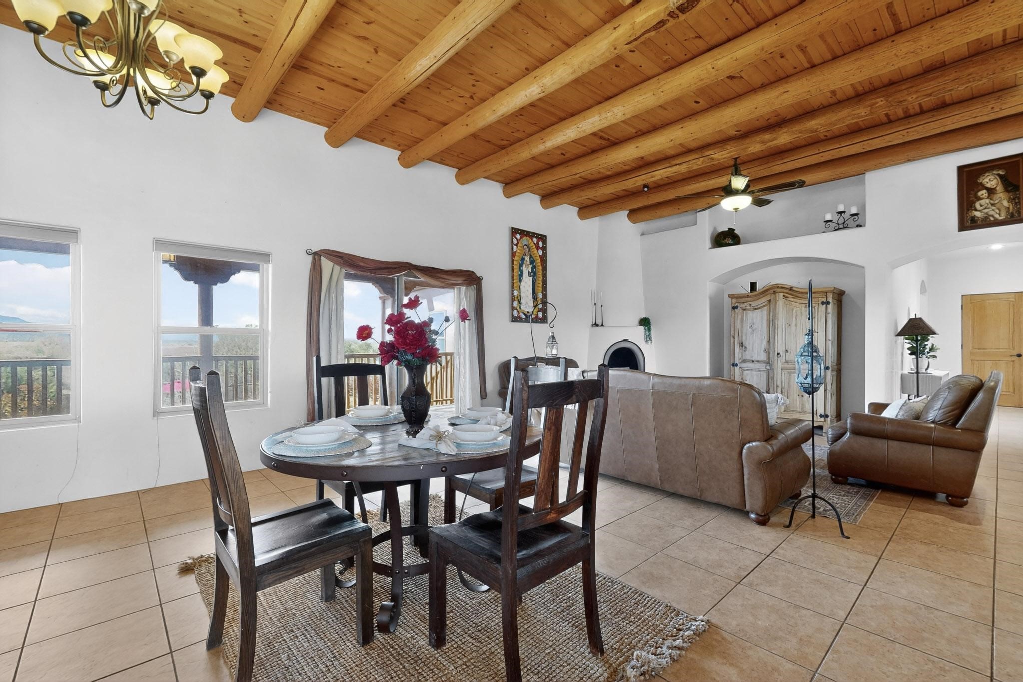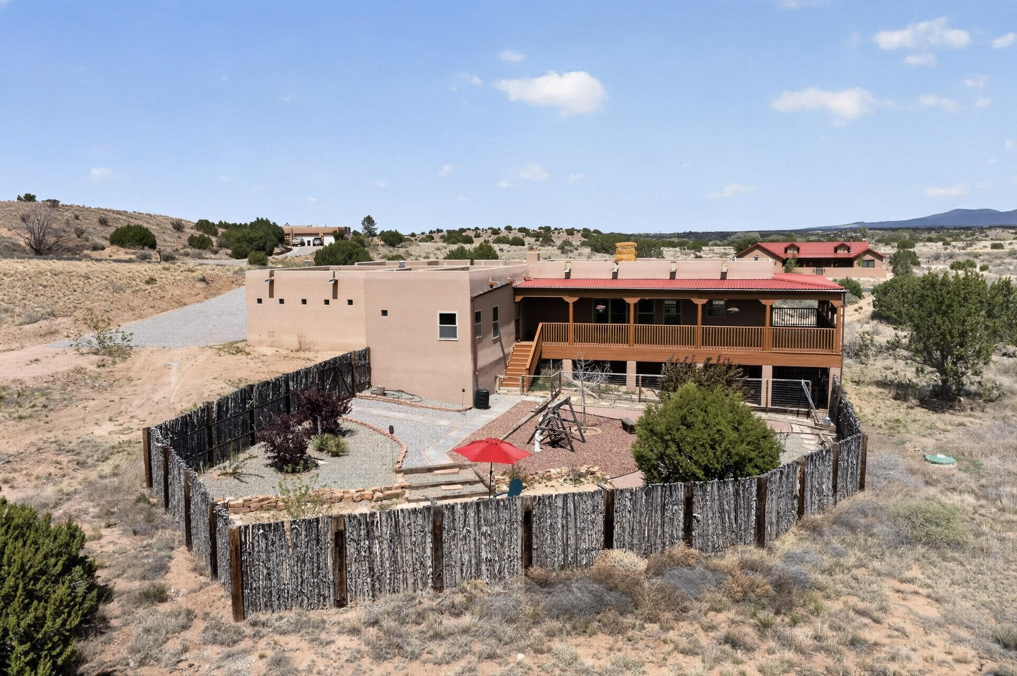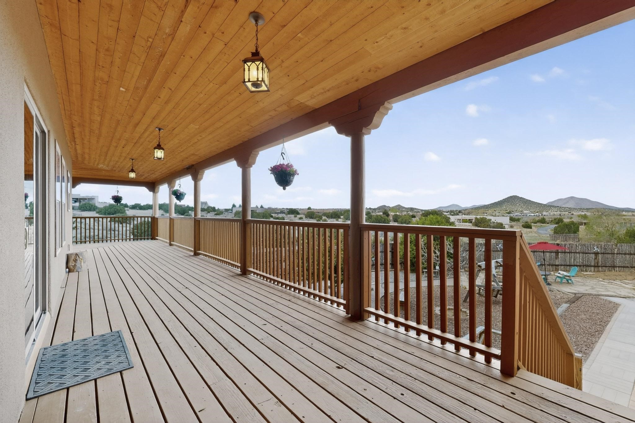 Nestled within the highly sought after gated community of Las Lagunitas with spacious lot sizes, this exceptional three bedroom two bath custom home on 1.36 acres embodies the perfect blend of refined Santa Fe comfort and elegance. Thoughtfully designed with a oversized two car garage and open concept layout, the spacious kitchen flows seamlessly into the dining and living room area and is ideal for both entertaining and everyday comfort. This single level residence features three oversized bedrooms and two bathrooms the Primary bedroom has a large jetted tub large walk in closet and a snail shower served up with instant hot water. This home features a stunning wraparound porch that captures the most picturesque elevated clear scenic views from all sides, both sunrise and sunset views are spectacular. Inside you will find a refined diamond plaster finish throughout the entire home, a water softener and large tile flooring that creates a clean and sophisticated look. The inviting living room features a charming kiva fireplace, tall ceilings and vigas that add warmth and authentic Santa Fe character to the space and has been well kept and loved by one family since being built! A large well maintained back yard with a beautifully built coyote fence made for privacy and ready for your entertainment. This home features a large crawlspace under the home that can be used for storage. Enjoy beautifully maintained common areas and landscaped grounds of Las Lagunitas, perfect for peaceful tranquil walks with your dog alongside serene ponds where fishing is also allowed offering a true connection to nature. Easy access to I-25
