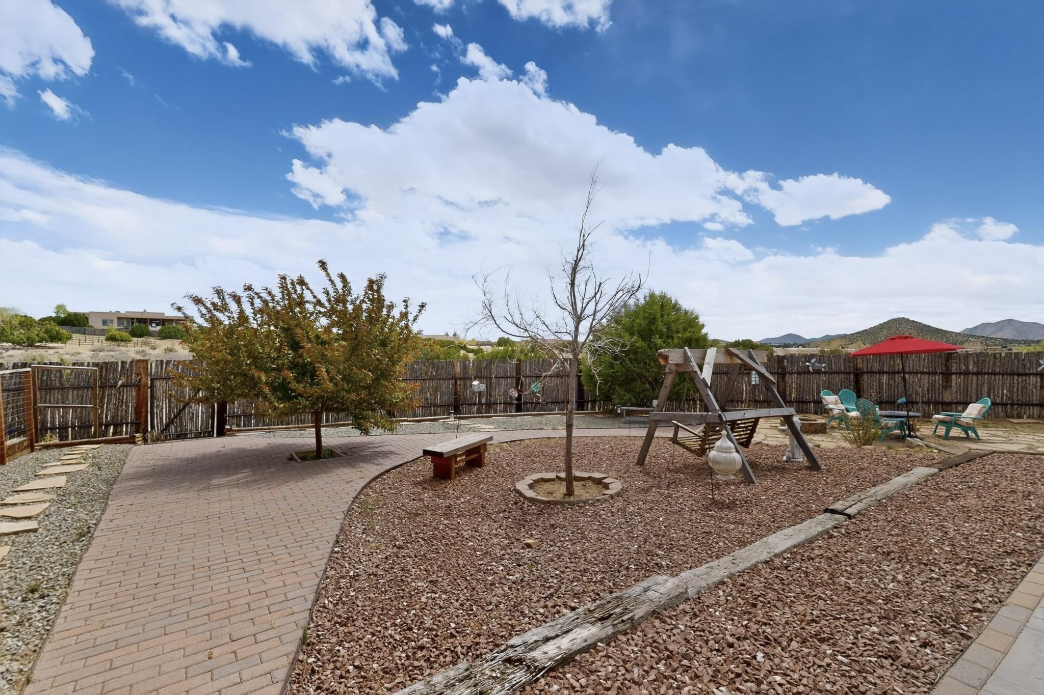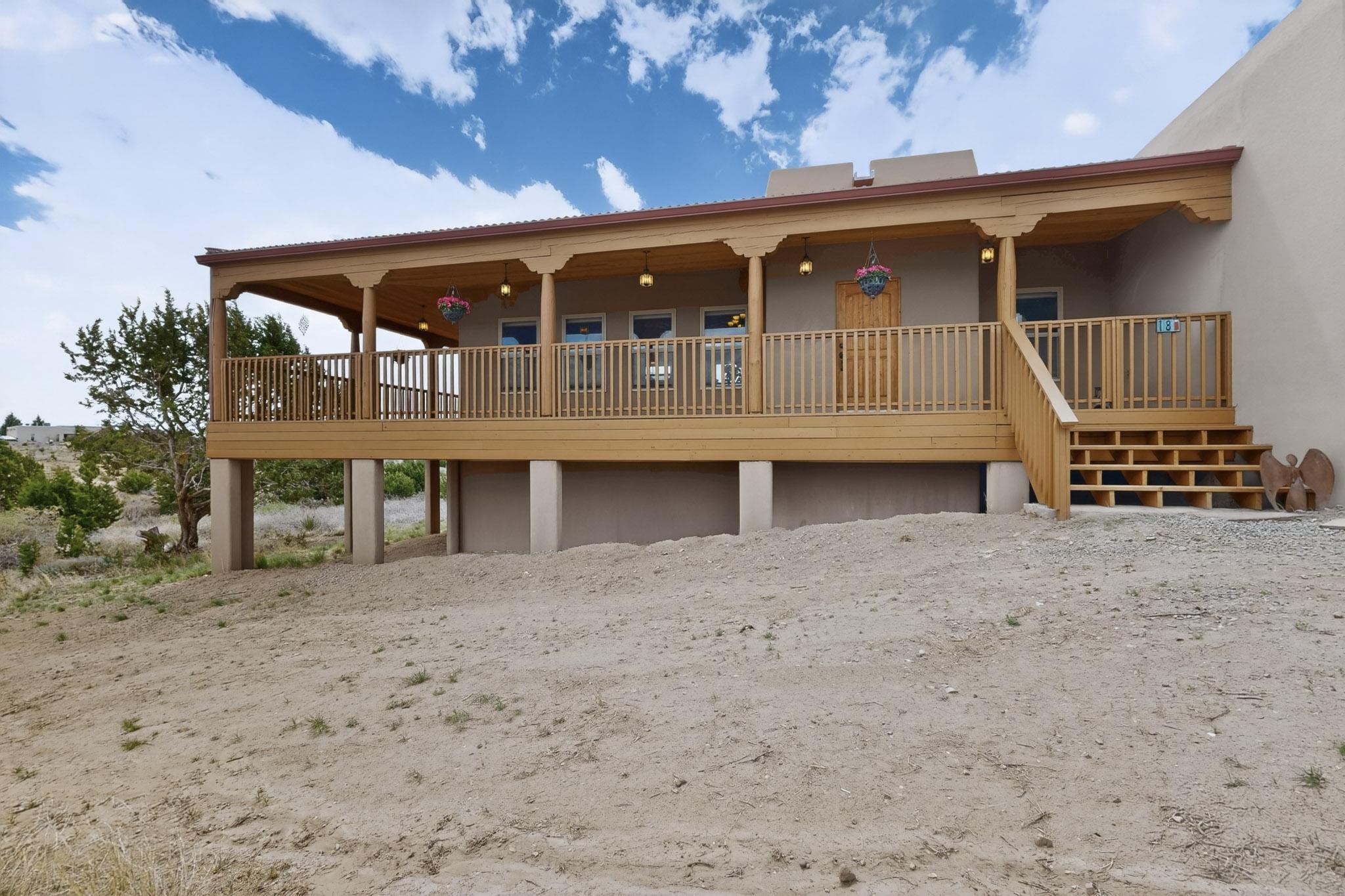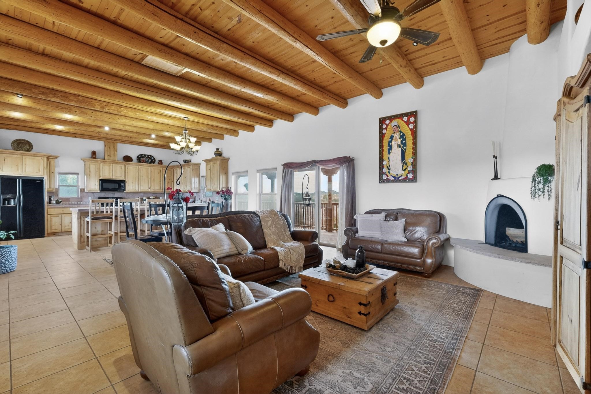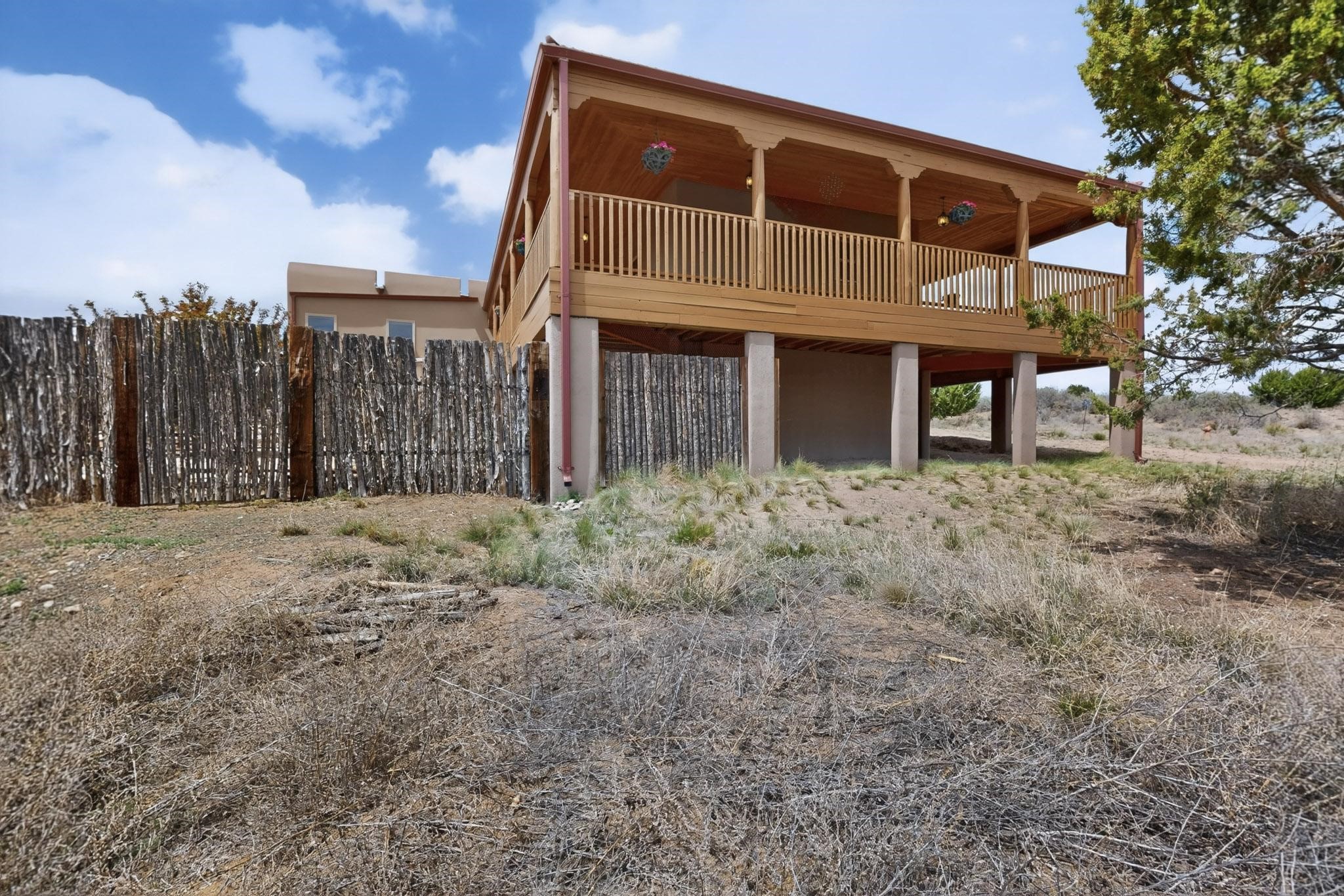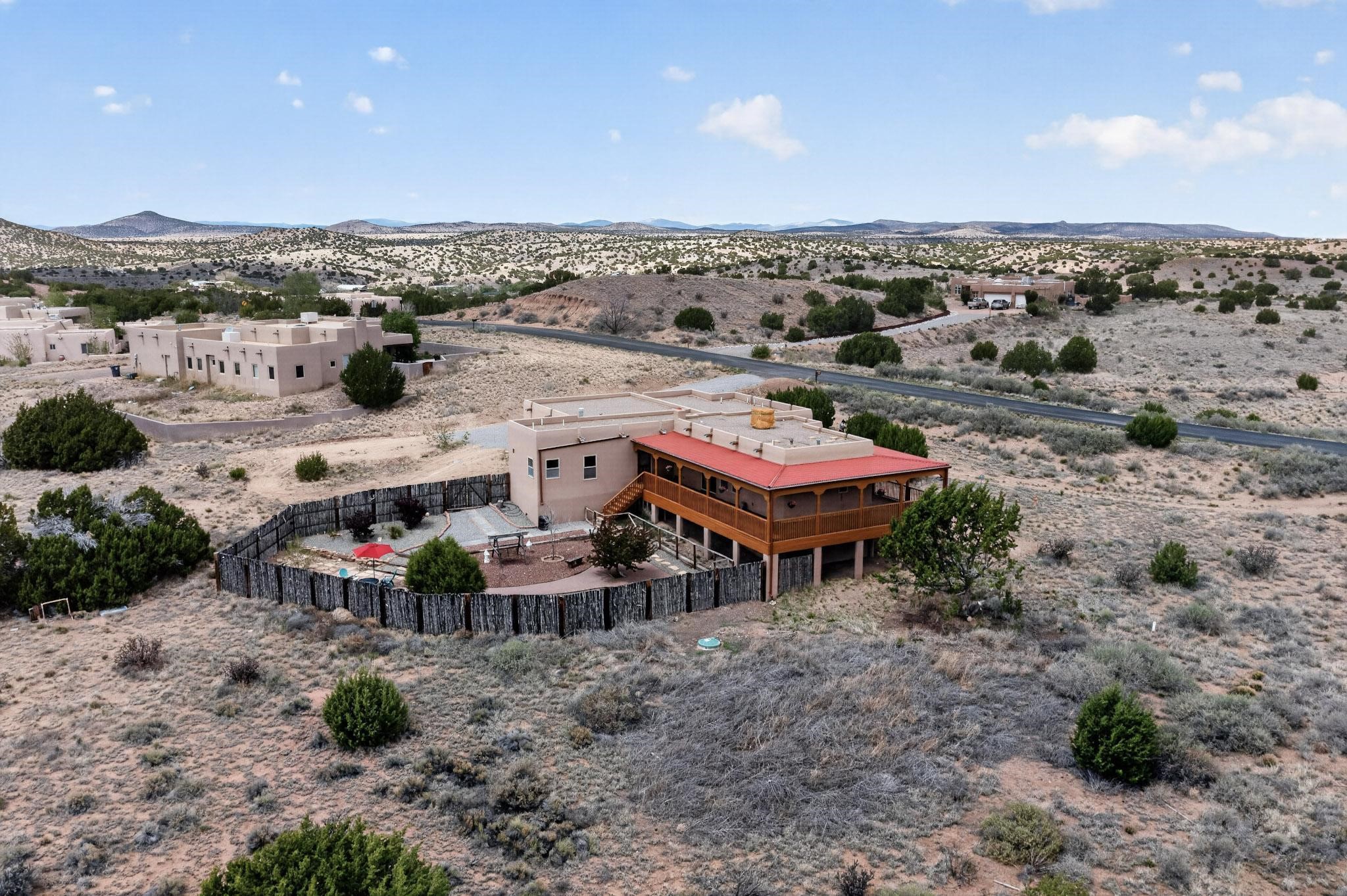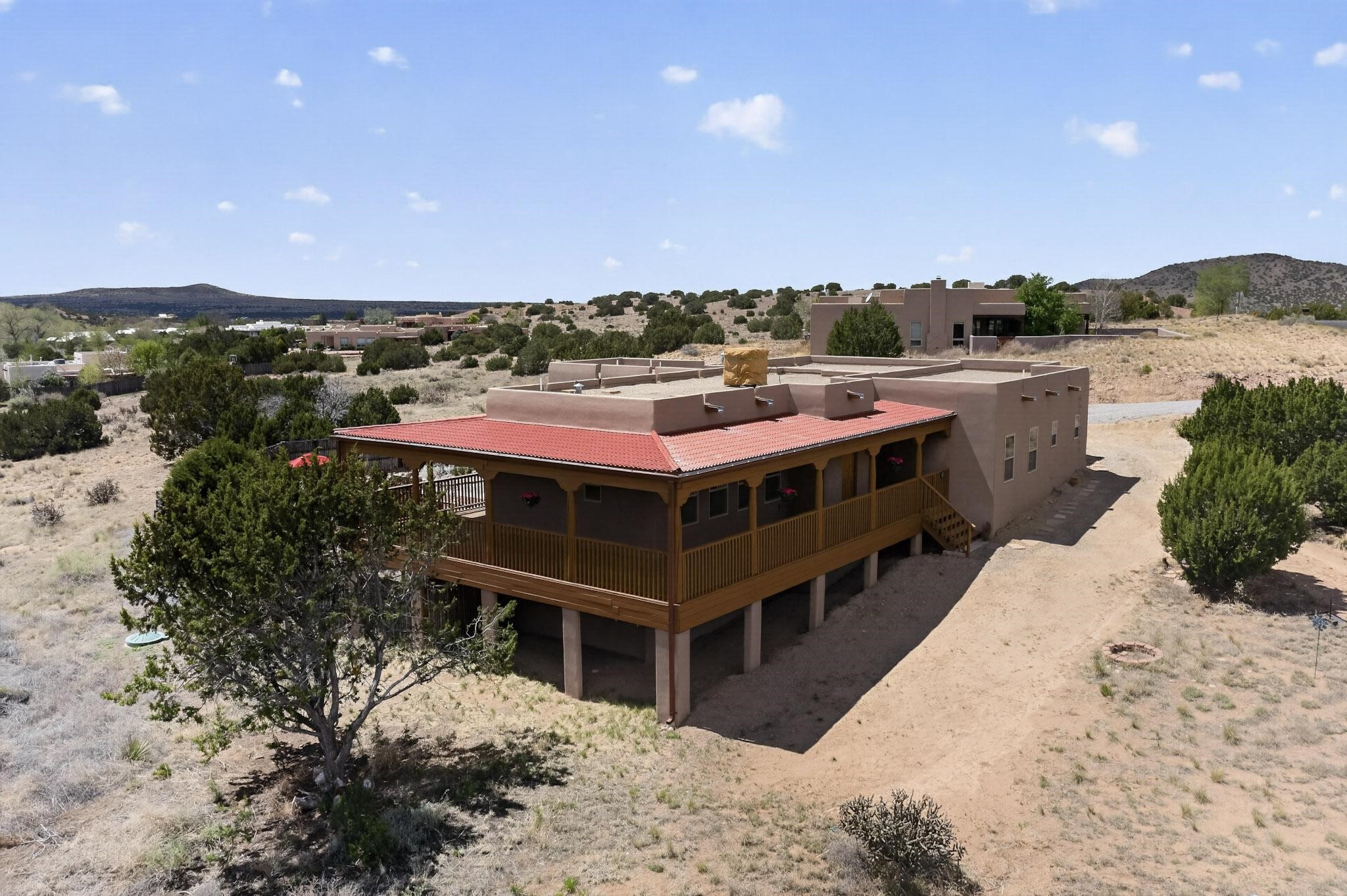 Nestled within the highly sought after gated community of Las Lagunitas with spacious lot sizes, this exceptional three bedroom two bath custom home on 1.36 acres embodies the perfect blend of refined Santa Fe comfort and elegance. Thoughtfully designed with a oversized two car garage and open concept layout, the spacious kitchen flows seamlessly into the dining and living room area and is ideal for both entertaining and everyday comfort. This single level residence features three oversized bedrooms and two bathrooms the Primary bedroom has a large jetted tub large walk in closet and a snail shower served up with instant hot water. This home features a stunning wraparound porch that captures the most picturesque elevated clear scenic views from all sides, both sunrise and sunset views are spectacular. Inside you will find a refined diamond plaster finish throughout the entire home, a water softener and large tile flooring that creates a clean and sophisticated look. The inviting living room features a charming kiva fireplace, tall ceilings and vigas that add warmth and authentic Santa Fe character to the space and has been well kept and loved by one family since being built! A large well maintained back yard with a beautifully built coyote fence made for privacy and ready for your entertainment. This home features a large crawlspace under the home that can be used for storage. Enjoy beautifully maintained common areas and landscaped grounds of Las Lagunitas, perfect for peaceful tranquil walks with your dog alongside serene ponds where fishing is also allowed offering a true connection to nature. Easy access to I-25