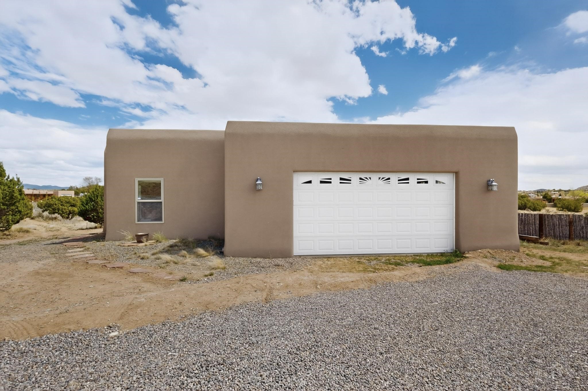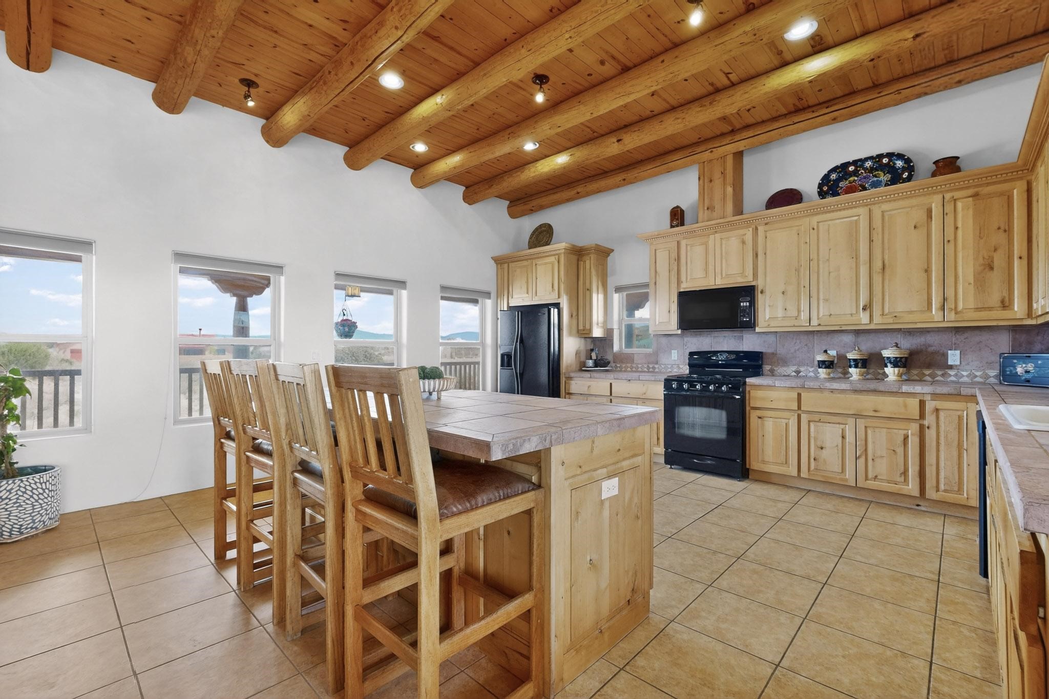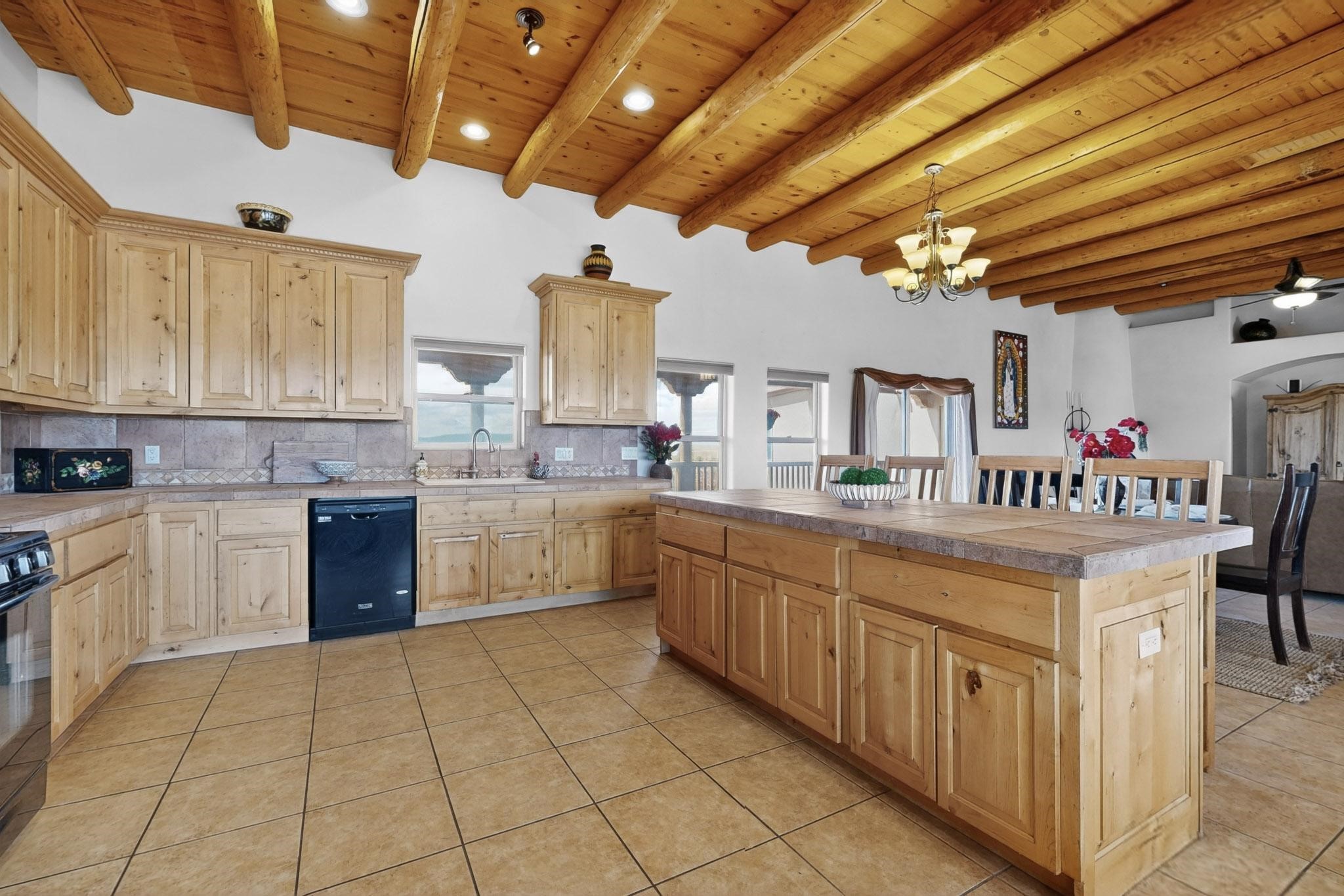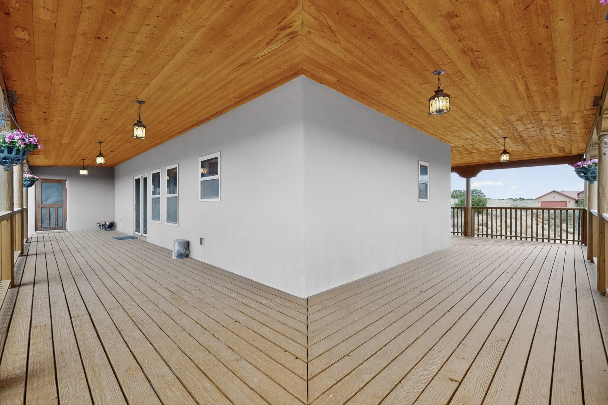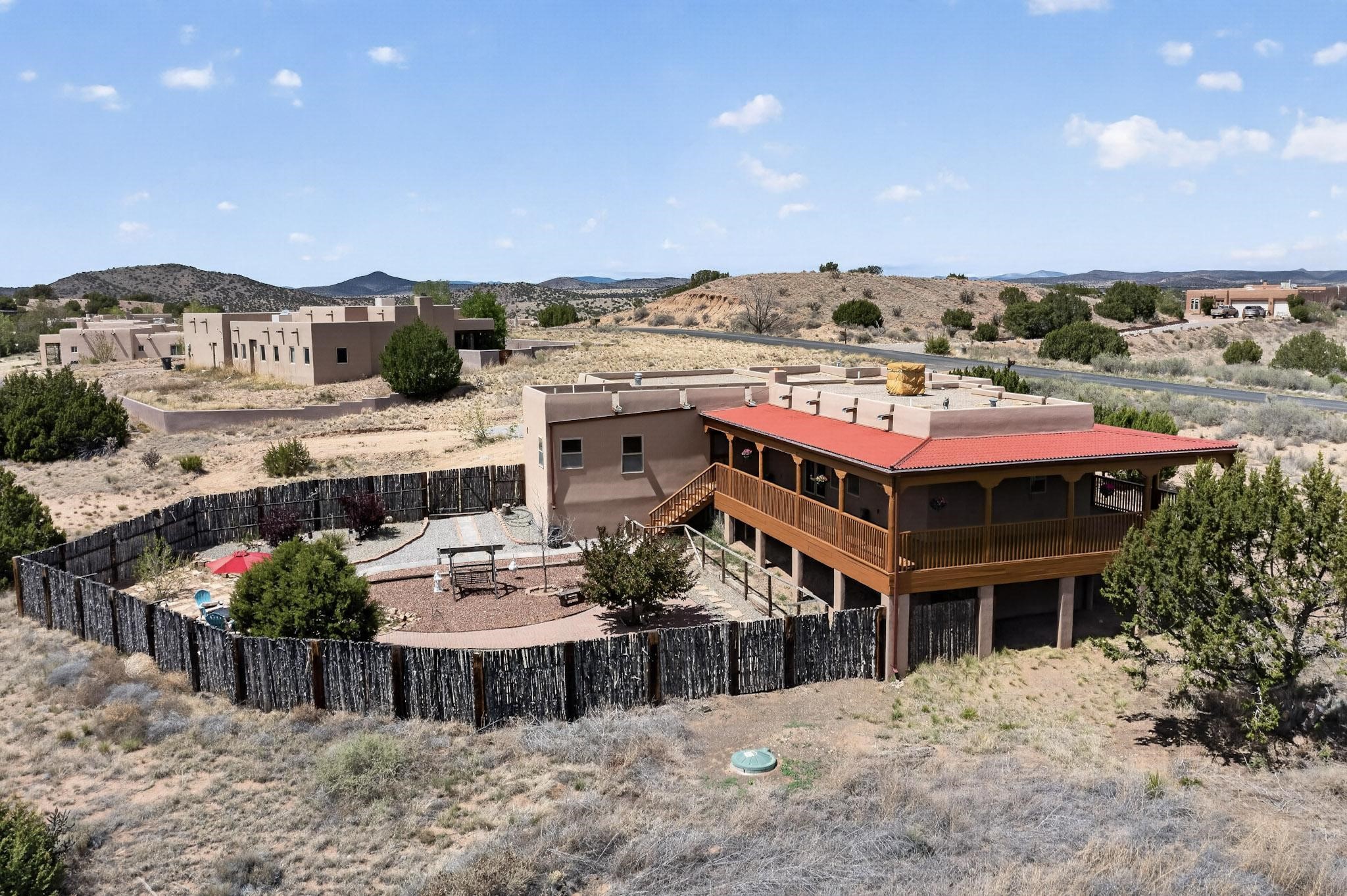 Nestled within the highly sought after gated community of Las Lagunitas with spacious lot sizes, this exceptional three bedroom two bath custom home on 1.36 acres embodies the perfect blend of refined Santa Fe comfort and elegance. Thoughtfully designed with a oversized two car garage and open concept layout, the spacious kitchen flows seamlessly into the dining and living room area and is ideal for both entertaining and everyday comfort. This single level residence features three oversized bedrooms and two bathrooms the Primary bedroom has a large jetted tub large walk in closet and a snail shower served up with instant hot water. This home features a stunning wraparound porch that captures the most picturesque elevated clear scenic views from all sides, both sunrise and sunset views are spectacular. Inside you will find a refined diamond plaster finish throughout the entire home, a water softener and large tile flooring that creates a clean and sophisticated look. The inviting living room features a charming kiva fireplace, tall ceilings and vigas that add warmth and authentic Santa Fe character to the space and has been well kept and loved by one family since being built! A large well maintained back yard with a beautifully built coyote fence made for privacy and ready for your entertainment. This home features a large crawlspace under the home that can be used for storage. Enjoy beautifully maintained common areas and landscaped grounds of Las Lagunitas, perfect for peaceful tranquil walks with your dog alongside serene ponds where fishing is also allowed offering a true connection to nature. Easy access to I-25