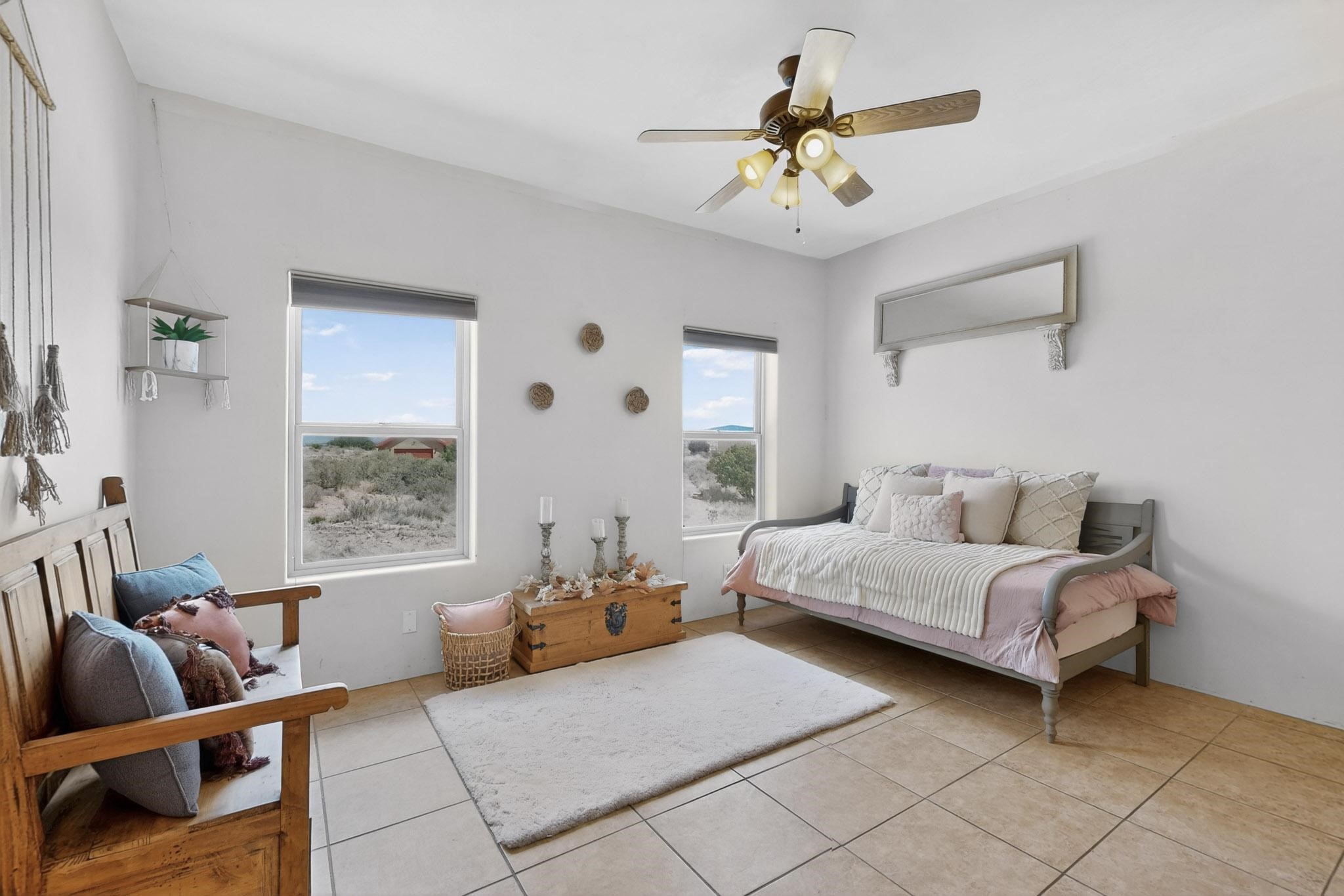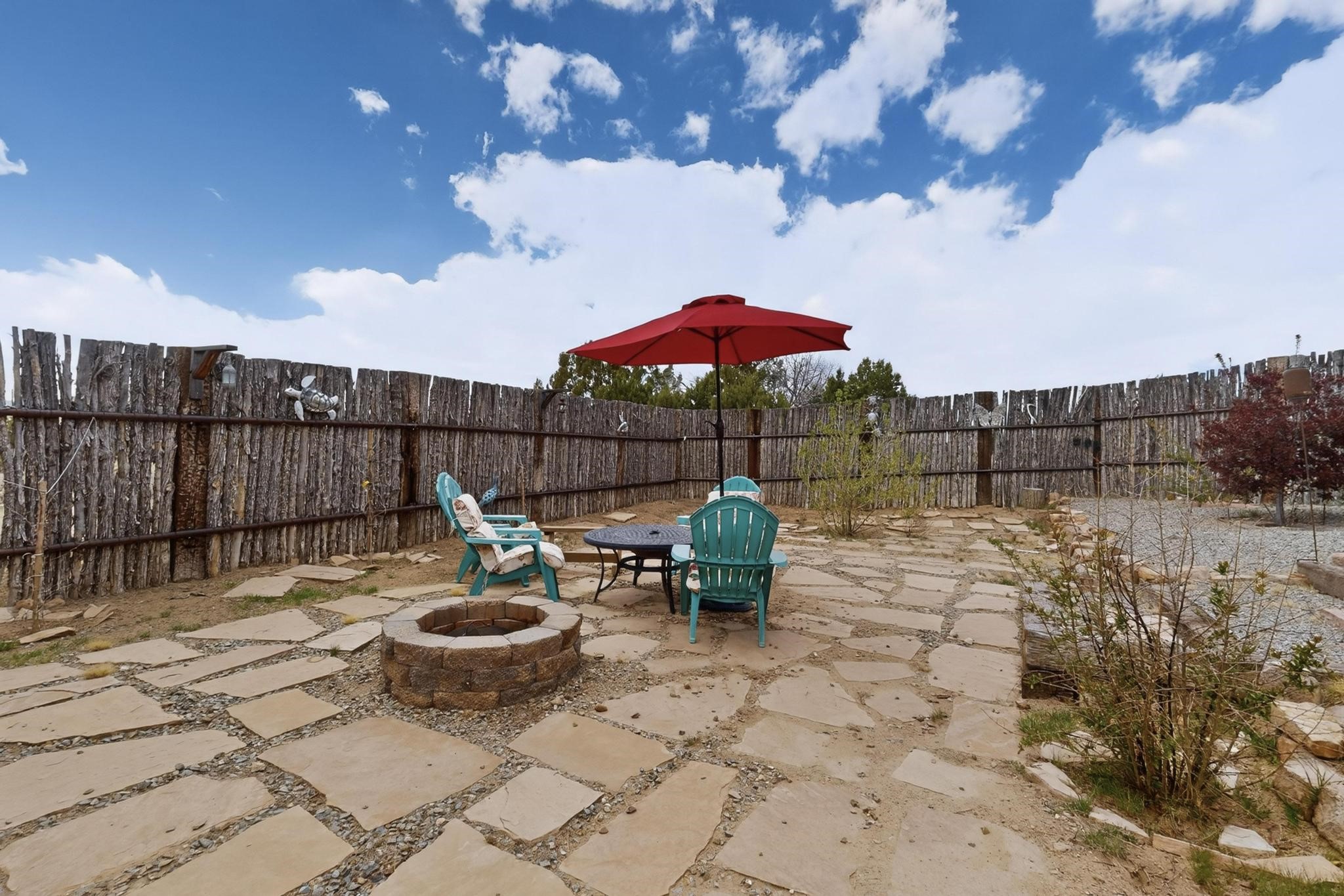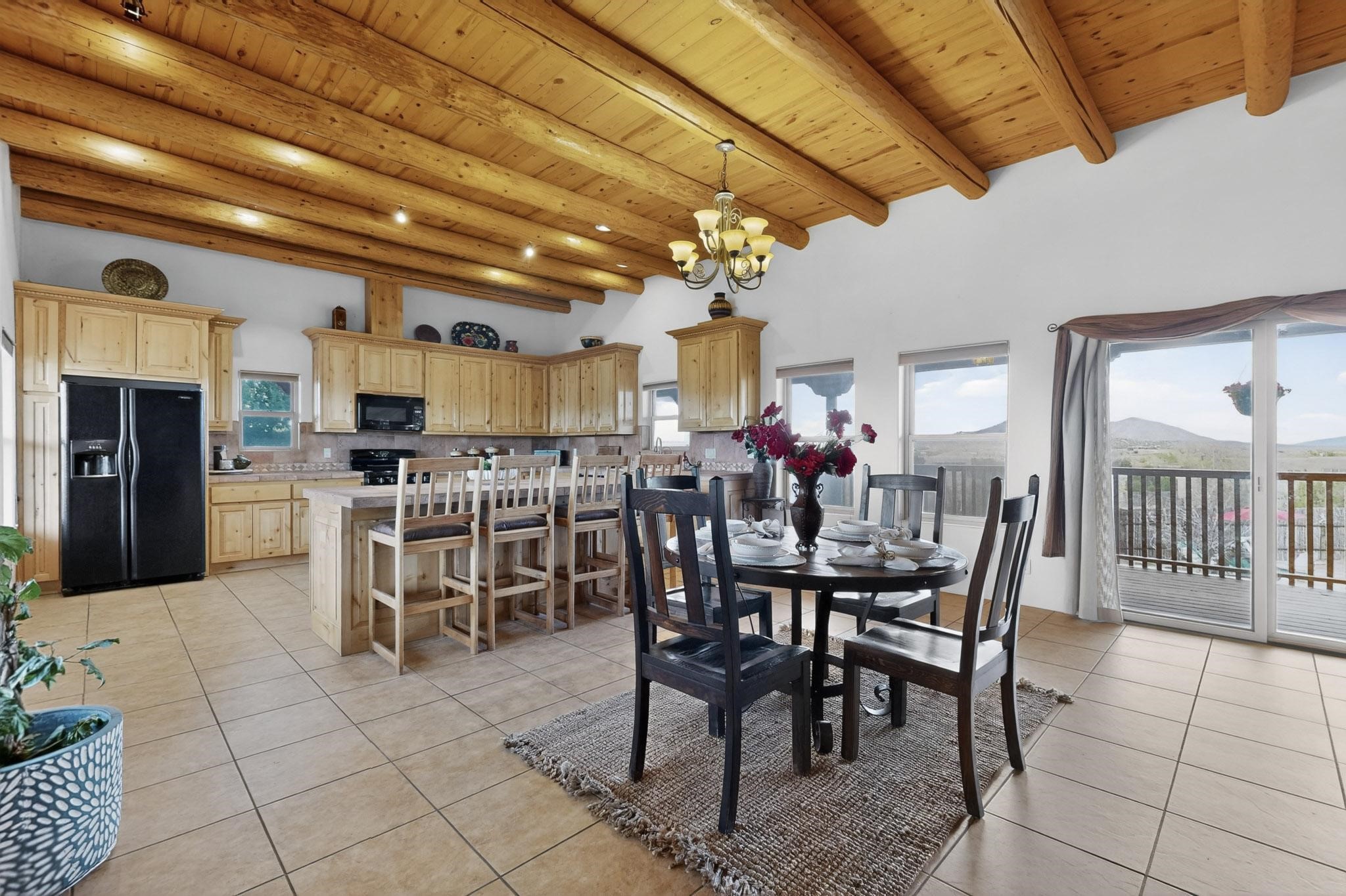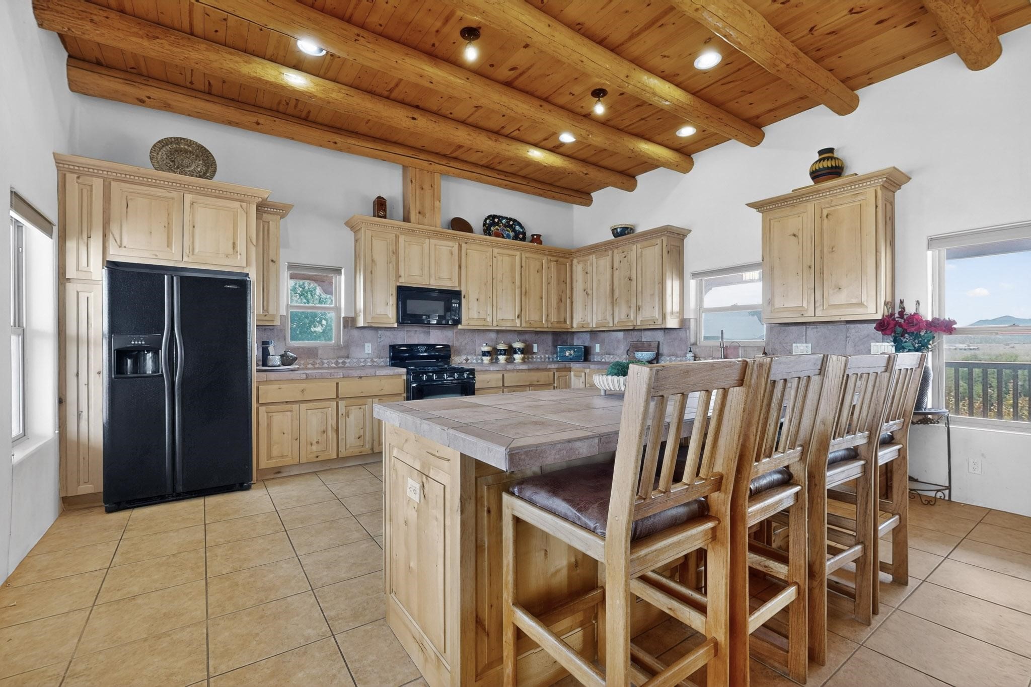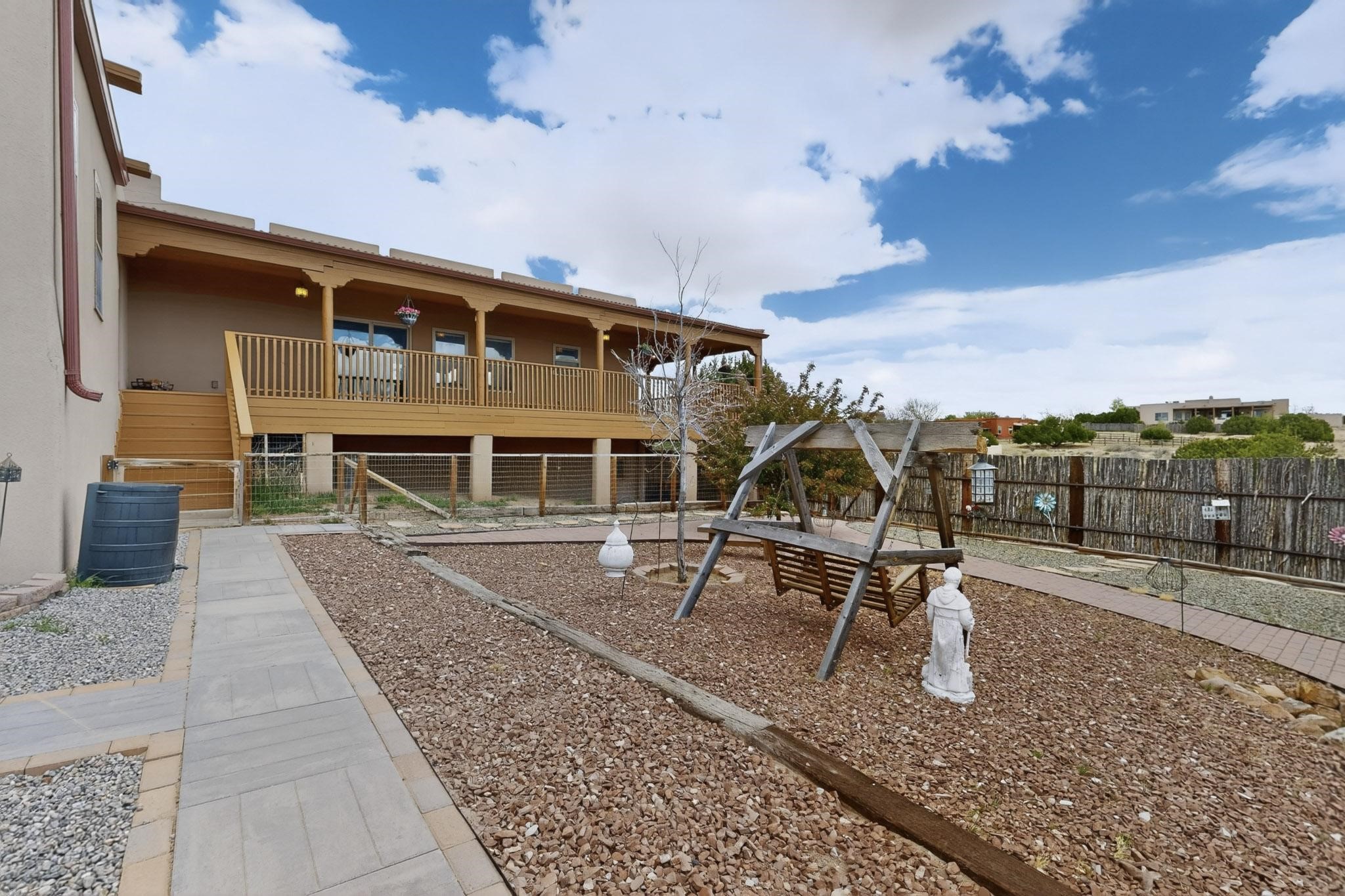 Nestled within the highly sought after gated community of Las Lagunitas with spacious lot sizes, this exceptional three bedroom two bath custom home on 1.36 acres embodies the perfect blend of refined Santa Fe comfort and elegance. Thoughtfully designed with a oversized two car garage and open concept layout, the spacious kitchen flows seamlessly into the dining and living room area and is ideal for both entertaining and everyday comfort. This single level residence features three oversized bedrooms and two bathrooms the Primary bedroom has a large jetted tub large walk in closet and a snail shower served up with instant hot water. This home features a stunning wraparound porch that captures the most picturesque elevated clear scenic views from all sides, both sunrise and sunset views are spectacular. Inside you will find a refined diamond plaster finish throughout the entire home, a water softener and large tile flooring that creates a clean and sophisticated look. The inviting living room features a charming kiva fireplace, tall ceilings and vigas that add warmth and authentic Santa Fe character to the space and has been well kept and loved by one family since being built! A large well maintained back yard with a beautifully built coyote fence made for privacy and ready for your entertainment. This home features a large crawlspace under the home that can be used for storage. Enjoy beautifully maintained common areas and landscaped grounds of Las Lagunitas, perfect for peaceful tranquil walks with your dog alongside serene ponds where fishing is also allowed offering a true connection to nature. Easy access to I-25