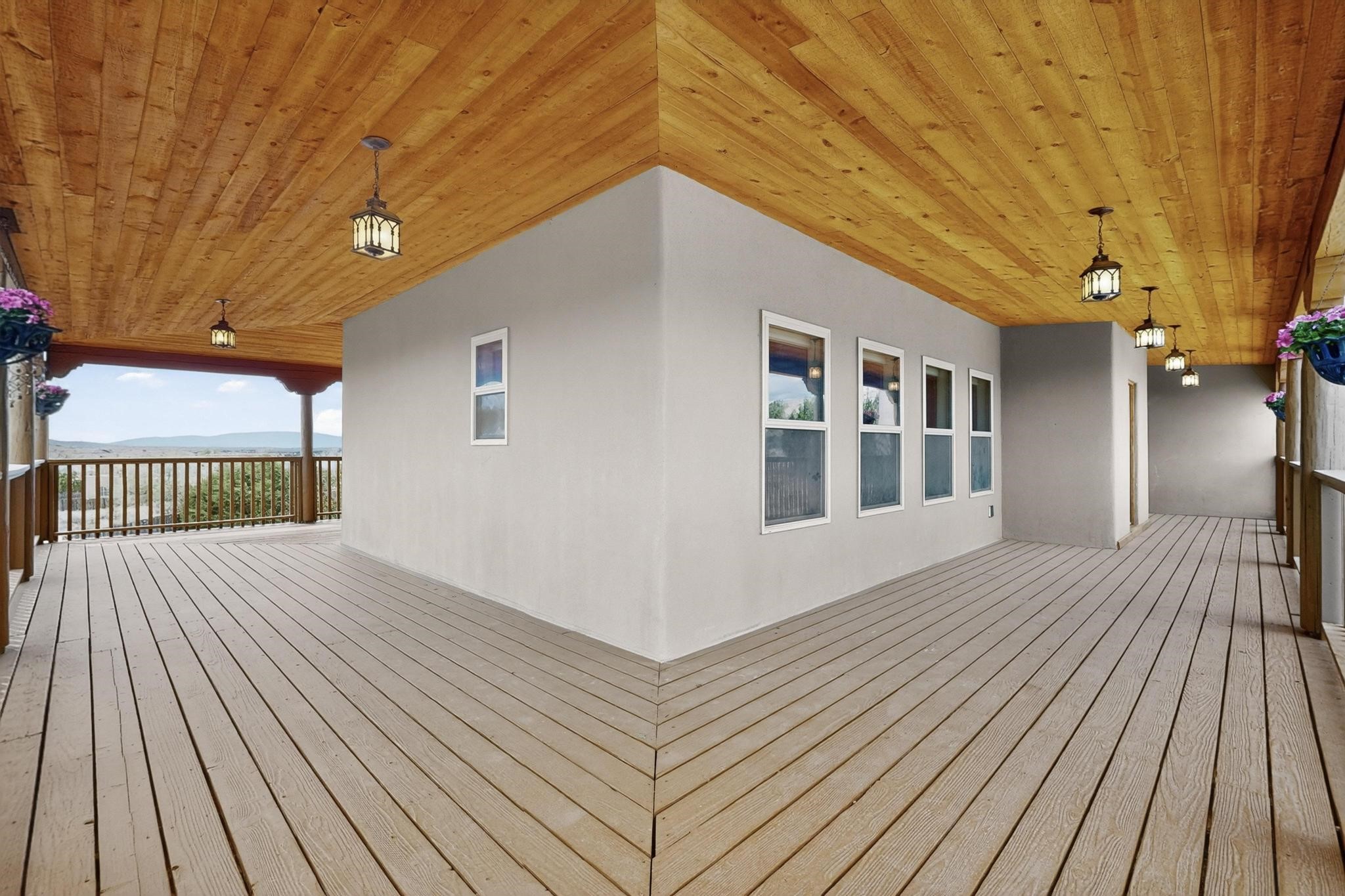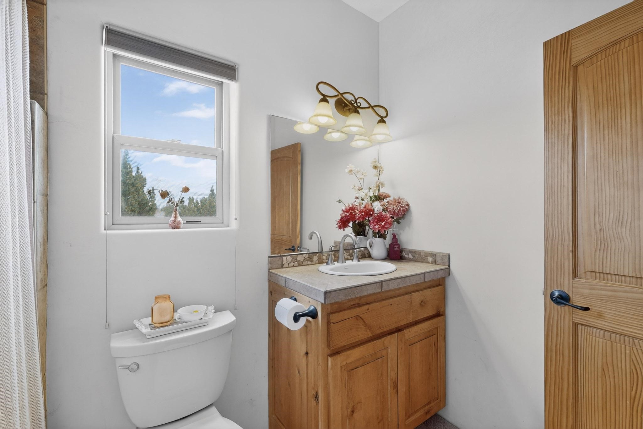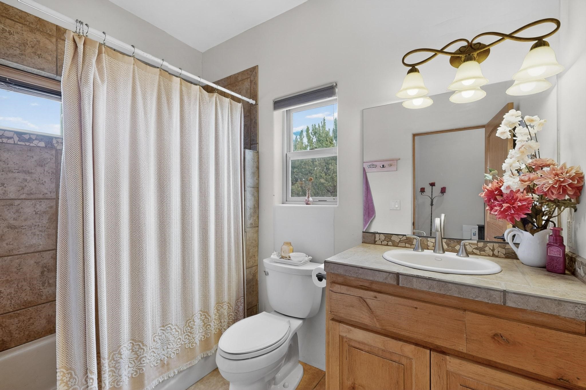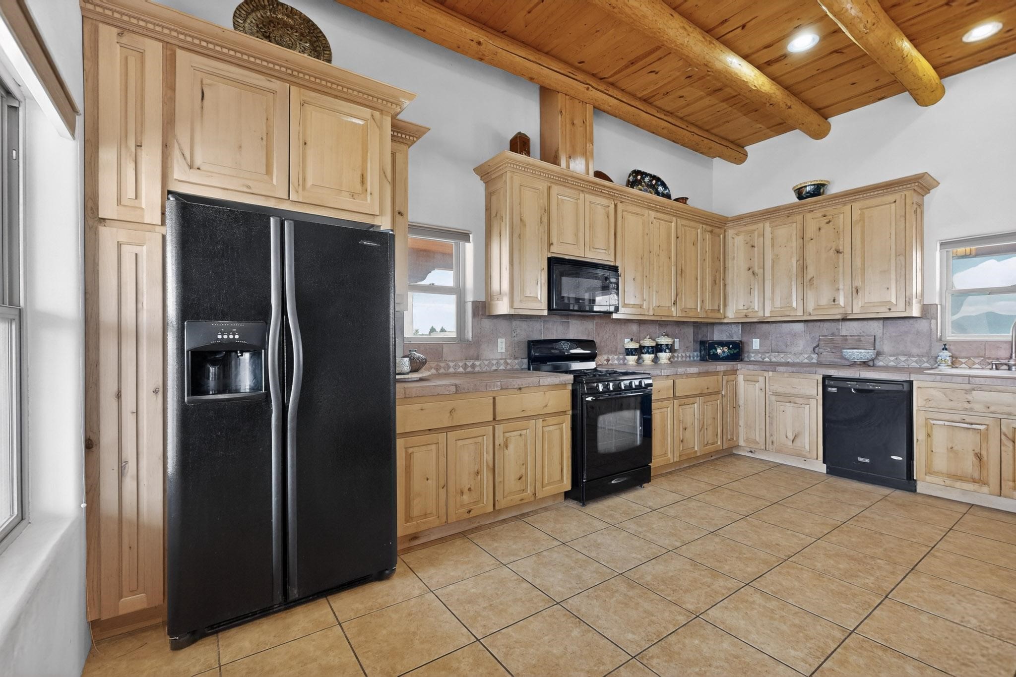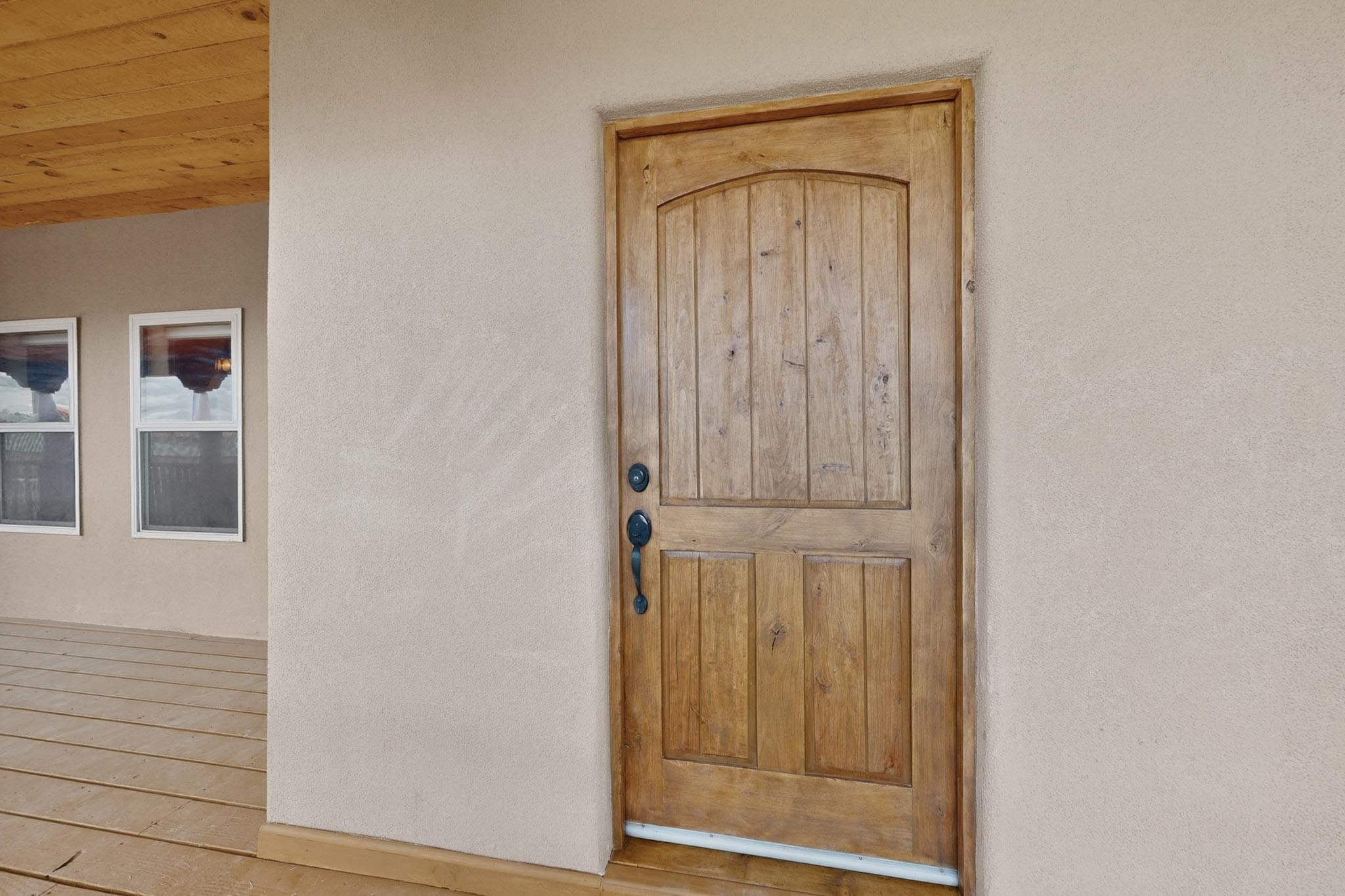 Nestled within the highly sought after gated community of Las Lagunitas with spacious lot sizes, this exceptional three bedroom two bath custom home on 1.36 acres embodies the perfect blend of refined Santa Fe comfort and elegance. Thoughtfully designed with a oversized two car garage and open concept layout, the spacious kitchen flows seamlessly into the dining and living room area and is ideal for both entertaining and everyday comfort. This single level residence features three oversized bedrooms and two bathrooms the Primary bedroom has a large jetted tub large walk in closet and a snail shower served up with instant hot water. This home features a stunning wraparound porch that captures the most picturesque elevated clear scenic views from all sides, both sunrise and sunset views are spectacular. Inside you will find a refined diamond plaster finish throughout the entire home, a water softener and large tile flooring that creates a clean and sophisticated look. The inviting living room features a charming kiva fireplace, tall ceilings and vigas that add warmth and authentic Santa Fe character to the space and has been well kept and loved by one family since being built! A large well maintained back yard with a beautifully built coyote fence made for privacy and ready for your entertainment. This home features a large crawlspace under the home that can be used for storage. Enjoy beautifully maintained common areas and landscaped grounds of Las Lagunitas, perfect for peaceful tranquil walks with your dog alongside serene ponds where fishing is also allowed offering a true connection to nature. Easy access to I-25