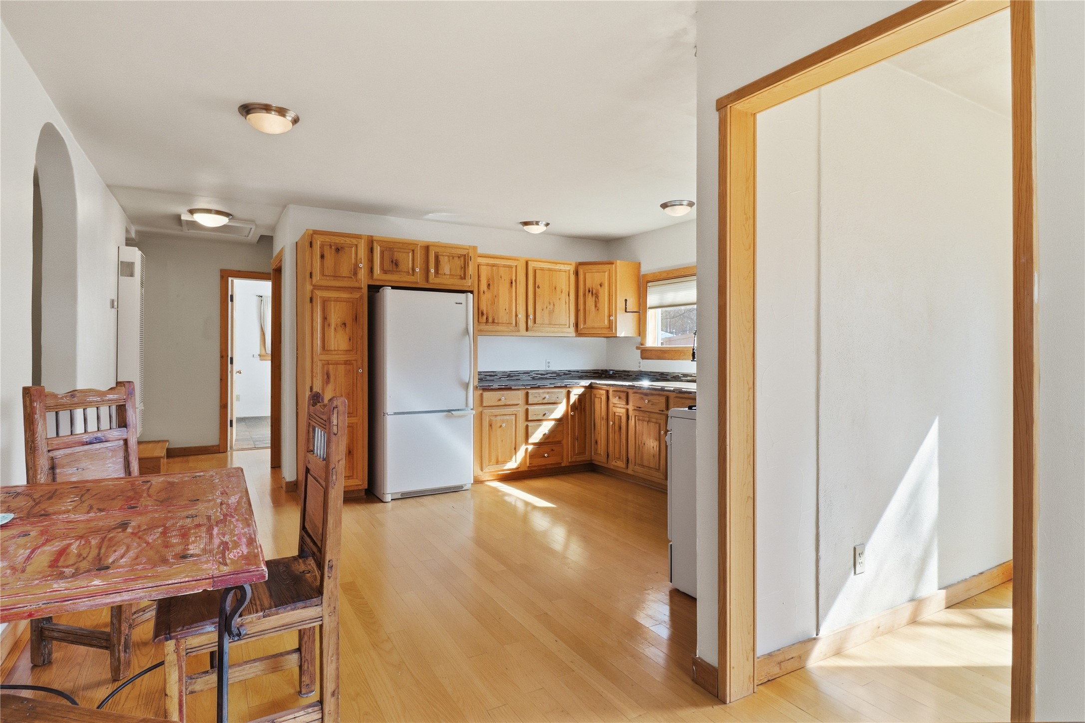 This charming DUPLEX at 104 Guthrie Lane #A & B, Taos, NM 87571 offers an exceptional opportunity for comfortable living with strong income-producing potential in a prime location just minutes from the center of Taos.The main house (#B) features a spacious eat-in kitchen with a separate pantry, lovely tile countertops, and serene garden views. The primary bedroom features cork flooring and an ensuite bathroom with beautiful tile accents. A second bedroom provides easy backyard access via a sliding glass door, a generous closet, and shares a full hall bath. The expansive living room showcases gorgeous wood floors and a cozy kiva fireplace, opening directly onto a large back deck perfect for relaxing or entertaining. An additional flexible living/multi-purpose room includes the washer/dryer and abundant space for a home office or studio.The attached guest house (#A) has proven itself as a reliable rental unit for years, delivering steady income. It features beautiful natural light, tile flooring, a fireplace, 2 bedrooms, a delightful 4-season sunroom, a fenced private courtyard, and its own storage shed--ideal for guests, long-term tenants, or vacation rentals.Outside, enjoy a large, fully fenced backyard--a gardener's dream with ample space for planting, outdoor activities, or pets. A large detached oversized 2-car garage provides plenty of room for vehicles, workshops, projects, or extra storage.Sited on a generous corner lot (approximately half a acre) in a peaceful cul-de-sac, this property offers tranquility while being conveniently close to Taos' shops, restaurants, galleries, and cultural attractions.Whether you're seeking a primary residence with guest/income suite, a multi-generational setup, or an investment property with built-in rental history, this property has it covered. Don't miss this rare combination of space, charm, and location!