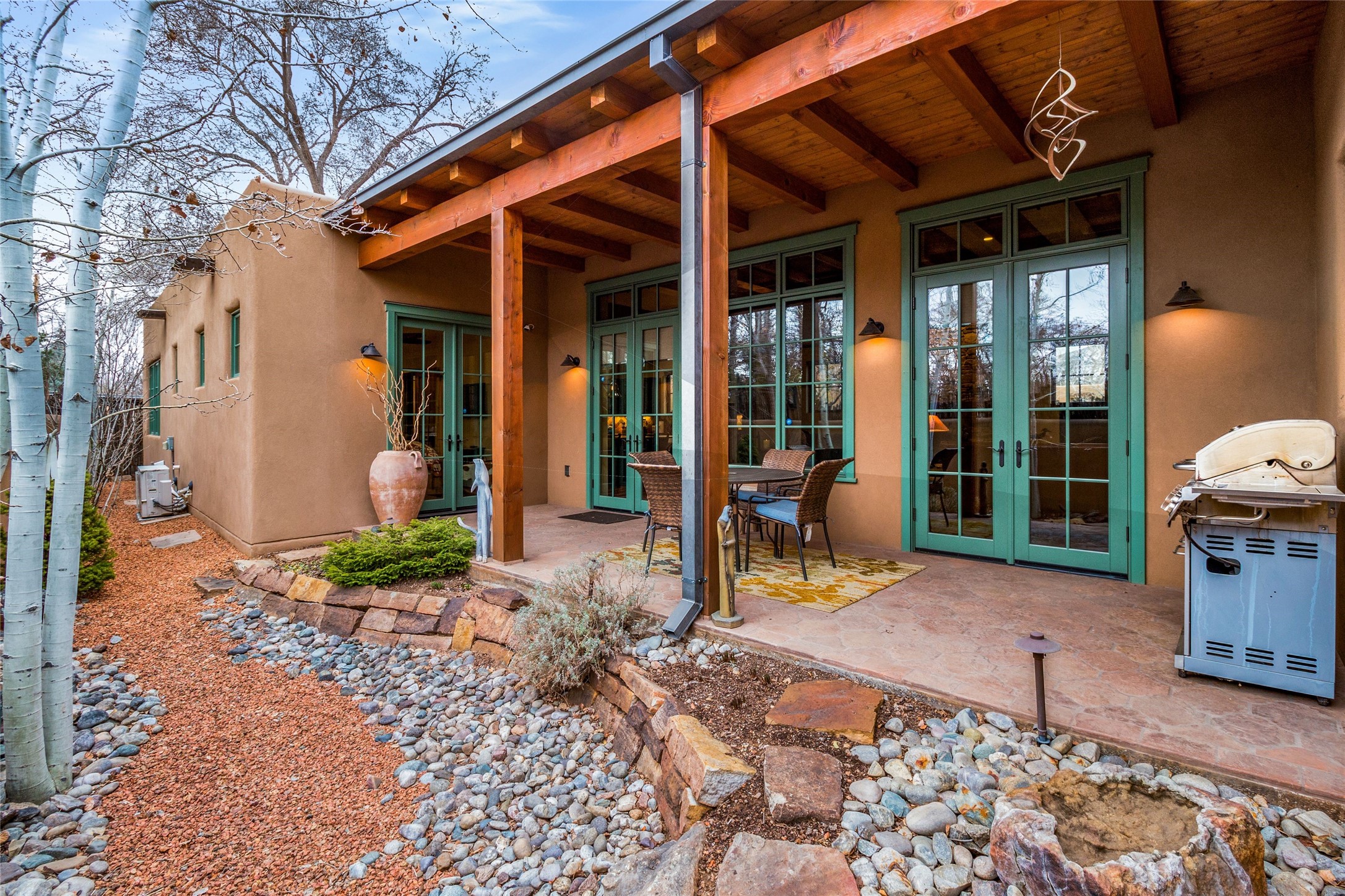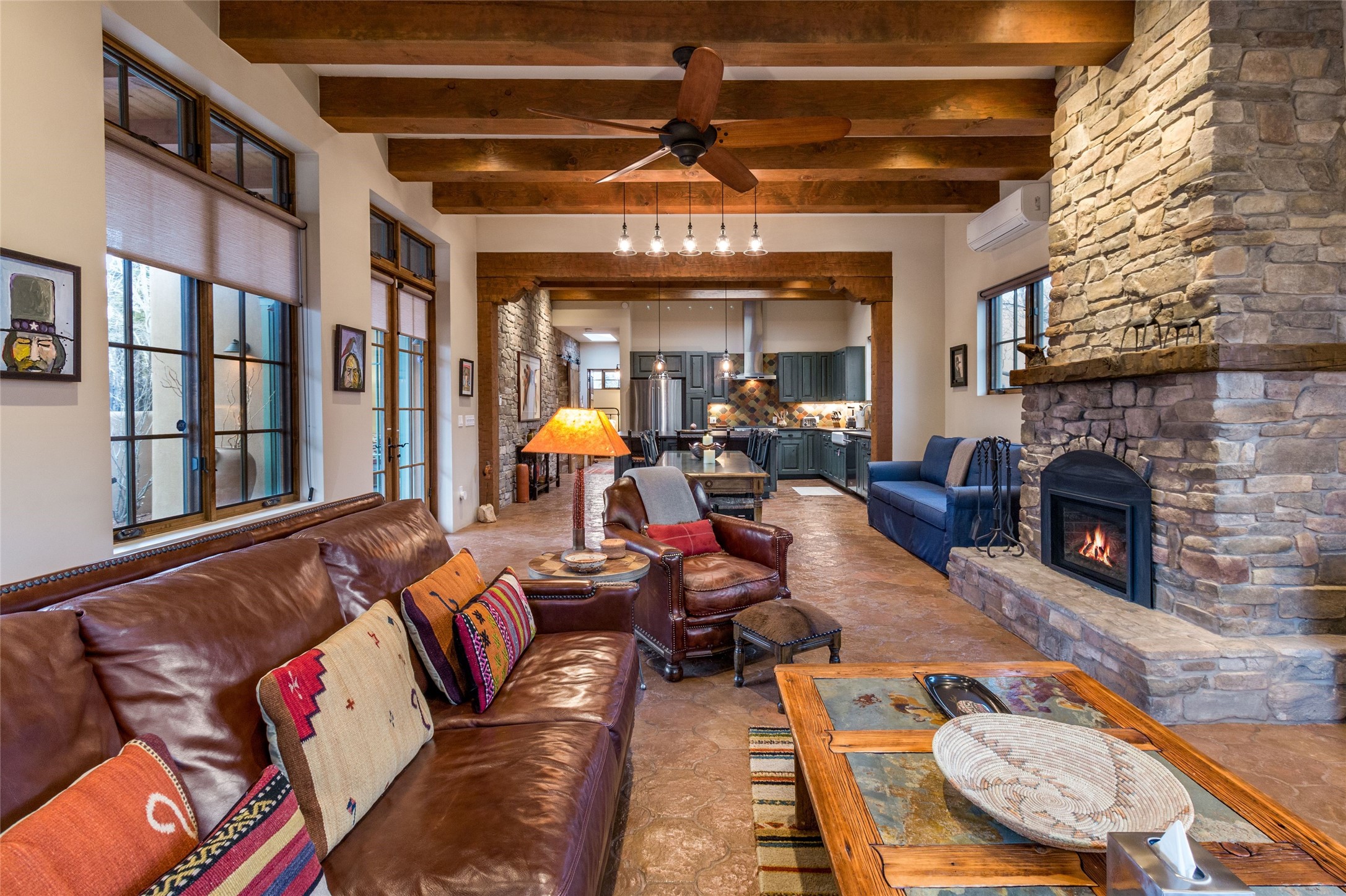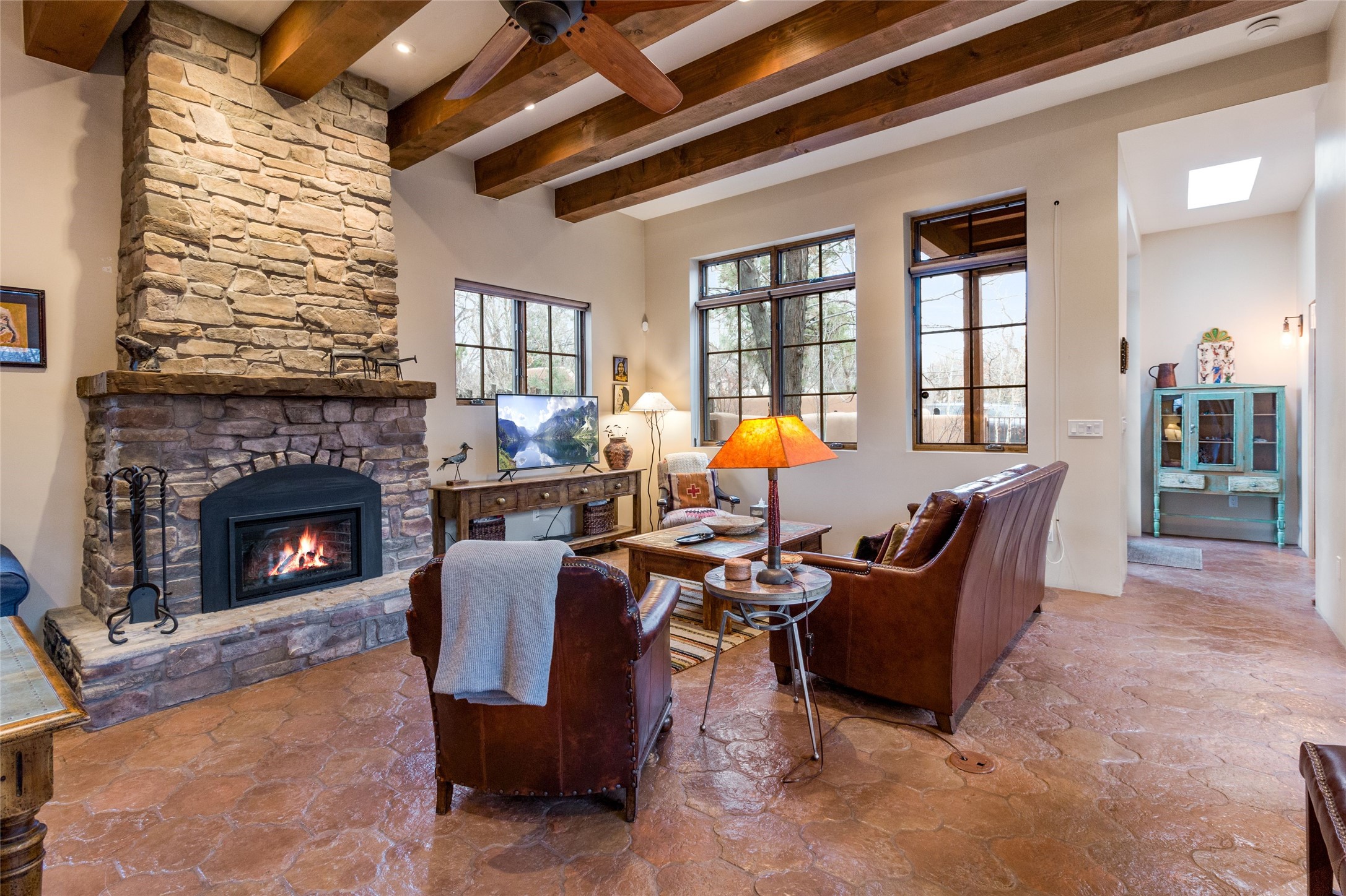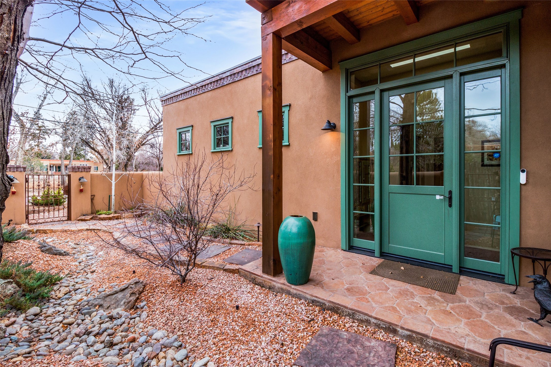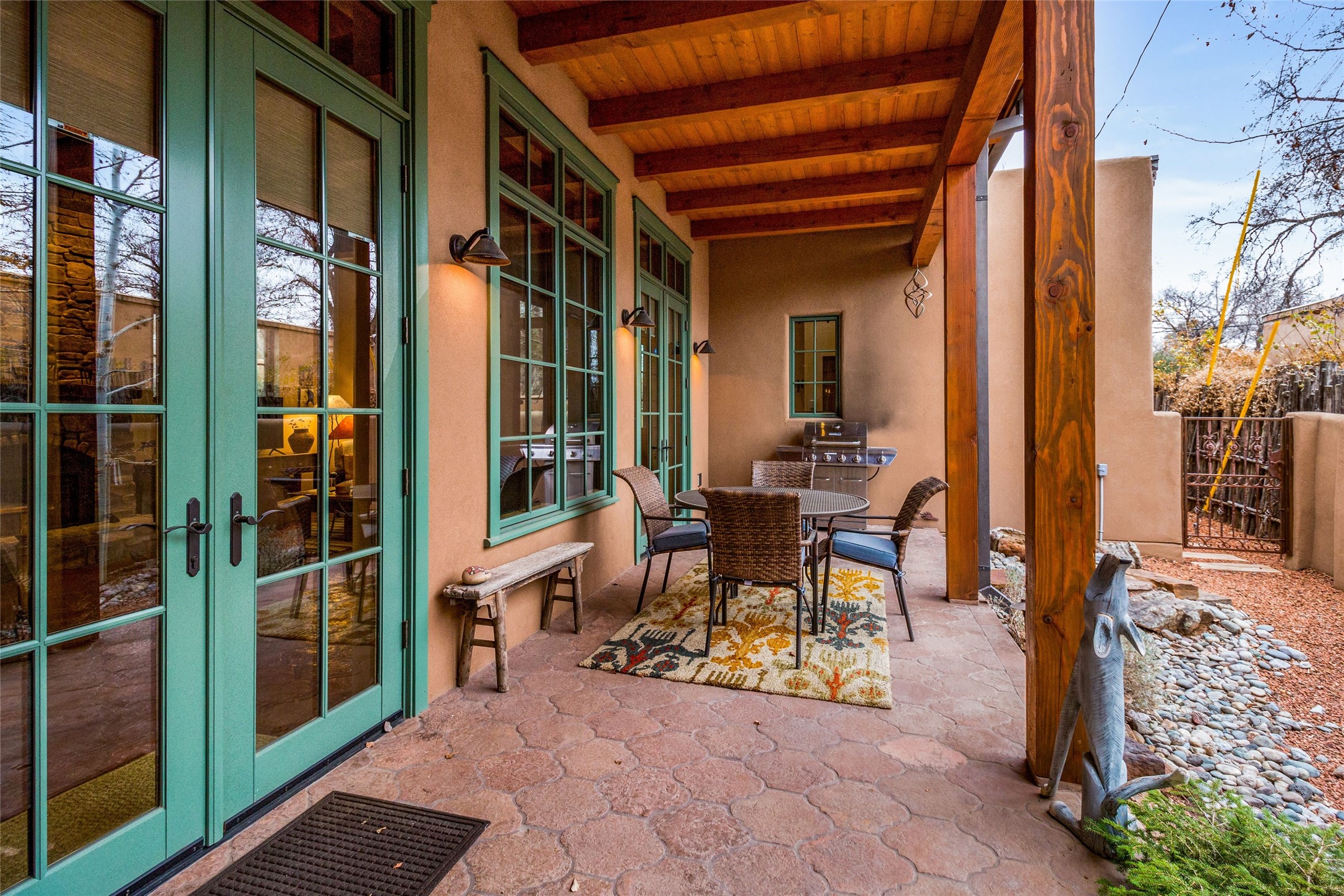 This rare Eastside property is situated in downtown Santa Fe's most beloved and walkable locations close to Canyon Road. Comprising 1,750 +/- sq.ft., this single-level custom 2 bedroom and 2 bath home was built in 2016 and exudes classic Santa Fe style. High ceilings featuring large beams in the open concept living/dining/kitchen area fill the space with light and warmth accented by a gas fired stone fireplace and nearby stone accent wall. Glass French doors lead from this living area to a covered portal with a bubbling water feature, perfect for al fresco dining and entertaining. Each en-suite bathroom is spa-like in nature each with large walk in showers and quiet privacy. Features include antiqued terracotta tiles with in-floor radiant heat, mini-split air conditioning/heating, large windows with privacy blinds, skylights, a gourmet kitchen with large island, custom cabinets with granite countertops, a full size laundry and mud room, built in office alcove, custom lighting, plenty of storage, and a 2-car garage with additional off street parking. Solar panels were recently added with a transferable warranty in place. This property has a great rental history and could be offered turn-key to those looking for an excellent income producing property.