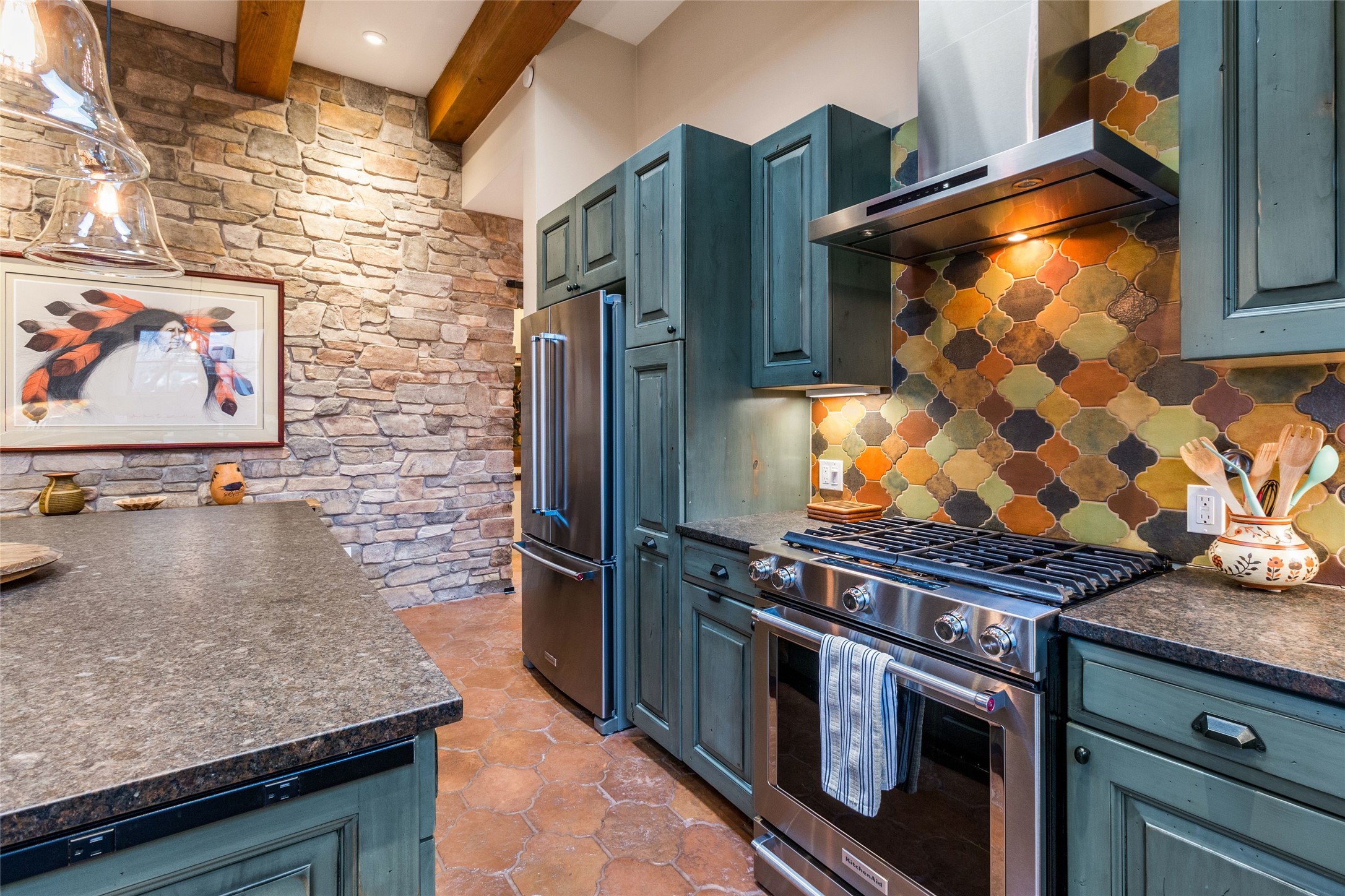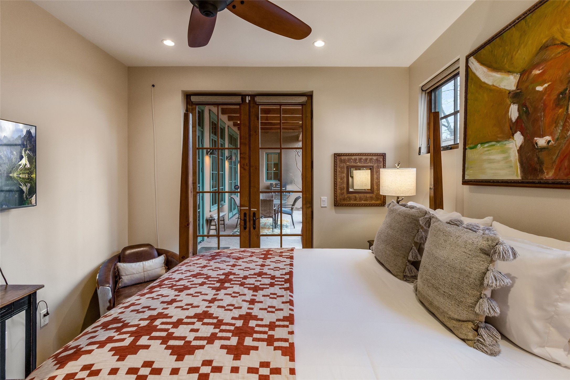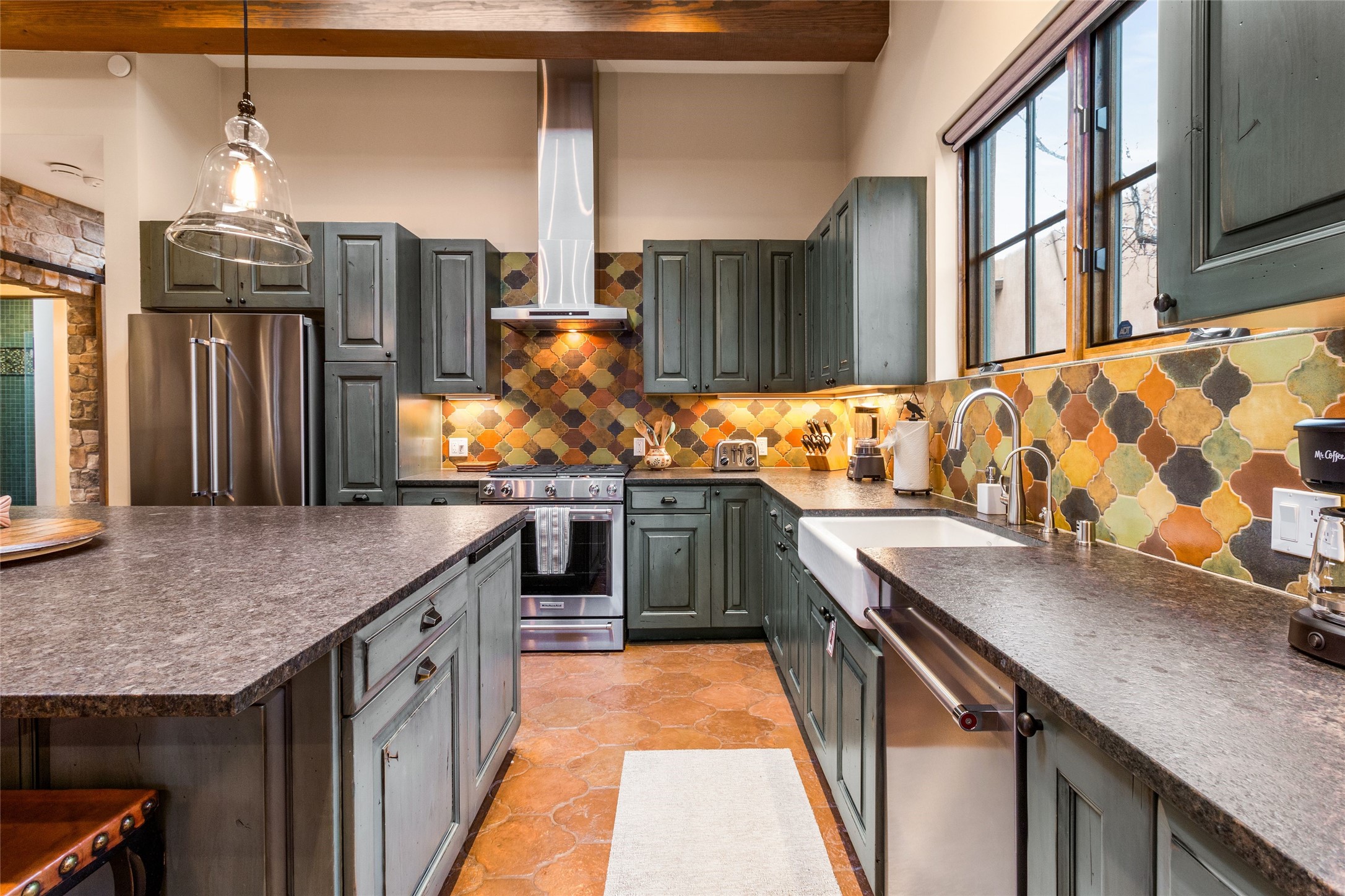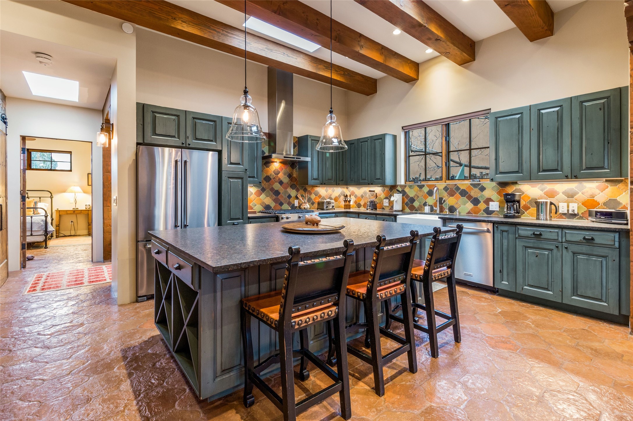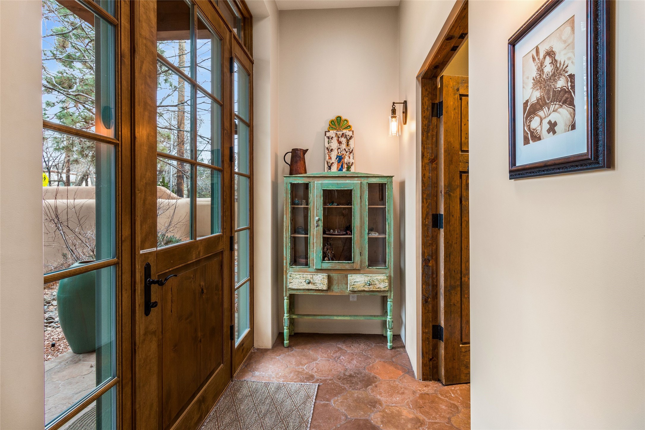 This rare Eastside property is situated in downtown Santa Fe's most beloved and walkable locations close to Canyon Road. Comprising 1,750 +/- sq.ft., this single-level custom 2 bedroom and 2 bath home was built in 2016 and exudes classic Santa Fe style. High ceilings featuring large beams in the open concept living/dining/kitchen area fill the space with light and warmth accented by a gas fired stone fireplace and nearby stone accent wall. Glass French doors lead from this living area to a covered portal with a bubbling water feature, perfect for al fresco dining and entertaining. Each en-suite bathroom is spa-like in nature each with large walk in showers and quiet privacy. Features include antiqued terracotta tiles with in-floor radiant heat, mini-split air conditioning/heating, large windows with privacy blinds, skylights, a gourmet kitchen with large island, custom cabinets with granite countertops, a full size laundry and mud room, built in office alcove, custom lighting, plenty of storage, and a 2-car garage with additional off street parking. Solar panels were recently added with a transferable warranty in place. This property has a great rental history and could be offered turn-key to those looking for an excellent income producing property.