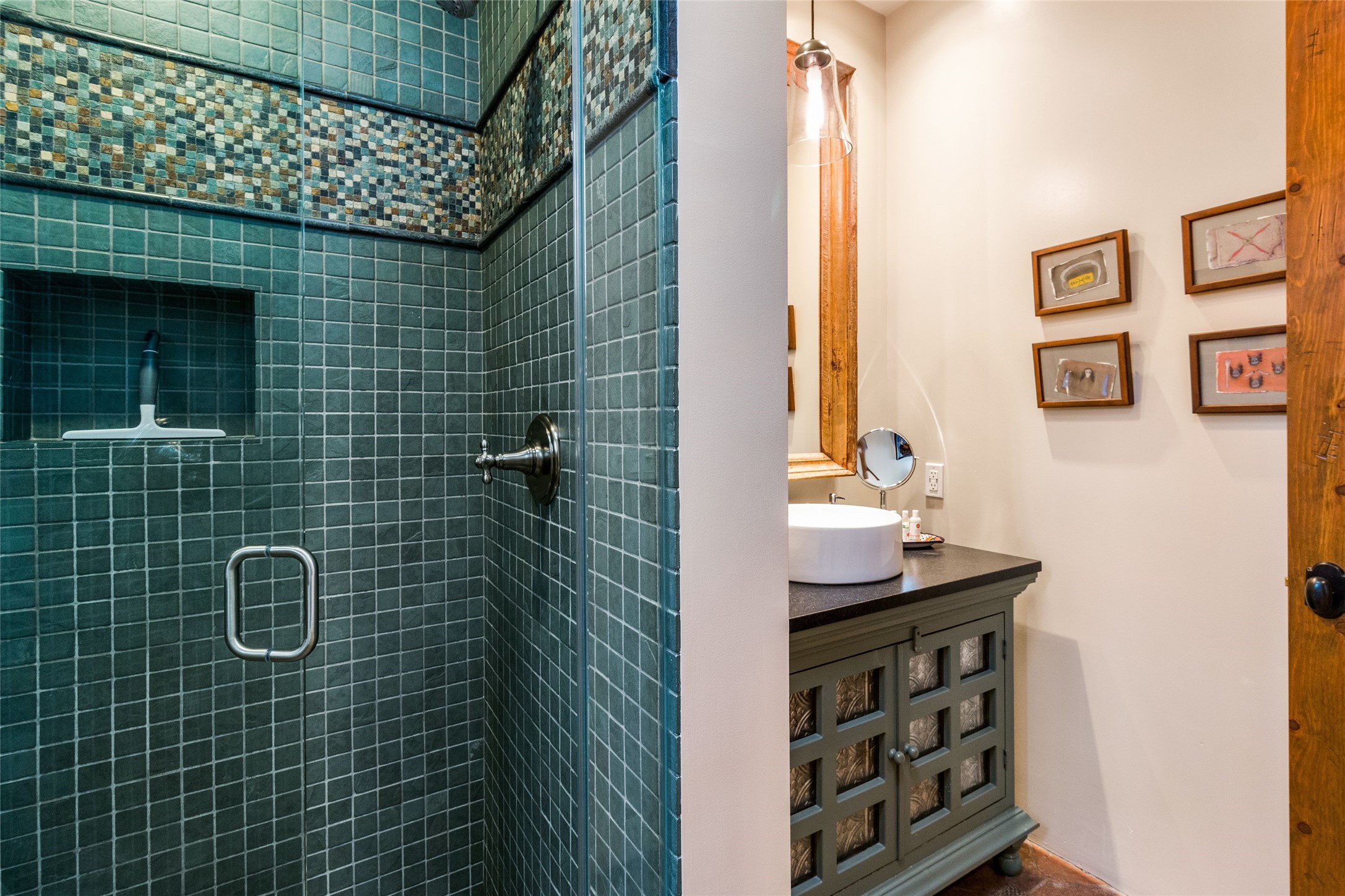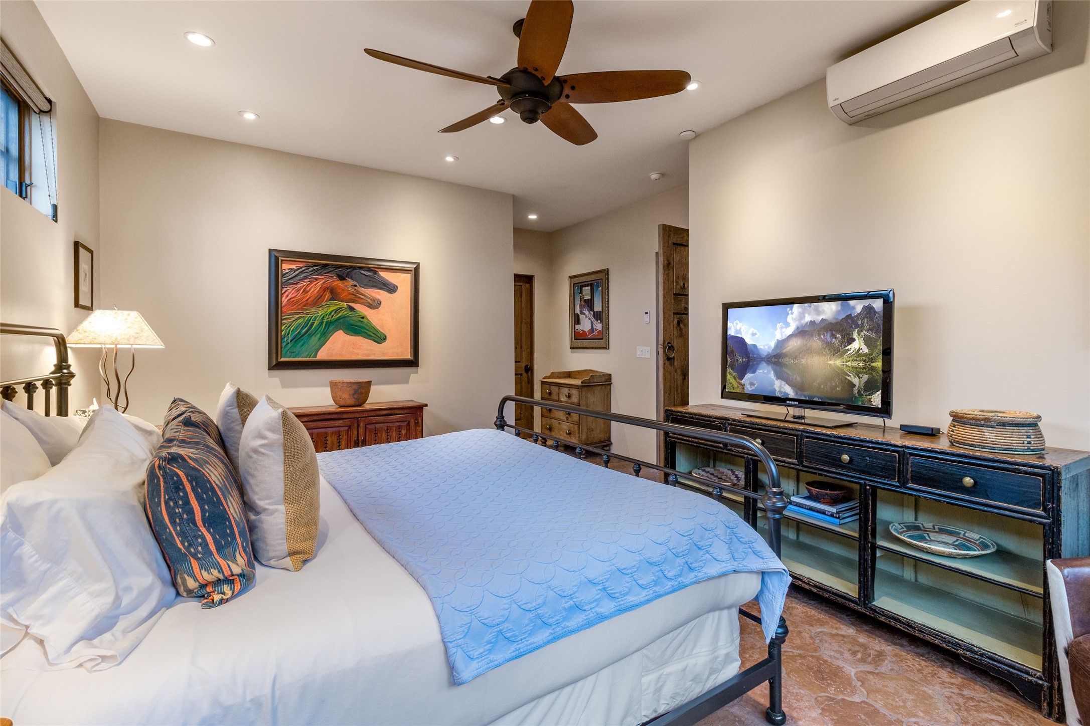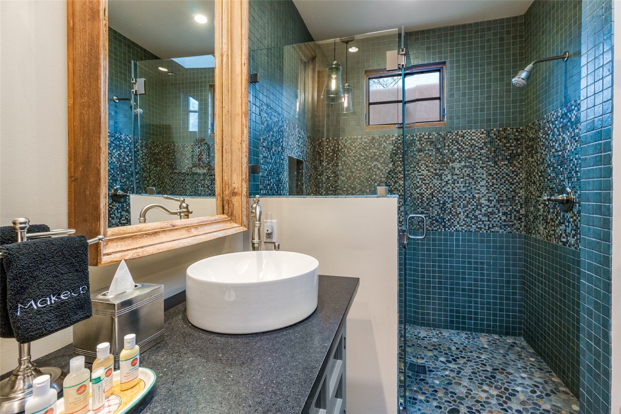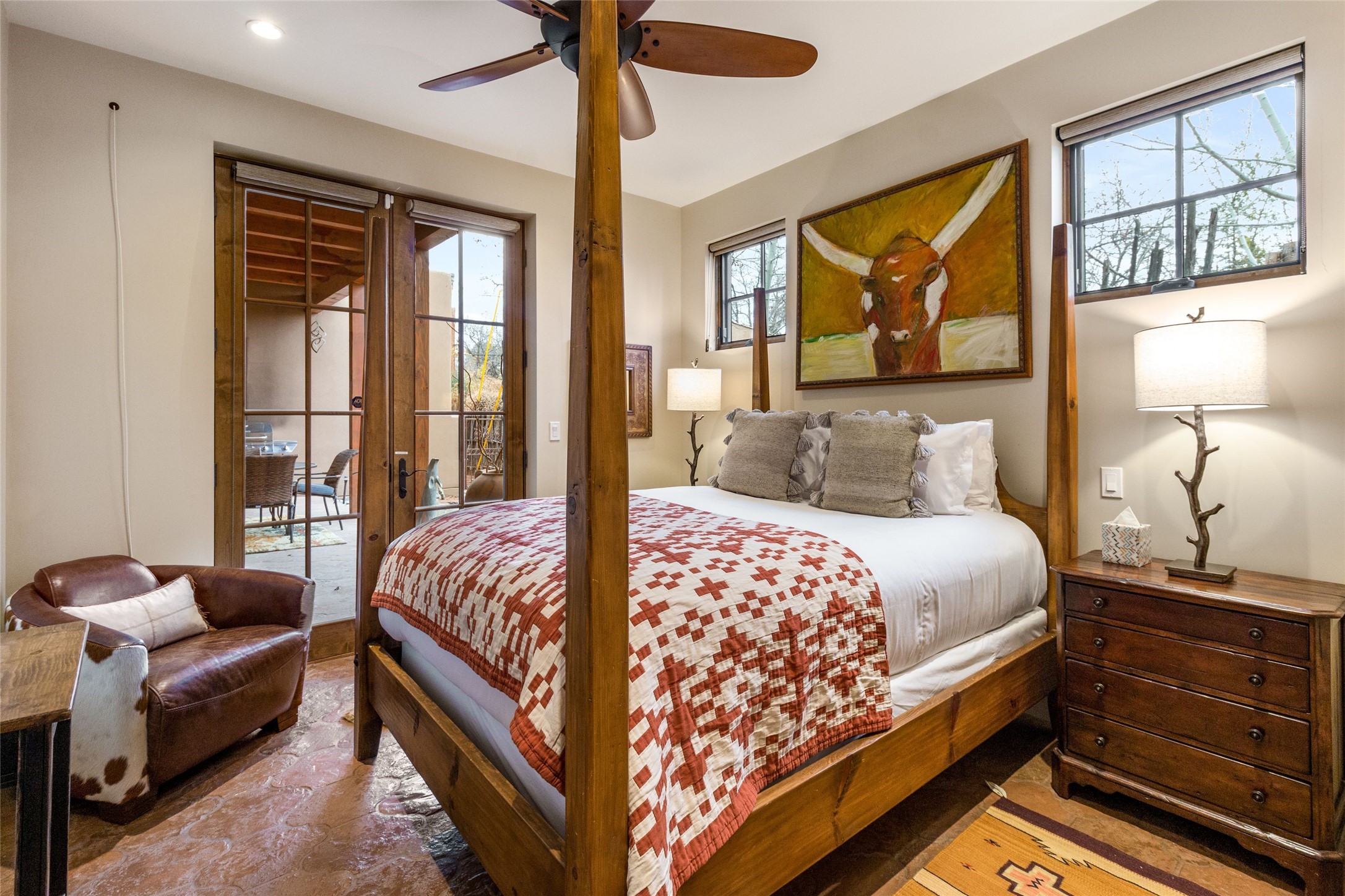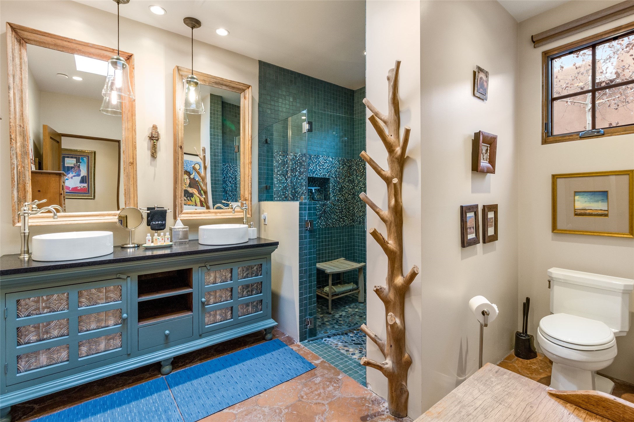 This rare Eastside property is situated in downtown Santa Fe's most beloved and walkable locations close to Canyon Road. Comprising 1,750 +/- sq.ft., this single-level custom 2 bedroom and 2 bath home was built in 2016 and exudes classic Santa Fe style. High ceilings featuring large beams in the open concept living/dining/kitchen area fill the space with light and warmth accented by a gas fired stone fireplace and nearby stone accent wall. Glass French doors lead from this living area to a covered portal with a bubbling water feature, perfect for al fresco dining and entertaining. Each en-suite bathroom is spa-like in nature each with large walk in showers and quiet privacy. Features include antiqued terracotta tiles with in-floor radiant heat, mini-split air conditioning/heating, large windows with privacy blinds, skylights, a gourmet kitchen with large island, custom cabinets with granite countertops, a full size laundry and mud room, built in office alcove, custom lighting, plenty of storage, and a 2-car garage with additional off street parking. Solar panels were recently added with a transferable warranty in place. This property has a great rental history and could be offered turn-key to those looking for an excellent income producing property.