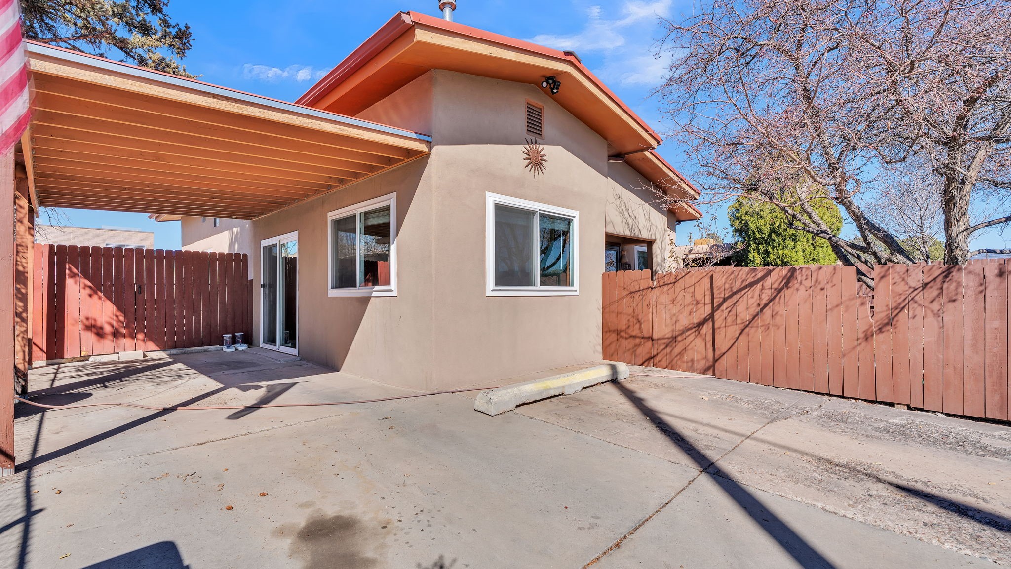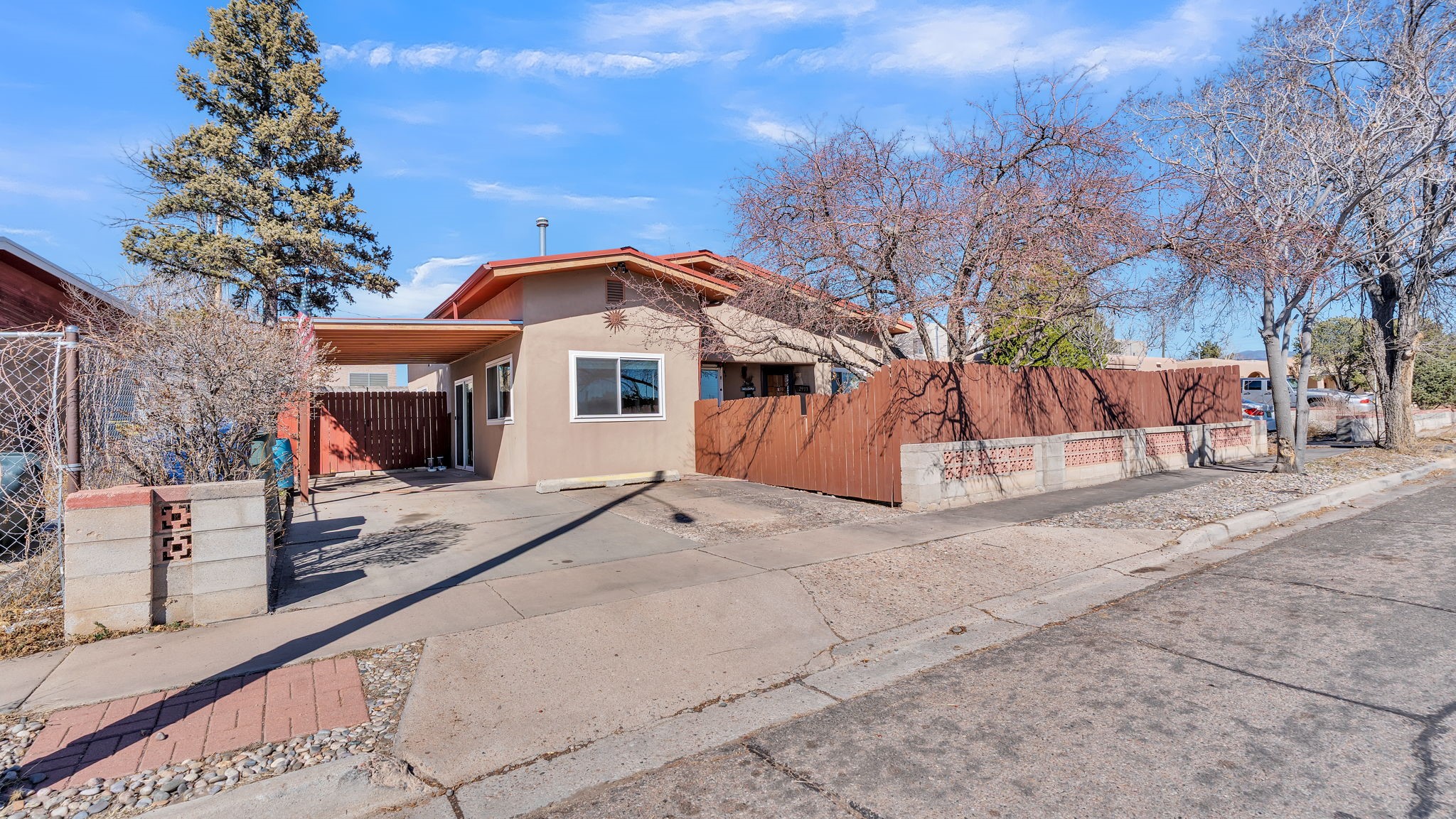This light-filled property features new stucco and windows (2023), updated flooring (2024), and mini splits installed in 2025. The interior has updated kitchen cabinets. The home offers two living areas and a spacious primary suite with a sitting area or office and private entrance. Pitched Pro-Panel roof with good attic storage. Walled and landscaped yard provides privacy, plus a covered carport for convenience. Extra storage space with potential to convert into an additional living area. Located in an established Southwest Santa Fe neighborhood close to shopping, dining, and parks. Move-in ready.