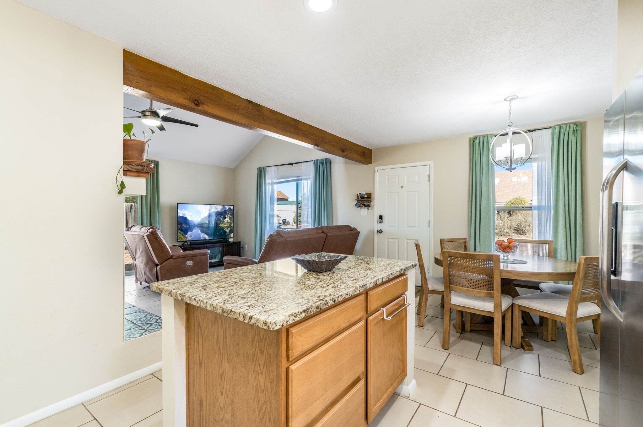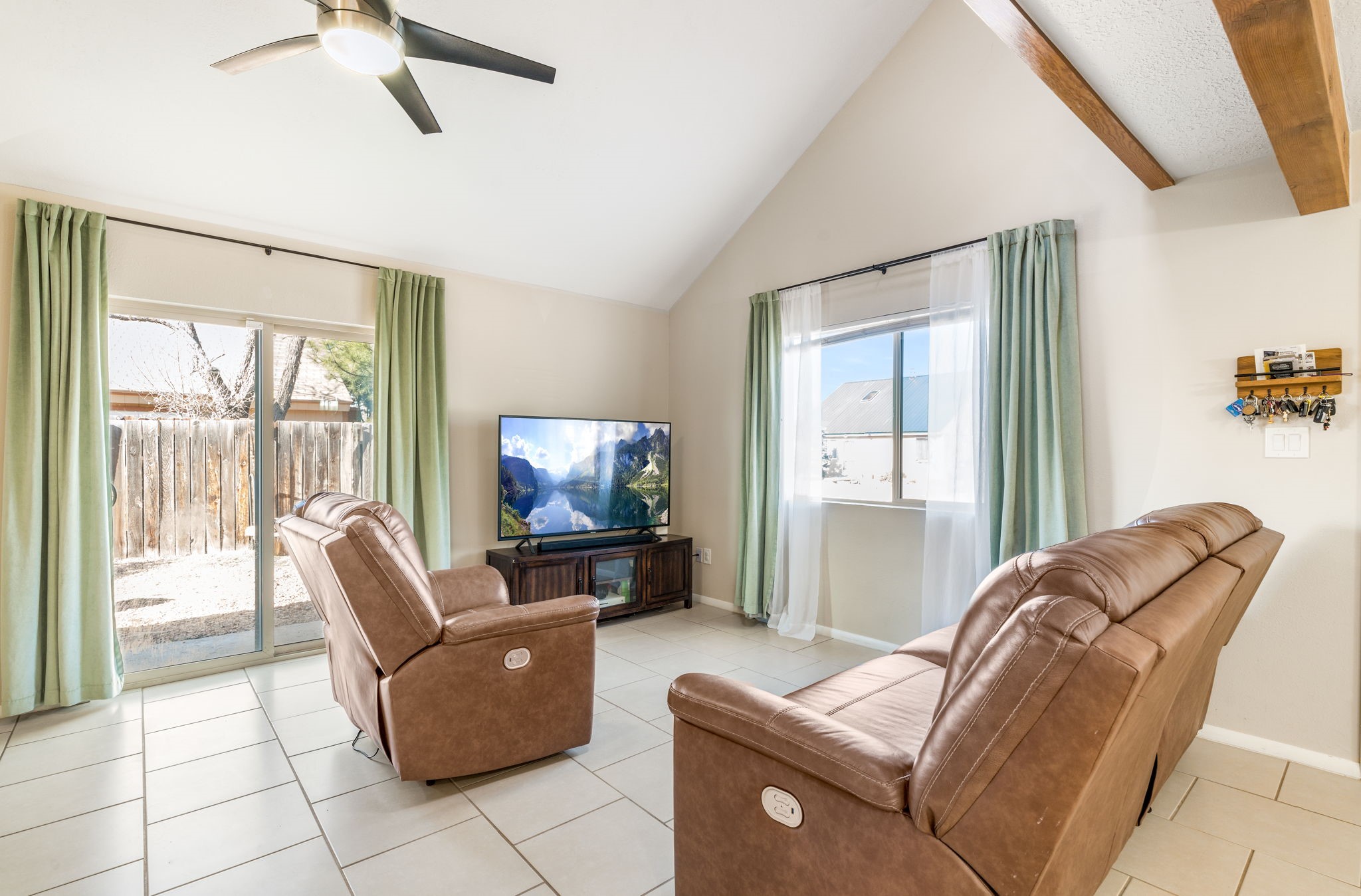 Situated in the Fairway Village community, this thoughtfully designed home offers comfort, functionality, and recent improvements throughout. The layout provides flexibility with a bedroom and full bath on the main level, while an additional bedroom and bathroom are privately positioned upstairs. The living space feels open and airy with elevated ceilings that enhance the sense of volume. Natural light filters in from above through upper level skylights, adding brightness to the interior. A spacious loft offers versatile use for a second living area, workspace, or hobby room. Outside, the generously sized enclosed backyard creates room for outdoor gatherings, pets, or quiet relaxation. Recent updates include upgraded windows, refreshed exterior stucco, updated kitchen appliances, granite countertops, and a newly installed roof(2021), offering added value and peace of mind. Conveniently located near parks, retail centers, schools, Interstate 25, and NM 599, this home combines neighborhood charm with easy access to daily essentials and commuting routes.