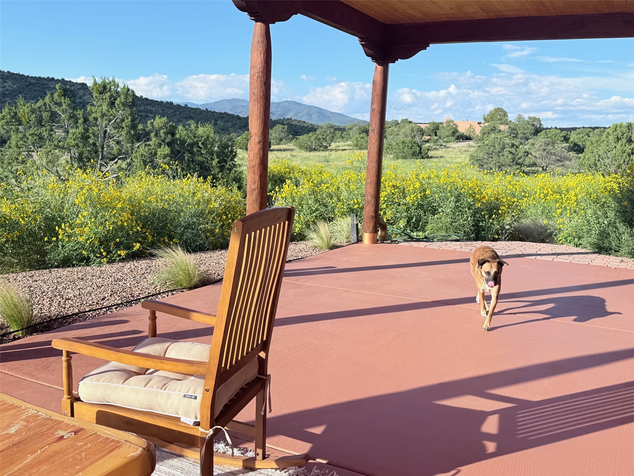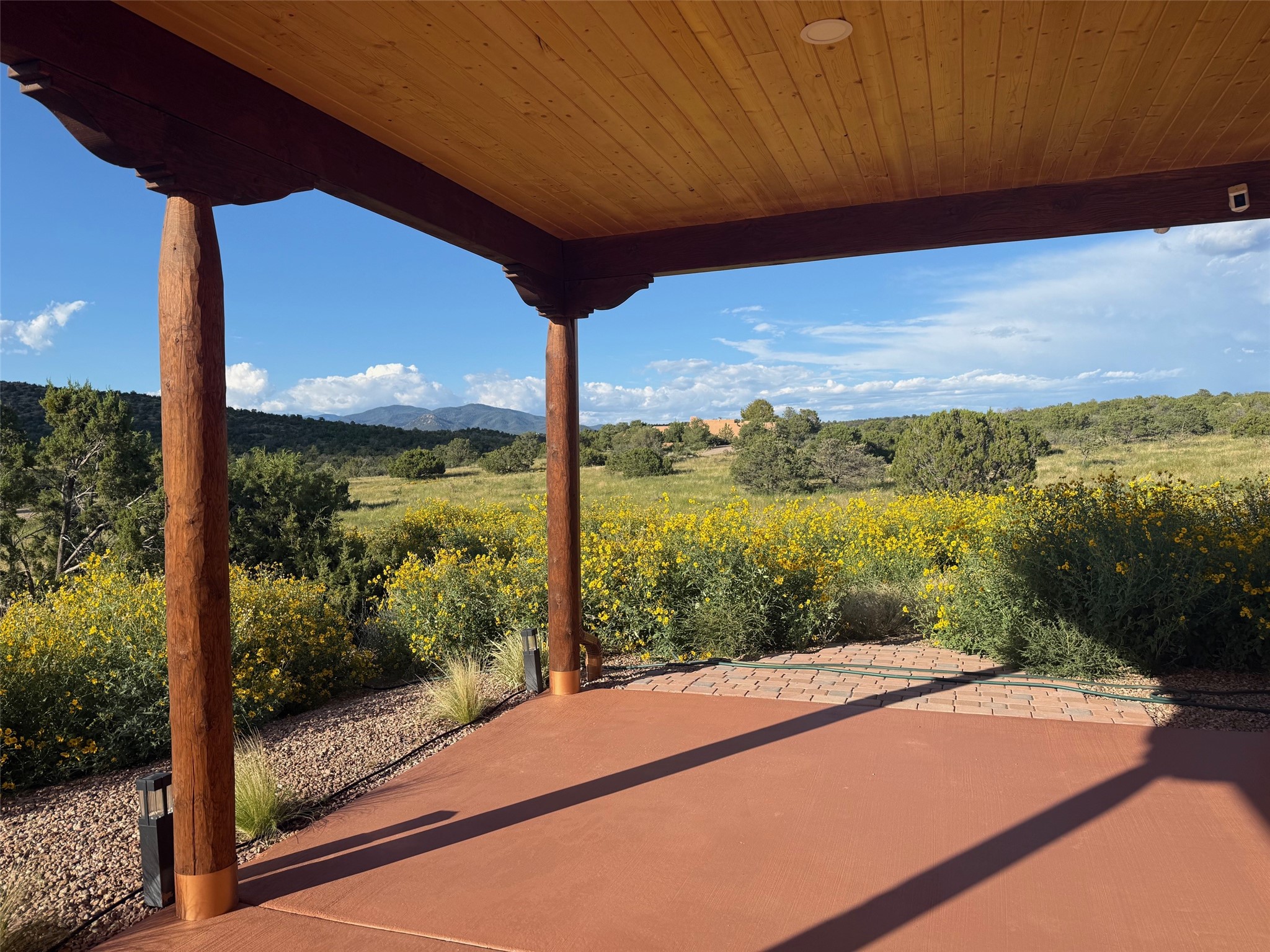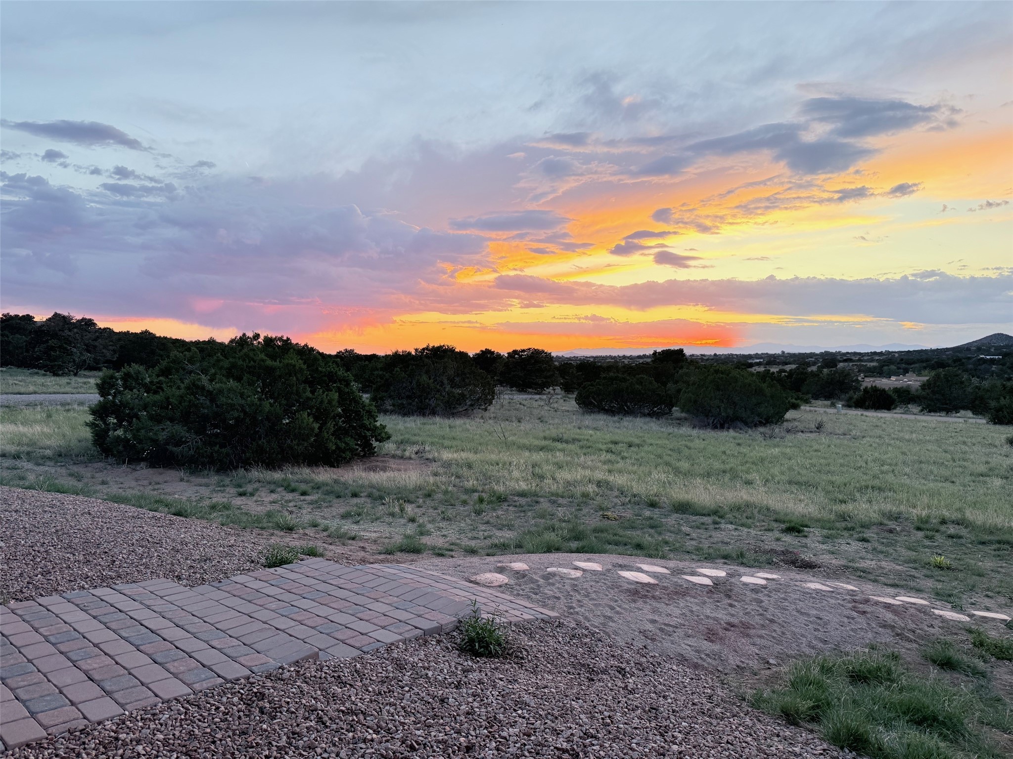 Completed in 2023 and gracefully set on nearly three pristine acres in The Ridges, this exceptional soft-contemporary residence captures the essence of refined New Mexico living. Designed to embrace expansive views, privacy, and serenity, the property offers a rare combination of architectural sophistication and natural beauty -- with ample space to accommodate a future guest house or casita. The home's light-filled interior is defined by soaring 12-foot ceilings in the great room, creating a dramatic yet welcoming atmosphere. An open-concept design enhances both everyday living and elegant entertaining, while three well-appointed bedrooms (or two bedrooms plus an office) and two luxurious full baths provide comfort and style in equal measure. The spacious and inviting primary suite serves as a private retreat, featuring a charming sitting area with French doors that open to the garden patio and framed expansive views. The en suite bath is a true showpiece, highlighted by a luxurious slipper tub illuminated by an overhanging crystal chandelier and dramatically appointed with dual rustic log cabin vanities, blending refined elegance with warm Southwestern character. The chef's kitchen serves as a striking focal point, outfitted with premium Caf appliances, including a six-burner gas cooktop and oven, Caf refrigerator, Bosch dishwasher, and exquisite level 5 granite countertops. Clean lines, quality craftsmanship, and thoughtful finishes throughout contribute to the home's bright, airy ambiance. Seamless indoor-outdoor living unfolds beneath covered portals ideal for year-round enjoyment. Landscaped garden beds await curated plantings, and a beautifully positioned fountain serves as a serene focal point, adding both movement and calming ambiance to the expansive back patio. Modern conveniences include an electric vehicle charging hookup, a comprehensive whole-house alarm system, water filtration, a bidet in the primary bathroom, and a gas fireplace. Located within The Ridges subdivision, known for its quiet surroundings, breathtaking vistas, and reasonable HOA guidelines, this nearly new residence represents a rare opportunity to enjoy privacy, luxury, and timeless Southwestern beauty. Select furnishings are available for purchase separately, offering the possibility of a refined, turnkey acquisition.