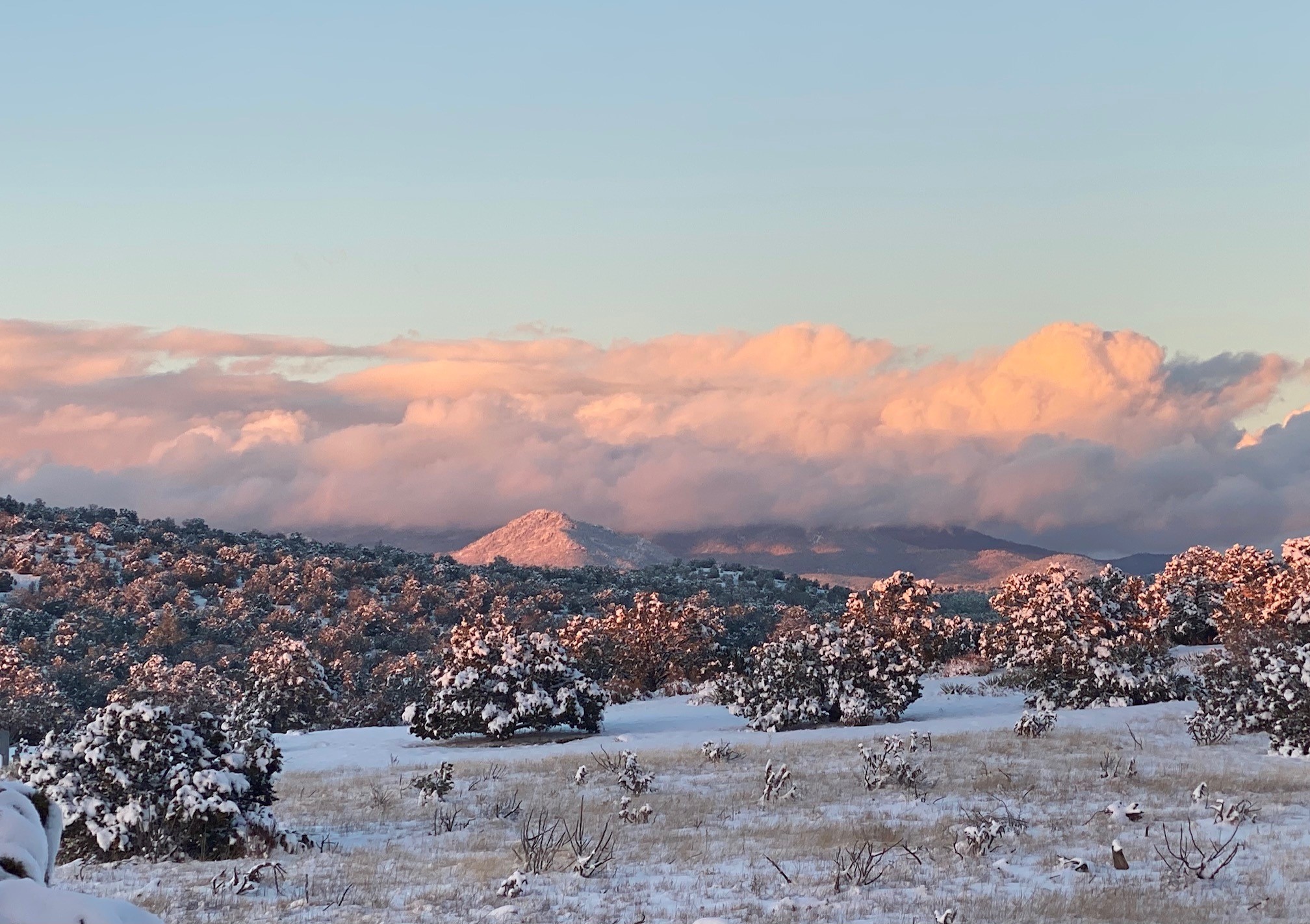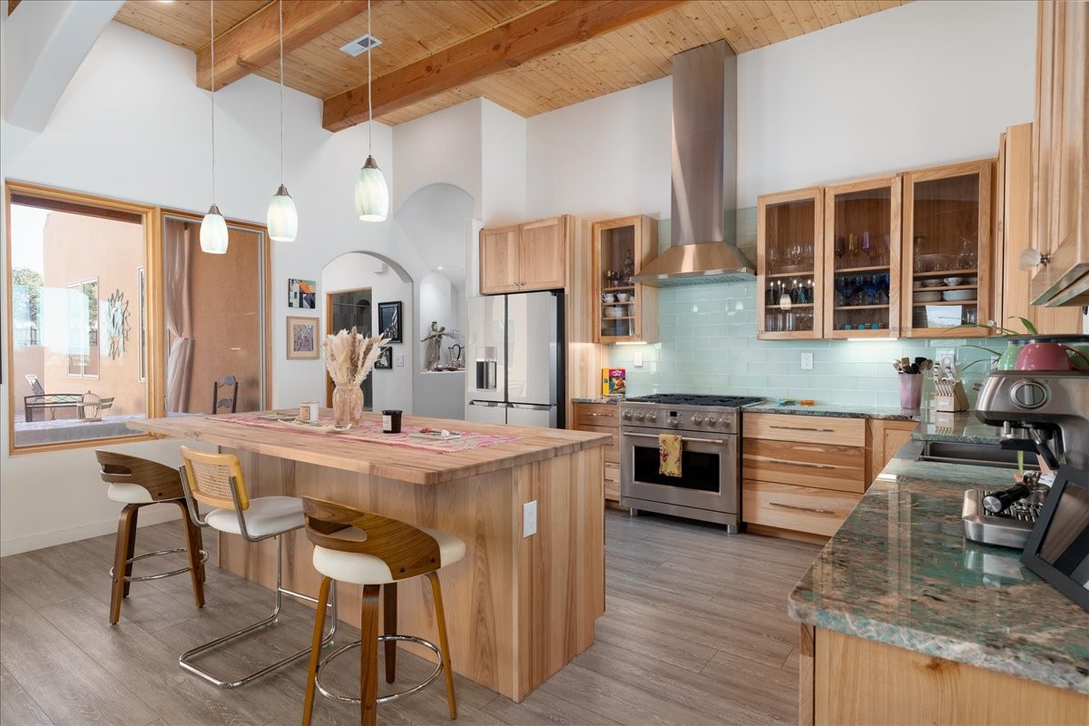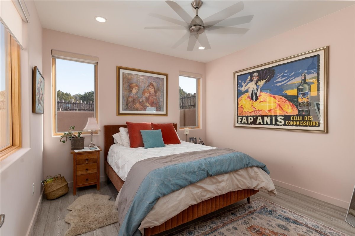 Completed in 2023 and gracefully set on nearly three pristine acres in The Ridges, this exceptional soft-contemporary residence captures the essence of refined New Mexico living. Designed to embrace expansive views, privacy, and serenity, the property offers a rare combination of architectural sophistication and natural beauty -- with ample space to accommodate a future guest house or casita. The home's light-filled interior is defined by soaring 12-foot ceilings in the great room, creating a dramatic yet welcoming atmosphere. An open-concept design enhances both everyday living and elegant entertaining, while three well-appointed bedrooms (or two bedrooms plus an office) and two luxurious full baths provide comfort and style in equal measure. The spacious and inviting primary suite serves as a private retreat, featuring a charming sitting area with French doors that open to the garden patio and framed expansive views. The en suite bath is a true showpiece, highlighted by a luxurious slipper tub illuminated by an overhanging crystal chandelier and dramatically appointed with dual rustic log cabin vanities, blending refined elegance with warm Southwestern character. The chef's kitchen serves as a striking focal point, outfitted with premium Caf appliances, including a six-burner gas cooktop and oven, Caf refrigerator, Bosch dishwasher, and exquisite level 5 granite countertops. Clean lines, quality craftsmanship, and thoughtful finishes throughout contribute to the home's bright, airy ambiance. Seamless indoor-outdoor living unfolds beneath covered portals ideal for year-round enjoyment. Landscaped garden beds await curated plantings, and a beautifully positioned fountain serves as a serene focal point, adding both movement and calming ambiance to the expansive back patio. Modern conveniences include an electric vehicle charging hookup, a comprehensive whole-house alarm system, water filtration, a bidet in the primary bathroom, and a gas fireplace. Located within The Ridges subdivision, known for its quiet surroundings, breathtaking vistas, and reasonable HOA guidelines, this nearly new residence represents a rare opportunity to enjoy privacy, luxury, and timeless Southwestern beauty. Select furnishings are available for purchase separately, offering the possibility of a refined, turnkey acquisition.