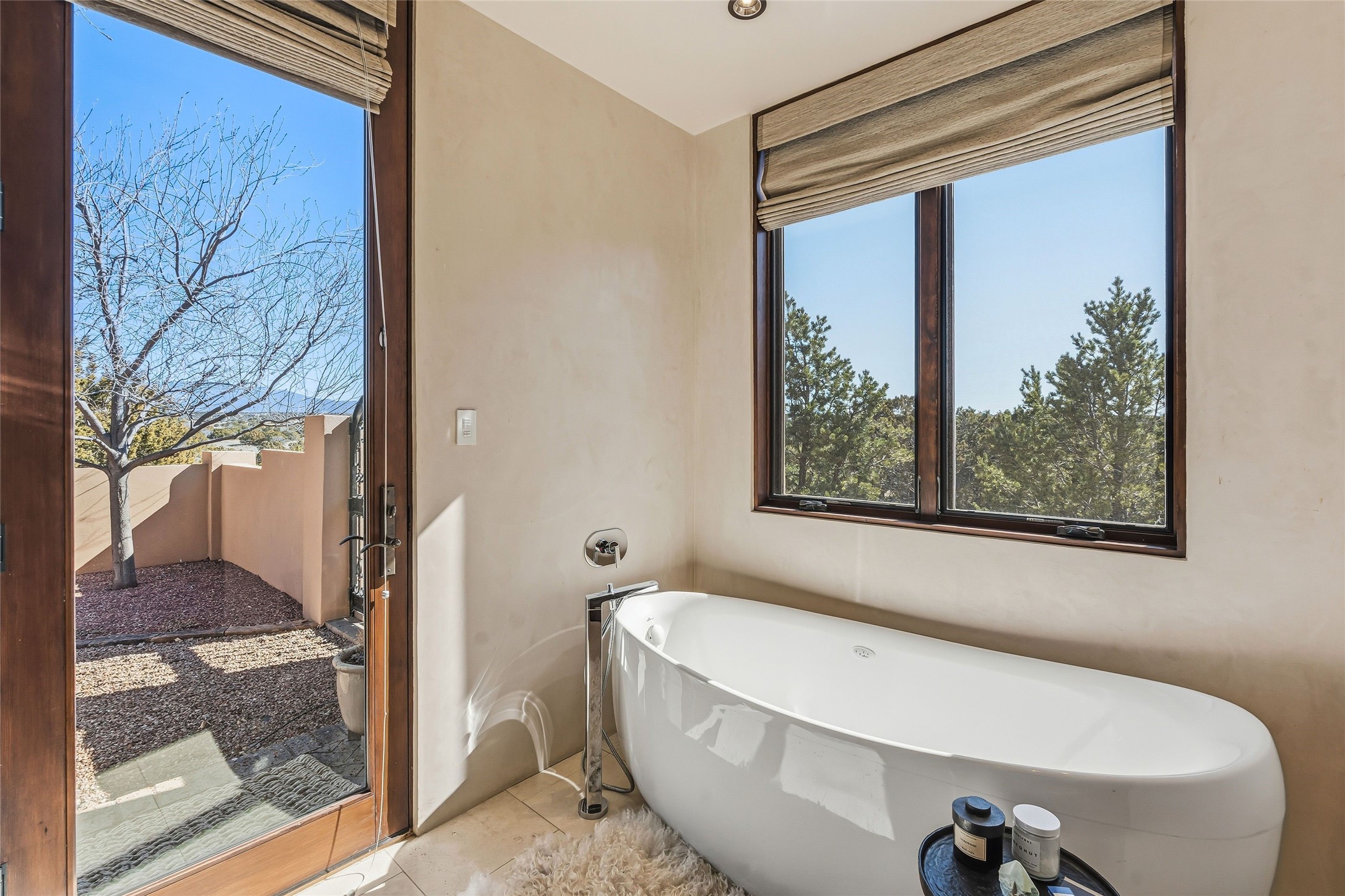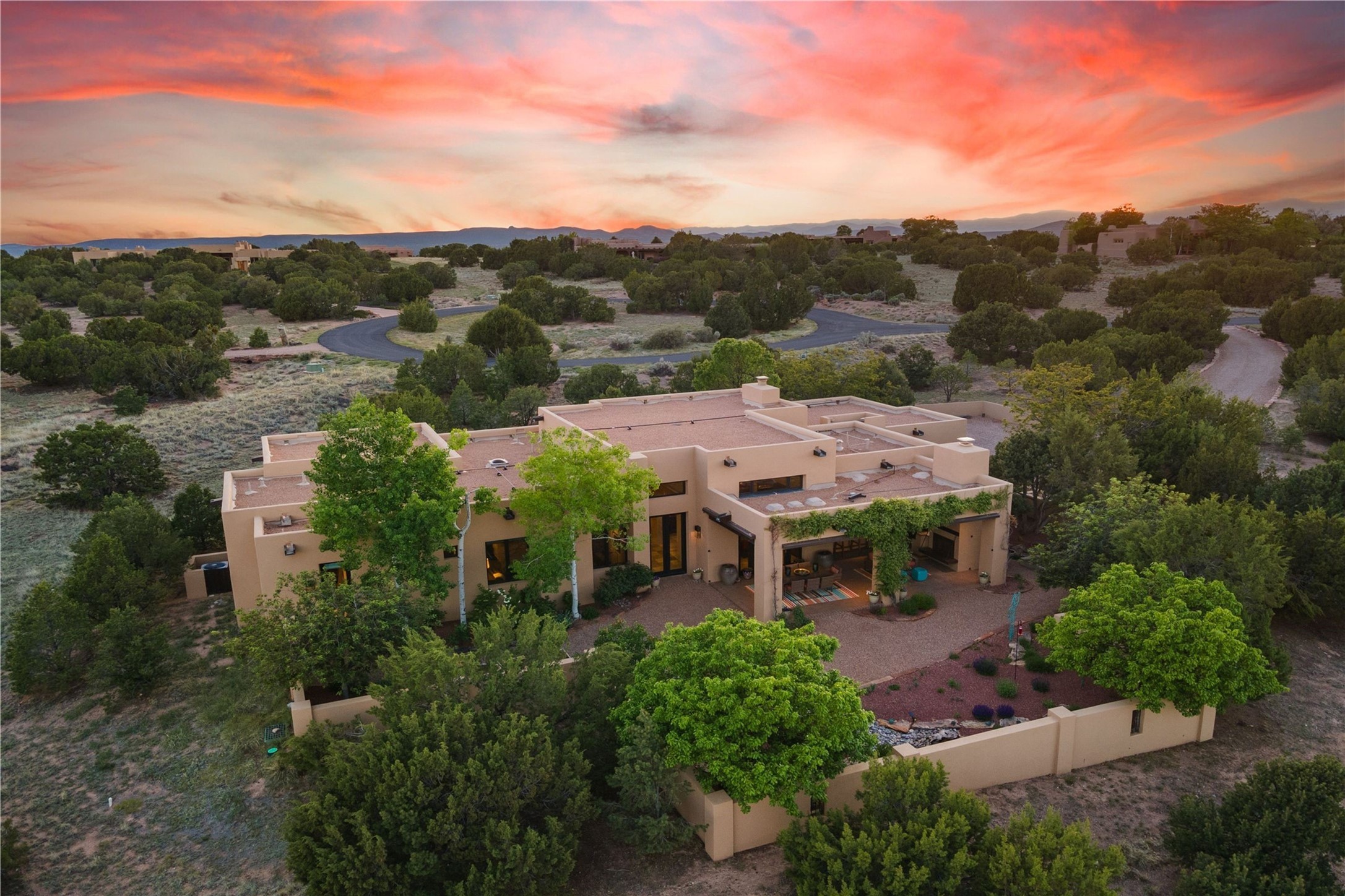 Las Campanas 3-bedroom, 3.5-bath custom home on 2-acres with clear, unobstructed views of the Sangre de Christo Mountains. Single story; no interior steps. Designed by acclaimed architect, David Lorimer AIA with interiors by ASID award winning designer, Jeannie Brown, Diva Interior Design, Ltd., this home features extraordinary unique and high-end features such as century-old, reclaimed beams, antique Mexican doors, hand-hewn oak floors, Douglas fir interior doors, Rocky Mountain cast bronze door hardware, cabinet hardware and pulls on all cabinets and diamond plaster throughout. The stately living room is enhanced by 15-ft. ceilings, a Rumford fireplace, clerestory windows and custom designed, cabinets. The living area easily flows into a spectacular open concept dining room and kitchen, which is appointed with deluxe appliances including a Sub-Zero wine cooler, premium granite counter tops, and island with prep sink. Retreat to the luxurious primary suite with fireplace, two-sided bath divided by a walk-in steam shower, free standing soaking tub and a spacious custom designed, walk in closet. Friends and neighbors alike will enjoy being entertained on the back portal with outdoor fireplace and gorgeous mountain views. Bonus is a separate, fenced in space for pets. Membership to the Club at Las Campanas is available for a separate fee and upon approval. Located at the beginning of Las Campanas, this home has easy access to Santa Fe and all its cultural, culinary and recreational amenities.