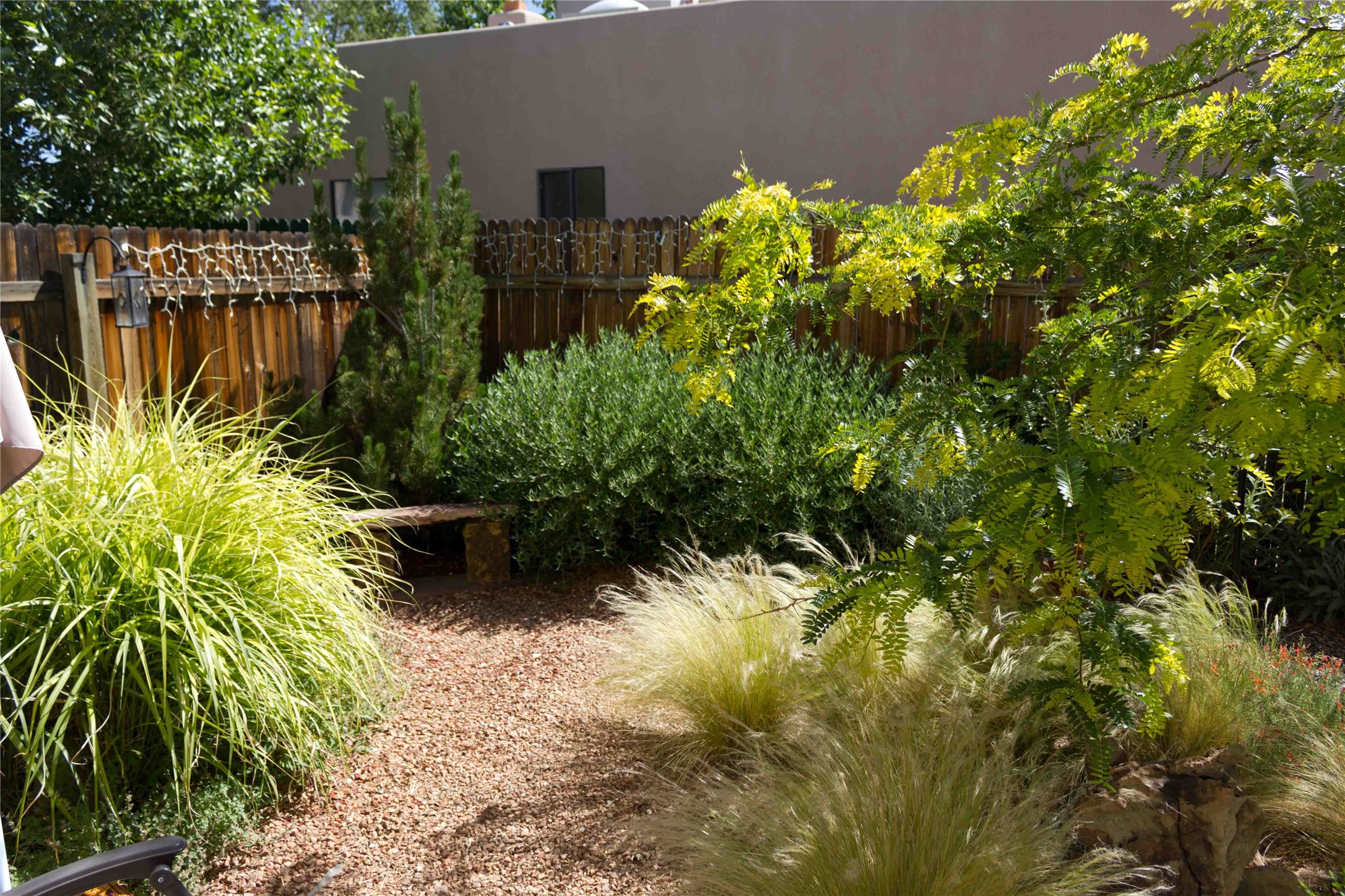 This very lovely 2-bedroom, 2 bath home has such a welcoming energy. The front yard has been professionally landscaped and lovingly maintained with the help of a drip irrigation system. Just wait till everything is in bloom. Upon entering you will find high ceilings with beautiful and bold vigas. The openness of the kitchen, living room, dining room are accentuated with a woodburning fireplace for cozy evenings. The bedrooms have a great separation of space for when occupants need their private time, each bedroom has access to their own private bathroom. The Primary bedroom offers a larger closet to maneuver through. Passing through the home to a sweet sanctuary garden also professionally landscaped, this quiet oasis offers privacy and tranquility. Homes do not often pop up for sale in this neighborhood so if you are looking for a special spot to call home, you really don't want to miss this opportunity.