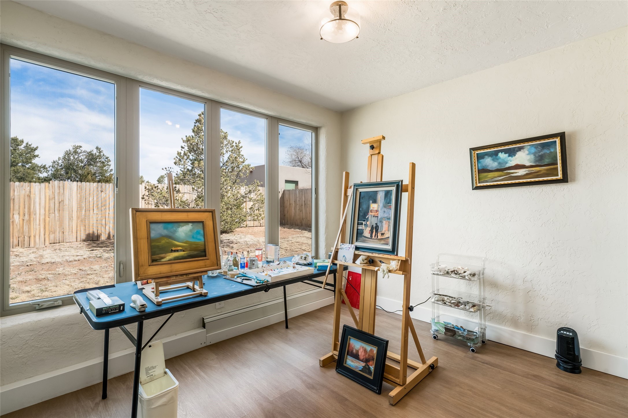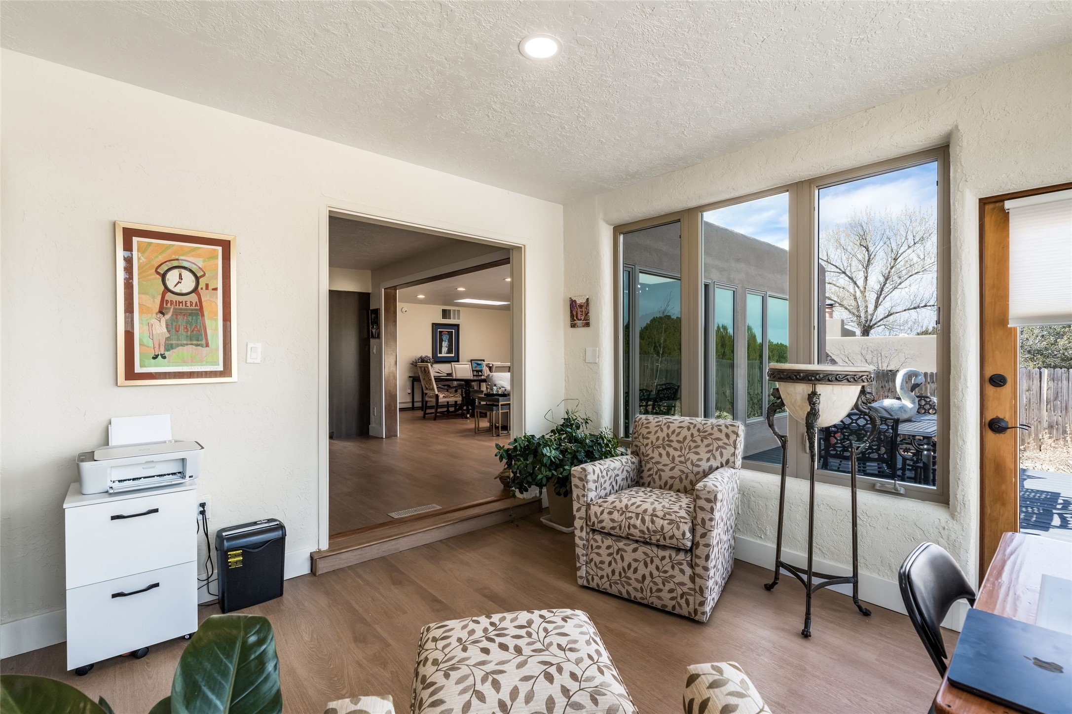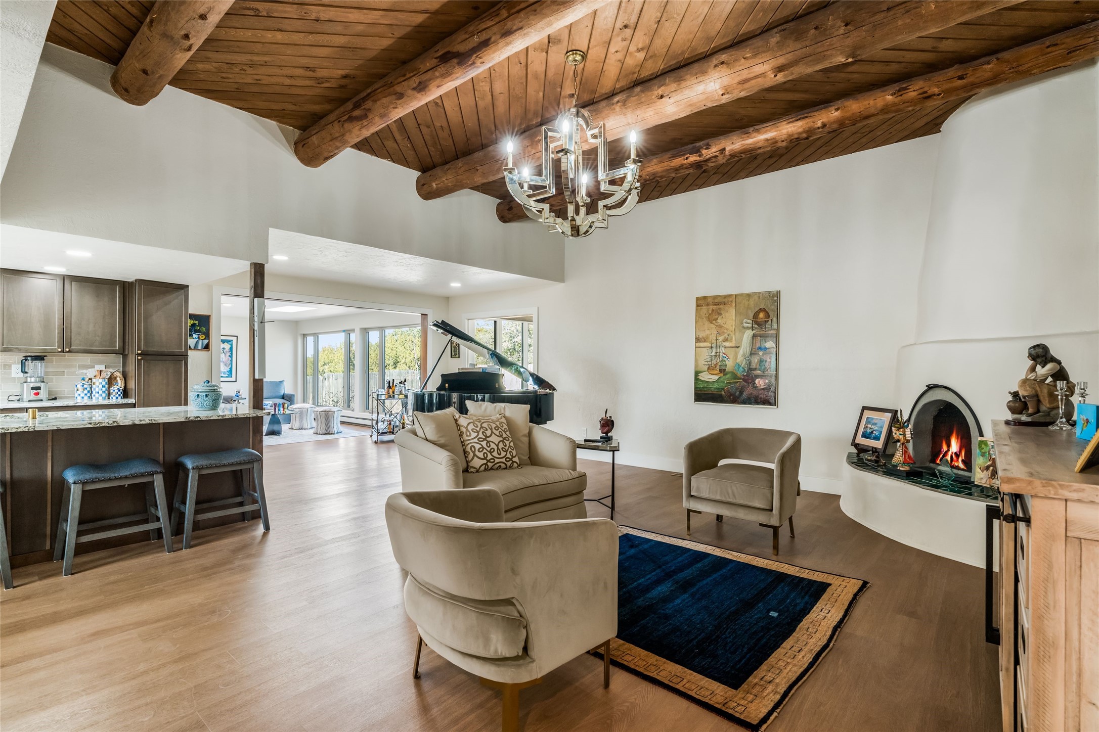 Behind old carved wooden doors, a walled sunny South courtyard with decorative tiled flooring welcomes you into this 3bedroom 2 bath updated home. Located in one of the top elementary school districts in town and minutes from the Plaza, hospital, mid-town and shopping, it is an ideal location! With a nice open floorplan, the kitchen enjoys the kiva fireplace in the living room as well as vigas and high ceilings, so the cook can be a part of the action with family and friends while in the kitchen. The kitchen has a sunny breakfast nook, excellent storage, granite counters, a big farm sink, gas stove, new appliances and handy access through the adjacent laundry room to the two-car garage which has a big storage room for sports equipment, suitcases and holiday dcor. A large living area off the kiva fireplace living room has floor to ceiling windows overlooking the back yard and Trex deck, and is a versatile space for family room, formal dining or game room. There is a sweet sunroom or studio which accesses the backyard deck, and a small 3rd bedroom on this side of the house. The main bedroom is located at the quiet back of the home, it's bath also updated with decorative tile floor, two sinks, nice walk-in shower and a perfectly organized new California closet. The second bedroom is adjacent to the full bath. Brand new Anderson windows, newer hot water heater, no stairs and some new fencing for the third of an acre lot, make this a truly move in ready home.