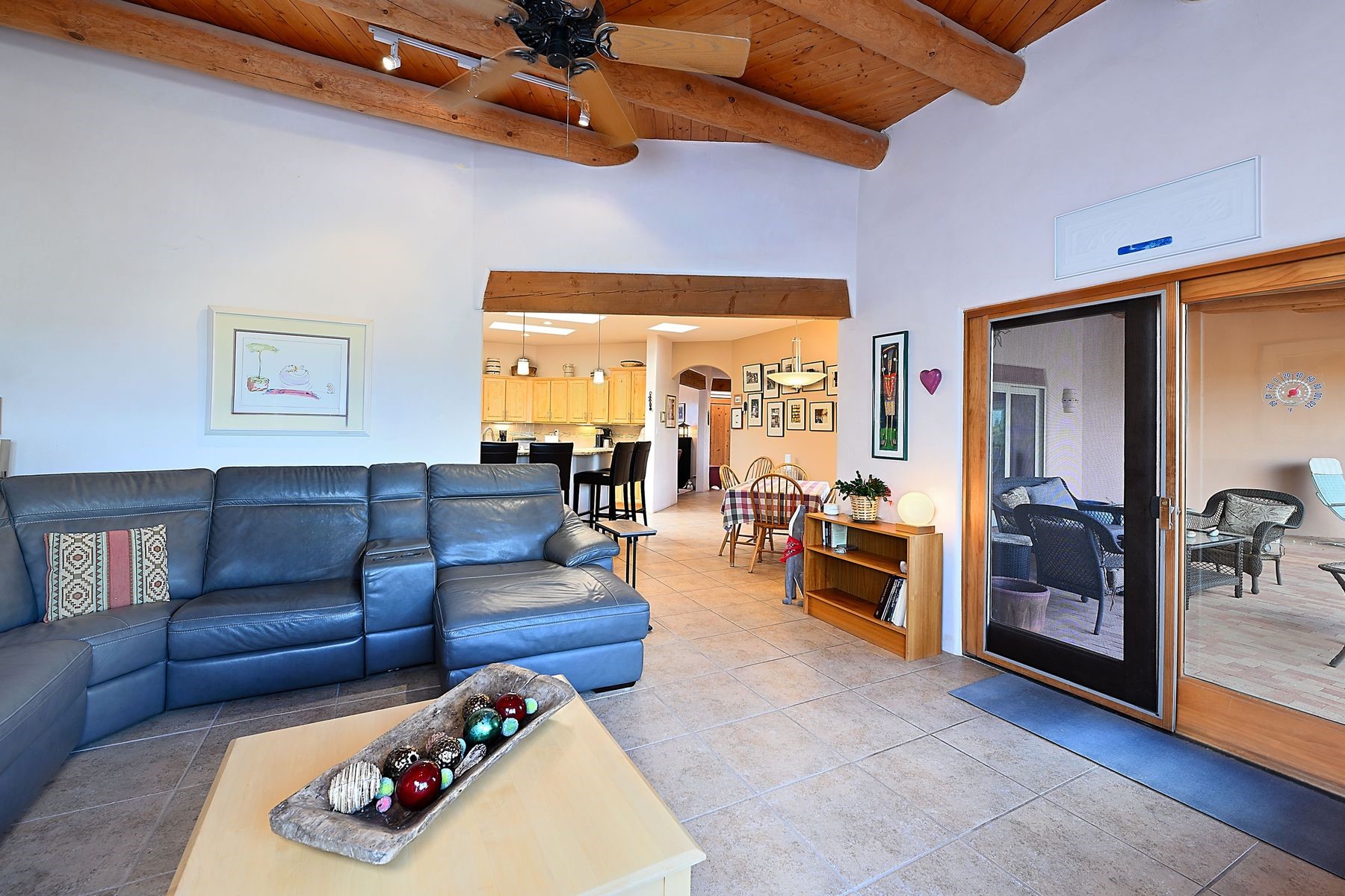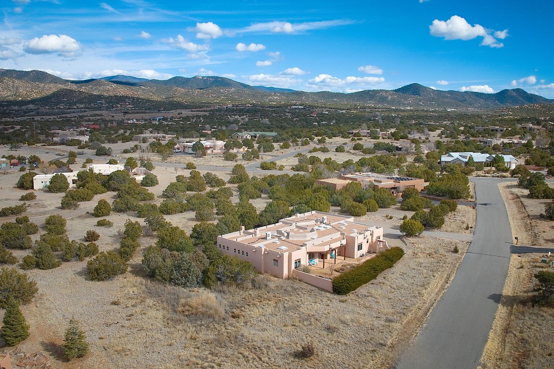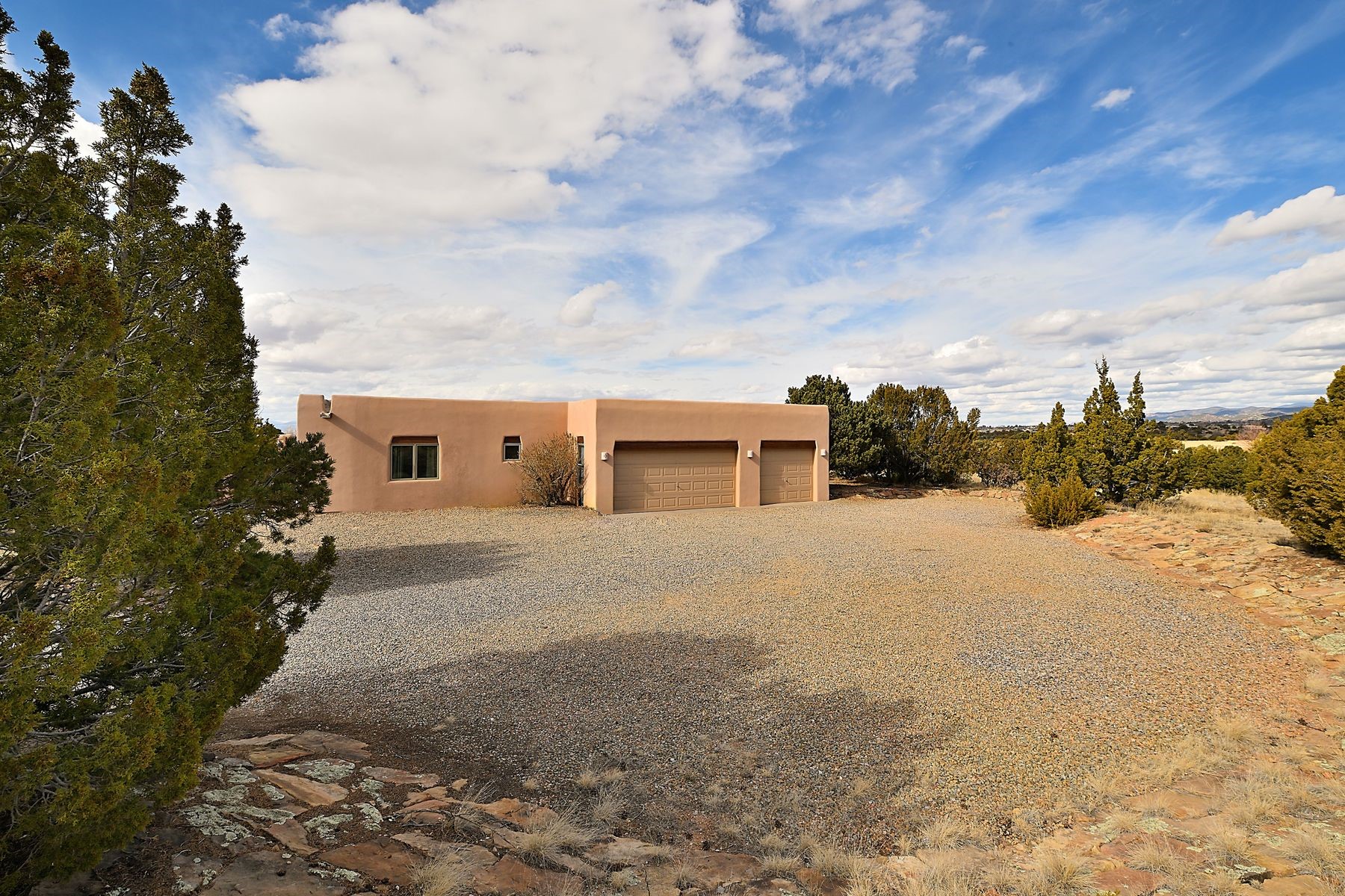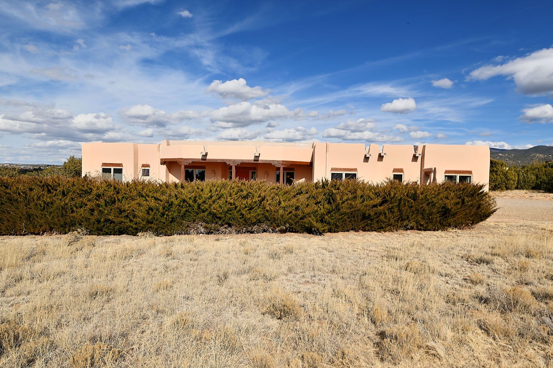 Bright and inviting, this light-filled four-bedroom home in Campos Conejos enjoys a private, quiet spot with spectacular views of the Sangre de Cristos. Plentiful windows, several sets of sliding glass doors, and an enviable portal and patio with a fireplace make the most of the majestic outlook. A central "piano room" and a dedicated dining room offer space for formal gathering and entertaining, while the generous open kitchen and its adjoining family room are destined to be the heart of relaxed day-to-day living. Secluded in the western wing are an owner's suite with a sitting room, a luxurious bath, and two walk-in closets; a guest bedroom or office; and a bright three-quarter bath; two additional bedrooms with a shared bath enjoy the peaceful privacy of the eastern wing of the home. Honey-hued woodwork, stone tile, subdued earth tones, and abundant skylights contribute to a welcoming warmth and an enlivening luster. Other highlights include a spacious laundry room and an oversized three-car garage. The desirable location provides a rare combination of seclusion and easy proximity to a wide variety of attractions and amenities.