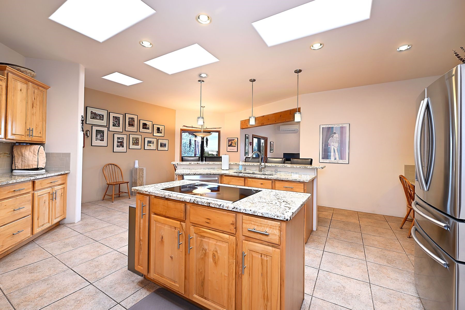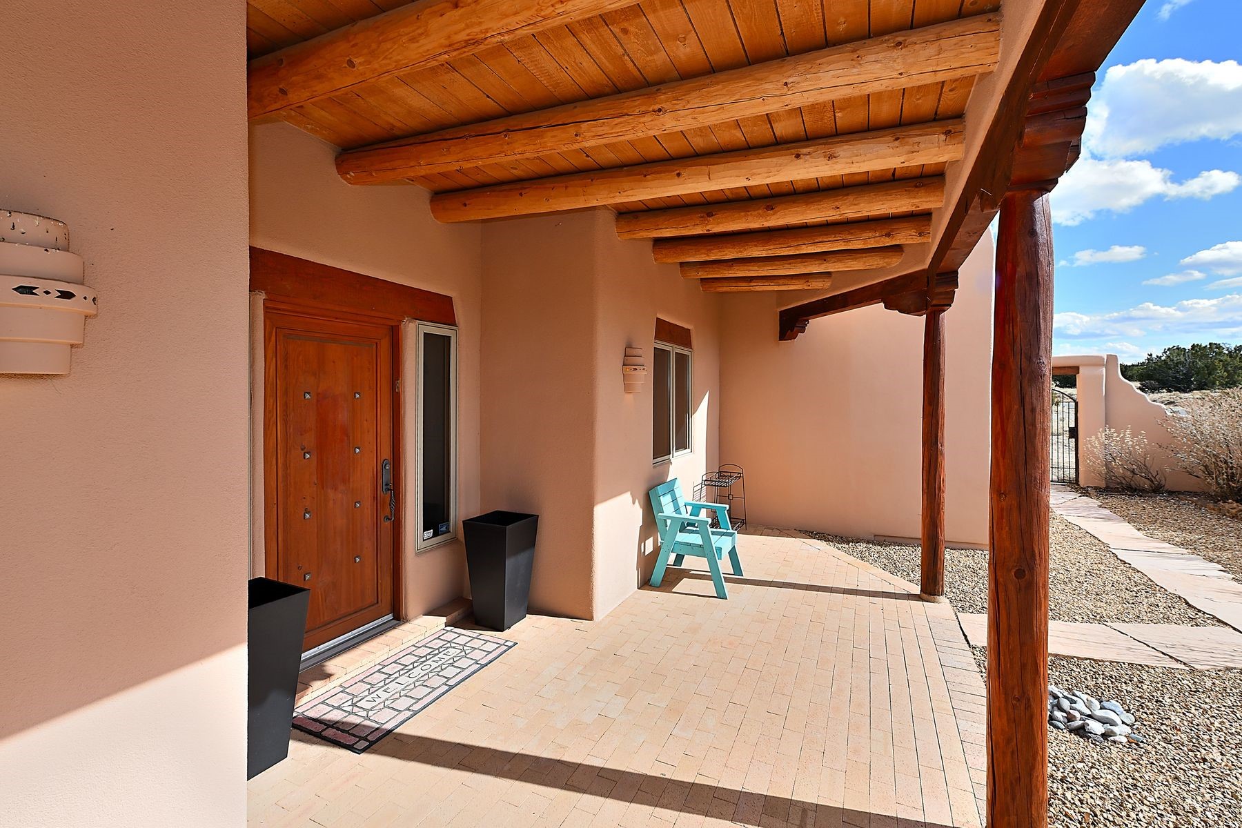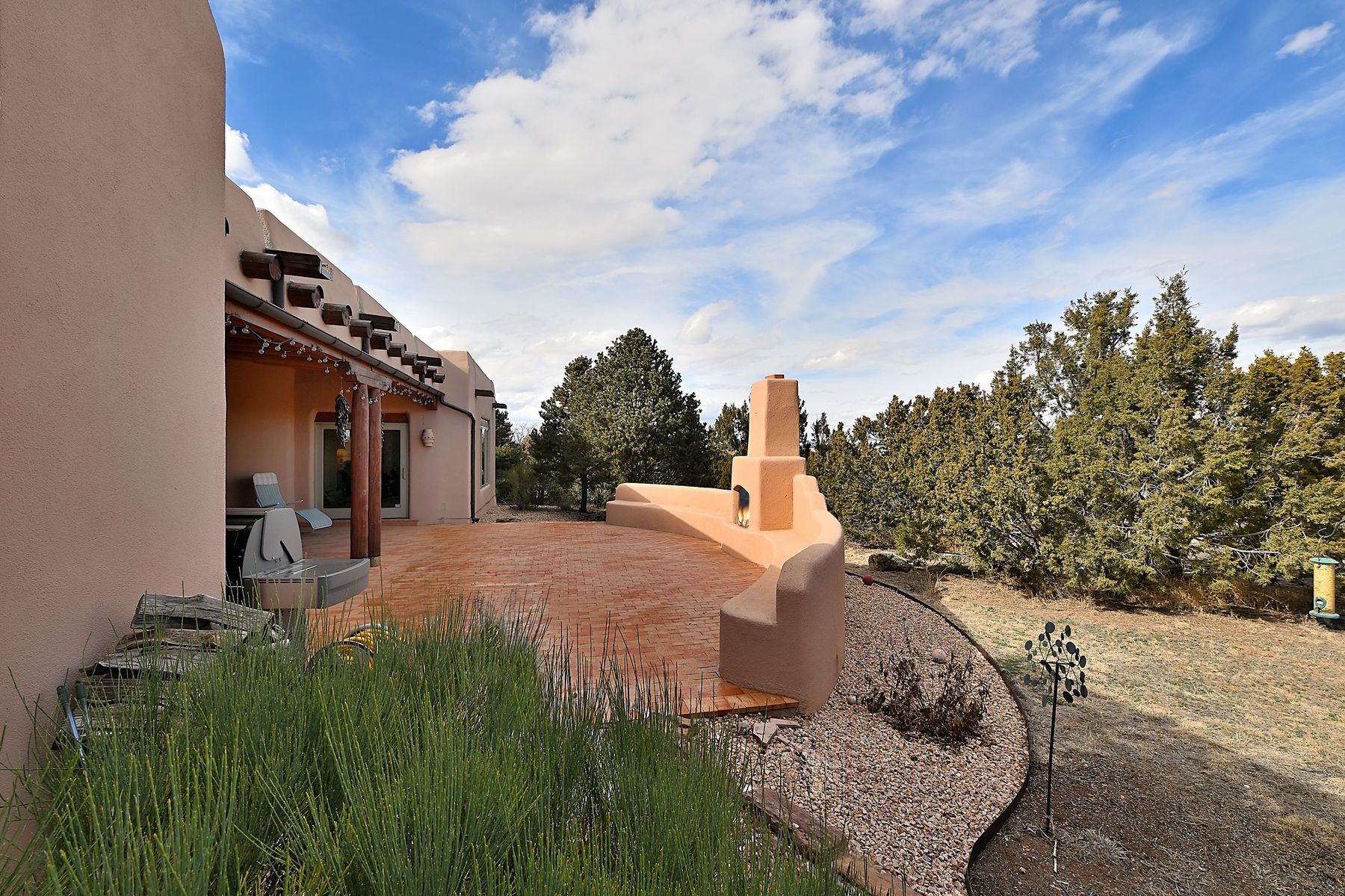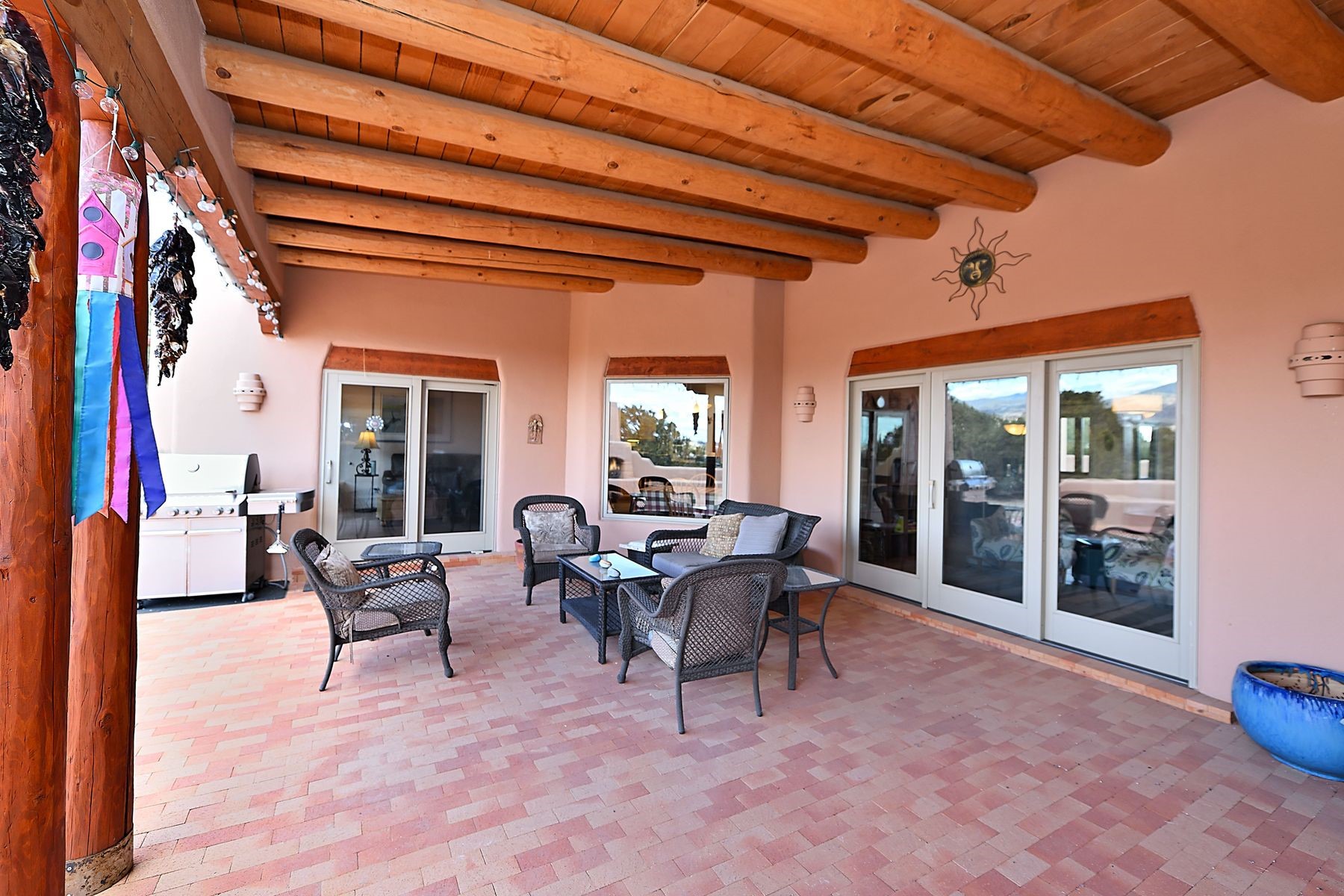 Bright and inviting, this light-filled four-bedroom home in Campos Conejos enjoys a private, quiet spot with spectacular views of the Sangre de Cristos. Plentiful windows, several sets of sliding glass doors, and an enviable portal and patio with a fireplace make the most of the majestic outlook. A central "piano room" and a dedicated dining room offer space for formal gathering and entertaining, while the generous open kitchen and its adjoining family room are destined to be the heart of relaxed day-to-day living. Secluded in the western wing are an owner's suite with a sitting room, a luxurious bath, and two walk-in closets; a guest bedroom or office; and a bright three-quarter bath; two additional bedrooms with a shared bath enjoy the peaceful privacy of the eastern wing of the home. Honey-hued woodwork, stone tile, subdued earth tones, and abundant skylights contribute to a welcoming warmth and an enlivening luster. Other highlights include a spacious laundry room and an oversized three-car garage. The desirable location provides a rare combination of seclusion and easy proximity to a wide variety of attractions and amenities.