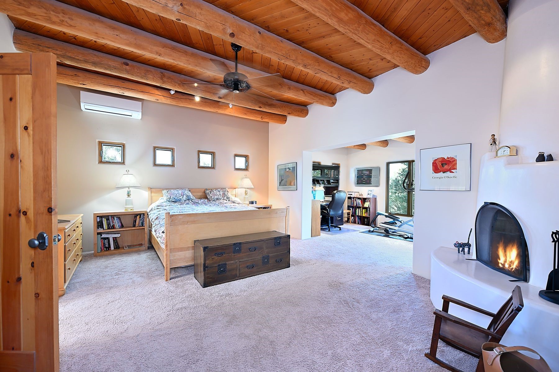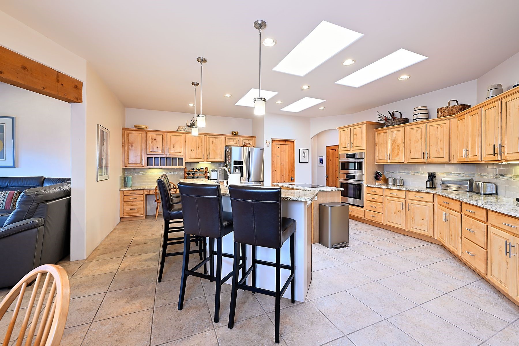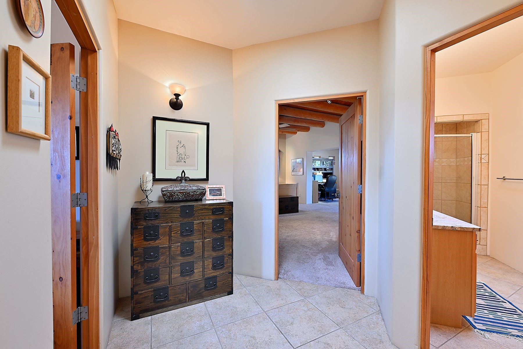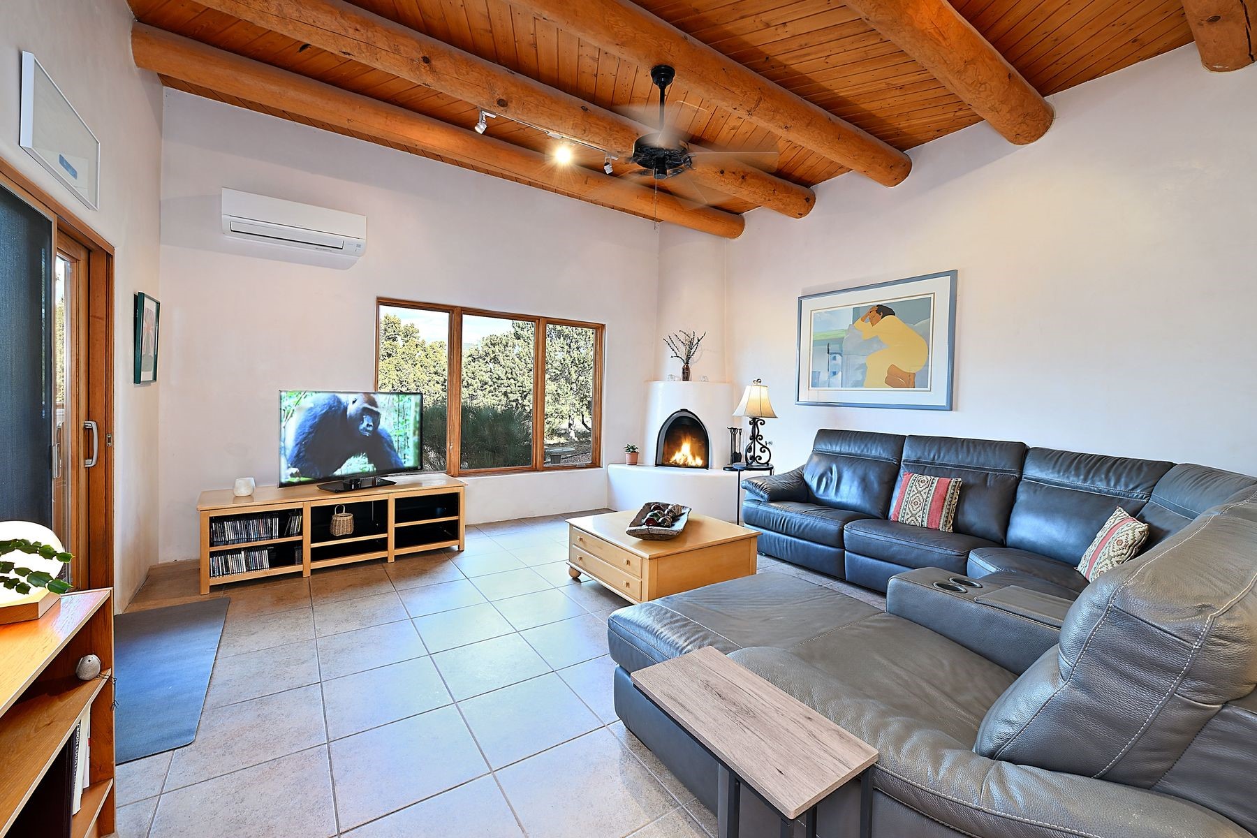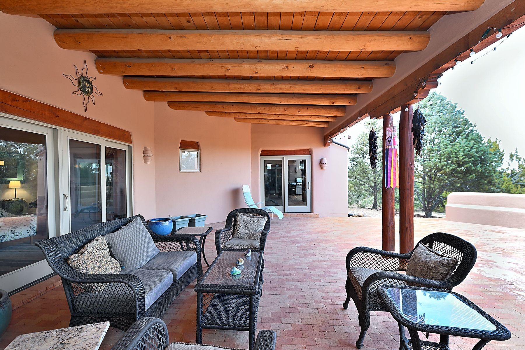 Bright and inviting, this light-filled four-bedroom home in Campos Conejos enjoys a private, quiet spot with spectacular views of the Sangre de Cristos. Plentiful windows, several sets of sliding glass doors, and an enviable portal and patio with a fireplace make the most of the majestic outlook. A central "piano room" and a dedicated dining room offer space for formal gathering and entertaining, while the generous open kitchen and its adjoining family room are destined to be the heart of relaxed day-to-day living. Secluded in the western wing are an owner's suite with a sitting room, a luxurious bath, and two walk-in closets; a guest bedroom or office; and a bright three-quarter bath; two additional bedrooms with a shared bath enjoy the peaceful privacy of the eastern wing of the home. Honey-hued woodwork, stone tile, subdued earth tones, and abundant skylights contribute to a welcoming warmth and an enlivening luster. Other highlights include a spacious laundry room and an oversized three-car garage. The desirable location provides a rare combination of seclusion and easy proximity to a wide variety of attractions and amenities.