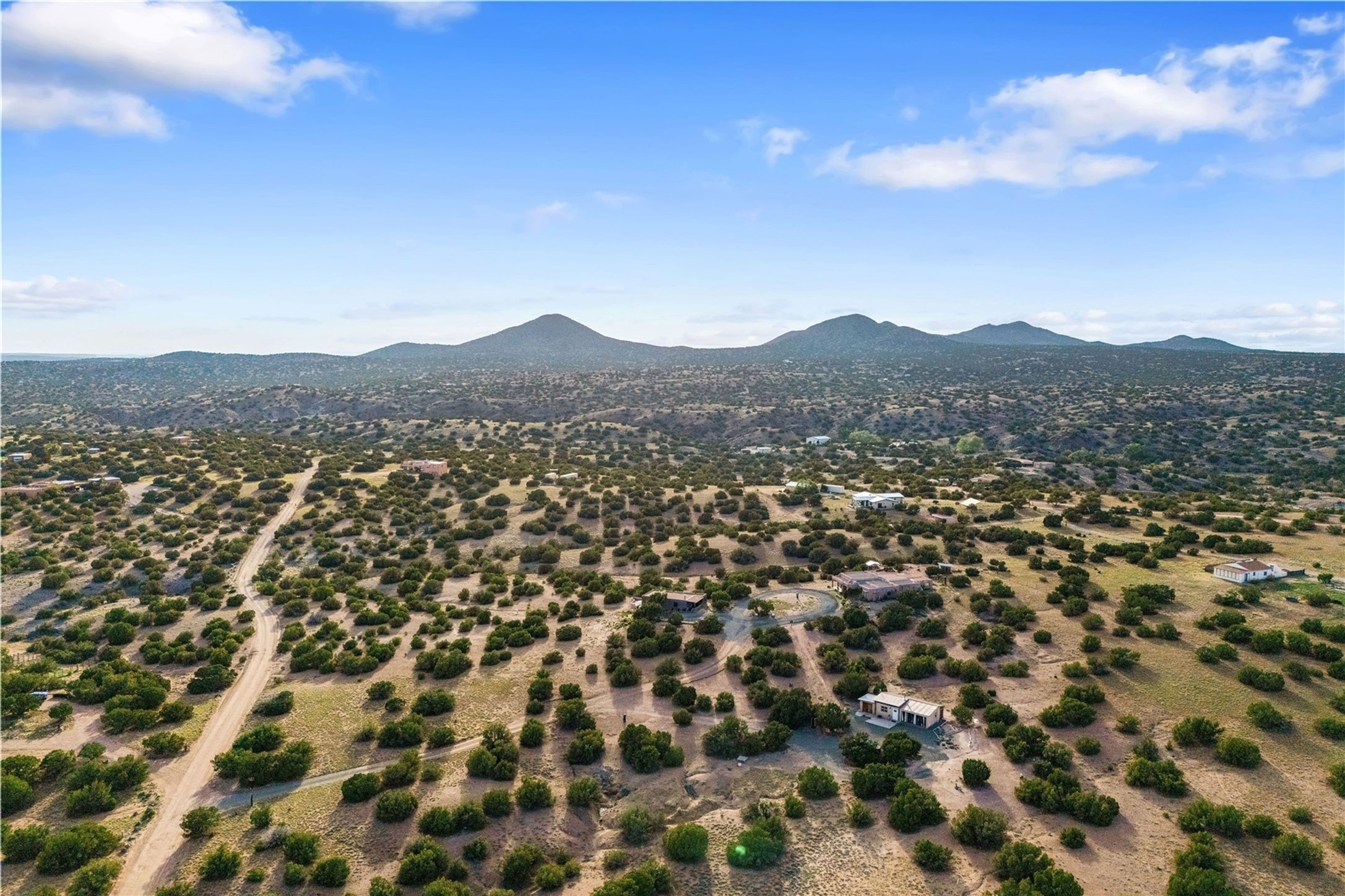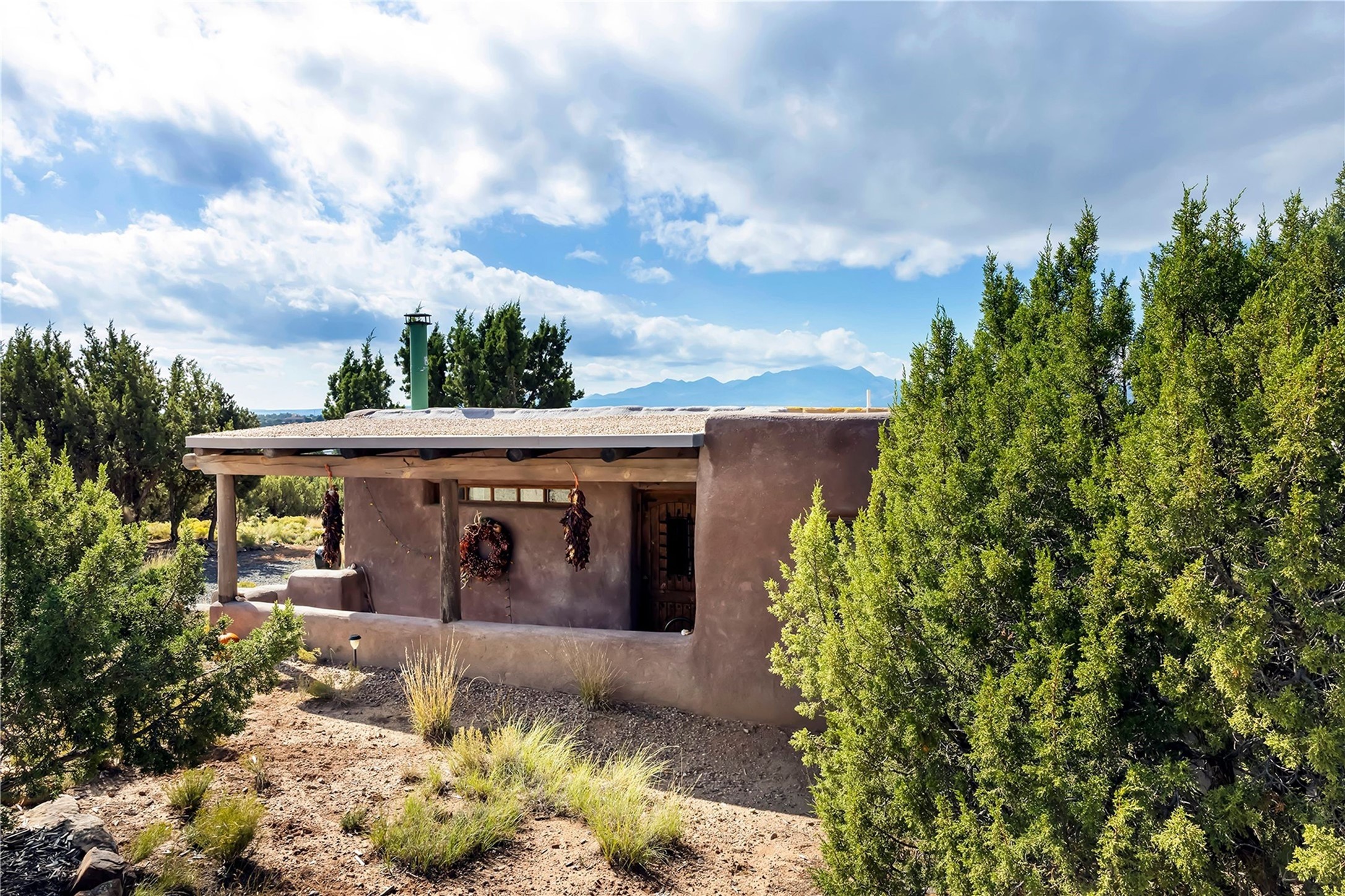 Experience authentic Southwestern living on 12.5 private acres along the historic Turquoise Trail, where panoramic skies, dramatic mountain views, and authentic Santa Fe architecture create a setting that feels both expansive and intimate. Just minutes from Santa Fe, this exceptional property offers a true compound lifestyle with three distinct structures: a two-bedroom, one-bath main residence, a one-bedroom, one-bath guest casita, and a thoughtfully designed studio with dedicated sleeping area and kitchen--ideal for creative pursuits, extended guests, or flexible living. The main home showcases classic Santa Fe craftsmanship with soaring ceilings, massive round vigas, hand-painted Mexican tile, custom wood doors, and hand-forged ironwork. Warm, inviting interiors open effortlessly to multiple patios and portals, creating seamless indoor-outdoor living. Every angle captures sweeping views of surrounding mountain ranges and the endless New Mexico sky--perfect for sunset gatherings, morning coffee, or quiet reflection. The freestanding guest casita offers privacy and comfort, enhanced by multiple outdoor living spaces that frame breathtaking views of the Ortiz Mountains. The nearby studio, filled with natural light, provides inspiring space for artists, writers, or anyone seeking a peaceful retreat. Set on land once part of the ancient San Marcos Pueblo, the property carries a deep sense of history and connection to place. Here, wide-open space, tranquility, and authenticity define daily life--while Santa Fe's renowned dining, galleries, and cultural attractions remain an easy scenic drive away.