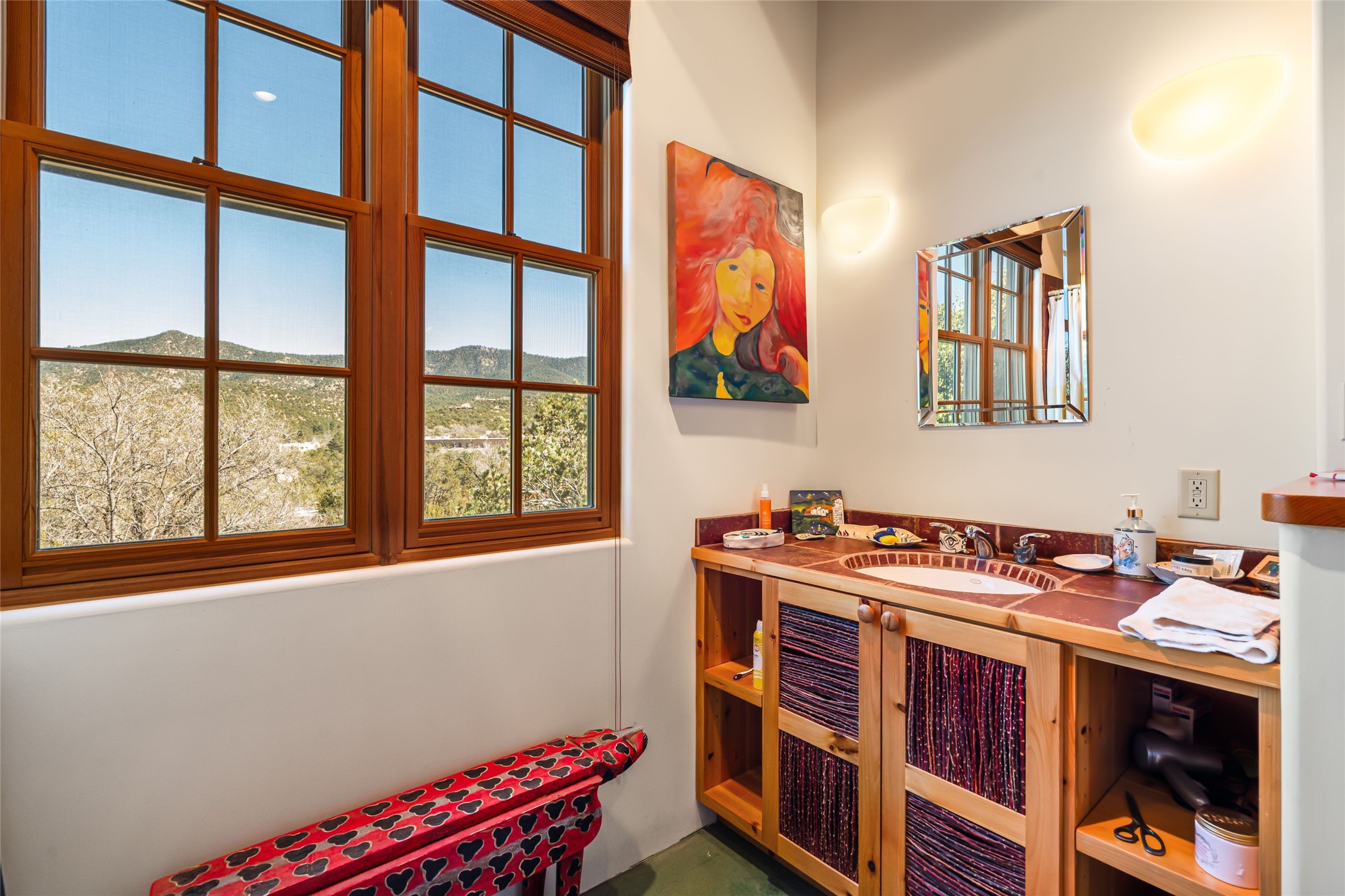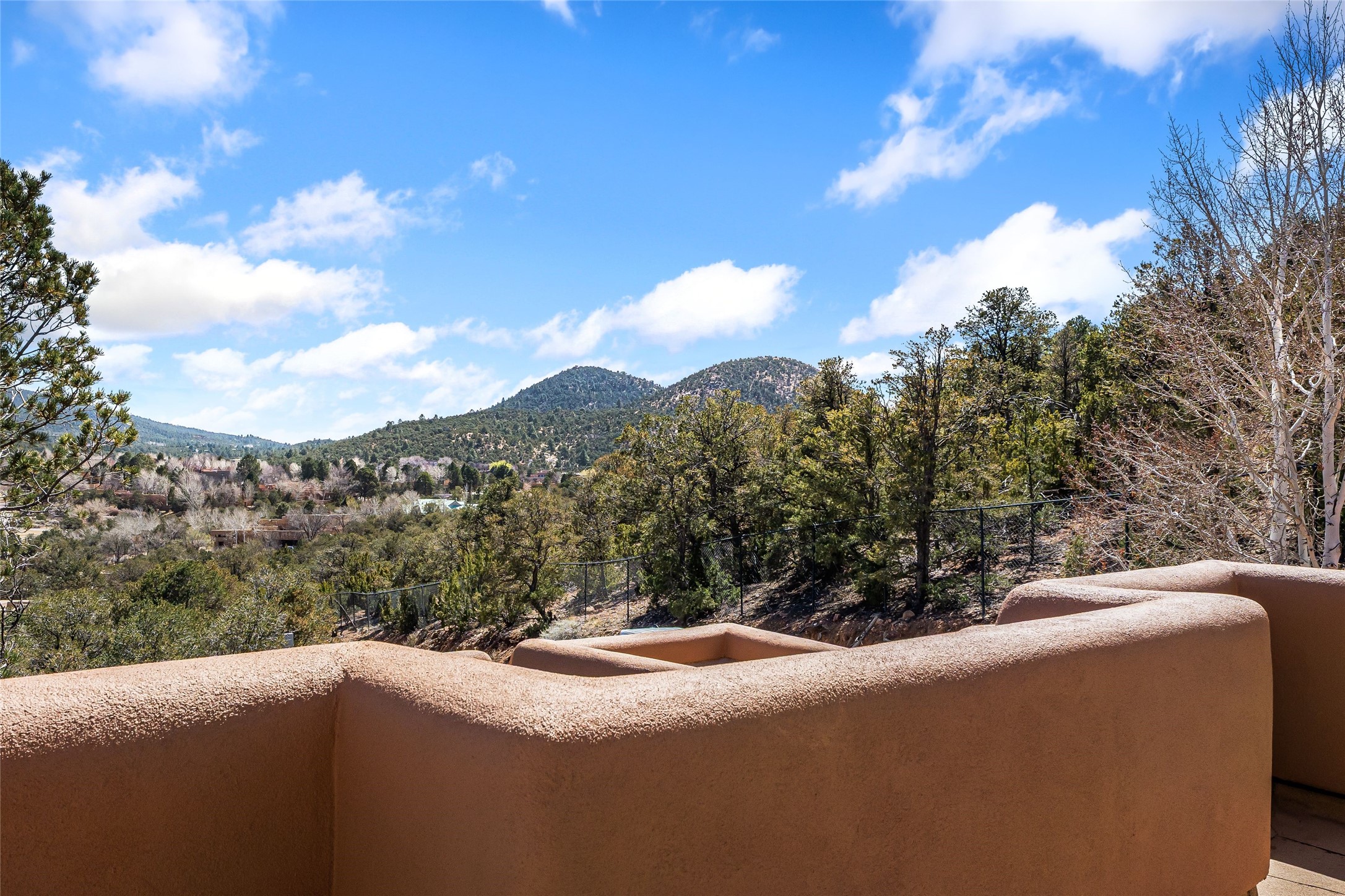 Are you looking for a big view house minutes from Canyon Rd and the Plaza? Villa Bettina is perched on a hillside on over 1.5 acres overlooking Canyon Rd and the Historic Eastside with huge Sangre Mountain views as well as spectacular views of Piccacho, Atalaya, Sun & Moon Mountains out every window! The front entry divides the house between the primary bedroom suite and public living spaces. This custom one-owner home is a rastra build with concrete floors, radiant heat and a beautiful open concept great room for kitchen, living and dining with high ceilings featuring vigas & latillas, a kiva fireplace and numerous French doors opening to the front of the house and covered portal. The covered portal with a kiva fireplace is a wonderful setting to enjoy indoor/outdoor living and to soak up the magnificent views of the mountains and city lights. An efficiently designed kitchen with the best kitchen window view in town, granite counters, breakfast bar, gas stove, Sub Zero fridge and a unique carved lintel with bees and honeycomb is perfectly placed to interact with all the happenings of life in the great room. The primary bedroom suite includes a full bath with river rock enclosed soaking tub and shower, an exercise/spa room with sauna, private South-facing enclosed patio (also accessible from the driveway) and home office. The wooden stairs ascending from the entry foyer feature a hand-crafted metal handrail made by MacArthur Fellow Tom Joyce (as was the hardware on the handcrafted front door) leading up to a guest bedroom, bath, office space and fun, special, secret loft. The guest casita, just down a little walkway from the house is frame and stucco with a full kitchen and bath, plenty of storage, a kiva fireplace in the main living space and a view-filled covered front portal. With a path that leads all around the house and property one can also climb up to the top of the hill for sunset vistas.