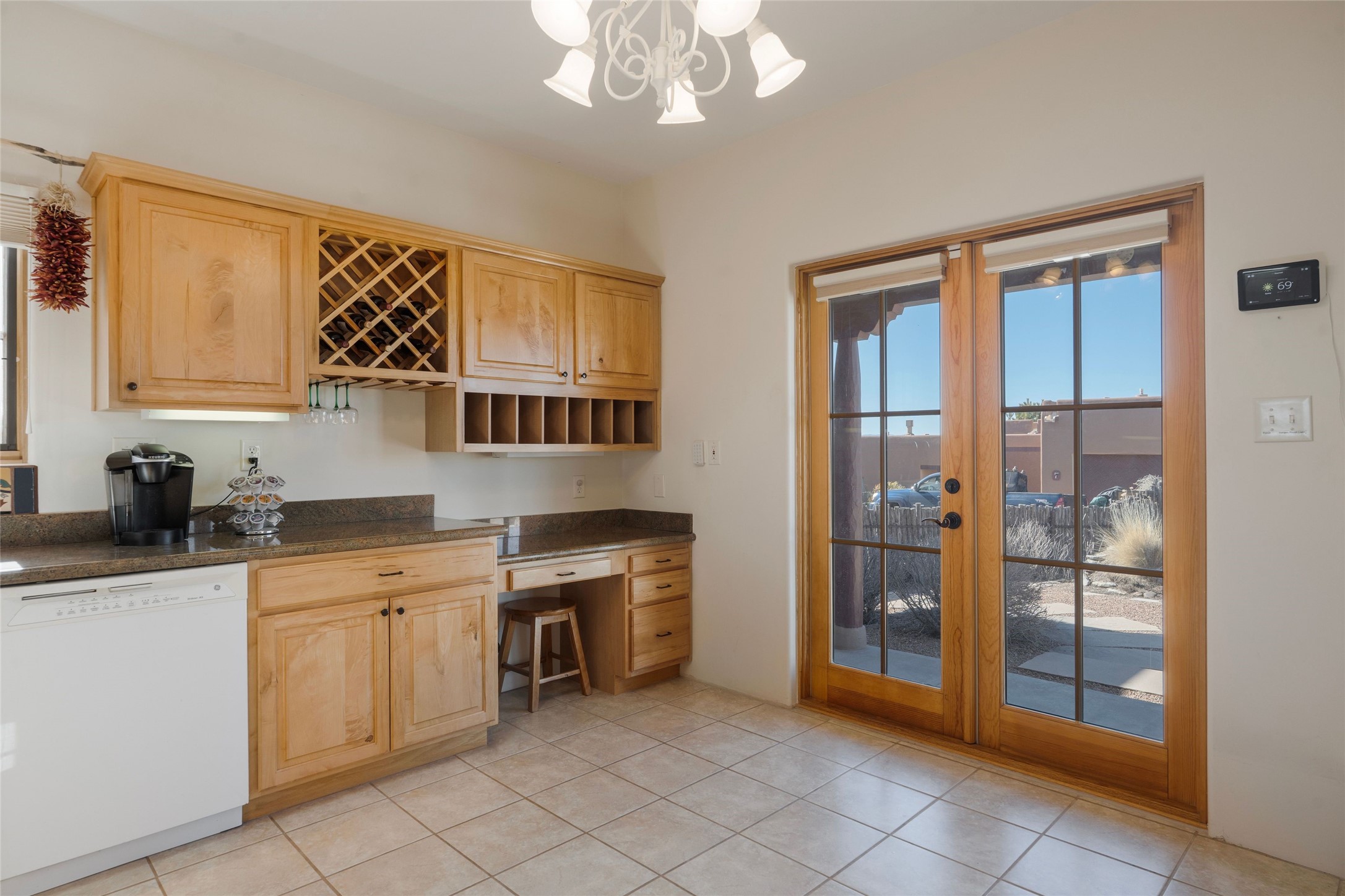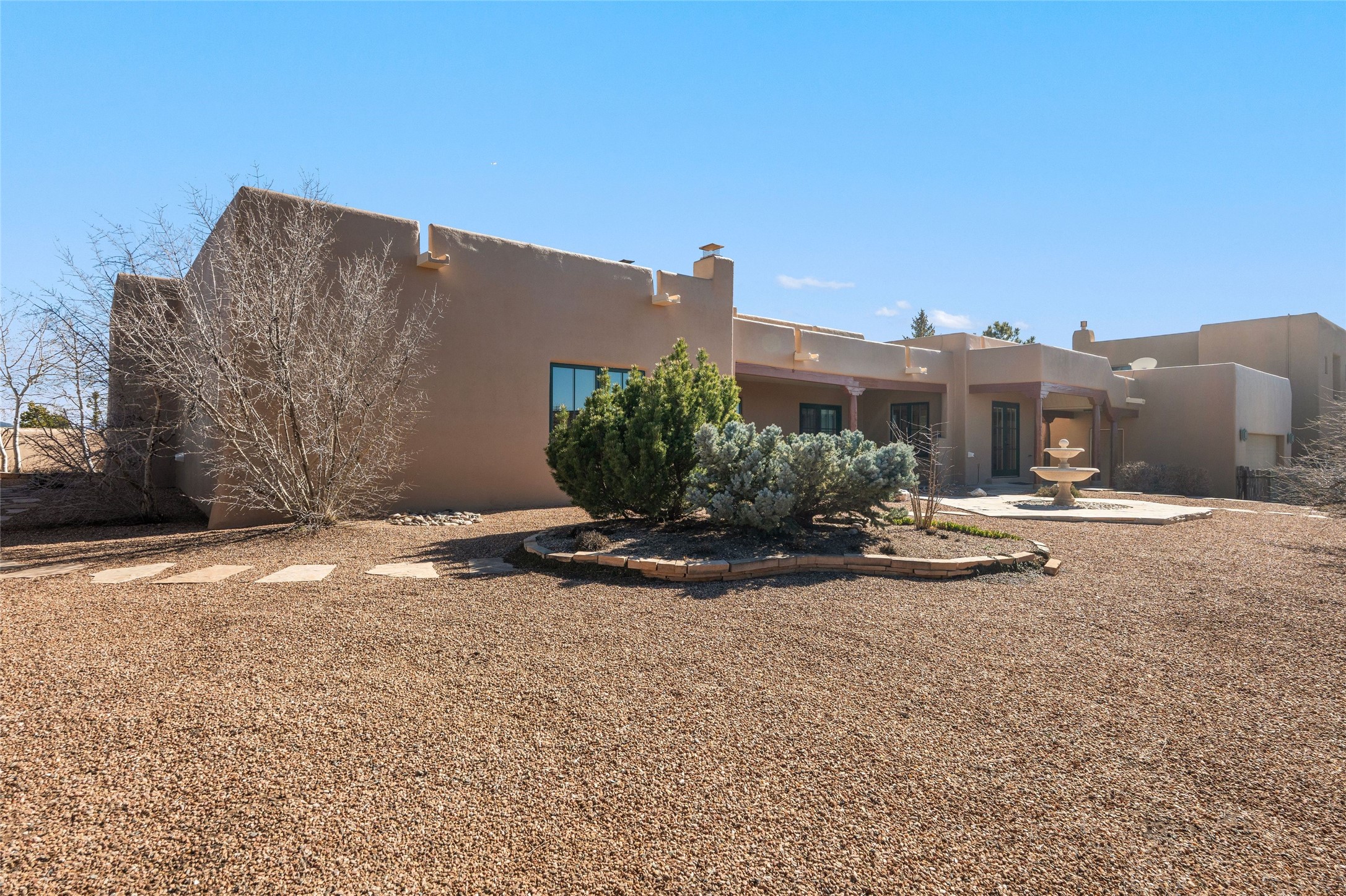 Single level 3-bedroom, 3-bath single level in Aldea, a National Wildlife Federation Certified Wildlife Habitat Community. Sited on a large, walled corner lot with views of the Sangre and Jemez mountains. Home is appointed with plaster walls, nichos, tile in the common living areas, vigas and wood plank ceilings, and 2 kiva fireplaces. Formal dining room has French doors opening to a portal for expanded living and dining. Spacious kitchen with plentiful cabinets. large center island and breakfast area. The primary bedroom has a kiva fireplace, direct access to the back portal and an ensuite bath with a soaking tub and walk in shower. The third bedroom with its built-in desk and bookshelves offers flex space as an office/studio. 2-car detached garage. Aldea is a master- planned community designed and planned by Andres Duany, the "grandfather" of New Urbanism. Residents enjoy 205 acres of open space, walking trails and sports amenities. Conveniently located with easy access to 599 and downtown Santa Fe.