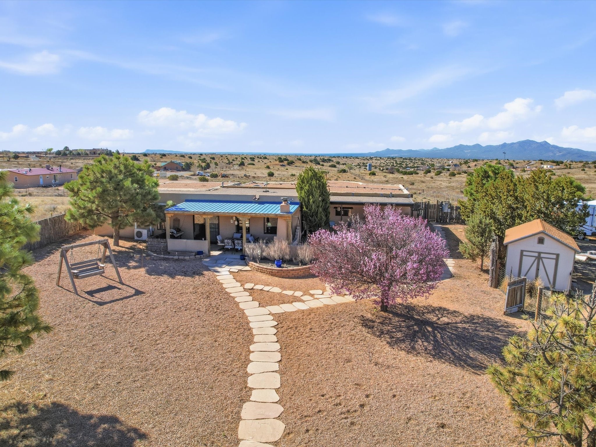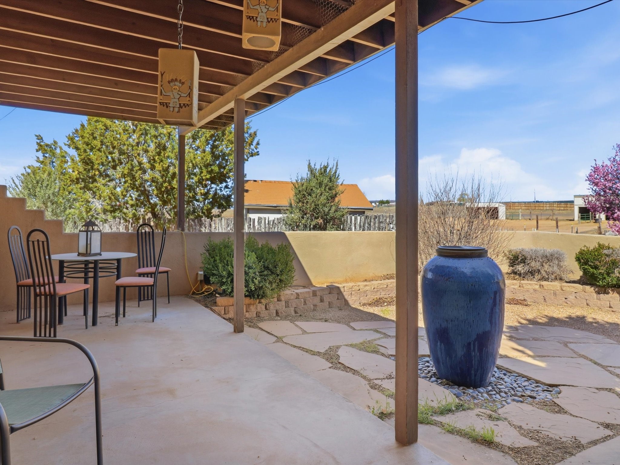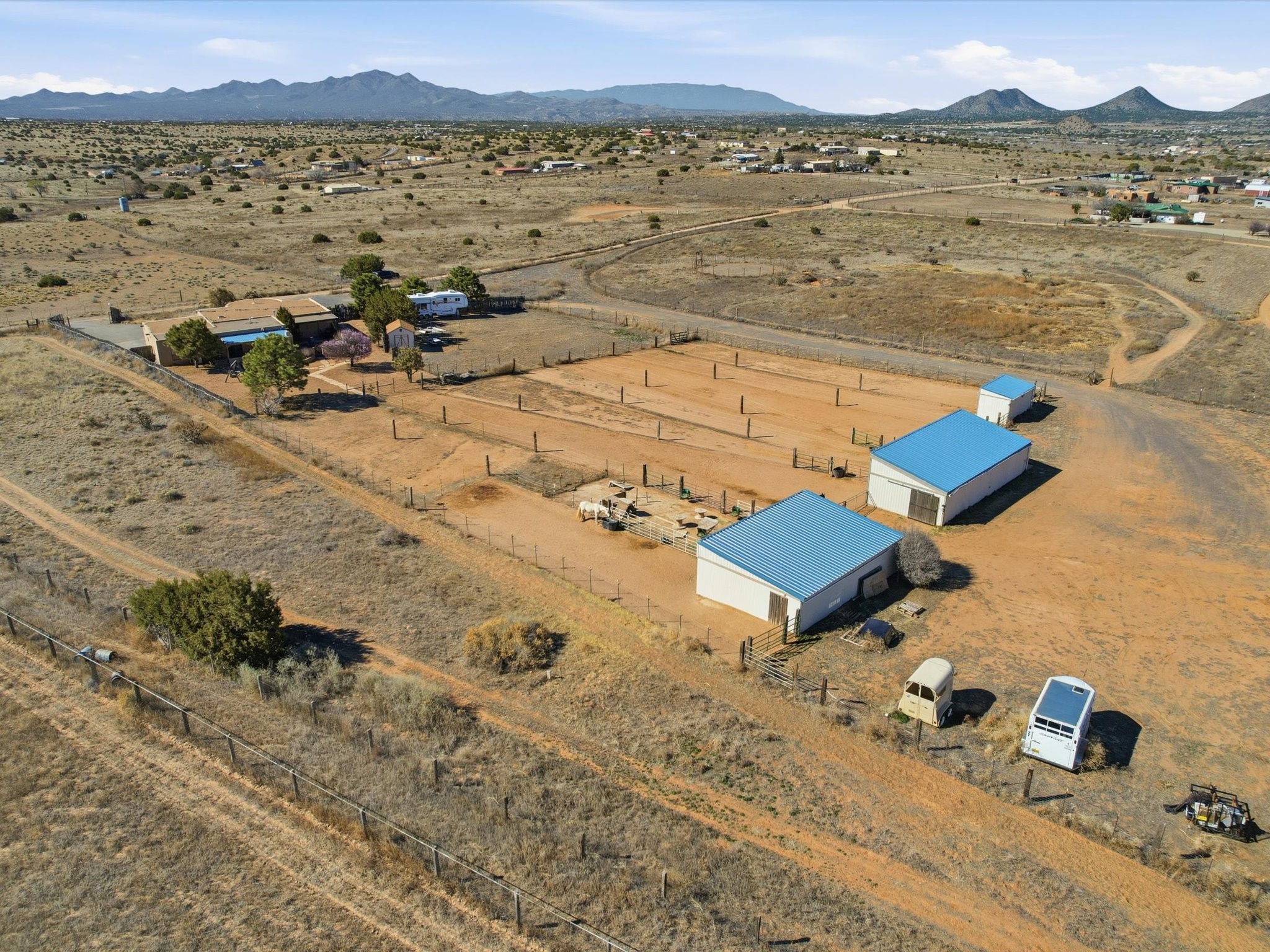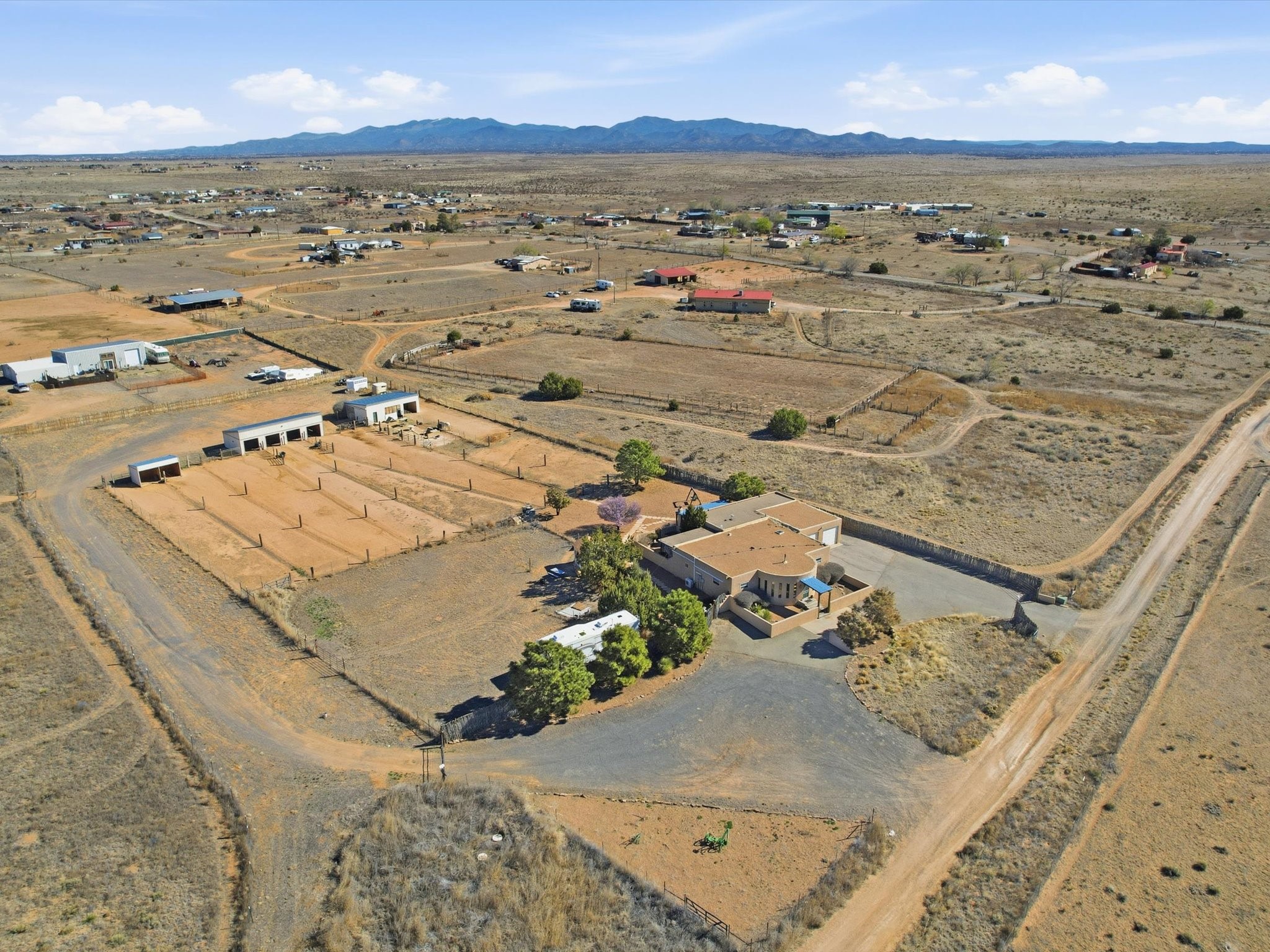 Set on 5.19 fully fenced acres just minutes outside Santa Fe, this Southwestern ranch retreat offers breathtaking sunrises, sunsets, and equally impressive dark night skies. The 4-bedroom, 2-bath single-level home features a light-filled open floor plan, tile and wood flooring, and expansive windows that showcase the surrounding mountain views. The circular Kiva-style living room, with twelve floor-to-ceiling windows, invites natural sunlight and the beauty of Santa Fe inside, while the spacious living area and two master suites provide comfort, privacy, and abundant closet space. Three additional rooms can serve as bedrooms, allowing for a total of five.Two outdoor patios--one with a tranquil water feature and one with a kiva fireplace--offer peaceful escapes year-round, where you can enjoy the many hummingbirds or watch a family of 16 ravens keep the barn animals company. The home seamlessly blends indoor and outdoor living, with large sliding windows in the main living areas letting in fresh mountain breezes.Equestrian enthusiasts will appreciate the three barns (one with a separate tack room), each with water and electricity, capable of hosting up to 12 horses, offering strong income potential from boarding. The nearly 4-acre fully fenced field provides a safe pasture for turnout and includes a 60' round pen for training. Recent updates include an attached insulated two-car garage with shop sink and ample storage, along with covered portals and patios designed for outdoor entertaining and relaxation.With no HOA restrictions, this property provides flexibility for horse lovers, hobbyists, and families seeking a peaceful retreat. Just minutes from Santa Fe's shopping, dining, and amenities, this well-maintained home is a bright, spacious ranch haven that captures the quintessential Santa Fe lifestyle--mountain views, abundant wildlife, and serene open spaces.