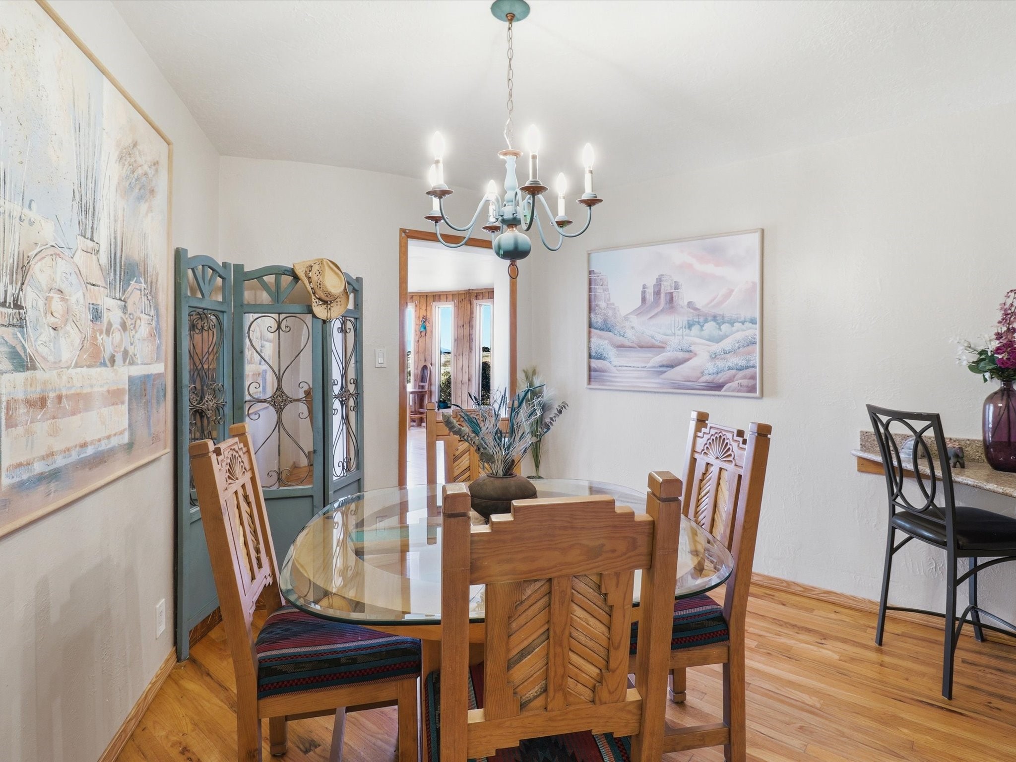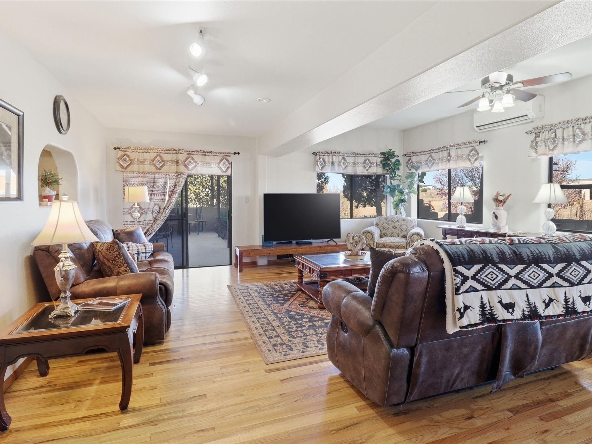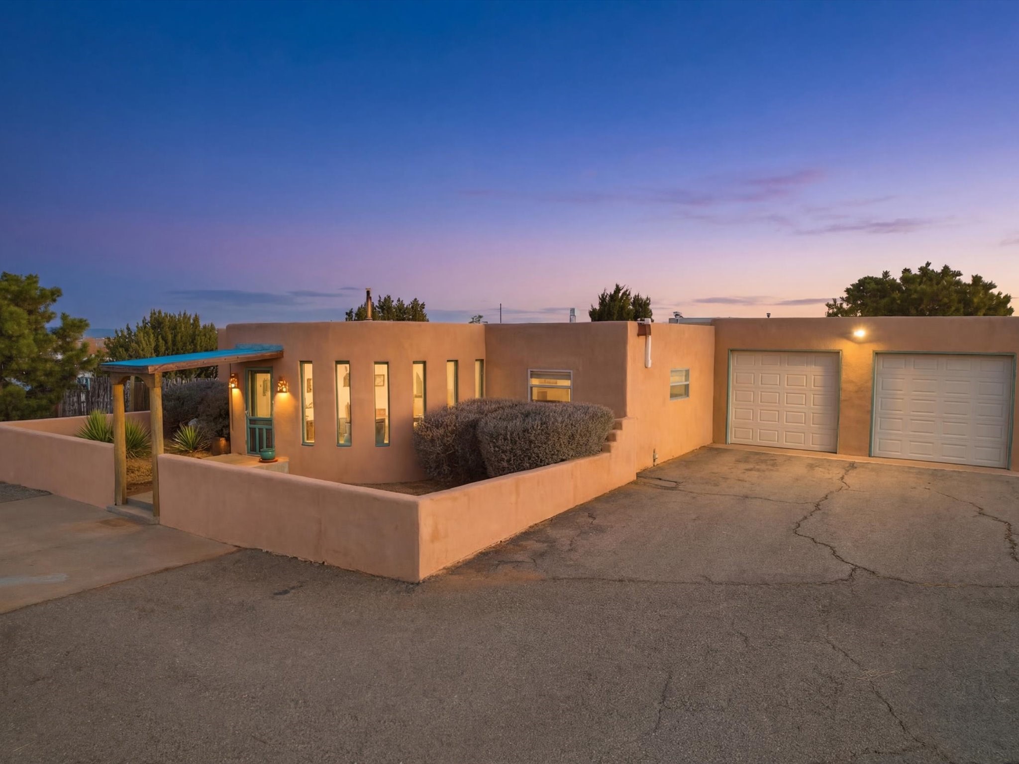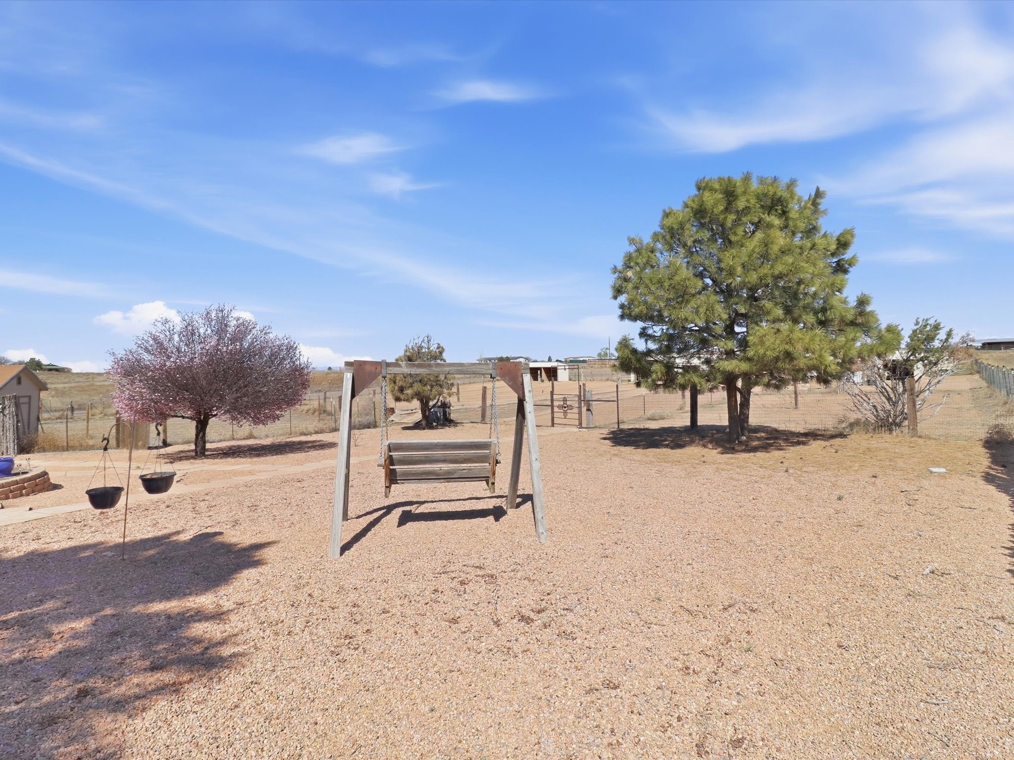 Set on 5.19 fully fenced acres just minutes outside Santa Fe, this Southwestern ranch retreat offers breathtaking sunrises, sunsets, and equally impressive dark night skies. The 4-bedroom, 2-bath single-level home features a light-filled open floor plan, tile and wood flooring, and expansive windows that showcase the surrounding mountain views. The circular Kiva-style living room, with twelve floor-to-ceiling windows, invites natural sunlight and the beauty of Santa Fe inside, while the spacious living area and two master suites provide comfort, privacy, and abundant closet space. Three additional rooms can serve as bedrooms, allowing for a total of five.Two outdoor patios--one with a tranquil water feature and one with a kiva fireplace--offer peaceful escapes year-round, where you can enjoy the many hummingbirds or watch a family of 16 ravens keep the barn animals company. The home seamlessly blends indoor and outdoor living, with large sliding windows in the main living areas letting in fresh mountain breezes.Equestrian enthusiasts will appreciate the three barns (one with a separate tack room), each with water and electricity, capable of hosting up to 12 horses, offering strong income potential from boarding. The nearly 4-acre fully fenced field provides a safe pasture for turnout and includes a 60' round pen for training. Recent updates include an attached insulated two-car garage with shop sink and ample storage, along with covered portals and patios designed for outdoor entertaining and relaxation.With no HOA restrictions, this property provides flexibility for horse lovers, hobbyists, and families seeking a peaceful retreat. Just minutes from Santa Fe's shopping, dining, and amenities, this well-maintained home is a bright, spacious ranch haven that captures the quintessential Santa Fe lifestyle--mountain views, abundant wildlife, and serene open spaces.