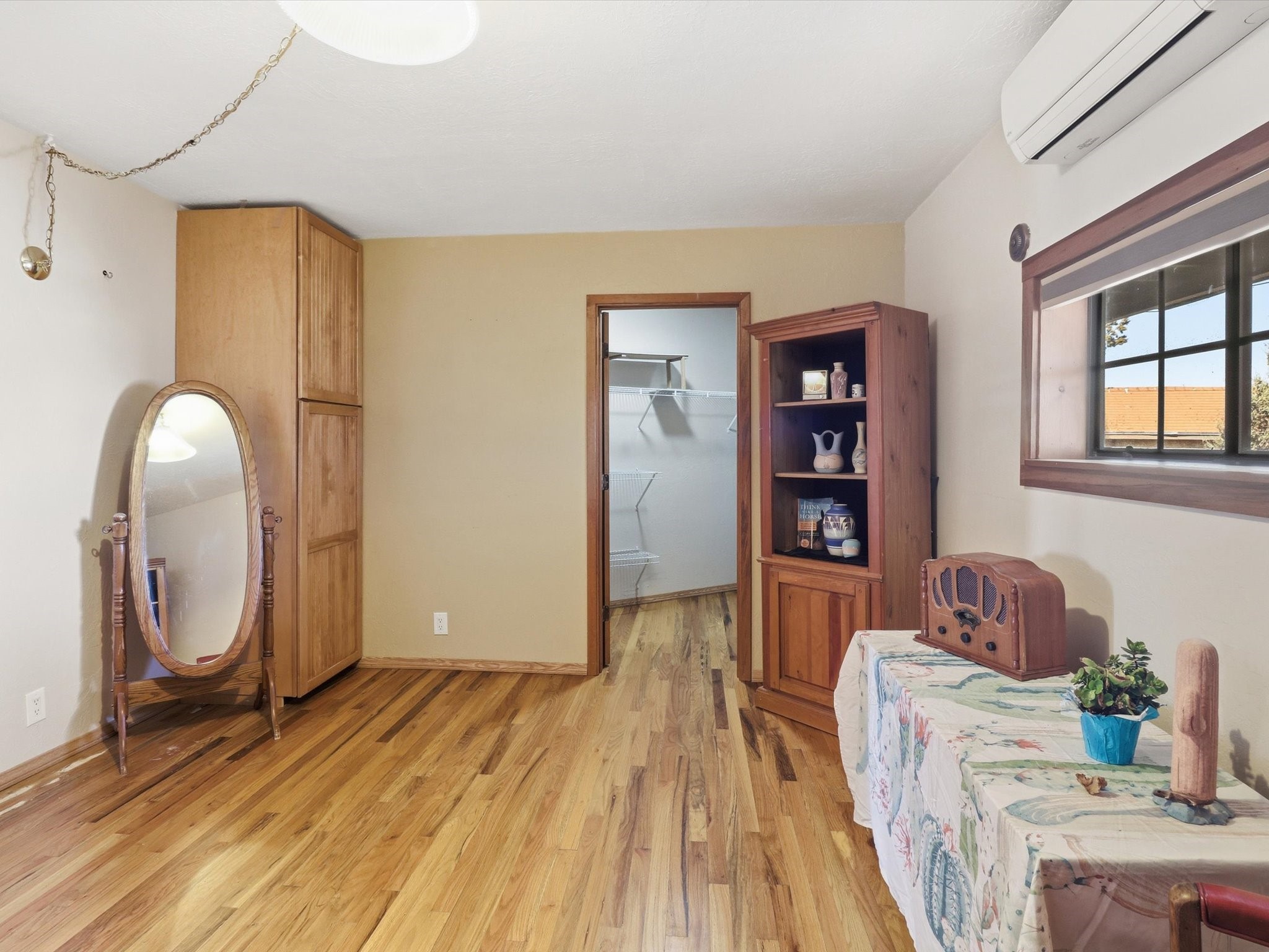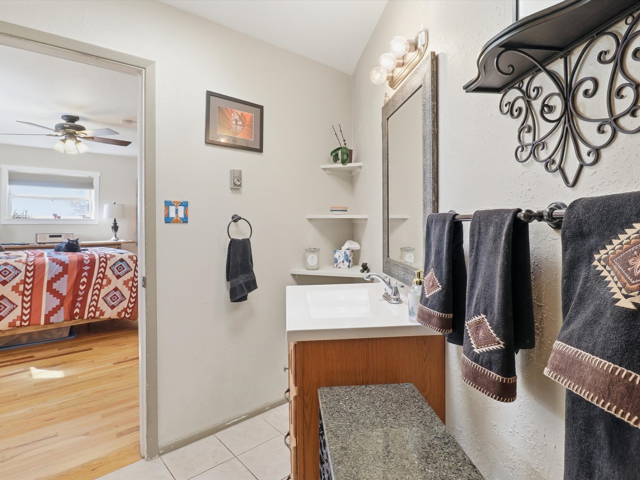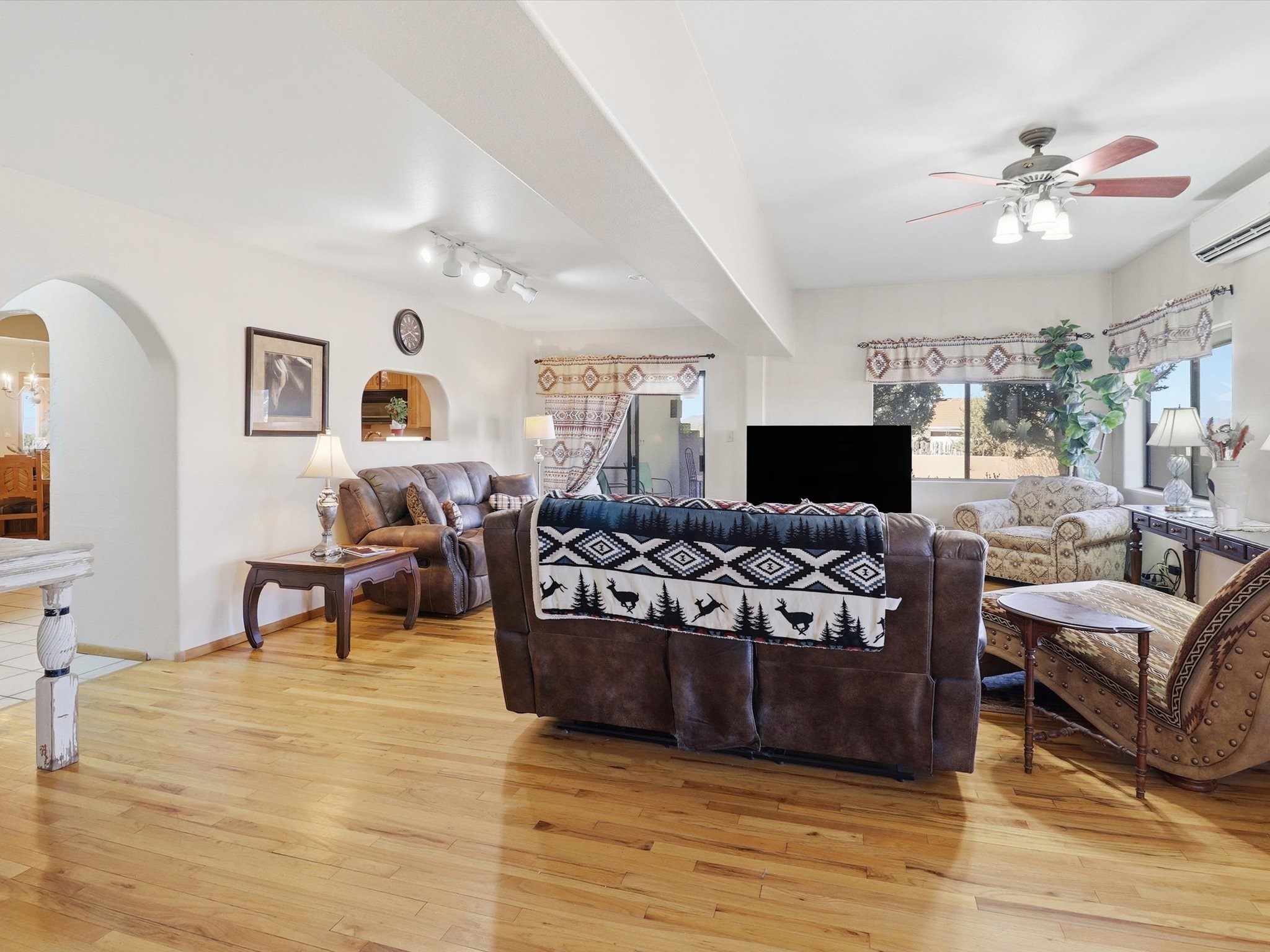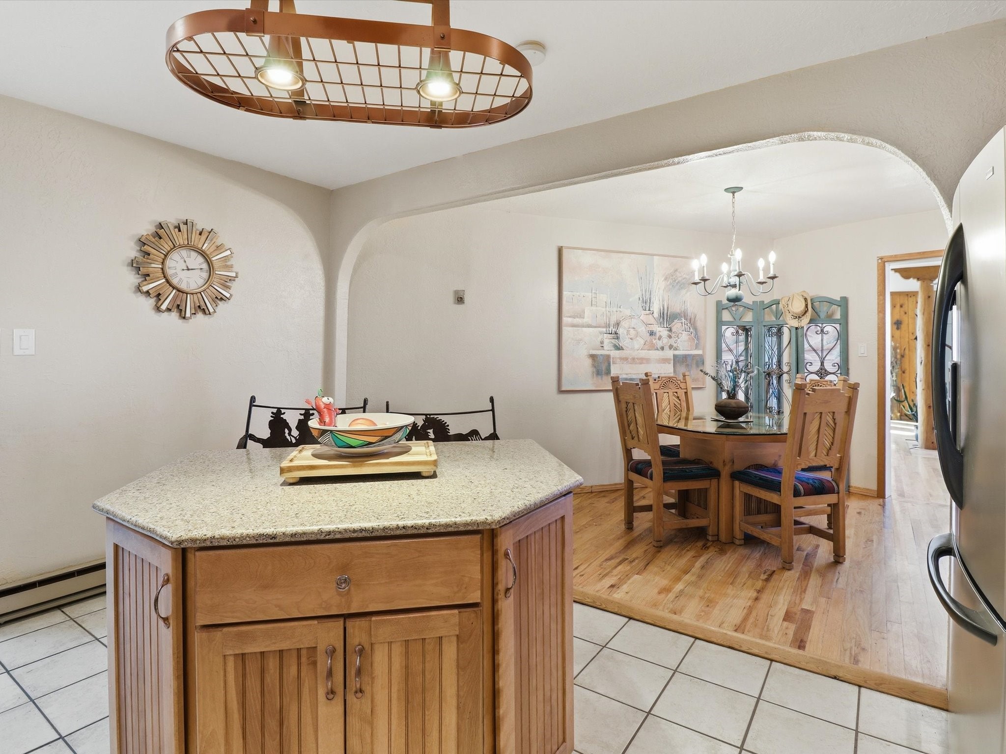 Set on 5.19 fully fenced acres just minutes outside Santa Fe, this Southwestern ranch retreat offers breathtaking sunrises, sunsets, and equally impressive dark night skies. The 4-bedroom, 2-bath single-level home features a light-filled open floor plan, tile and wood flooring, and expansive windows that showcase the surrounding mountain views. The circular Kiva-style living room, with twelve floor-to-ceiling windows, invites natural sunlight and the beauty of Santa Fe inside, while the spacious living area and two master suites provide comfort, privacy, and abundant closet space. Three additional rooms can serve as bedrooms, allowing for a total of five.Two outdoor patios--one with a tranquil water feature and one with a kiva fireplace--offer peaceful escapes year-round, where you can enjoy the many hummingbirds or watch a family of 16 ravens keep the barn animals company. The home seamlessly blends indoor and outdoor living, with large sliding windows in the main living areas letting in fresh mountain breezes.Equestrian enthusiasts will appreciate the three barns (one with a separate tack room), each with water and electricity, capable of hosting up to 12 horses, offering strong income potential from boarding. The nearly 4-acre fully fenced field provides a safe pasture for turnout and includes a 60' round pen for training. Recent updates include an attached insulated two-car garage with shop sink and ample storage, along with covered portals and patios designed for outdoor entertaining and relaxation.With no HOA restrictions, this property provides flexibility for horse lovers, hobbyists, and families seeking a peaceful retreat. Just minutes from Santa Fe's shopping, dining, and amenities, this well-maintained home is a bright, spacious ranch haven that captures the quintessential Santa Fe lifestyle--mountain views, abundant wildlife, and serene open spaces.