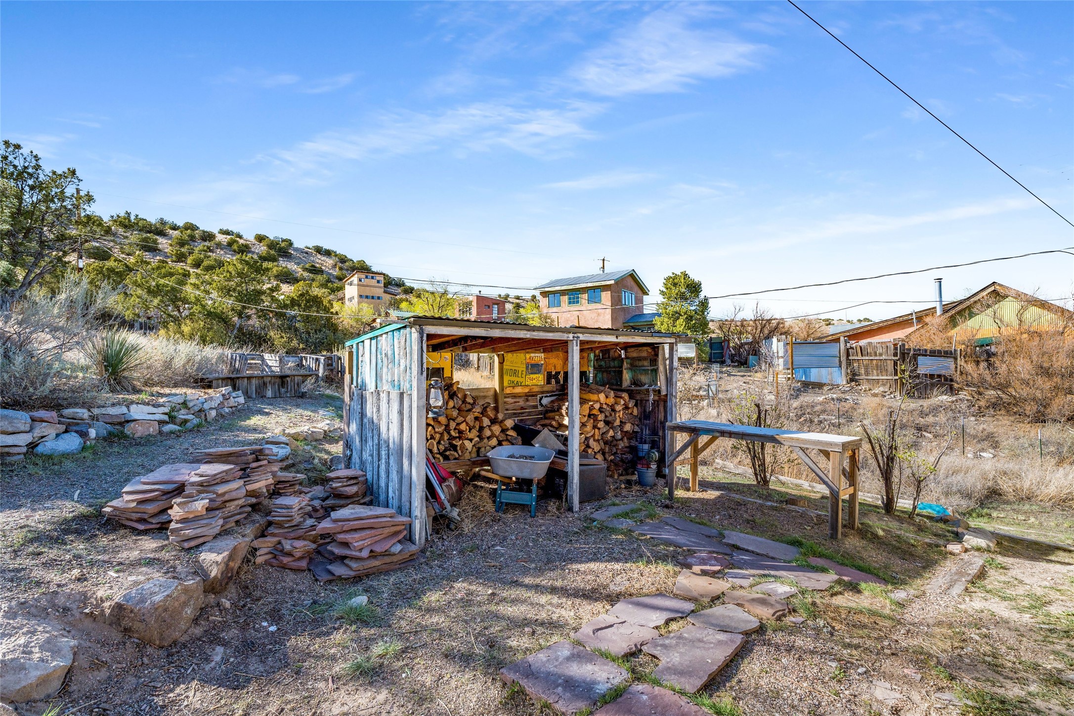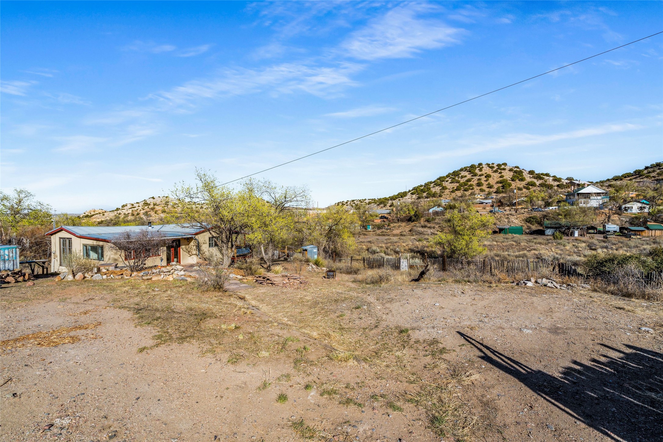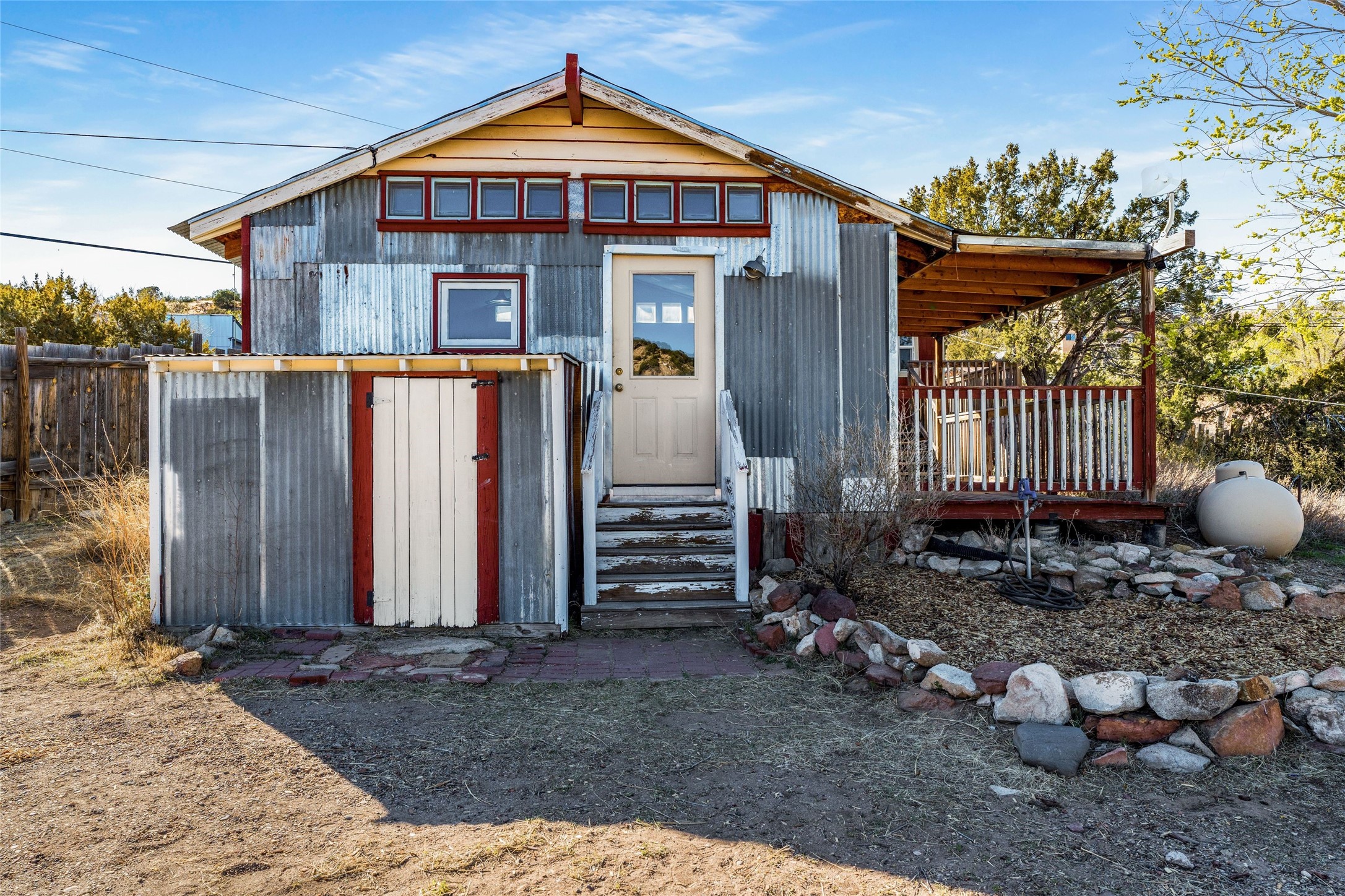 Nestled on an oversized lot bordering the town greenbelt, this beautifully updated Madrid cabin blends historic character with thoughtful modern enhancements. The expanded country kitchen is a true centerpiece, featuring open shelving, butcher-block counters, and a generous center island ideal for gourmet cooking and entertaining. The updated bathroom offers a luxurious soaking tub, and much of the home's original hardwood flooring has been lovingly preserved. A heated sunroom provides a bright, welcoming living space, while one of the bedrooms showcases classic English wainscoting that adds to the home's timeless charm. The main bedroom opens onto a private porch overlooking the greenbelt--an ideal spot for morning coffee or evening relaxation. The property also includes a versatile detached studio complete with a sink, woodstove, private porch, and an additional bathroom ready for activation. Perfect for artists, guests, or a home office. Outside, enjoy views of the Sangre de Cristo Mountains from the landscaped yard, with direct access to the greenbelt leading to a 40-acre county open space--perfect for hiking and exploring. Residents of Madrid also share ownership of the historic Madrid Ballpark, the first lighted ballpark in North America and still a vibrant hub for community events and tournaments. Located within easy walking distance of Madrid's general store, restaurants, coffee shop, and galleries, this home offers a rare blend of privacy, character, and walkable village living. Convenient access to both Albuquerque and Santa Fe completes the package, making this a truly special opportunity in the heart of Madrid.