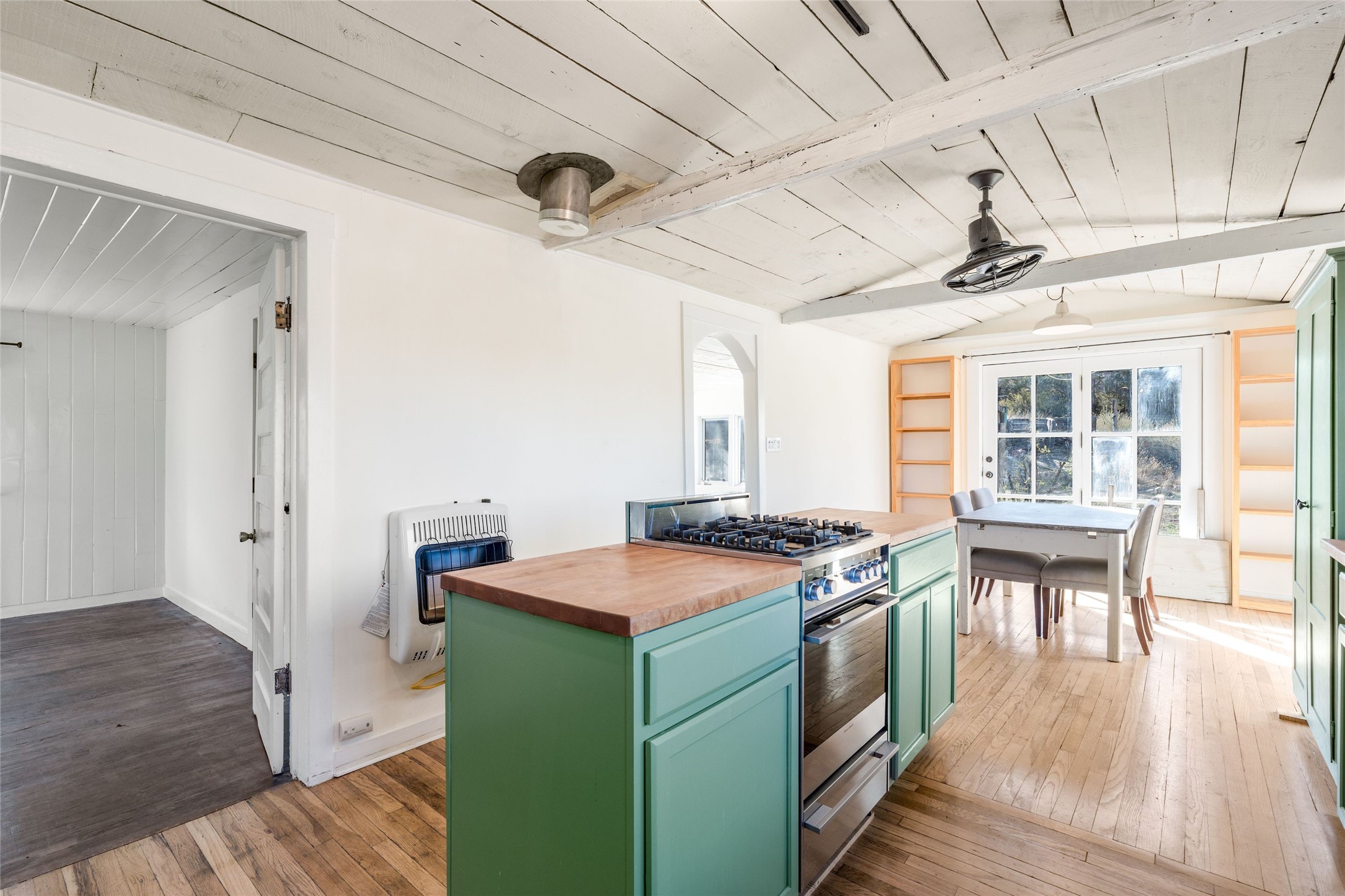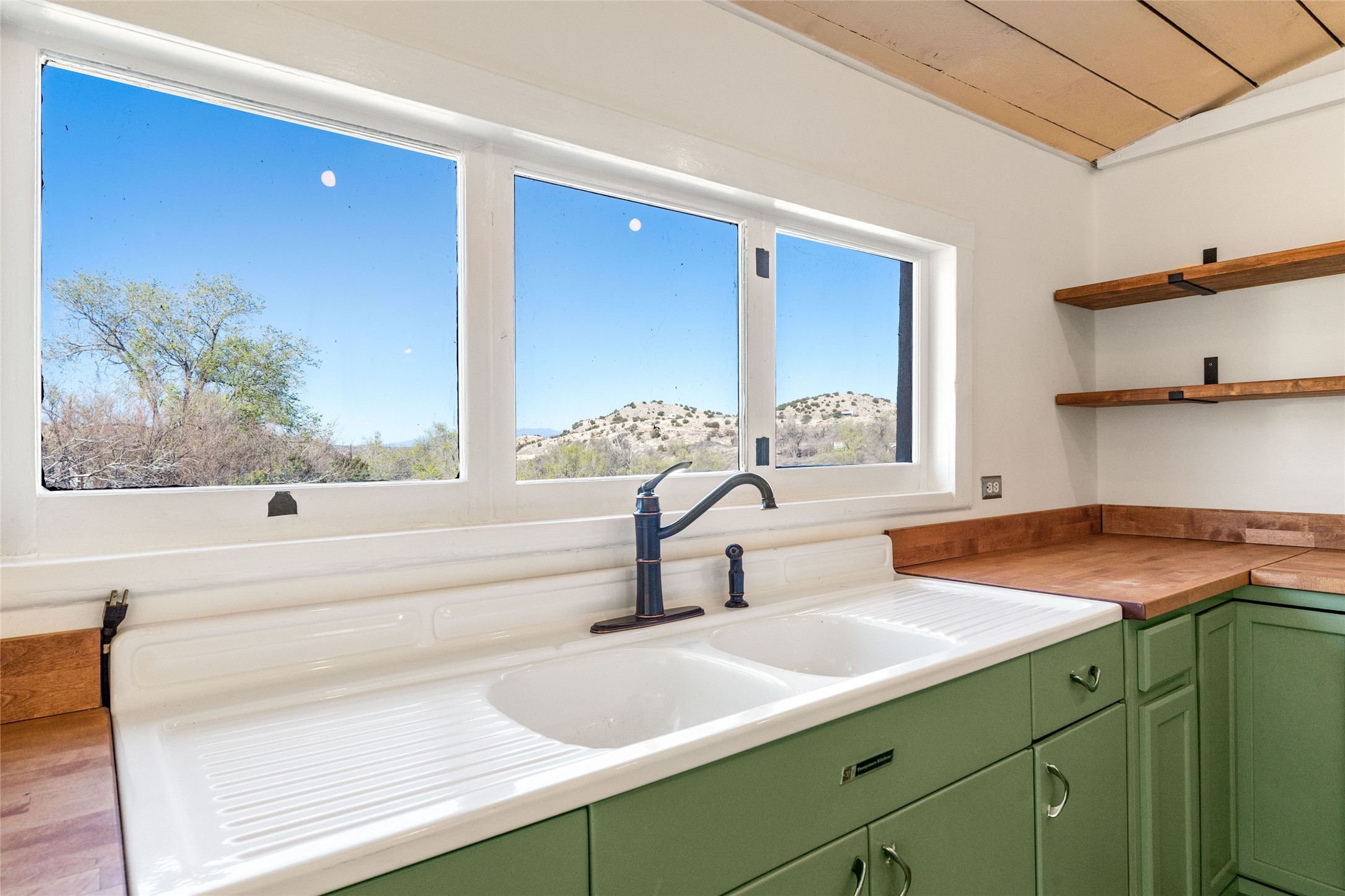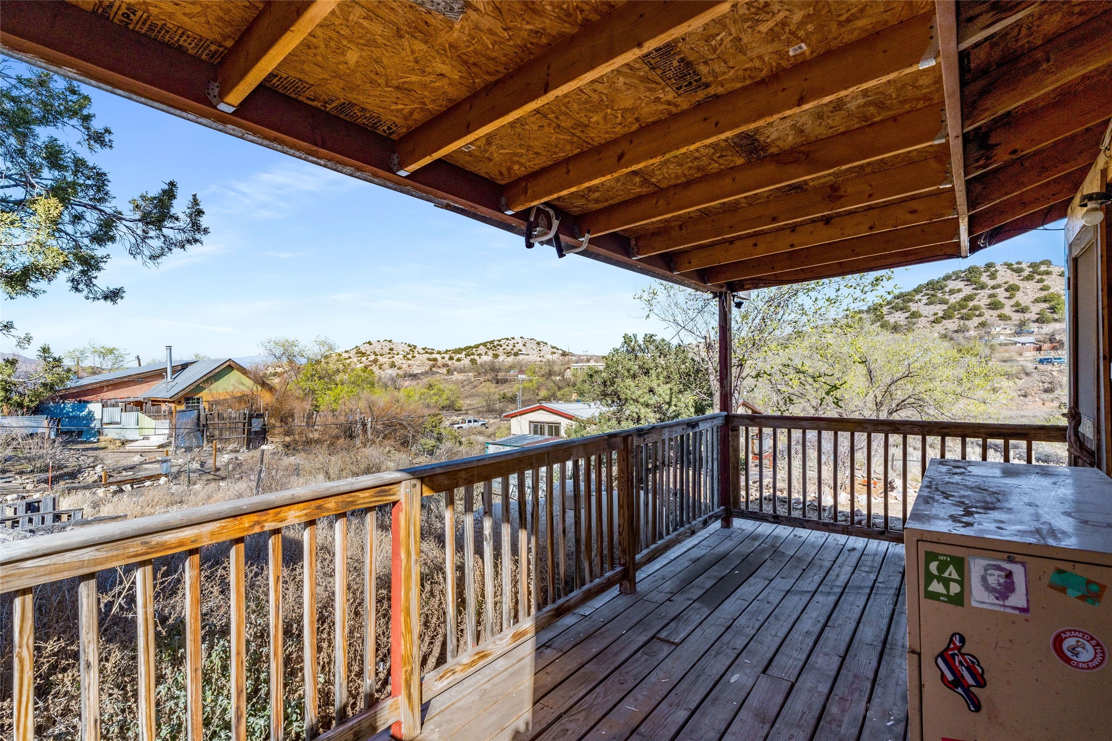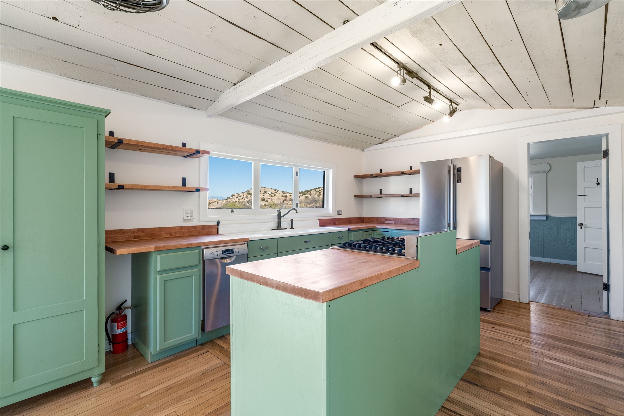 Nestled on an oversized lot bordering the town greenbelt, this beautifully updated Madrid cabin blends historic character with thoughtful modern enhancements. The expanded country kitchen is a true centerpiece, featuring open shelving, butcher-block counters, and a generous center island ideal for gourmet cooking and entertaining. The updated bathroom offers a luxurious soaking tub, and much of the home's original hardwood flooring has been lovingly preserved. A heated sunroom provides a bright, welcoming living space, while one of the bedrooms showcases classic English wainscoting that adds to the home's timeless charm. The main bedroom opens onto a private porch overlooking the greenbelt--an ideal spot for morning coffee or evening relaxation. The property also includes a versatile detached studio complete with a sink, woodstove, private porch, and an additional bathroom ready for activation. Perfect for artists, guests, or a home office. Outside, enjoy views of the Sangre de Cristo Mountains from the landscaped yard, with direct access to the greenbelt leading to a 40-acre county open space--perfect for hiking and exploring. Residents of Madrid also share ownership of the historic Madrid Ballpark, the first lighted ballpark in North America and still a vibrant hub for community events and tournaments. Located within easy walking distance of Madrid's general store, restaurants, coffee shop, and galleries, this home offers a rare blend of privacy, character, and walkable village living. Convenient access to both Albuquerque and Santa Fe completes the package, making this a truly special opportunity in the heart of Madrid.