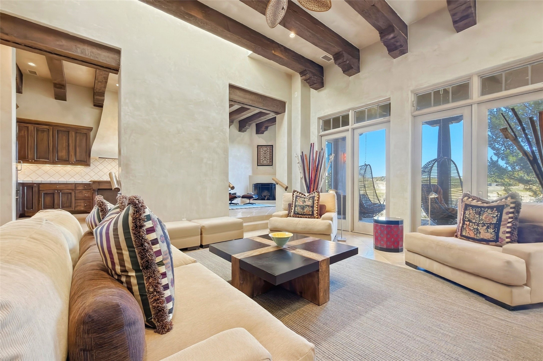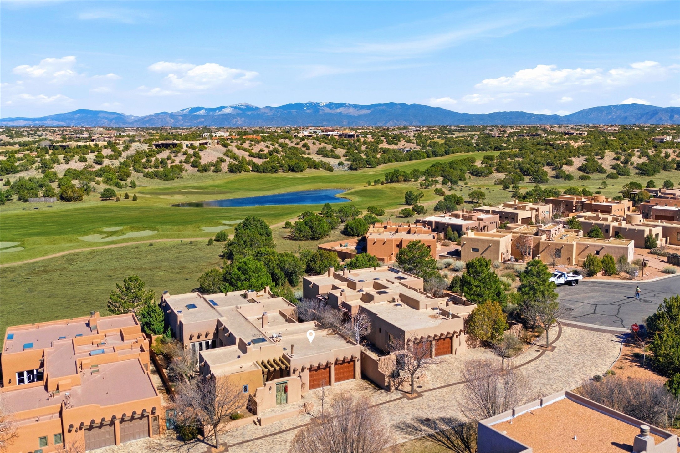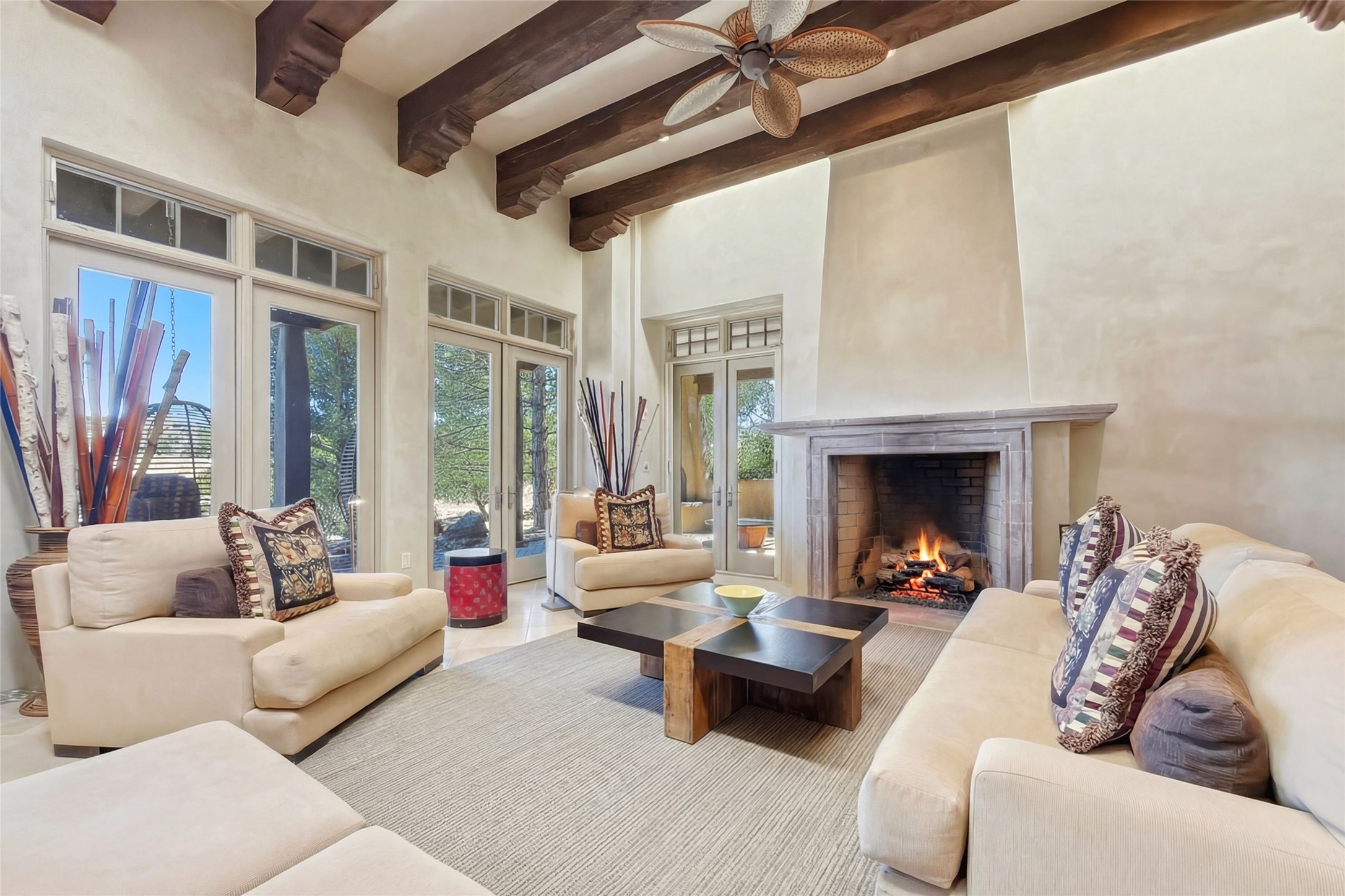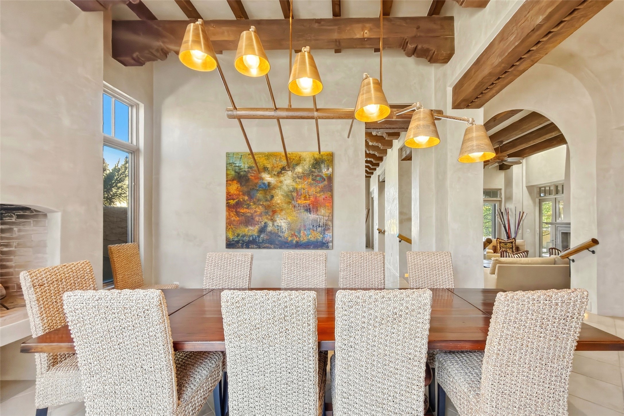 Expansive golf course views set the stage for this light-filled Las Campanas jewel. Setbehind a gated entrance with 24-hr security, the home welcomes you with a beautifullycrafted brick driveway that opens into a private, inviting courtyard. Offering 3 spaciousbedrooms and 3.5 baths, this thoughtfully designed home balances comfort, eleganceand privacy. Inside, travertine tile flows throughout complemented by brilliant diamondplaster walls, striking beams and graceful arched hallways that add architectural depthand character. The living room is a true showpiece, anchored by a grand wood-burningfireplace and framed by expansive patio doors that flood the space with natural lightwhile seamlessly blending indoor and outdoor living. 14 ft. ceilings and 16 skylightsthroughout the home further enhance its bright and airy ambiance. Designed foreveryday living and entertaining, the kitchen features granite countertops, luxurycabinetry, Wolf oven/stove, Sub-Zero refrigerator, a large island with seating and built-inwine storage. Adjacent is a formal dining area with outside access, dramatic lighting anda decorative fireplace. Each bedroom serves as a private retreat featuring its ownfireplace and direct patio access, creating a seamless connection to the outdoors. Theprimary suite is especially indulgent, offering a spa-like bathroom with a fireplace,oversized soaking tub and separate shower. Outdoor living is equally impressive withmultiple areas to enjoy Santa Fe's stunning climate. With eight fireplaces, timelessarchitectural details and a layout that offers both openness and separation, thisremarkable home delivers refined living in one of Santa Fe's most sought-aftercommunities.