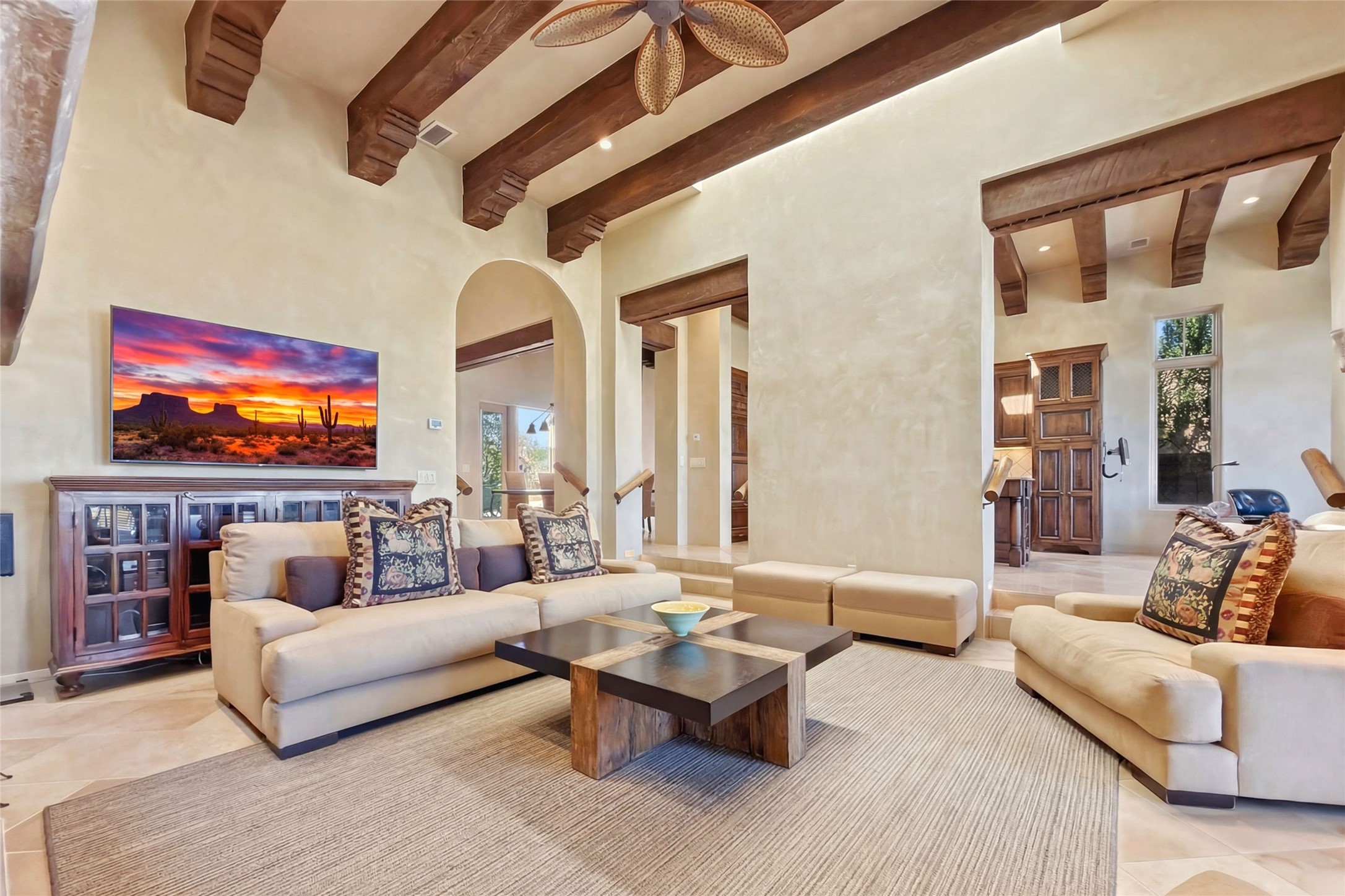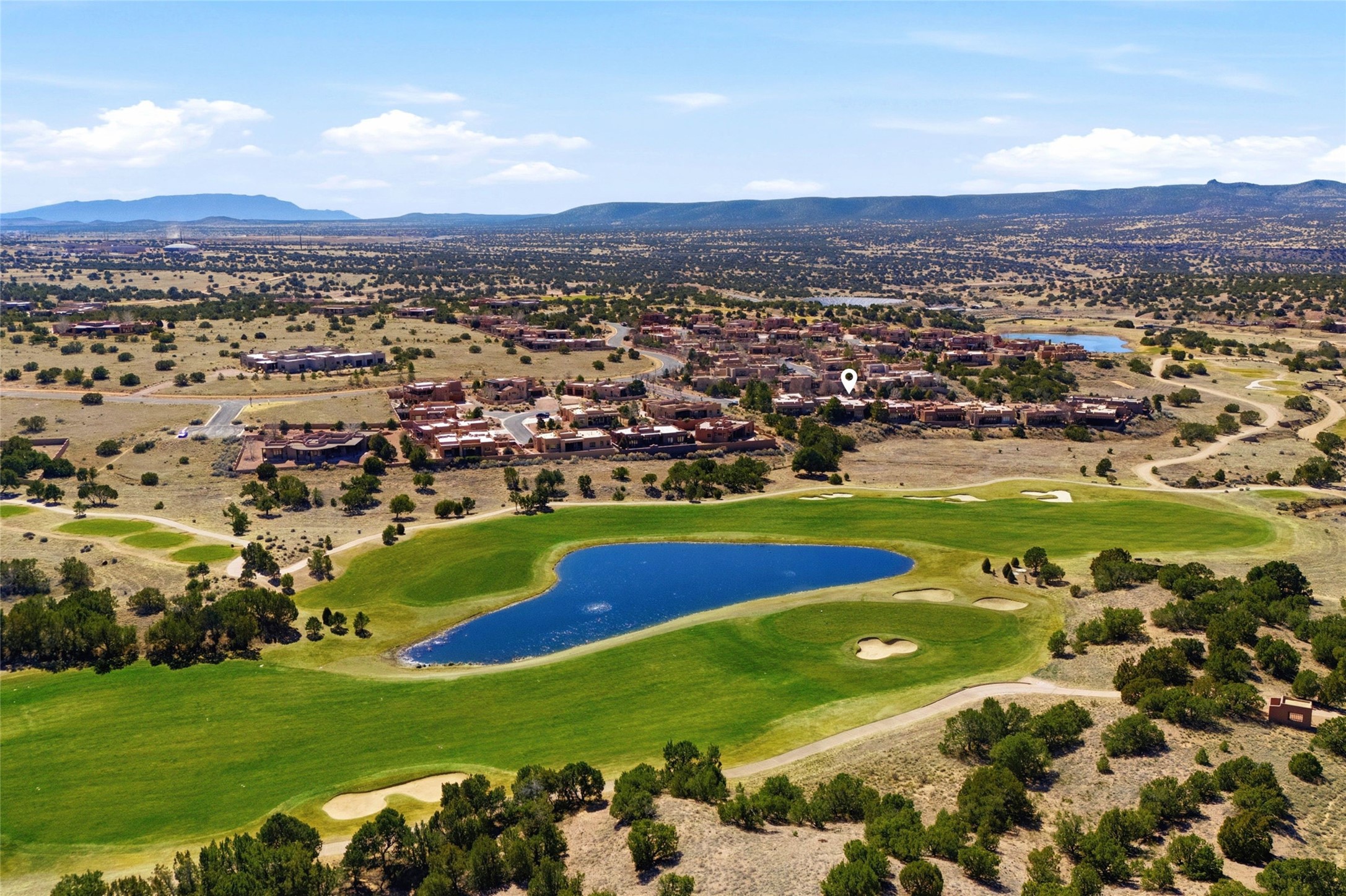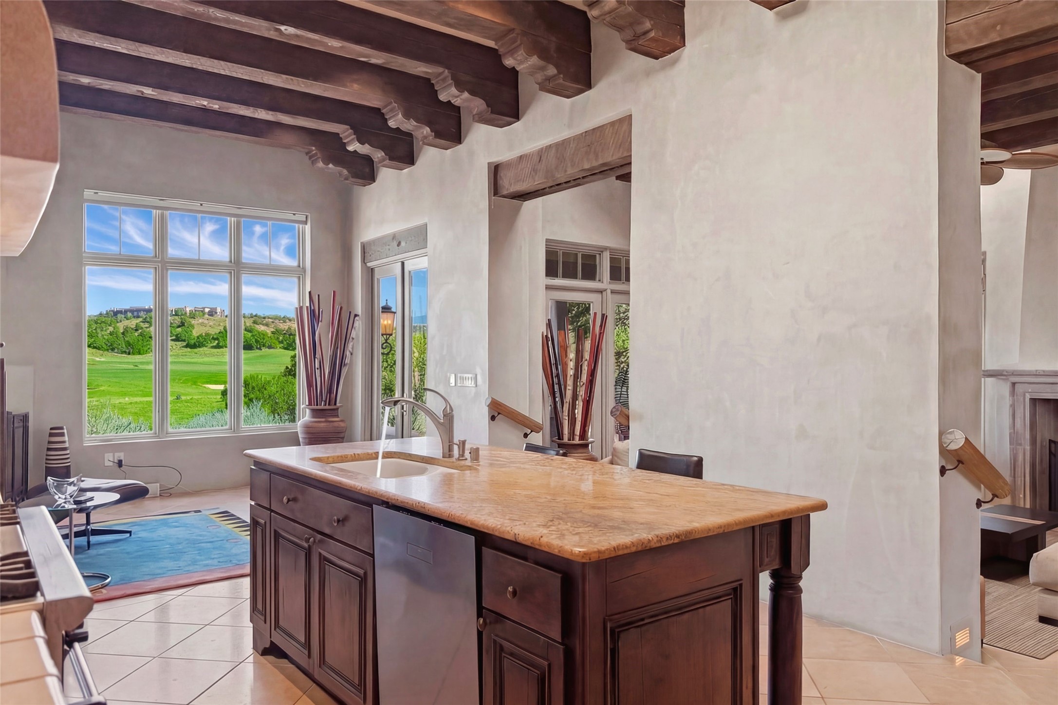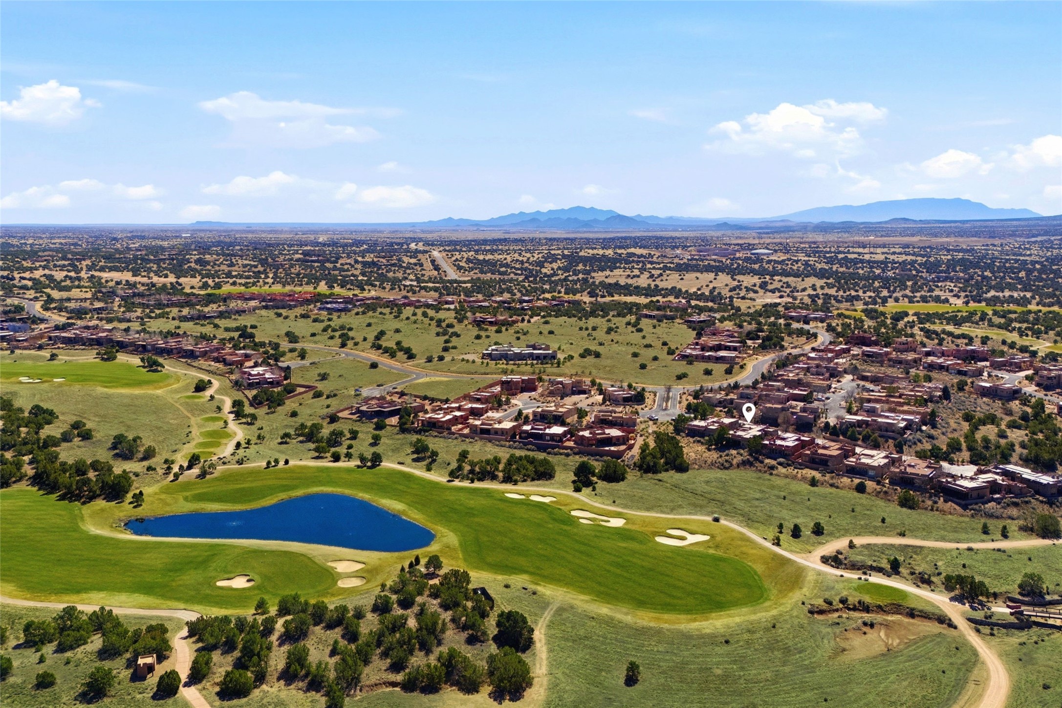 Expansive golf course views set the stage for this light-filled Las Campanas jewel. Setbehind a gated entrance with 24-hr security, the home welcomes you with a beautifullycrafted brick driveway that opens into a private, inviting courtyard. Offering 3 spaciousbedrooms and 3.5 baths, this thoughtfully designed home balances comfort, eleganceand privacy. Inside, travertine tile flows throughout complemented by brilliant diamondplaster walls, striking beams and graceful arched hallways that add architectural depthand character. The living room is a true showpiece, anchored by a grand wood-burningfireplace and framed by expansive patio doors that flood the space with natural lightwhile seamlessly blending indoor and outdoor living. 14 ft. ceilings and 16 skylightsthroughout the home further enhance its bright and airy ambiance. Designed foreveryday living and entertaining, the kitchen features granite countertops, luxurycabinetry, Wolf oven/stove, Sub-Zero refrigerator, a large island with seating and built-inwine storage. Adjacent is a formal dining area with outside access, dramatic lighting anda decorative fireplace. Each bedroom serves as a private retreat featuring its ownfireplace and direct patio access, creating a seamless connection to the outdoors. Theprimary suite is especially indulgent, offering a spa-like bathroom with a fireplace,oversized soaking tub and separate shower. Outdoor living is equally impressive withmultiple areas to enjoy Santa Fe's stunning climate. With eight fireplaces, timelessarchitectural details and a layout that offers both openness and separation, thisremarkable home delivers refined living in one of Santa Fe's most sought-aftercommunities.