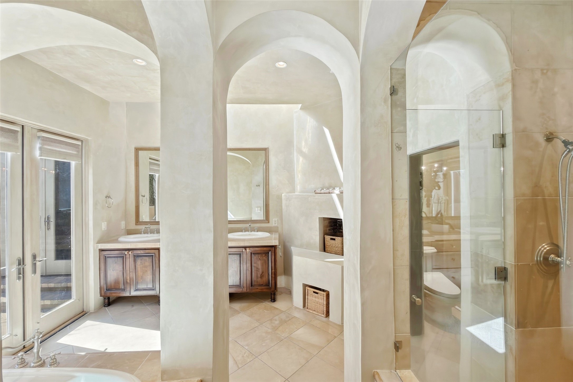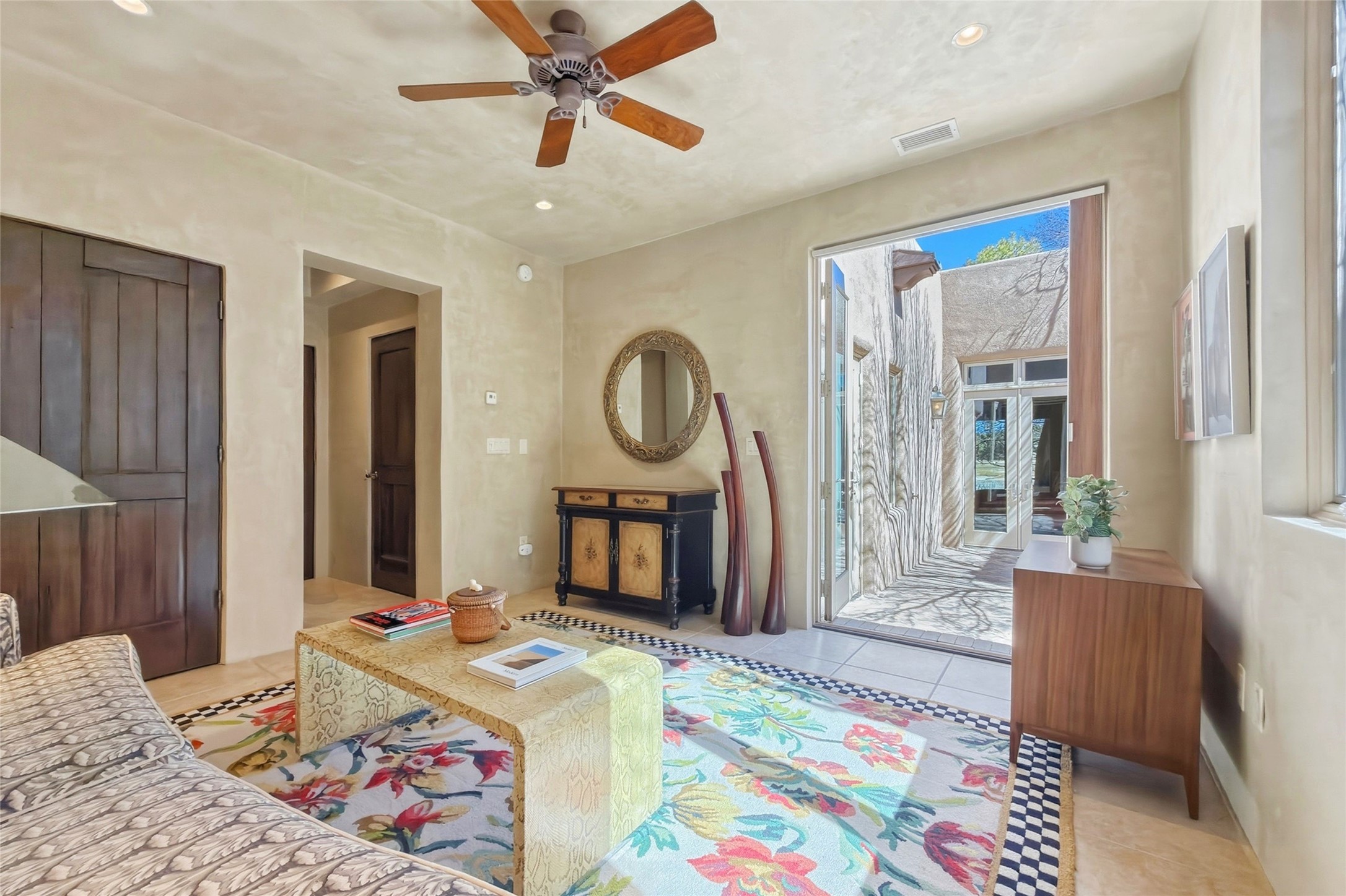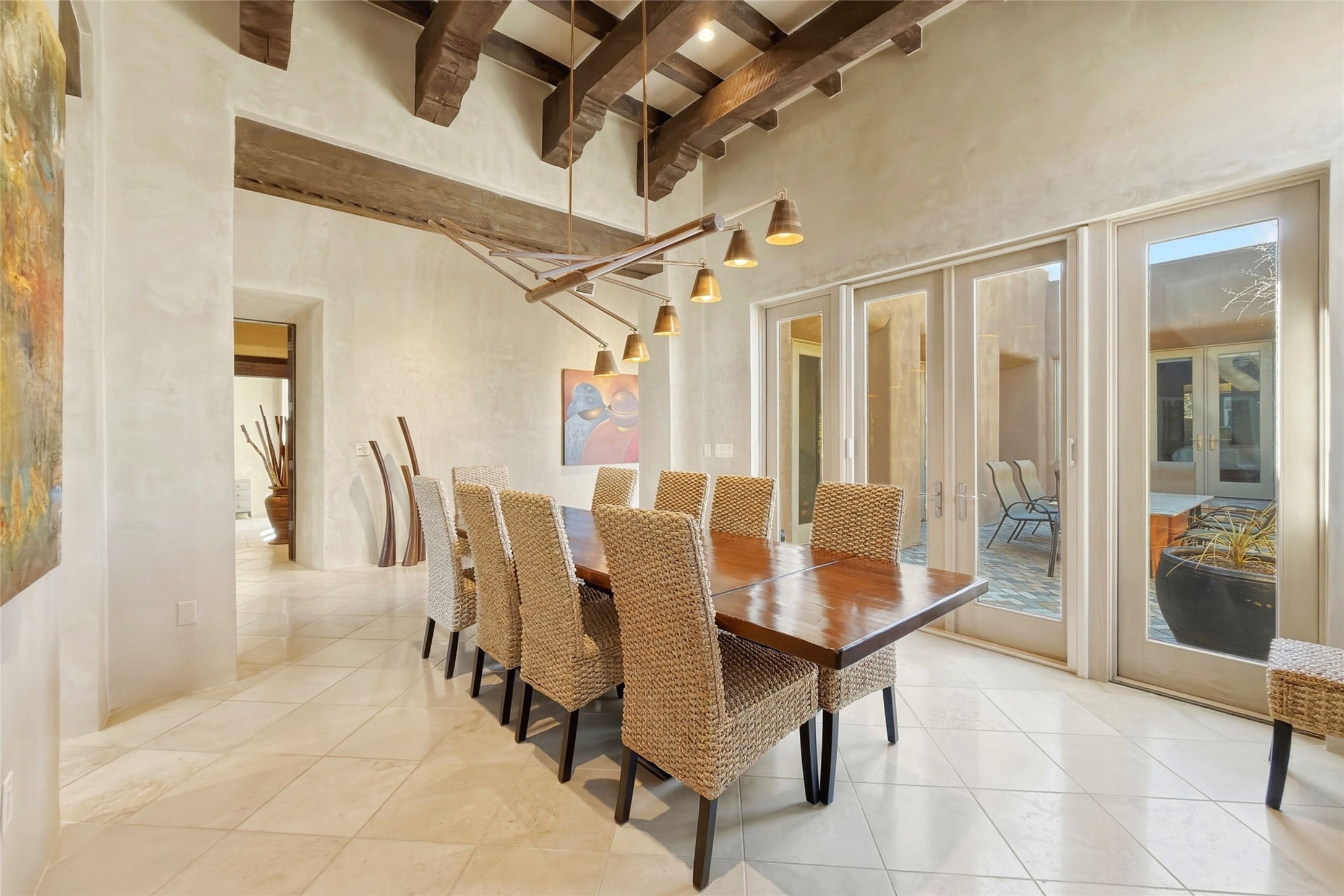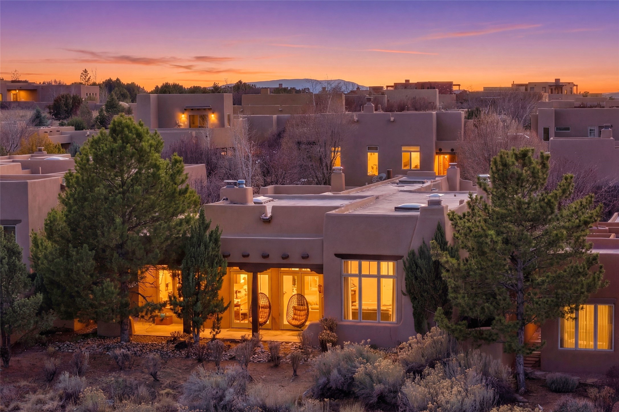 Expansive golf course views set the stage for this light-filled Las Campanas jewel. Setbehind a gated entrance with 24-hr security, the home welcomes you with a beautifullycrafted brick driveway that opens into a private, inviting courtyard. Offering 3 spaciousbedrooms and 3.5 baths, this thoughtfully designed home balances comfort, eleganceand privacy. Inside, travertine tile flows throughout complemented by brilliant diamondplaster walls, striking beams and graceful arched hallways that add architectural depthand character. The living room is a true showpiece, anchored by a grand wood-burningfireplace and framed by expansive patio doors that flood the space with natural lightwhile seamlessly blending indoor and outdoor living. 14 ft. ceilings and 16 skylightsthroughout the home further enhance its bright and airy ambiance. Designed foreveryday living and entertaining, the kitchen features granite countertops, luxurycabinetry, Wolf oven/stove, Sub-Zero refrigerator, a large island with seating and built-inwine storage. Adjacent is a formal dining area with outside access, dramatic lighting anda decorative fireplace. Each bedroom serves as a private retreat featuring its ownfireplace and direct patio access, creating a seamless connection to the outdoors. Theprimary suite is especially indulgent, offering a spa-like bathroom with a fireplace,oversized soaking tub and separate shower. Outdoor living is equally impressive withmultiple areas to enjoy Santa Fe's stunning climate. With eight fireplaces, timelessarchitectural details and a layout that offers both openness and separation, thisremarkable home delivers refined living in one of Santa Fe's most sought-aftercommunities.