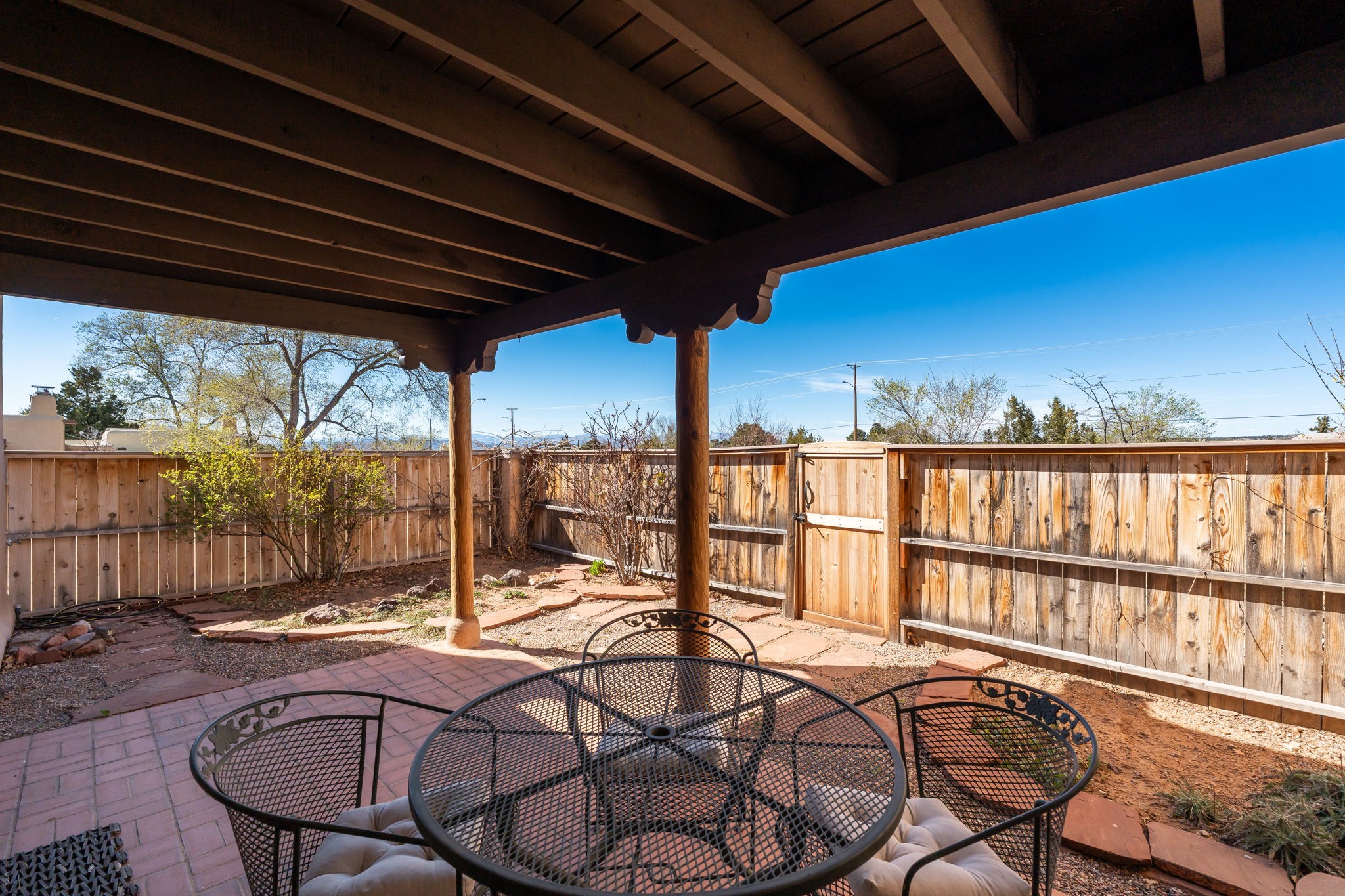 Filled with natural light and lovingly cared for over the past 30 years, this inviting single-story townhouse offers comfort, beauty, and an exceptional Park Plazas setting. With open space on three sides, the home enjoys a wonderful sense of privacy along with views of the Jemez Mountains, where sunsets are especially beautiful, as well as glimpses of the Sangre de Cristo range. Inside, the living and dining room feel warm and welcoming with beautiful laminate flooring, a corner Kiva fireplace, and sliding doors that open to a covered portal--an ideal place to relax and take in the surroundings. The kitchen has been thoughtfully updated with newer appliances, including a convection oven, Silestone countertops, a subway tile backsplash, a granite composite farm sink, and two skylights that bring in even more light. A sunny breakfast area with a cozy window seat adds to the home's charm. The spacious primary bedroom is bright and peaceful, and the updated bath features granite counters and a beautifully tiled walk-in shower. Additionally, there is a lovely second bedroom and full bath as well as a detached 2 car garage. This home is sparkling and ready for its new owner. Located in the centrally situated Park Plazas neighborhood, residents enjoy miles of walking trails, tennis courts, an off-leash dog park, and easy access to shopping, dining, and the Santa Fe Plaza.
