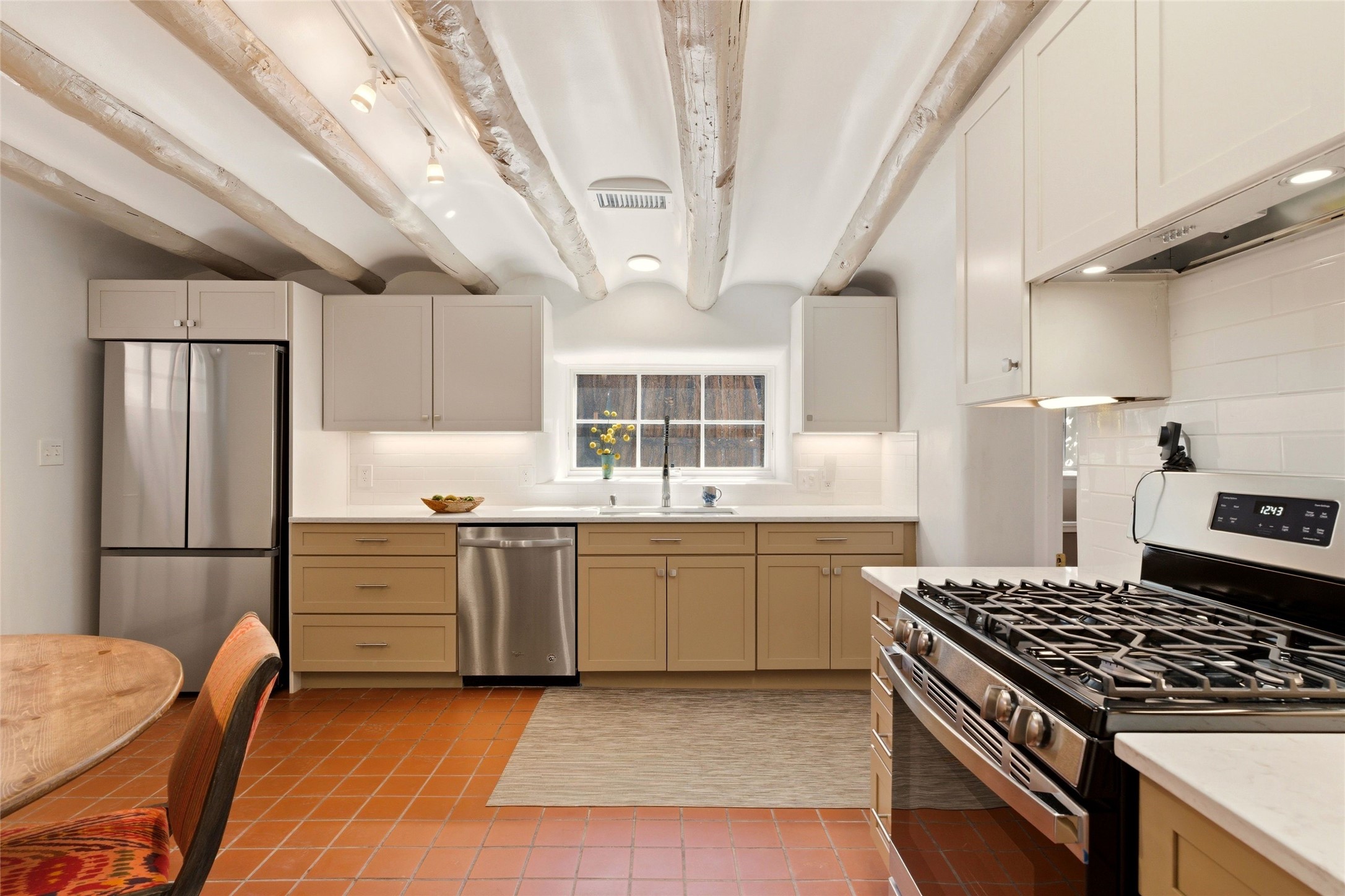 Put down your roots in the center of the historic Eastside of Santa Fe, where orchards once flourished and old-growth trees still dapple the sunlight. Cross over the famed Acequia Madre (Mother Irrigation Ditch), to a living history flowing past your residence, and walk only one block to restaurants and the world-renowned Canyon Road and the 80+ galleries. This charming adobe residence traces its roots to 1717 and was once a beloved general store that was a hub of the community. The property has been fully reimagined for modern living with an elegant fusion of heritage architecture and contemporary design. Extensively renovated and completed in 2023, the property boasts 2 bedrooms on the main level and 2 additional bedroom suites on the upper levels. The property is comprised of 2 condominiums that have been thoughtfully connected to live as a single residence. An easy modification to a single wall is all that would be needed to return the property to 2 separate residences. The property also includes a single vehicle garage. For the buyer who wants the charm and convenience of the historic Eastside and the benefits of a recently renovated property, this special property has it all. Unit A is approximately 2,000 sq. ft and Unit B is approximately 1,545 sq. ft.