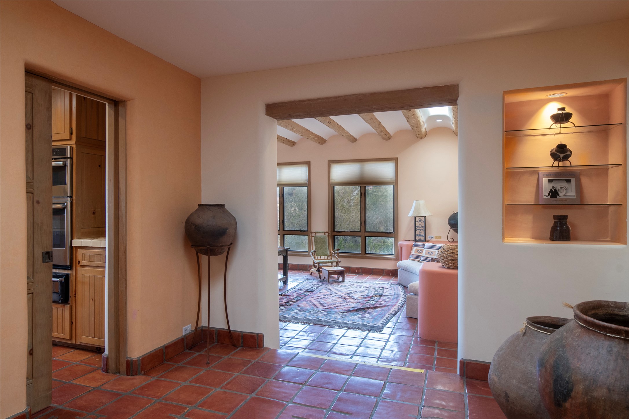 Beautifully sited among mature pion and juniper, this warm Pueblo-style home offers 3 bed 3 bath and stunning views of the Jemez mountains. Light-filled living and dining spaces connect seamlessly to a charming kitchen with wood cabinetry, skylights, and tile accents. The home includes a dedicated office, a serene primary suite, comfortable guest accommodations, and a finished lower level with additional living space, storage, and a well-appointed laundry room. Outdoor living is exceptional with an intimate walled patio, view-filled deck, and natural desert landscaping. A spacious garage and tranquil setting complete this inviting Santa Fe retreat.