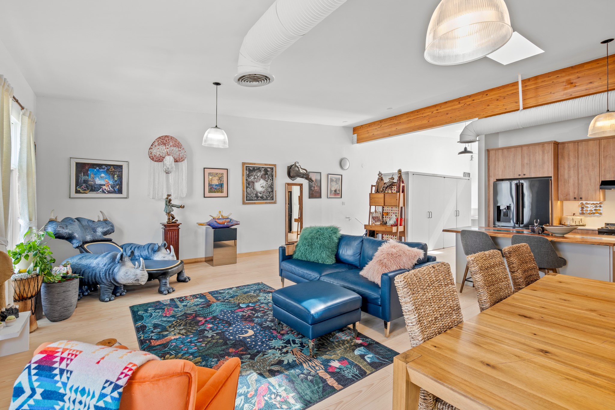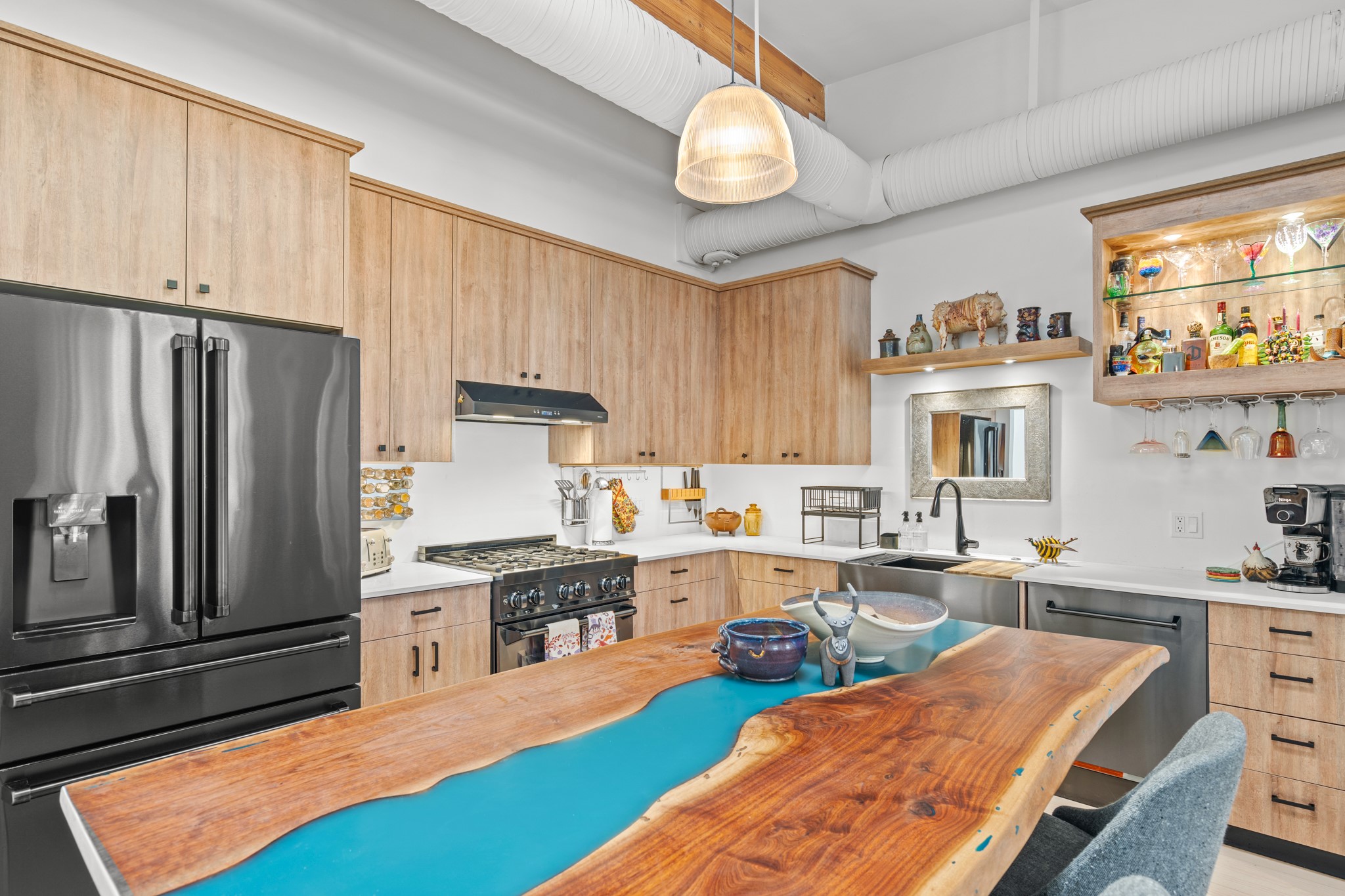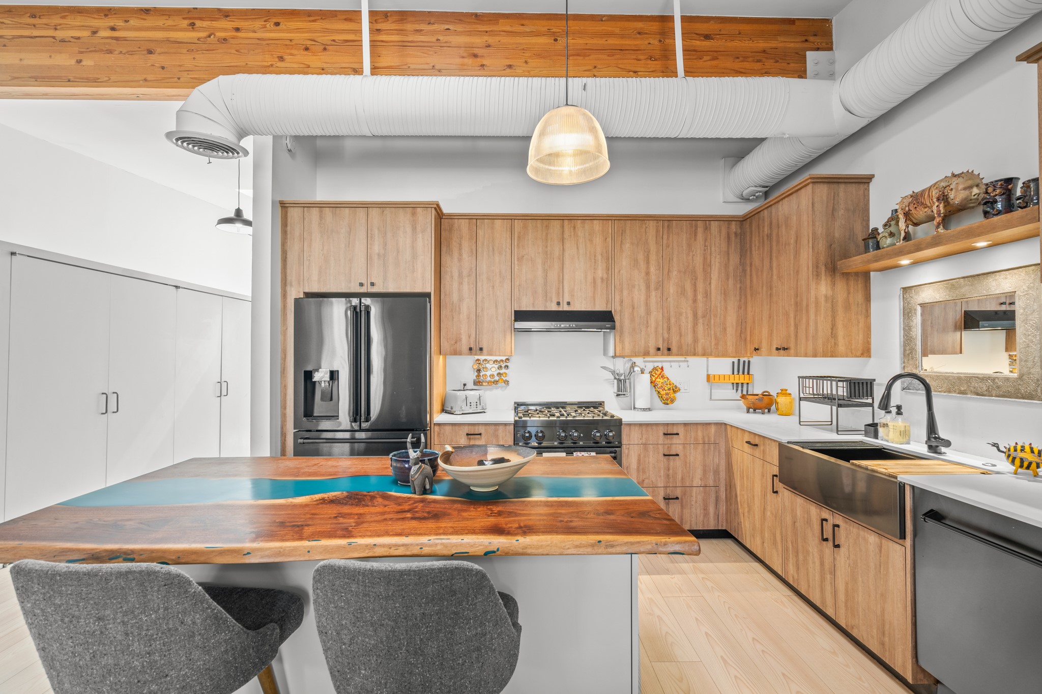 Could this be the most fabulous live / work studio in all of Santa Fe!! 2 commercially zoned live-work loft units in one.Upstairs: Completely remodeled 2 years ago. Open concept, high ceilings, very bright with skylights throughout. A 12.5x12.5 Primary Bedroom with an attached laundry space with stacked high end washer / dryer combo. The Kitchen is a high end $50K Douglas Maahs design featuring custom fixtures, custom bar / glass and lighting throughout. Many unique features were added at the time of installation. The primary bathroom is custom designed with zen copper and brass piping with wood effect tile, oversized tub and a built in bidet toilet creating a spa like feel. In the hallway there is a custom wooden work station and two stand alone closets. The open living room and dining area face a private wooded area creating a tranquil and peaceful environment.Downstairs: There is a huge 27x24 industrial space with mirrors lining one wall, cork flooring and 2 sets of french doors leading out to a tiled patio space. This room has a sink area and additional closets for storage. There are endless possibilities for this space: yoga studio, dance studio, art studio, gathering space etc. A full bath and a second 12x12 flex room for either an office, storage or a second downstairs bedroom.There are many built in custom shelve systems and plenty of storage.2550 square feet in total with the top floor and bottom floor in equal size but in different configurations. These 2 floors can be separated into 2 unique spaces or kept as one large unit. There are many businesses and private living spaces in The Lofts Complex, commercially zoned, ample parking with handicapped parking right in front ... did I mention the large dog park just a few feet away? ... Will you be the next owners to move in and make your work / live dreams come true?