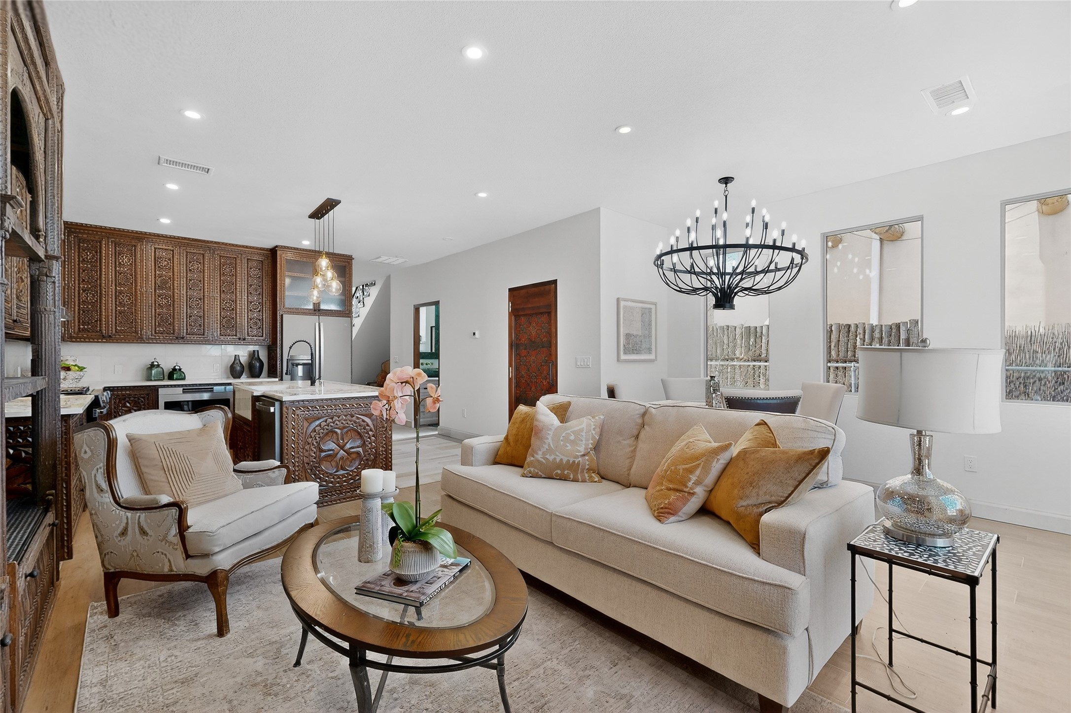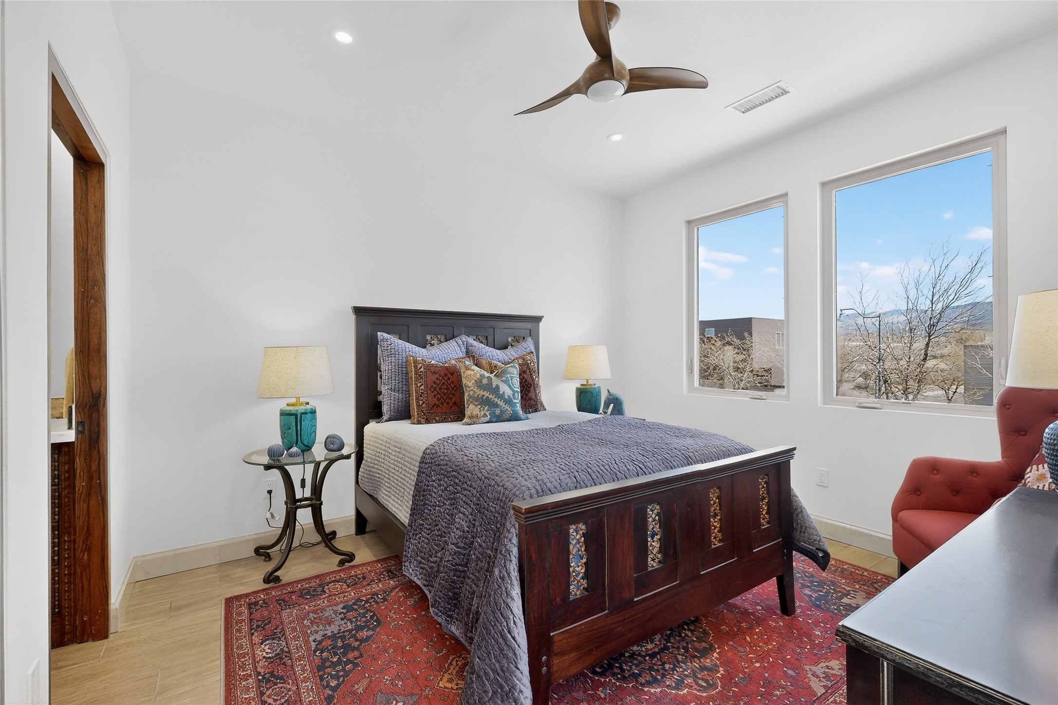Old world craftsmanship blends seamlessly with modern luxury at the Estancia Collection, a unique compound located in the Baca Railyard District, minutes from Santa Fe's top galleries and restaurants. This latest vision of renowned developer Mitch Menaker, is where every room becomes a work of living art. Curated by artisans from around the world, using hand cut semi-precious stone, tiles, iron, and rare wood finishes creates a truly immersive and peaceful experience, as if being hugged by nature. As you enter the sanctuary, a profound sensory experience awaits: a 20-foot Anasazi-style wall creates awe and naturally anchors the home. Inside are hand-carved teak doors, alder kitchen cabinets artisan-crafted in Mexico, and Italian marble countertops inlaid with semi-precious stone, creating a fine art masterpiece. The open concept living area features a 250-year-old triple-arch entertainment center that mimics the arcade of an ancient palace. Ascending the staircase is like gliding through a canyon of stone to the bedroom suites above. The primary bedroom greets you through a charming speakeasy door. This light-filled sanctuary features a fireplace, an antique carved wooden ceiling, a wet bar and a one of a kind spa-like bathroom with blue agate sinks, set on backlit white onyx countertops. The tub/shower, surrounded by stunning backlit blue agate panels, creates a luxurious and luminous retreat. The second light-filled bedroom features a bathroom with a hand-carved Mexican vanity and petrified wood sink atop a white onyx counter. The museum-quality shower/tub is framed in petrified wood squares, hand-assembled to create a puzzle pattern.The laundry room, located on the 2nd floor includes a dog shower covered with "happy dog" faces on each hand cut tile. Blending ancient techniques with the expert hands that brought them to life, the developer's vision has created the most unique visual and artistic sanctuary Santa Fe has seen in years.