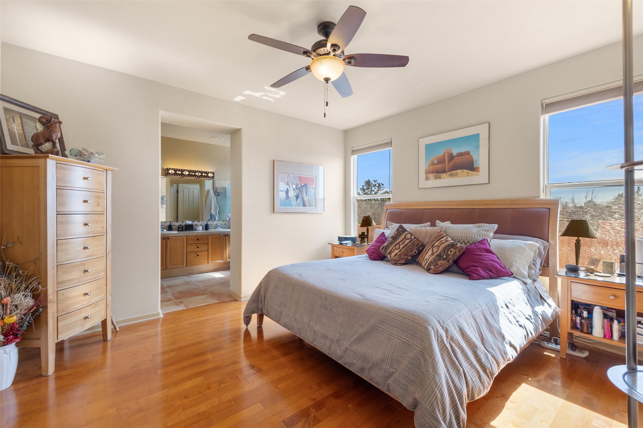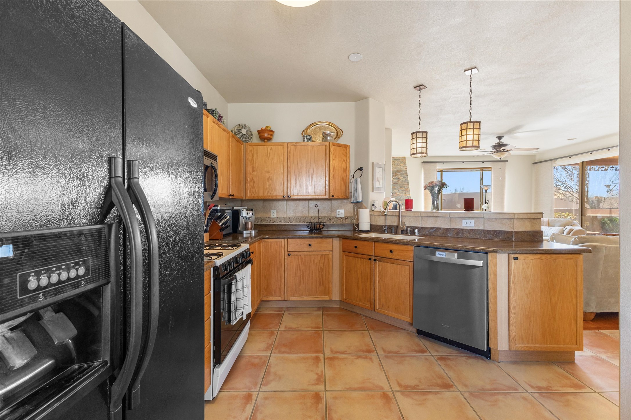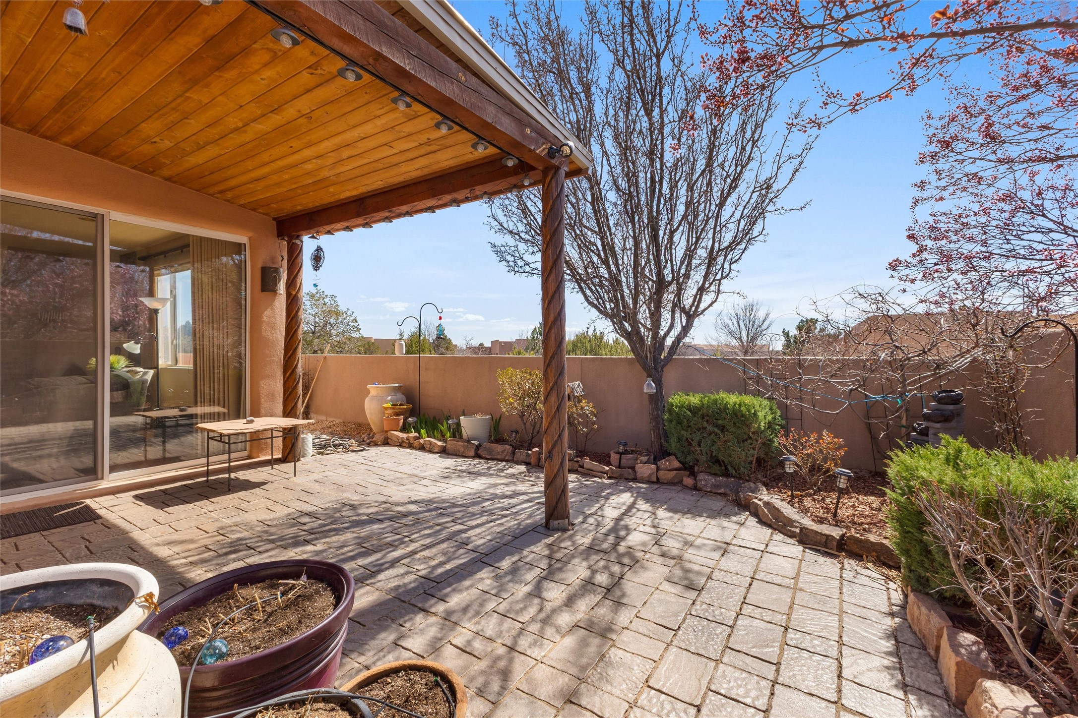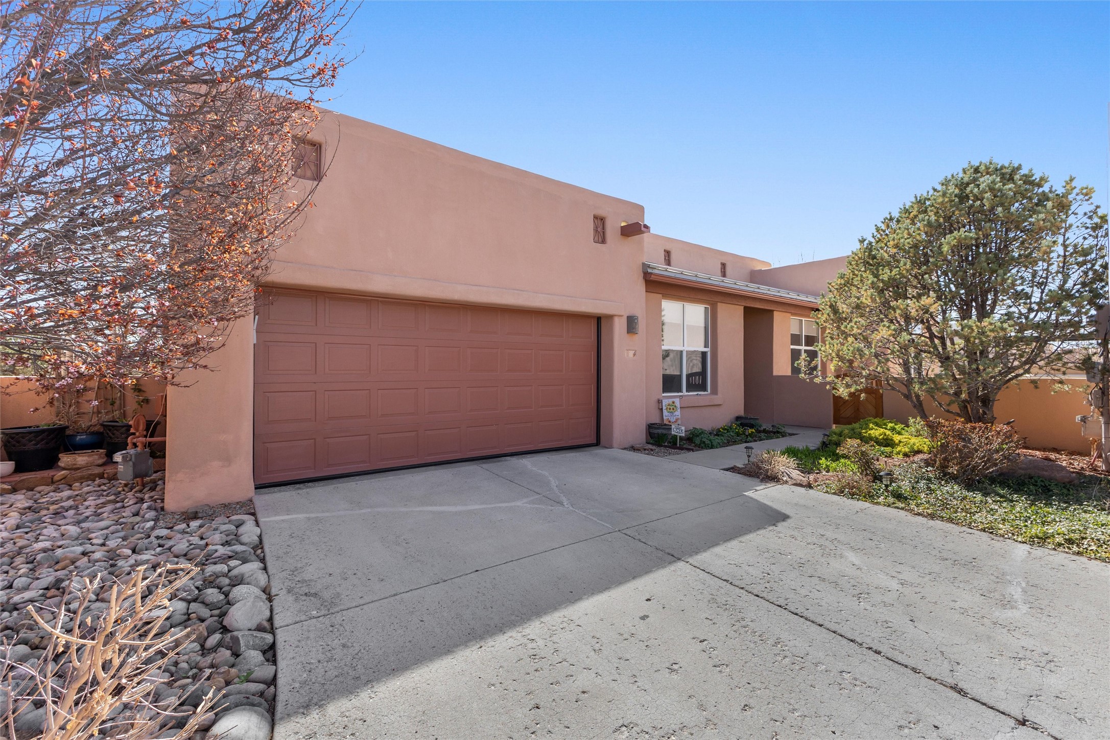 Welcome to this charming Pueblo-style home featuring one of Rancho Viejo's most popular floor plans, ideally situated on a quiet cul-de-sac. The property enjoys beautiful southern exposure and sits elevated above neighboring homes, backing to a peaceful, treed park area for added privacy and scenic views.Inside, you'll find a light and open floor plan with warm tile, wood flooring, and neutral colors that create an inviting Southwestern feel. The living area features a cozy kiva fireplace, perfect for relaxing evenings at home. With approximately 1,697 square feet, this home offers 3 bedrooms, 2 full bathrooms, and a 2-car garage, providing both comfort and functionality.Step outside to enjoy the covered patio, hot tub, and well-landscaped backyard, ideal for entertaining or unwinding amid tranquil surroundings. Additional features include an exterior storage shed for extra convenience. This lovely home combines classic Pueblo charm with a fantastic location in the desirable Rancho Viejo community.