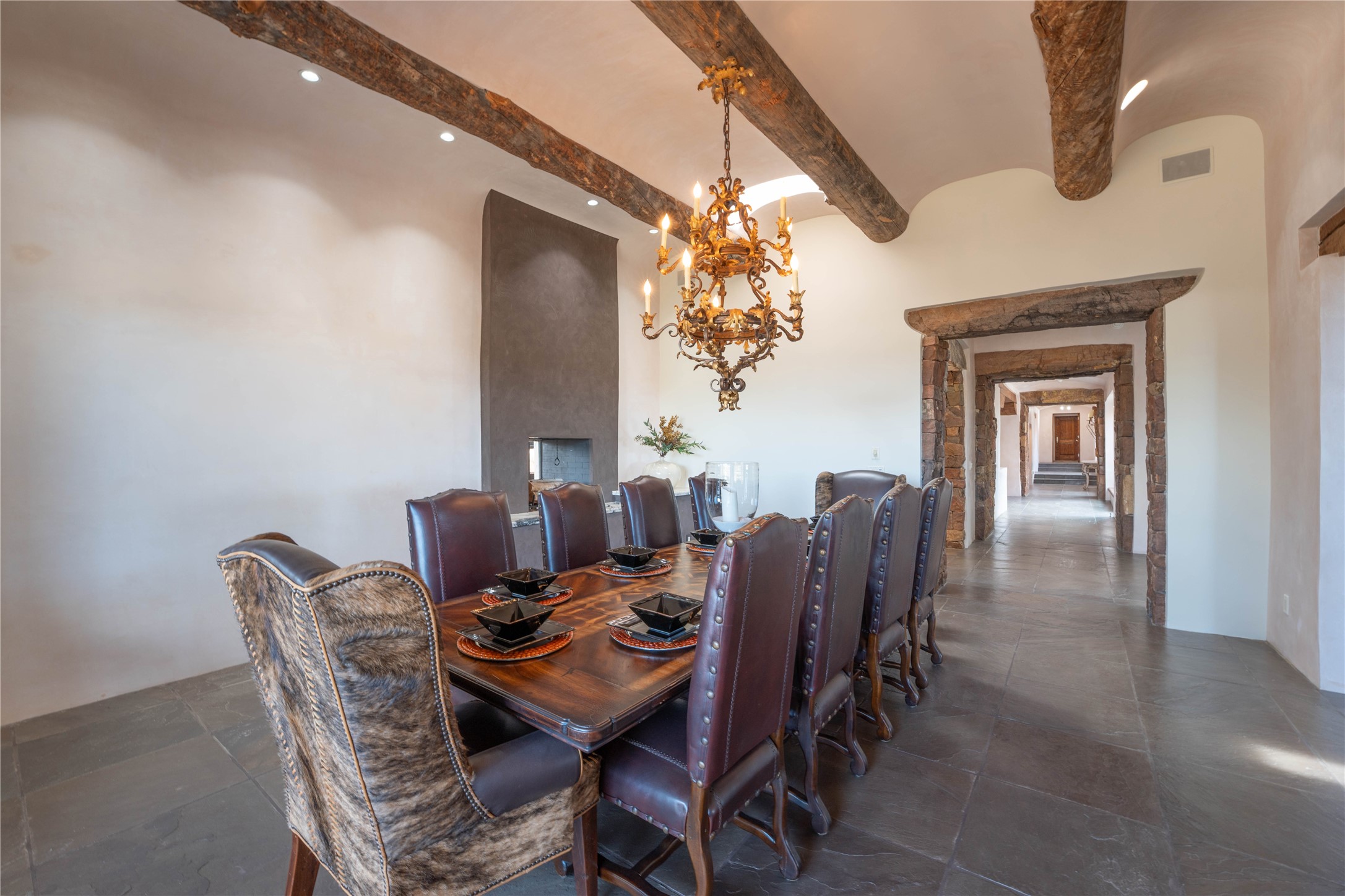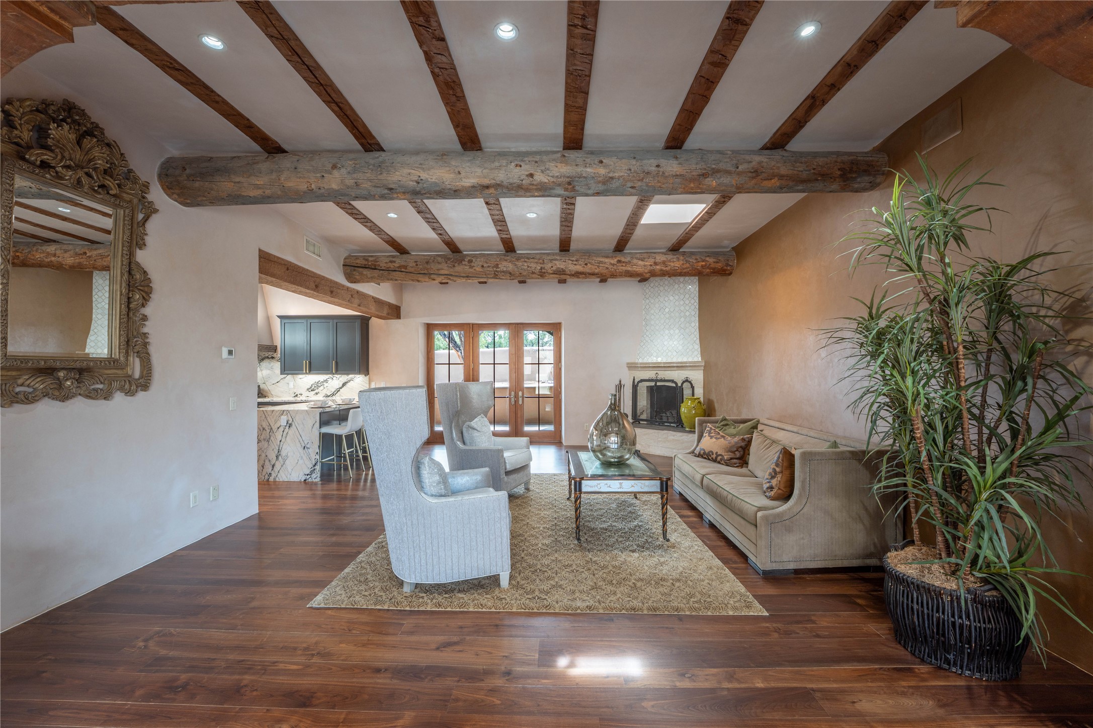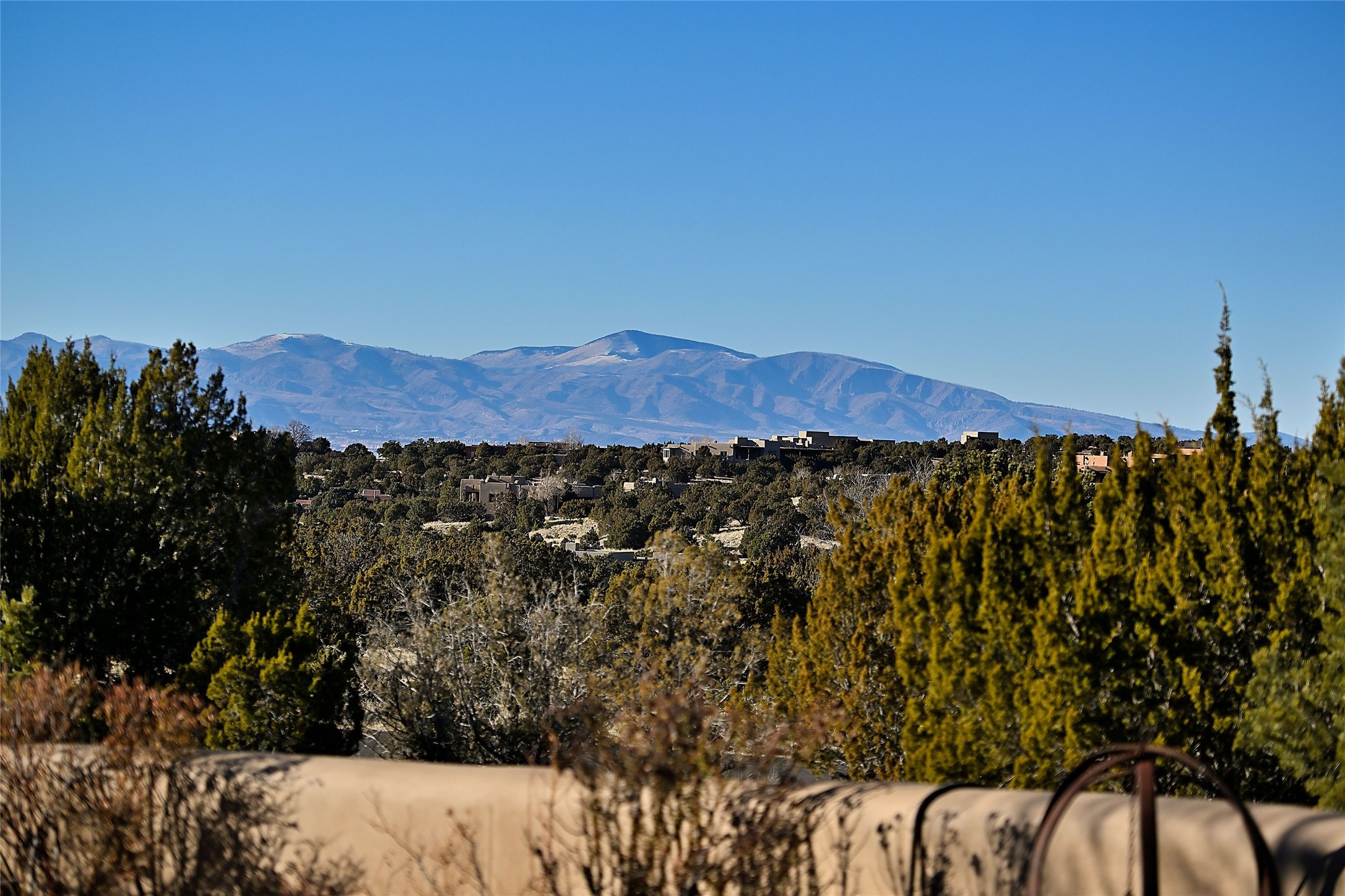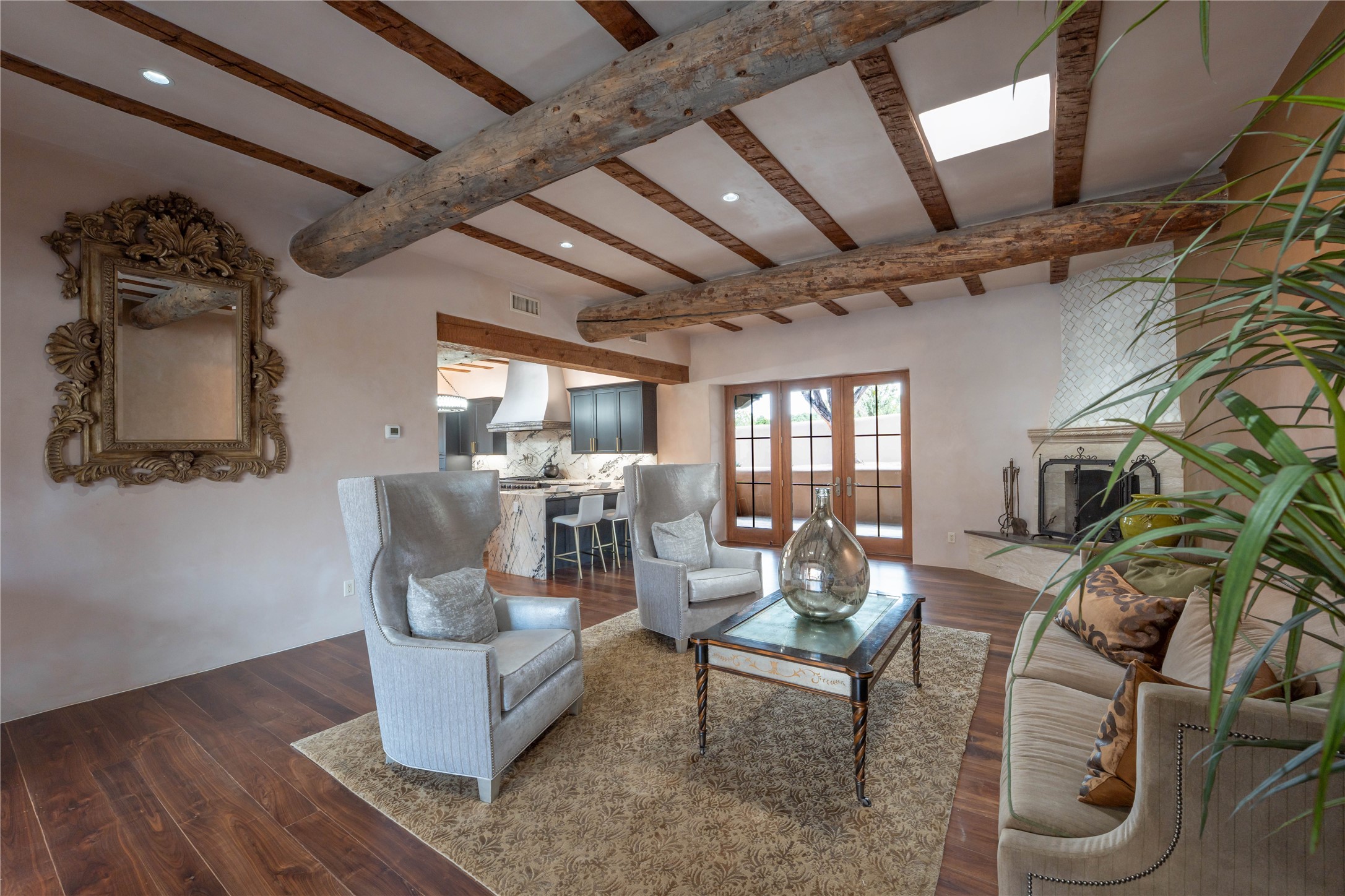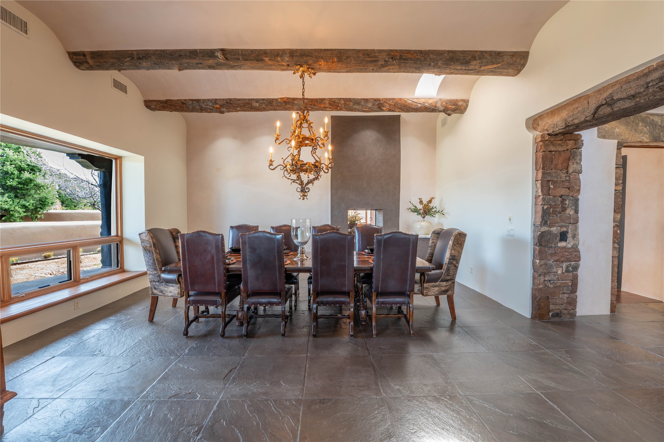 A rare opportunity to own a luxury Santa Fe estate in Las Campanas, one of the city's premier gated golf communities. Located just minutes from the historic Santa Fe Plaza, 26 Estates Drive is an impressive 8,356 square foot adobe residence with a detached guest casita, blending classic Northern New Mexico architecture with thoughtful modern upgrades.The home showcases the craftsmanship Santa Fe is known for, including handcrafted vigas, smooth plaster walls, wood-beamed ceilings, and striking moss rock accents. Large windows and generous gathering spaces create a home that is equally suited for everyday living or entertaining. At the center of the residence is a well-appointed kitchen featuring a 2024 Viking range, steam oven, quartzite countertops, custom cabinetry, and temperature-controlled wine storage for 288 bottles. The property offers four bedrooms and six bathrooms, including a spacious primary suite with fireplace and a spa-inspired bath. Outdoor living is an essential part of the experience. A wrap-around portal provides multiple seating areas, while the grounds feature native landscaping, stone walkways, an outdoor kitchen and dining area, and a built-in heated spa designed for eight. The setting is ideal for enjoying Santa Fe's sunshine, mountain air, and evening skies. Recent improvements include radiant heating and cooling, solar panels, a foam roof installed by Southwest Spray Foam in 2022, and freshly completed stucco in 2024. Homes of this size and quality in Las Campanas rarely come available. For buyers searching for a luxury home in Santa Fe with access to golf, privacy, and the lifestyle that defines Northern New Mexico, 26 Estates Drive represents a compelling opportunity.