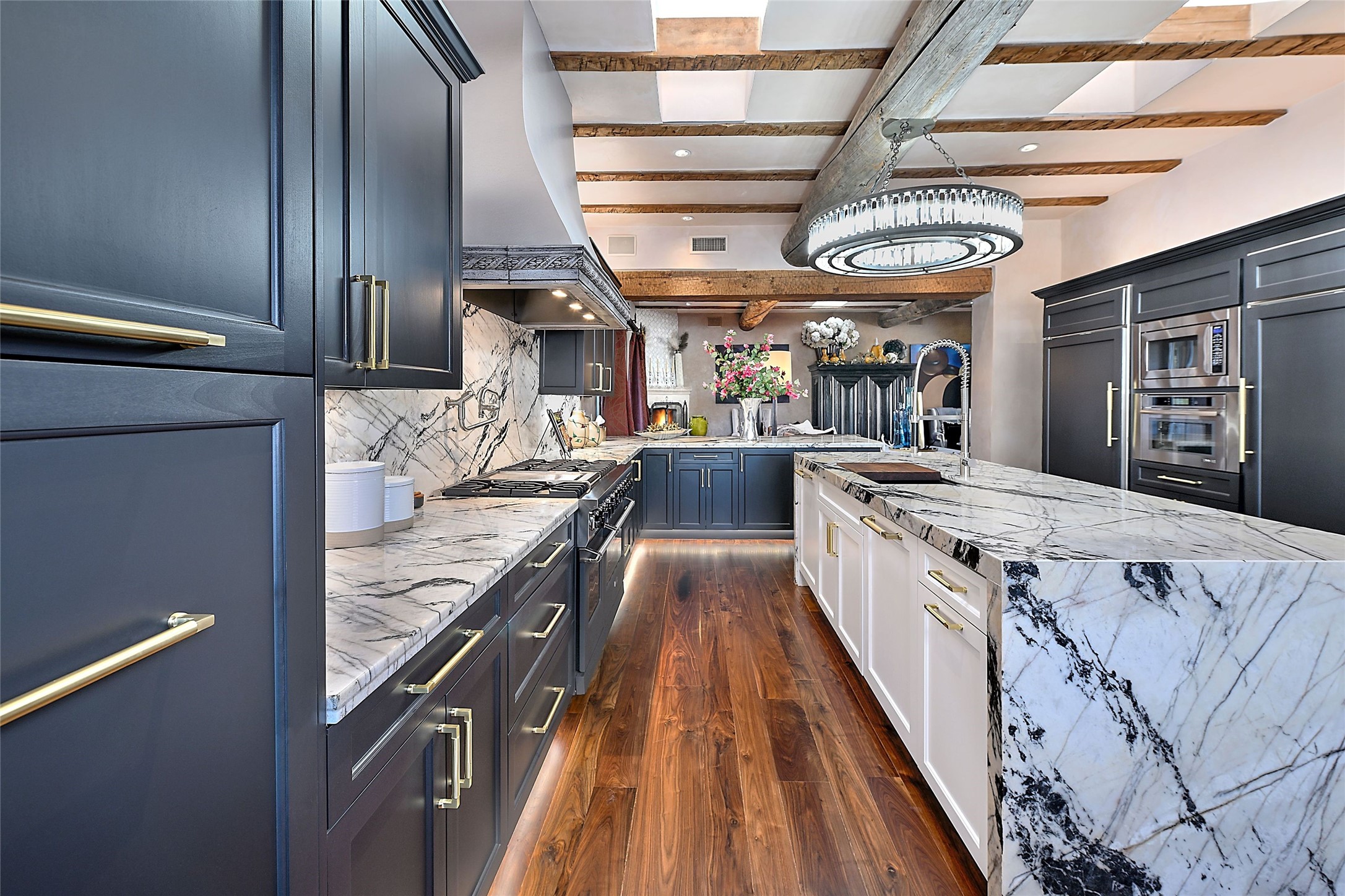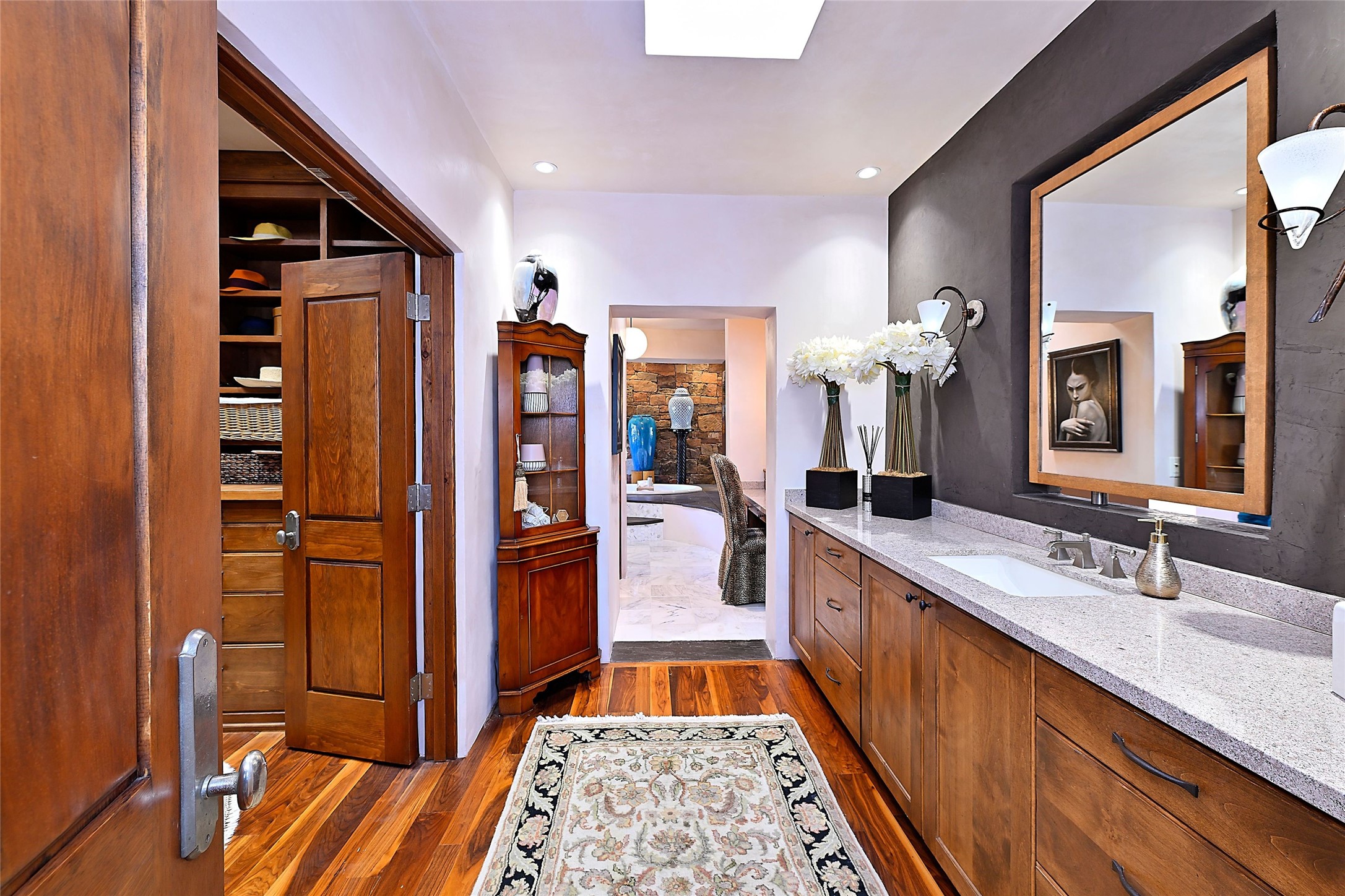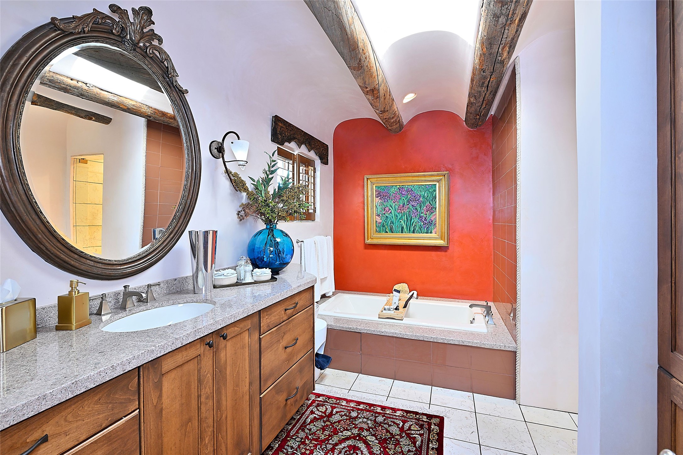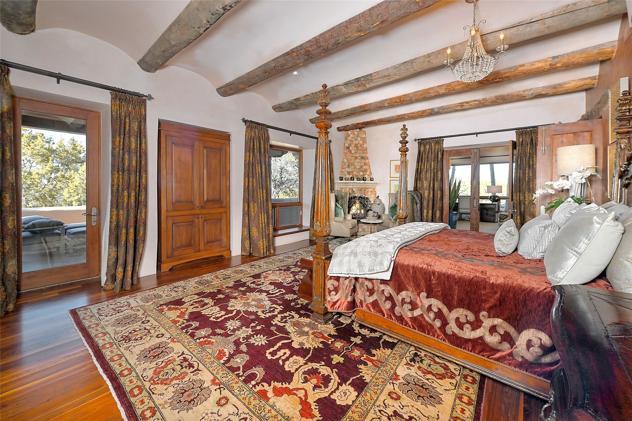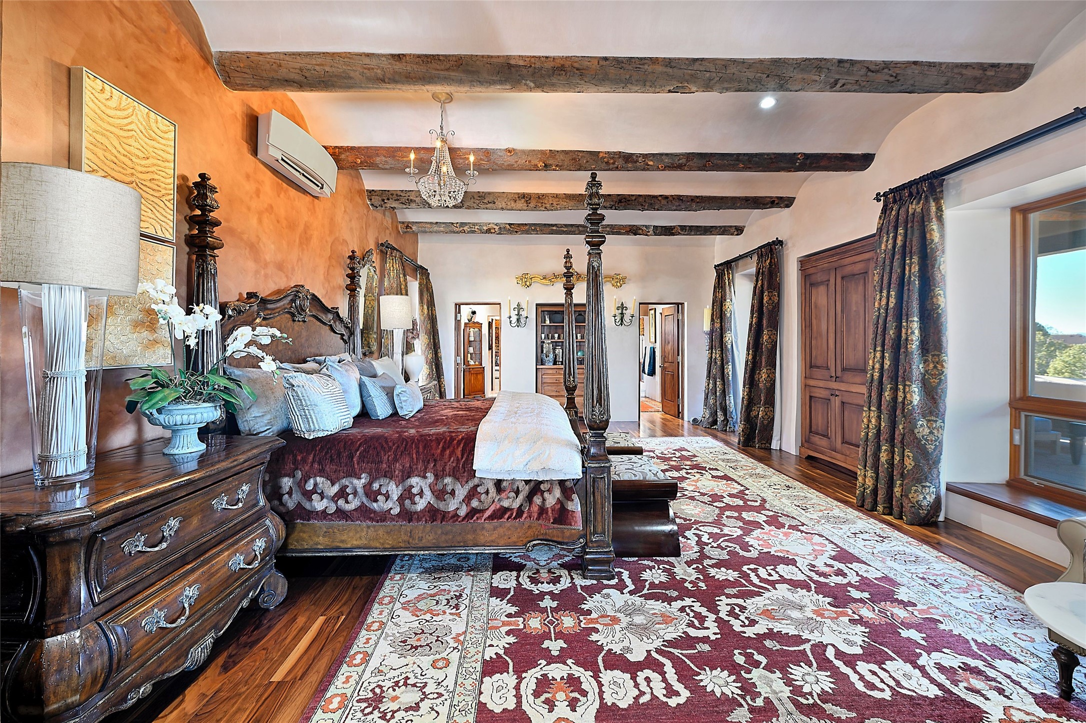 A rare opportunity to own a luxury Santa Fe estate in Las Campanas, one of the city's premier gated golf communities. Located just minutes from the historic Santa Fe Plaza, 26 Estates Drive is an impressive 8,356 square foot adobe residence with a detached guest casita, blending classic Northern New Mexico architecture with thoughtful modern upgrades.The home showcases the craftsmanship Santa Fe is known for, including handcrafted vigas, smooth plaster walls, wood-beamed ceilings, and striking moss rock accents. Large windows and generous gathering spaces create a home that is equally suited for everyday living or entertaining. At the center of the residence is a well-appointed kitchen featuring a 2024 Viking range, steam oven, quartzite countertops, custom cabinetry, and temperature-controlled wine storage for 288 bottles. The property offers four bedrooms and six bathrooms, including a spacious primary suite with fireplace and a spa-inspired bath. Outdoor living is an essential part of the experience. A wrap-around portal provides multiple seating areas, while the grounds feature native landscaping, stone walkways, an outdoor kitchen and dining area, and a built-in heated spa designed for eight. The setting is ideal for enjoying Santa Fe's sunshine, mountain air, and evening skies. Recent improvements include radiant heating and cooling, solar panels, a foam roof installed by Southwest Spray Foam in 2022, and freshly completed stucco in 2024. Homes of this size and quality in Las Campanas rarely come available. For buyers searching for a luxury home in Santa Fe with access to golf, privacy, and the lifestyle that defines Northern New Mexico, 26 Estates Drive represents a compelling opportunity.