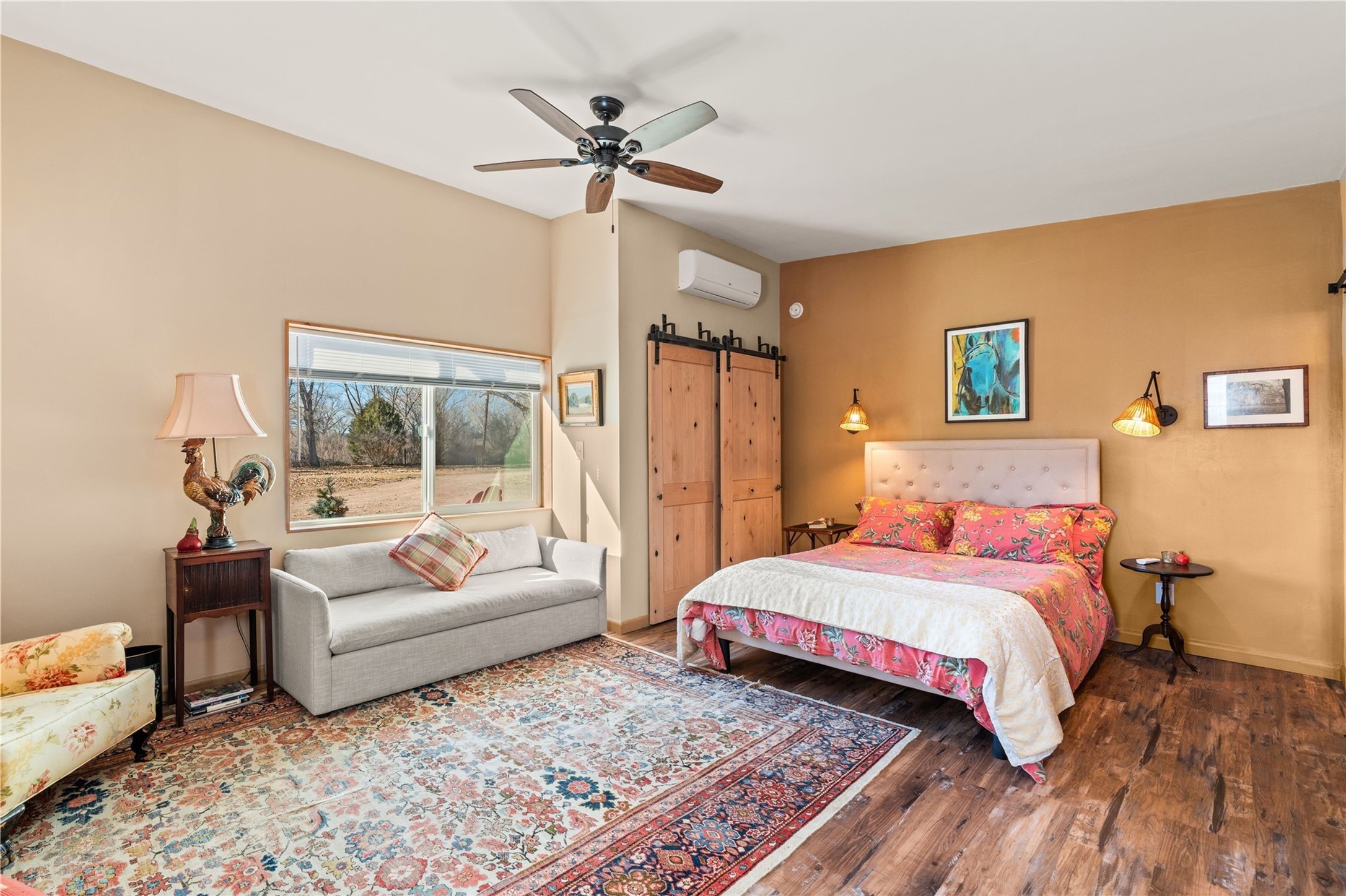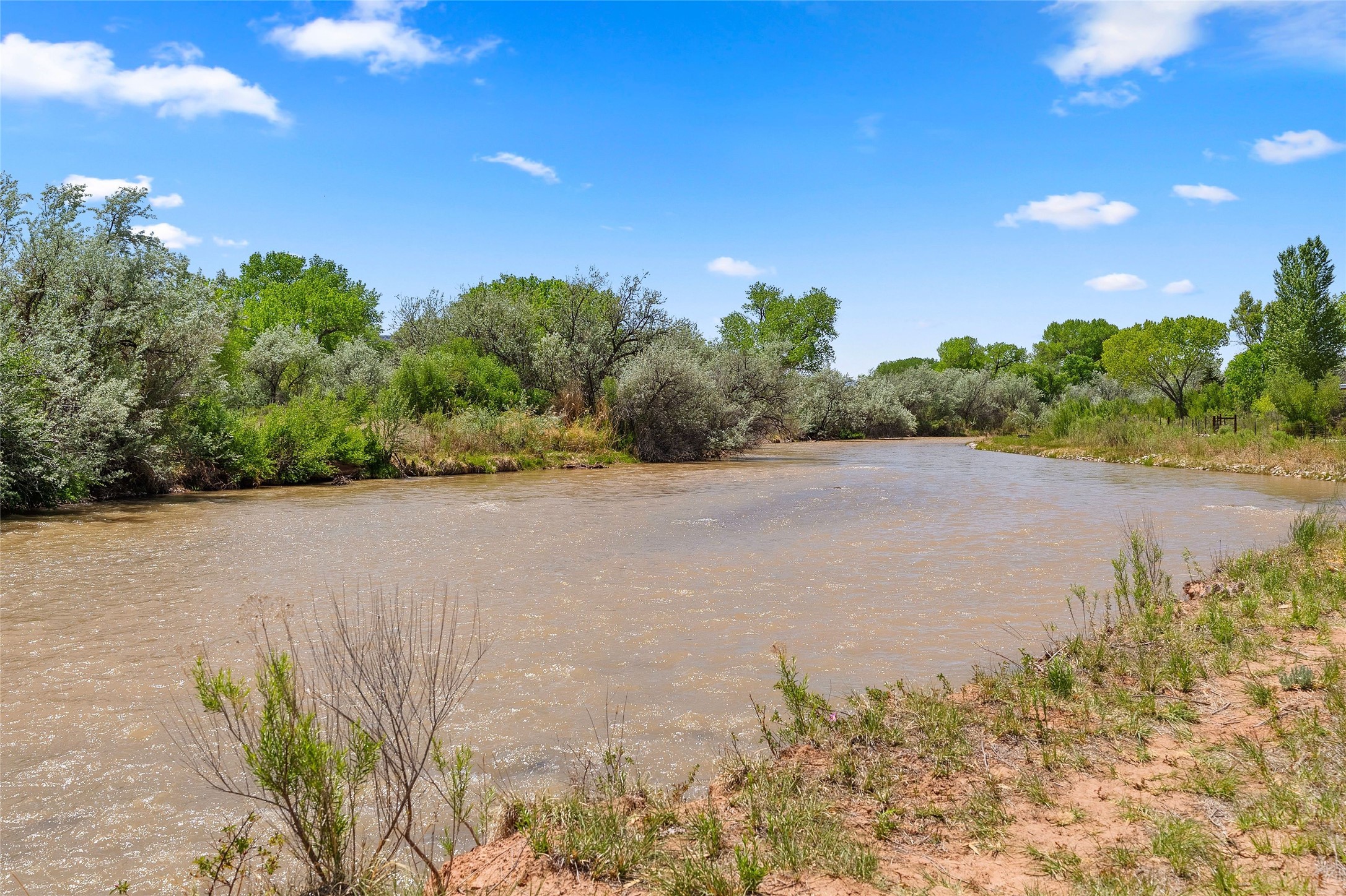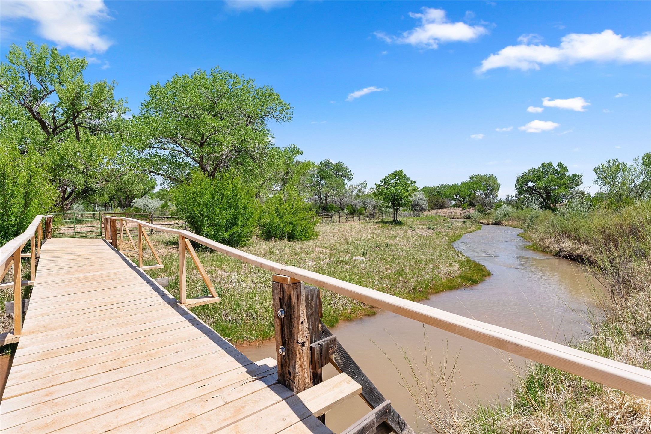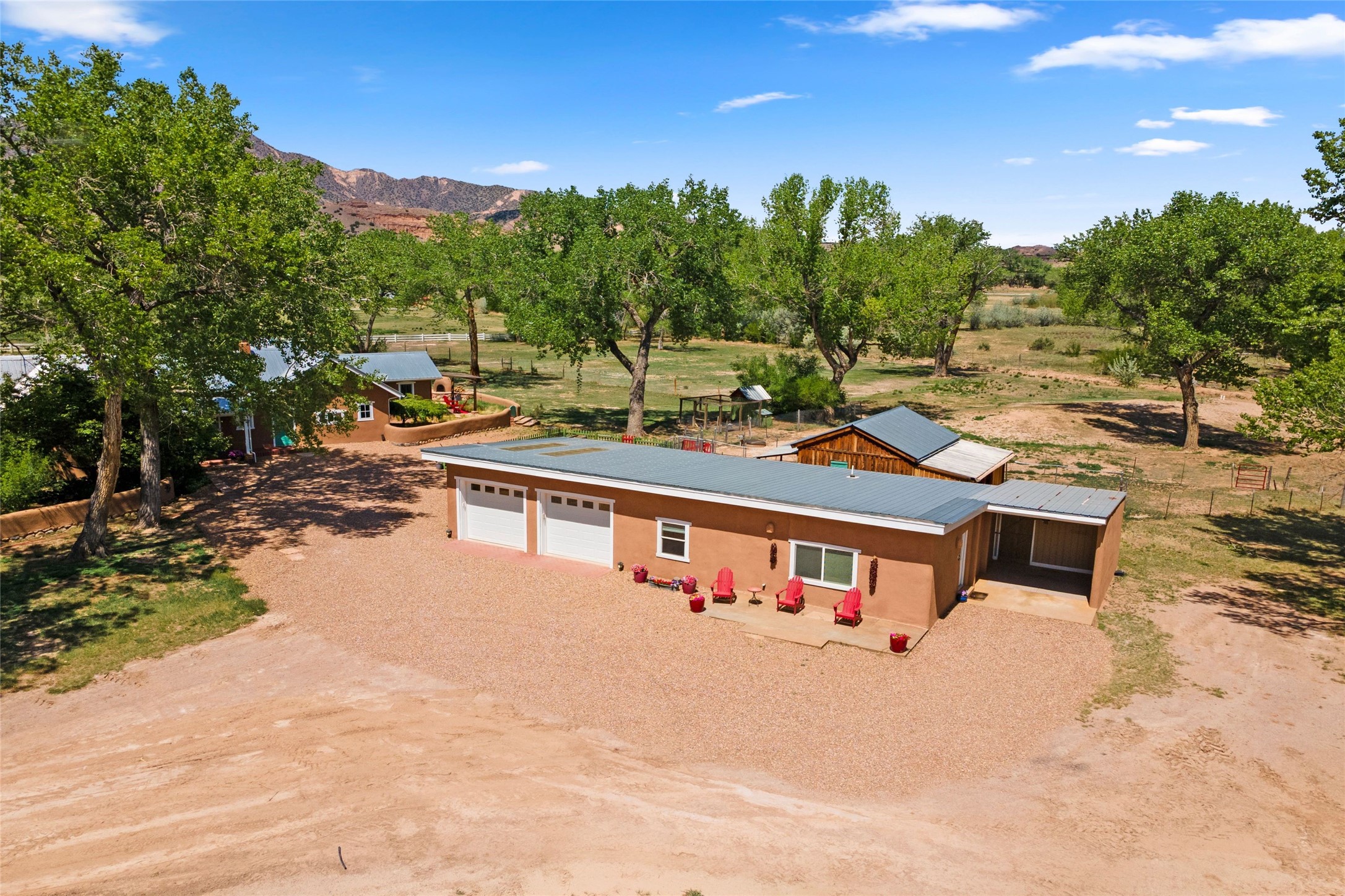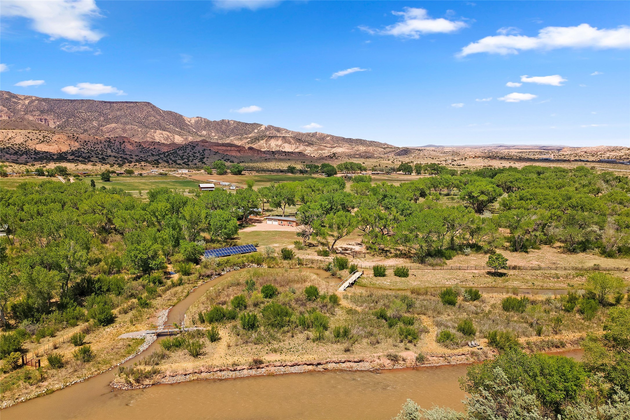 Set along the tranquil banks of the Chama River, this exceptional private estate captures the extraordinary beauty of northern New Mexico's landscape--with panoramic views of colorful canyons and mesas immortalized in the paintings of Georgia O'Keeffe. Shaded by majestic cottonwoods and thoughtfully positioned on 20 acres of fertile pastureland including a small vineyard, the residence offers gracious sanctuary. Northern New Mexico style main home features soaring vaulted ceilings, exposed beams and vigas, brick floors, multiple fireplaces, hand-carved wooden doors, and expansive living spaces that blend warmth, craftsmanship, and timeless regional character. At the heart of the home, an open chef's kitchen--ideal for both intimate living and elegant entertaining. The secluded primary suite provides a peaceful retreat with an ensuite bath and adjoining sun-filled study, opening onto a private courtyard patio. Additional bedrooms each feature their own baths and direct outdoor access, offering guests both comfort and privacy. A fully equipped modern casita provides luxurious accommodations for visitors, artists, or extended stays, with its own inviting outdoor spaces. Outdoor living unfolds across beautifully designed grounds with covered flagstone portals, courtyard gardens, and multiple seating areas that invite relaxation and celebration. Amenities include a traditional horno oven, grill, jacuzzi spa, tree-lined pond, and a fire pit--where the current owners have hosted memorable annual oyster roasts beneath expansive New Mexico skies. A private bridge crossing a fork of the river adds a distinctive and enchanting element to the property. For equestrian and agricultural pursuits, the estate includes a large, lofted barn, corrals, livestock pens, and a chicken coop. The fully fenced acreage benefits from two private wells and valuable water ditch rights, supporting both the vineyard and pastureland. This remarkable property offers a rare combination of luxury living, agricultural potential, and authentic Southwestern character, while serving as a gateway to the region's renowned natural and cultural landmarks, including Plaza Blanca, Christ in the Desert Monastery, Ghost Ranch, Georgia O'Keeffe Home and Studio, Abiquiu Lake, and Echo Amphitheater.